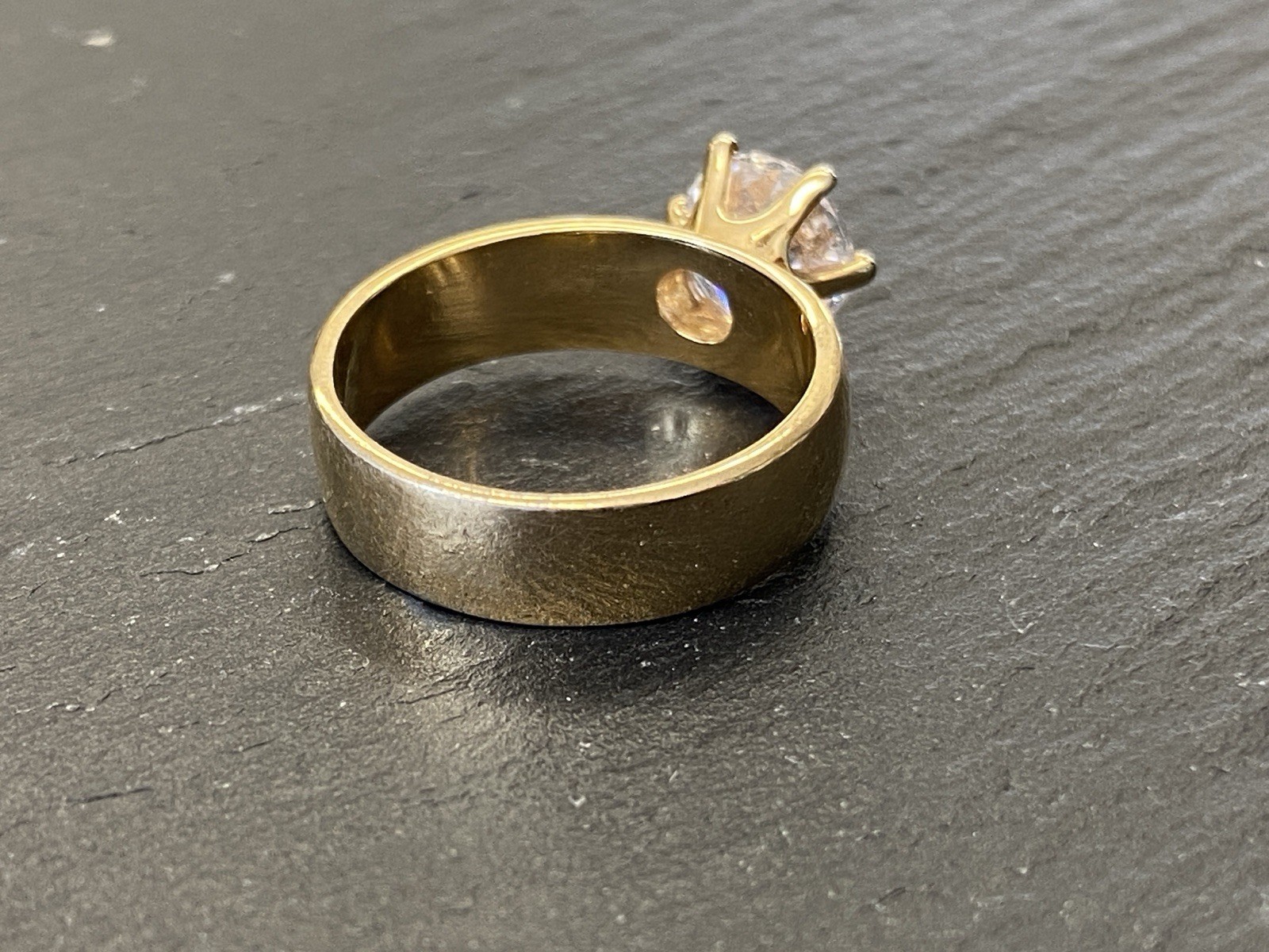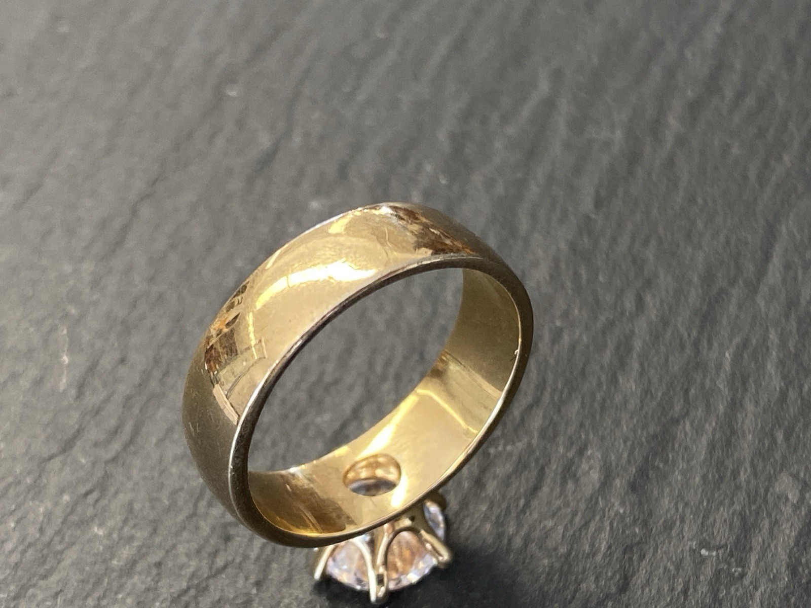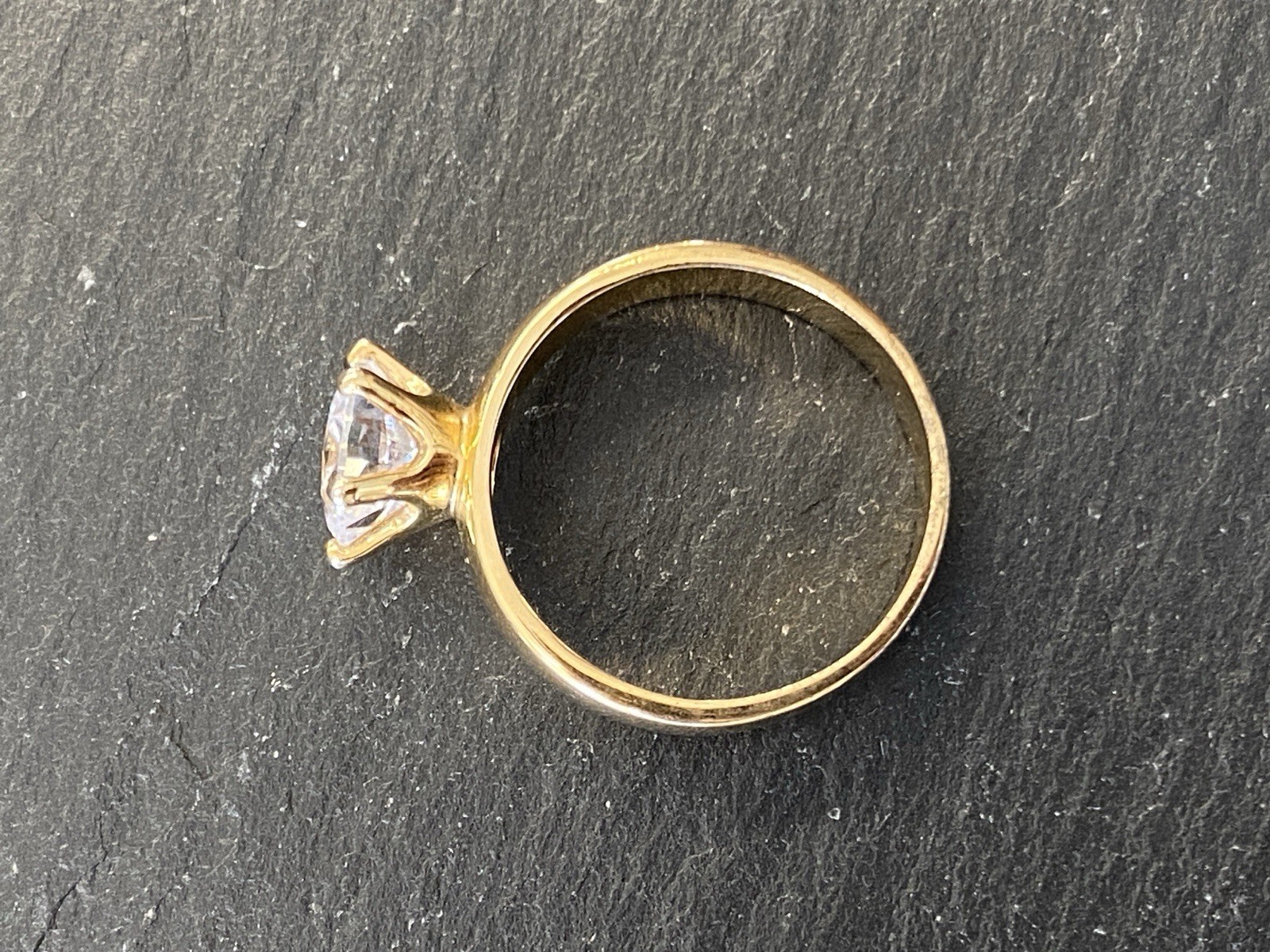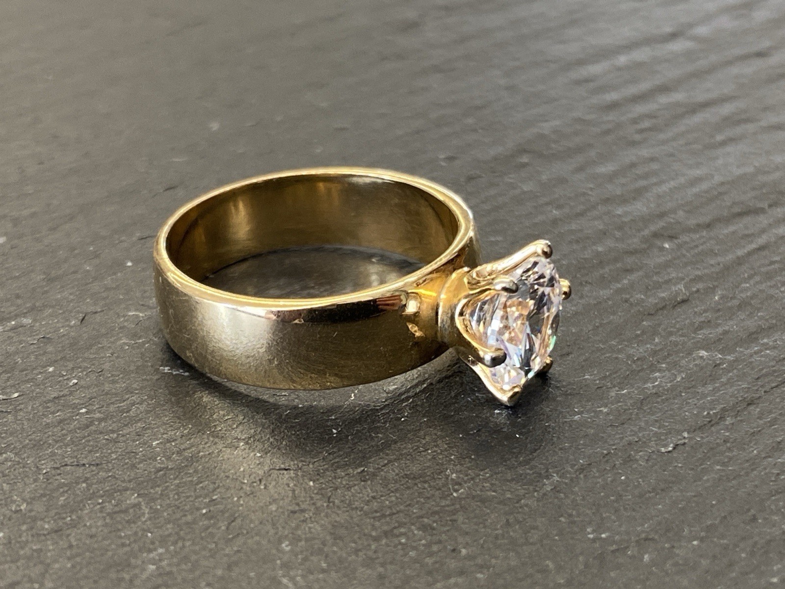 Eleganter Ring aus wahrs. vergoldetem Metall, ungestempelt, mit einem farblosen Glasstein. Dieser hat einen Durchmesser von 8,48mm, seine Oberfläche ist minimal berieben. Im Inneren des Steines sind viele Luftblasen zu sehen, allerdings mit einer Lupe, mit bloßem Auge sind diese nicht zu sehen. Die Oberfläche des Ringes ist berieben und angelaufen. B/H des Mittelteils 0,9/0,7cm, B/H der Ringschiene 0,6/0,1cm, RG 59, Gesamtgewicht ca. 5,31g.