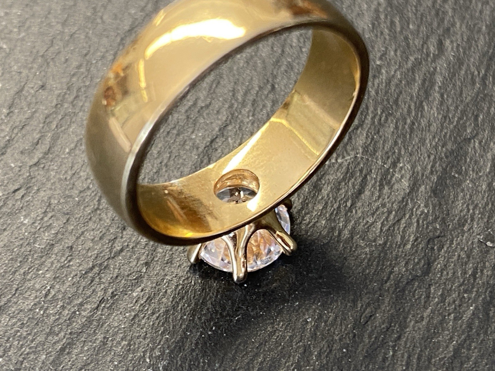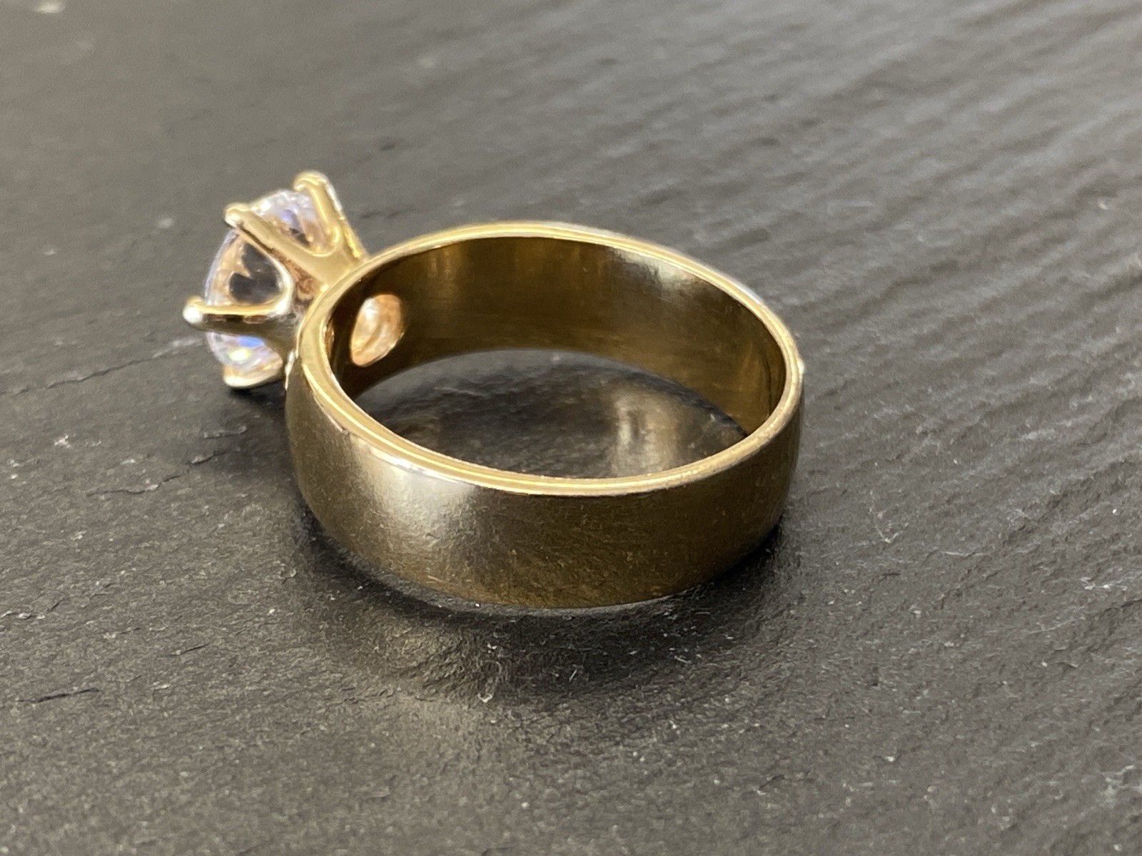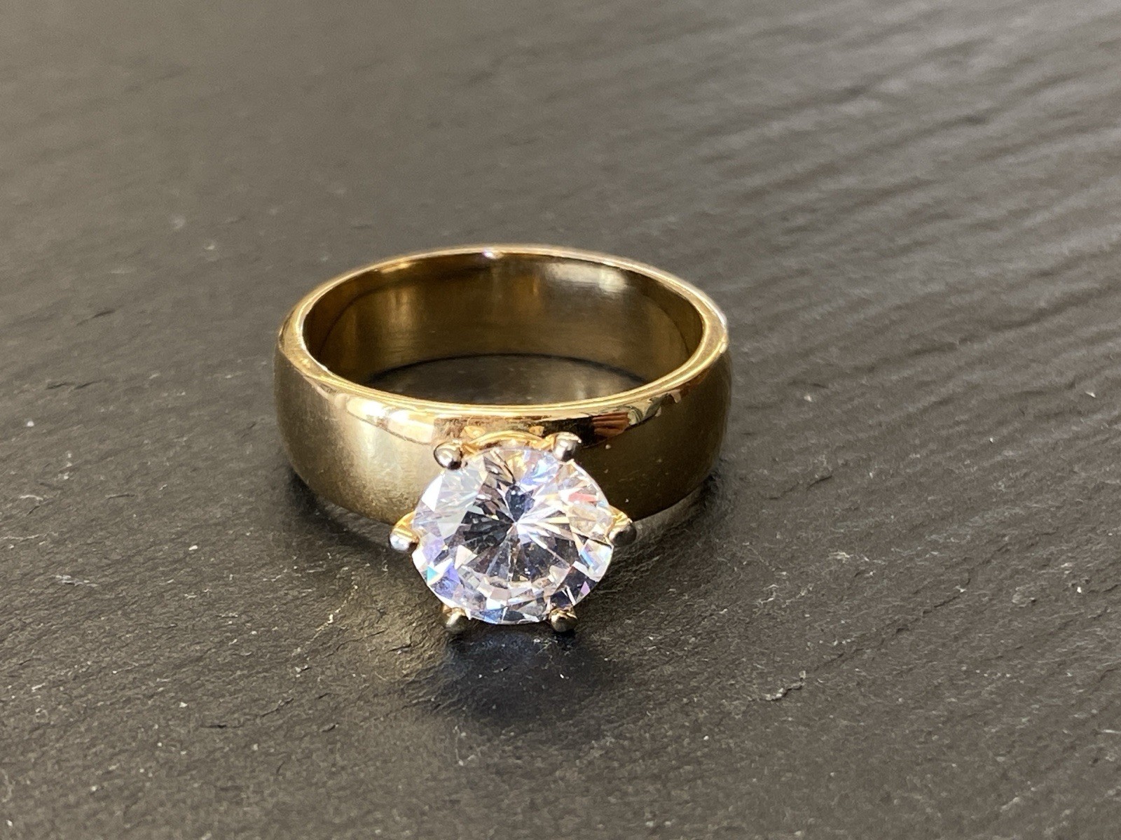 Eleganter Ring aus wahrs. vergoldetem Metall, ungestempelt, mit einem farblosen Glasstein. Dieser hat einen Durchmesser von 8,48mm, seine Oberfläche ist minimal berieben. Im Inneren des Steines sind viele Luftblasen zu sehen, allerdings mit einer Lupe, mit bloßem Auge sind diese nicht zu sehen. Die Oberfläche des Ringes ist berieben und angelaufen. B/H des Mittelteils 0,9/0,7cm, B/H der Ringschiene 0,6/0,1cm, RG 59, Gesamtgewicht ca. 5,31g.