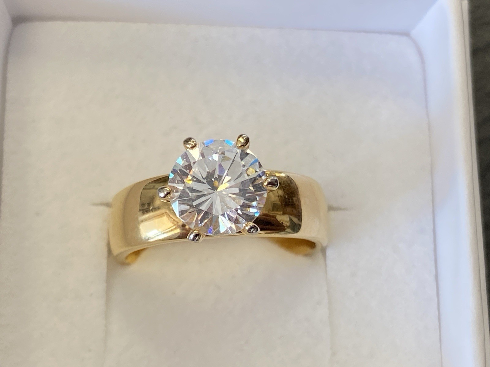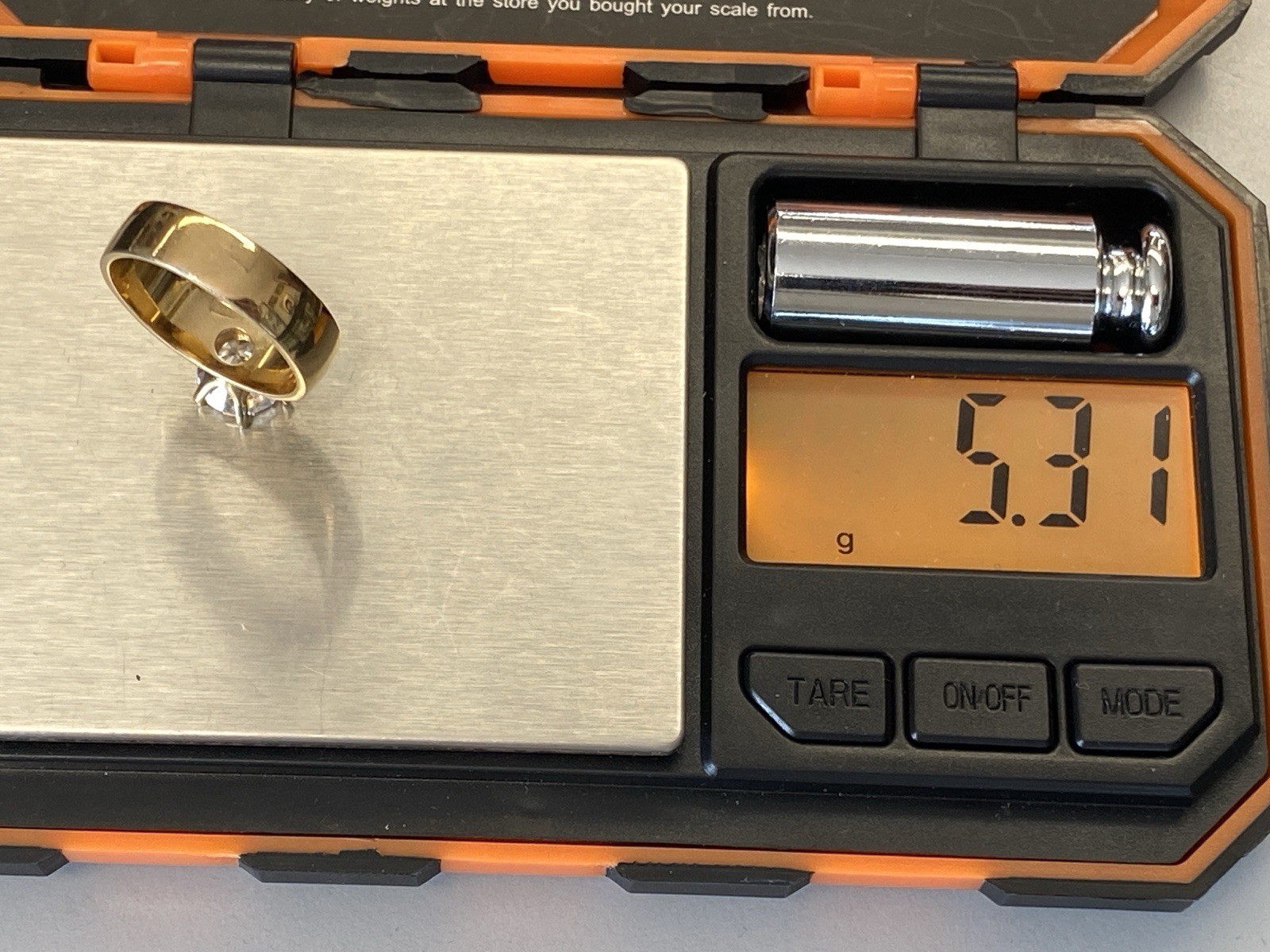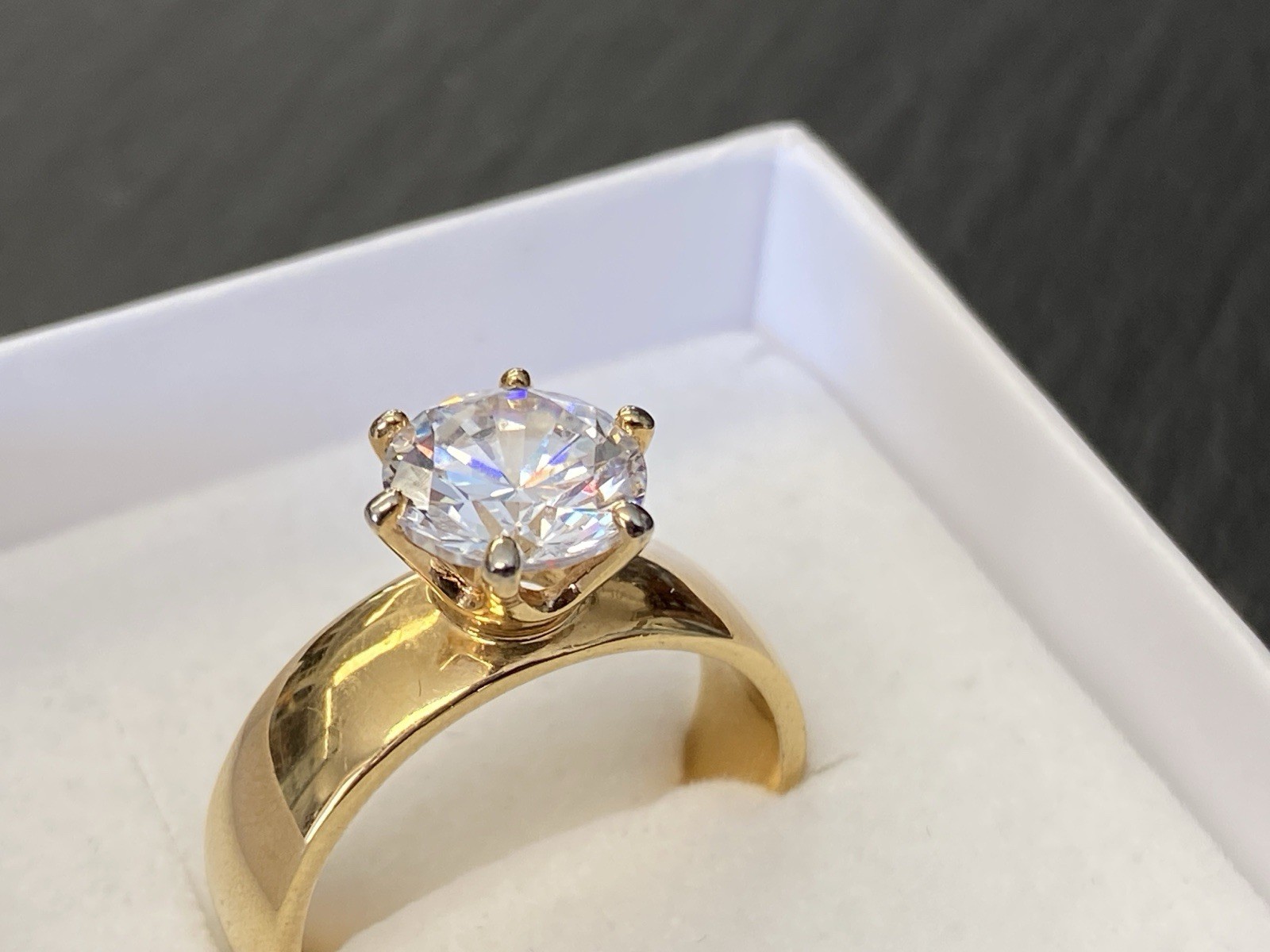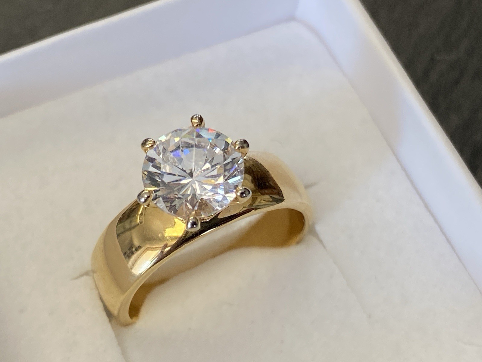 Eleganter Ring aus wahrs. vergoldetem Metall, ungestempelt, mit einem farblosen Glasstein. Dieser hat einen Durchmesser von 8,48mm, seine Oberfläche ist minimal berieben. Im Inneren des Steines sind viele Luftblasen zu sehen, allerdings mit einer Lupe, mit bloßem Auge sind diese nicht zu sehen. Die Oberfläche des Ringes ist berieben und angelaufen. B/H des Mittelteils 0,9/0,7cm, B/H der Ringschiene 0,6/0,1cm, RG 59, Gesamtgewicht ca. 5,31g.