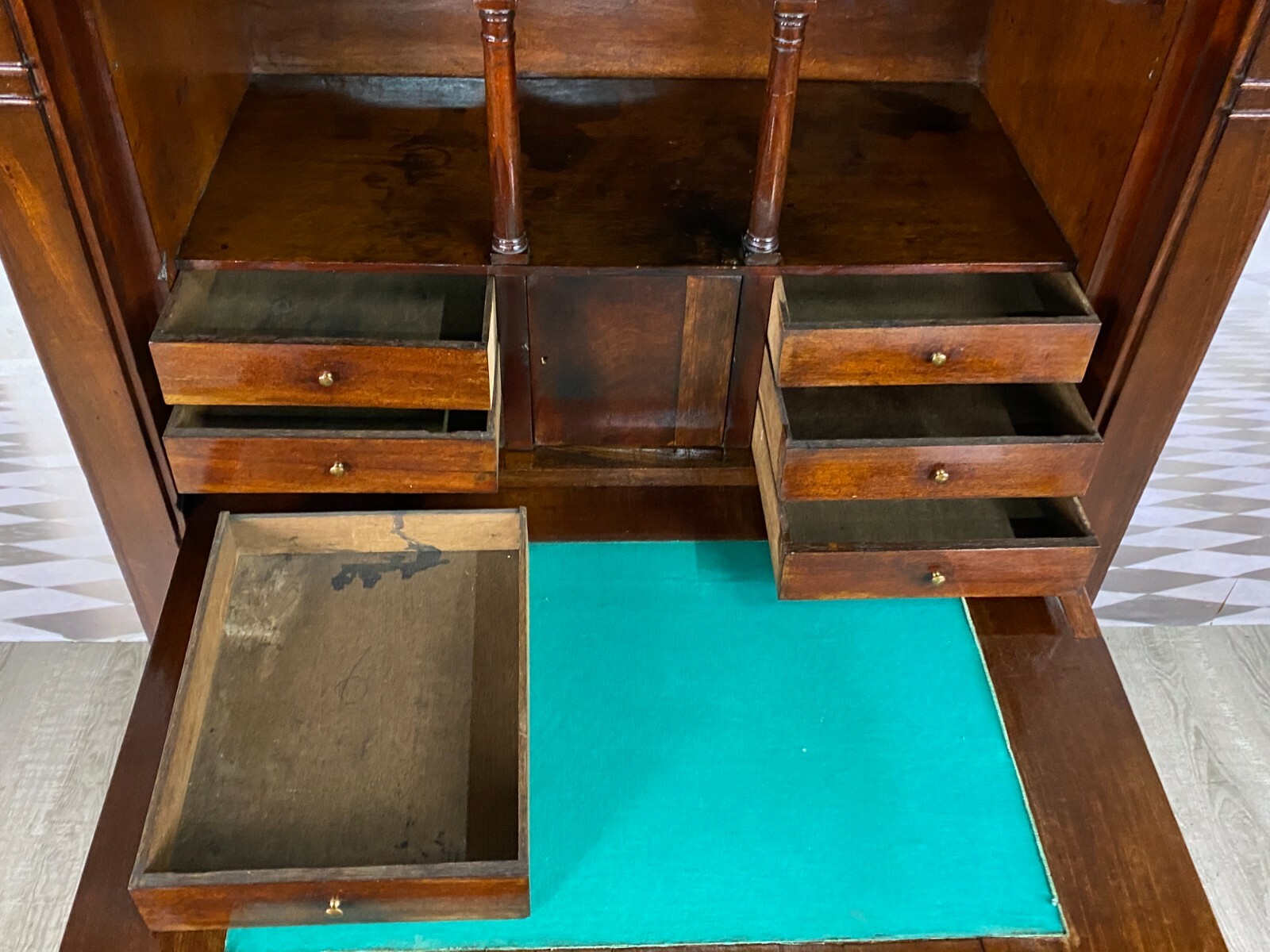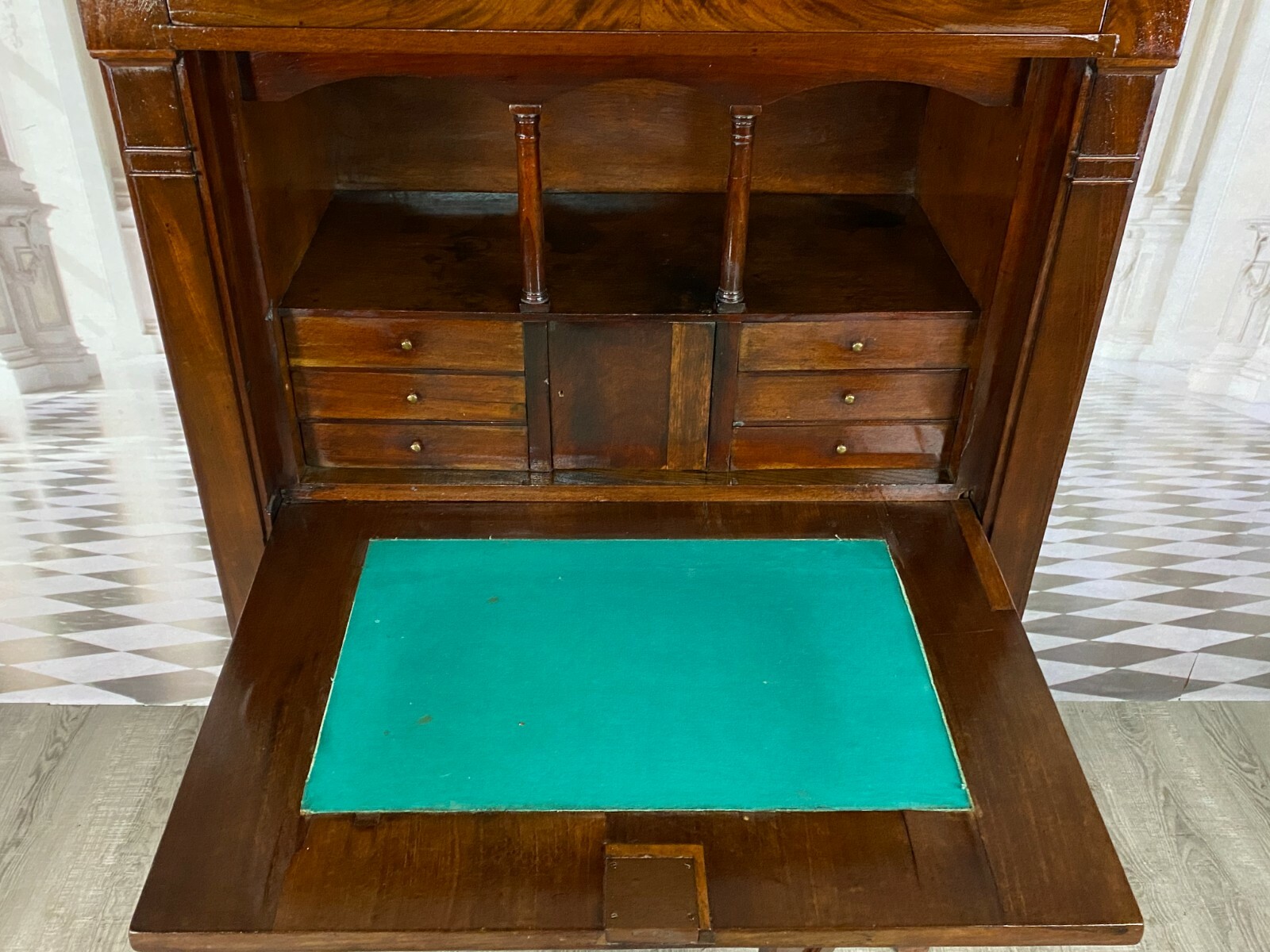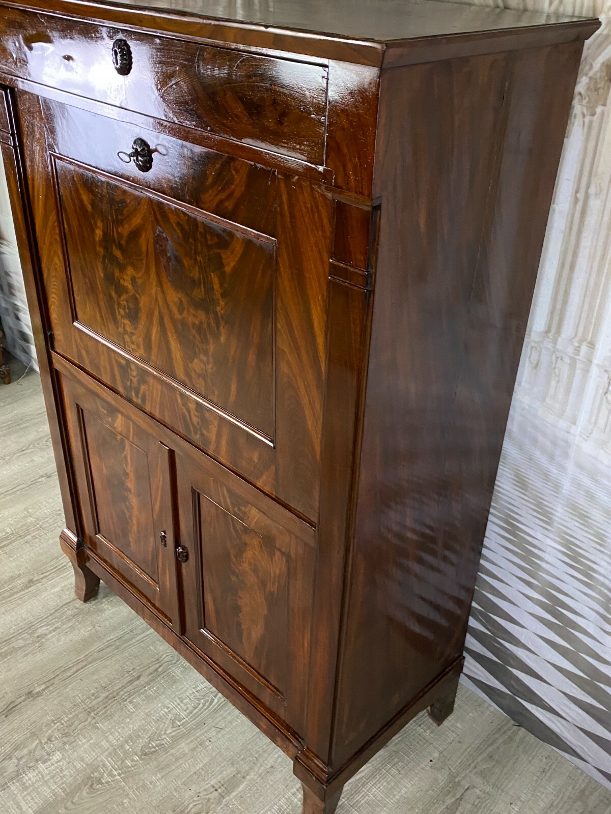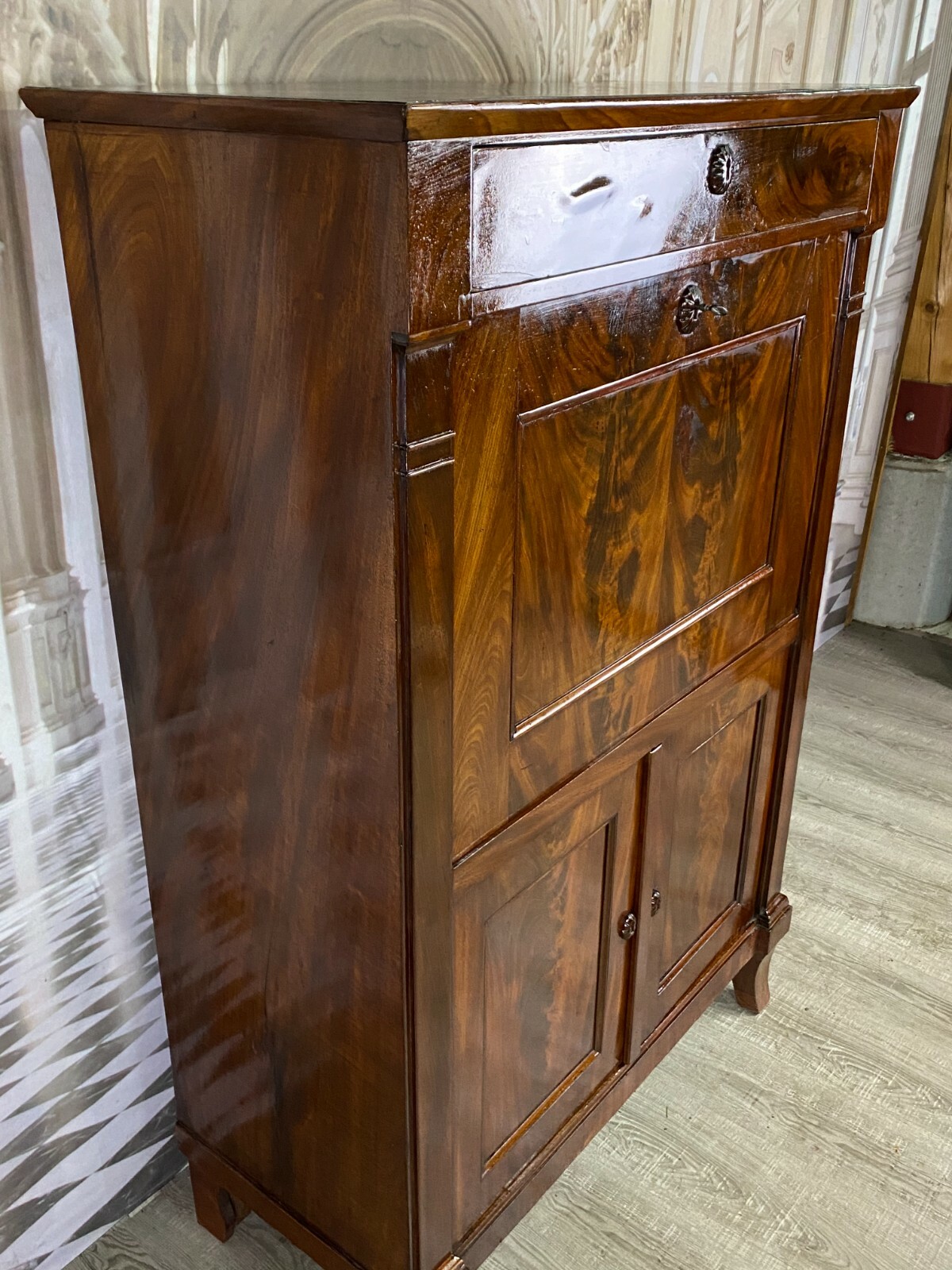 Antiker Empire Sekretär um 1820, Mahagoni furniert. Sehr schöner stabiler Zustand. An der oberen Platte einige Abreibungen und Furnierausbesserungen. An der Sekretärklappe wurde das Schloss ausgetauscht, im Innenraum teilweise Tintenflecken, die Filzablage ist nicht schön und auch nicht original. An der mittleren kleinen Tür und an der Schreibablage wurden teilweise Stücke ersetzt, die Schreibablage hat Dehnungsrisse. Das obere Schloss hängt teilweise. Im unteren Bereich sind innen die seitlichen Halterungen fürs Ablagebrett nicht mehr vorhanden, das Schloss ist nicht funktionsfähig. Die seitlichen Wände mit Dehnungsrissen. Im Fußbereich ist das Furnier teilweise beschädigt. Innenabmessungen im Unterbau BTH: 90x40x52cm, Abmessungen gesamt: 101x48x153cm. An der oberen Schublade ist das Furnier teilweise gebläht und an der Sekretärklappe wurde das Furnier an einer Stelle restauriert.