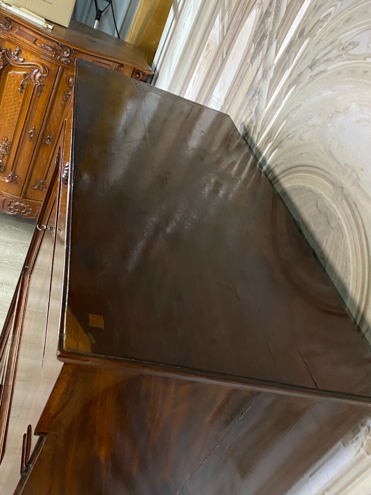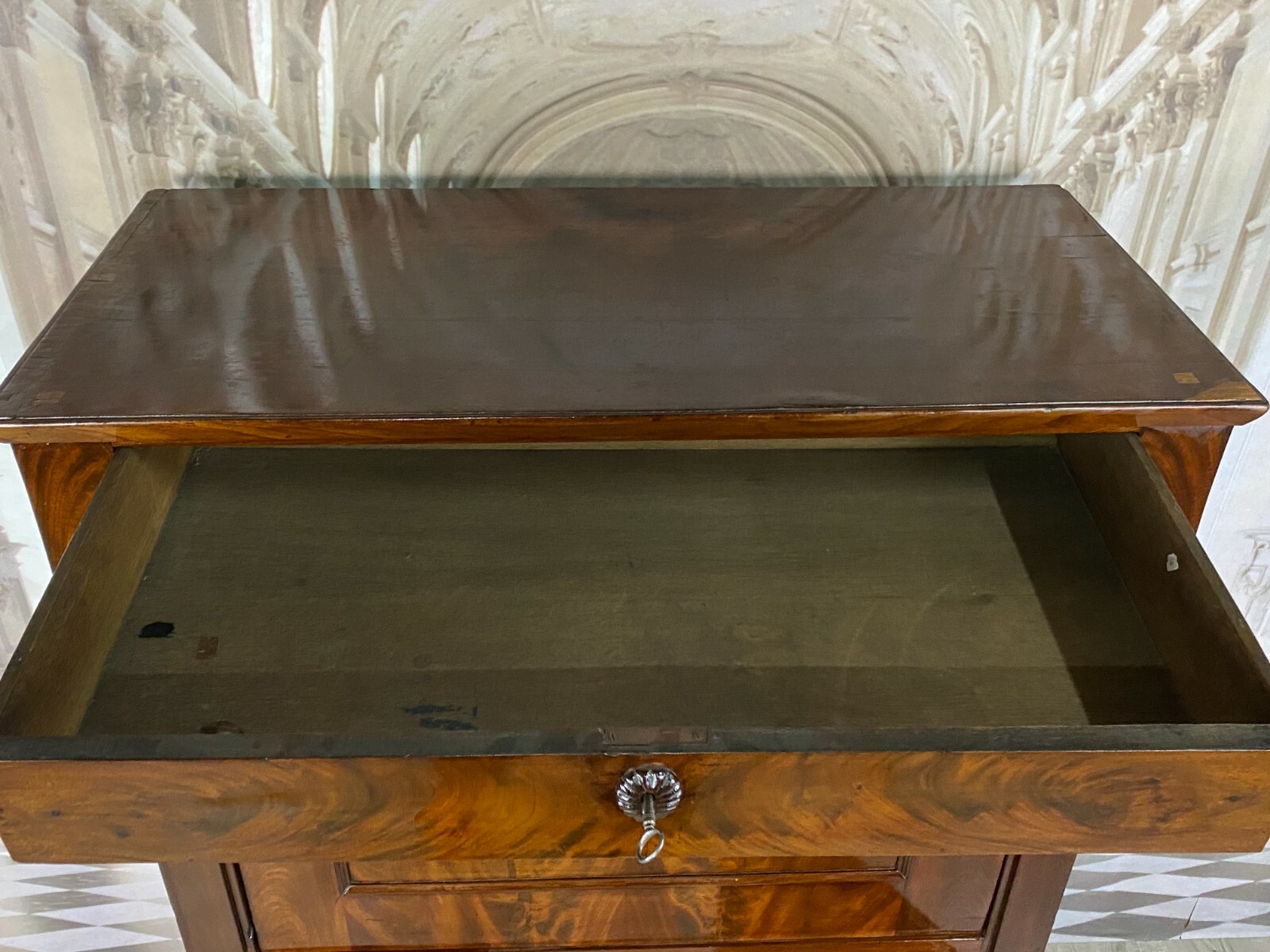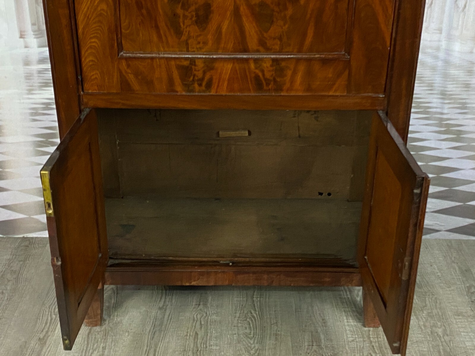 Antiker Empire Sekretär um 1820, Mahagoni furniert. Sehr schöner stabiler Zustand. An der oberen Platte einige Abreibungen und Furnierausbesserungen. An der Sekretärklappe wurde das Schloss ausgetauscht, im Innenraum teilweise Tintenflecken, die Filzablage ist nicht schön und auch nicht original. An der mittleren kleinen Tür und an der Schreibablage wurden teilweise Stücke ersetzt, die Schreibablage hat Dehnungsrisse. Das obere Schloss hängt teilweise. Im unteren Bereich sind innen die seitlichen Halterungen fürs Ablagebrett nicht mehr vorhanden, das Schloss ist nicht funktionsfähig. Die seitlichen Wände mit Dehnungsrissen. Im Fußbereich ist das Furnier teilweise beschädigt. Innenabmessungen im Unterbau BTH: 90x40x52cm, Abmessungen gesamt: 101x48x153cm. An der oberen Schublade ist das Furnier teilweise gebläht und an der Sekretärklappe wurde das Furnier an einer Stelle restauriert.
