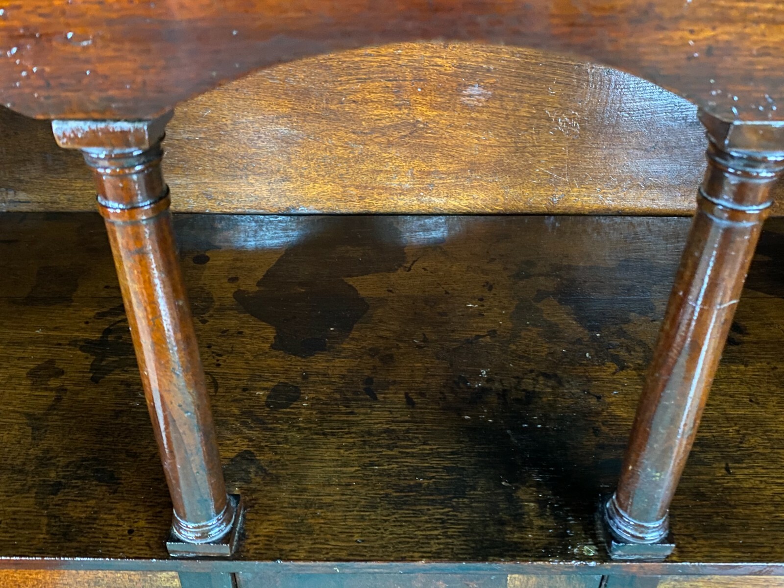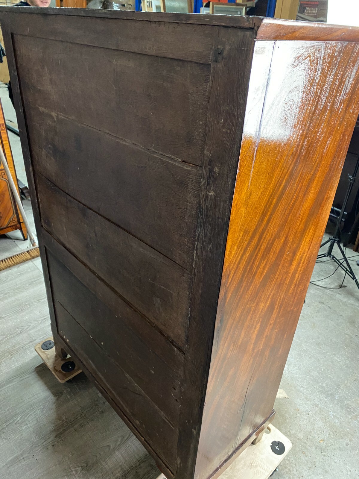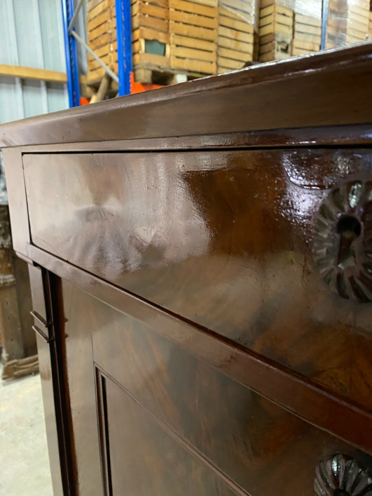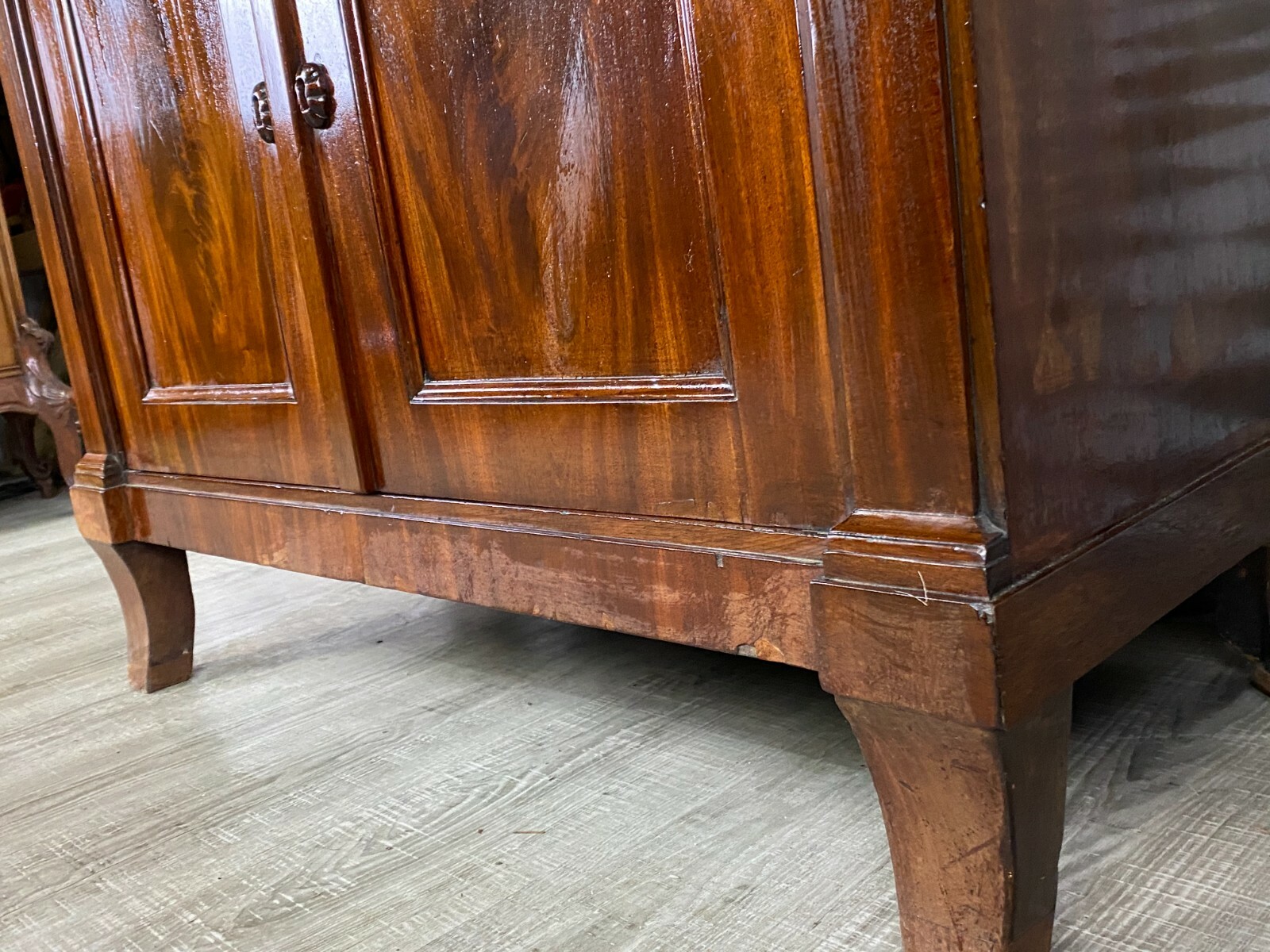 Antiker Empire Sekretär um 1820, Mahagoni furniert. Sehr schöner stabiler Zustand. An der oberen Platte einige Abreibungen und Furnierausbesserungen. An der Sekretärklappe wurde das Schloss ausgetauscht, im Innenraum teilweise Tintenflecken, die Filzablage ist nicht schön und auch nicht original. An der mittleren kleinen Tür und an der Schreibablage wurden teilweise Stücke ersetzt, die Schreibablage hat Dehnungsrisse. Das obere Schloss hängt teilweise. Im unteren Bereich sind innen die seitlichen Halterungen fürs Ablagebrett nicht mehr vorhanden, das Schloss ist nicht funktionsfähig. Die seitlichen Wände mit Dehnungsrissen. Im Fußbereich ist das Furnier teilweise beschädigt. Innenabmessungen im Unterbau BTH: 90x40x52cm, Abmessungen gesamt: 101x48x153cm. An der oberen Schublade ist das Furnier teilweise gebläht und an der Sekretärklappe wurde das Furnier an einer Stelle restauriert.