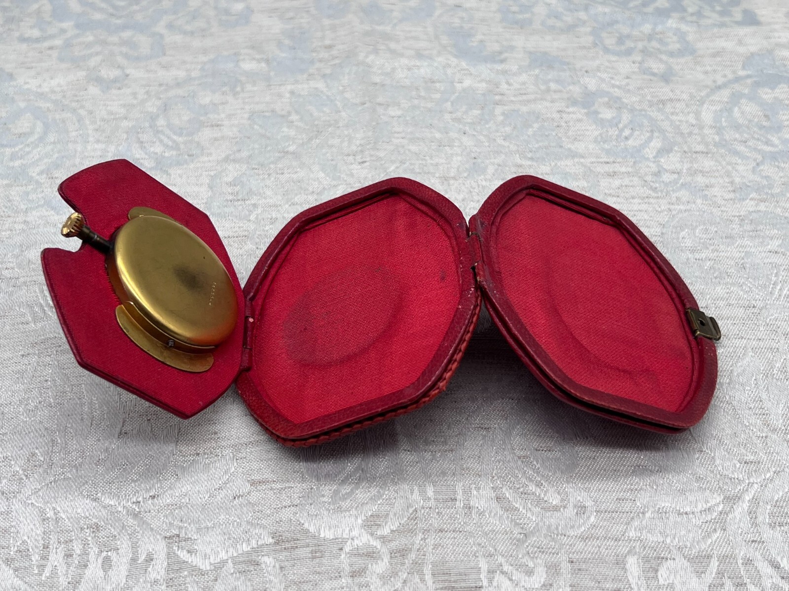 Artikelstandort: 83727 Schliersee – Wundervolle Reiseuhr Eterna, 8 Tage Werk. Etui aus Leder, Gehäuse aus Metall. Am Etui ganz leicht berieben, Ziffernblatt zum Teil verdunkelt und Uhr-Rückseite berieben. Ein kleines Stück der Zeigerbeschichtung liegt lose im Gehäuse, wir haben die Uhr absichtlich nicht geöffnet um diese zu entfernen, möglicherweise soll es bei einer Restauration genutzt werden. Abmessung Uhr 6x4cm, Etui 10×8,5cm. Die Uhr ist funktionsfähig, sie hat keine aktuelle Wartung und wird ohne Garantie verkauft.