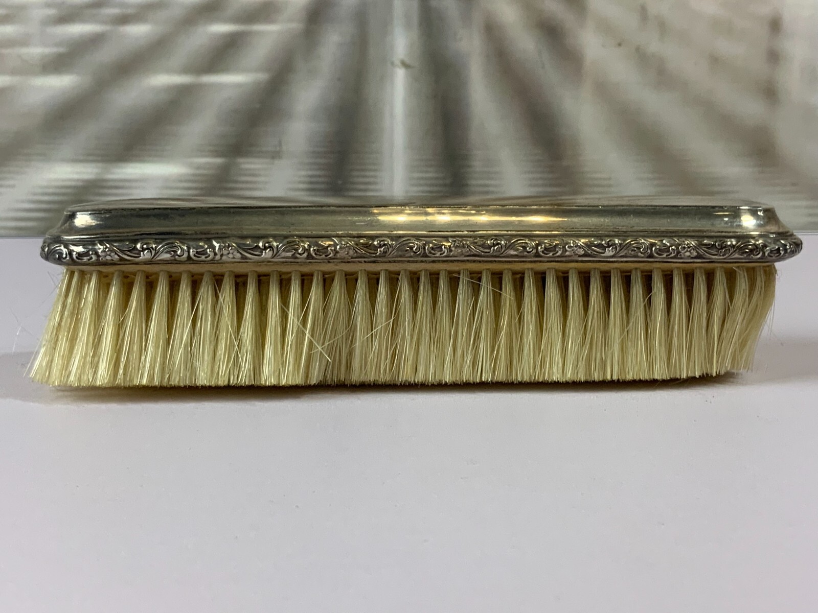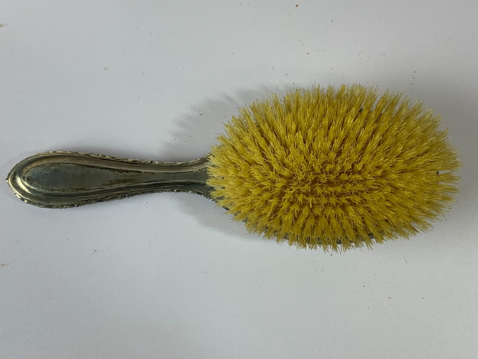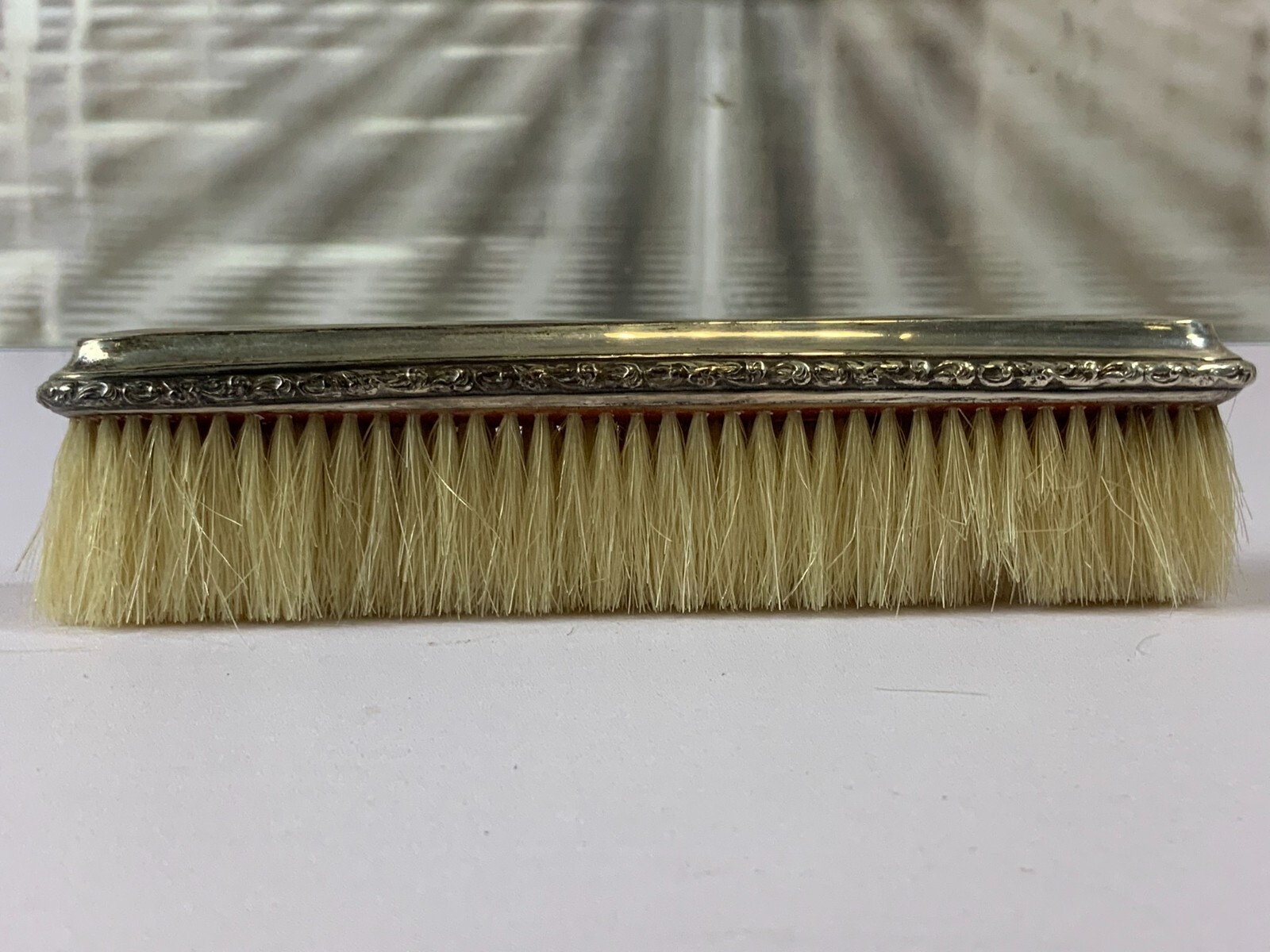 Bürstenset mit Silbermontur. 800er Silber, punziert. Oberfläche leicht angelaufen und leicht berieben, kleinere Dellen. Die Einsätze wurden wohl mal ausgetauscht. Längen 16/18/23cm.