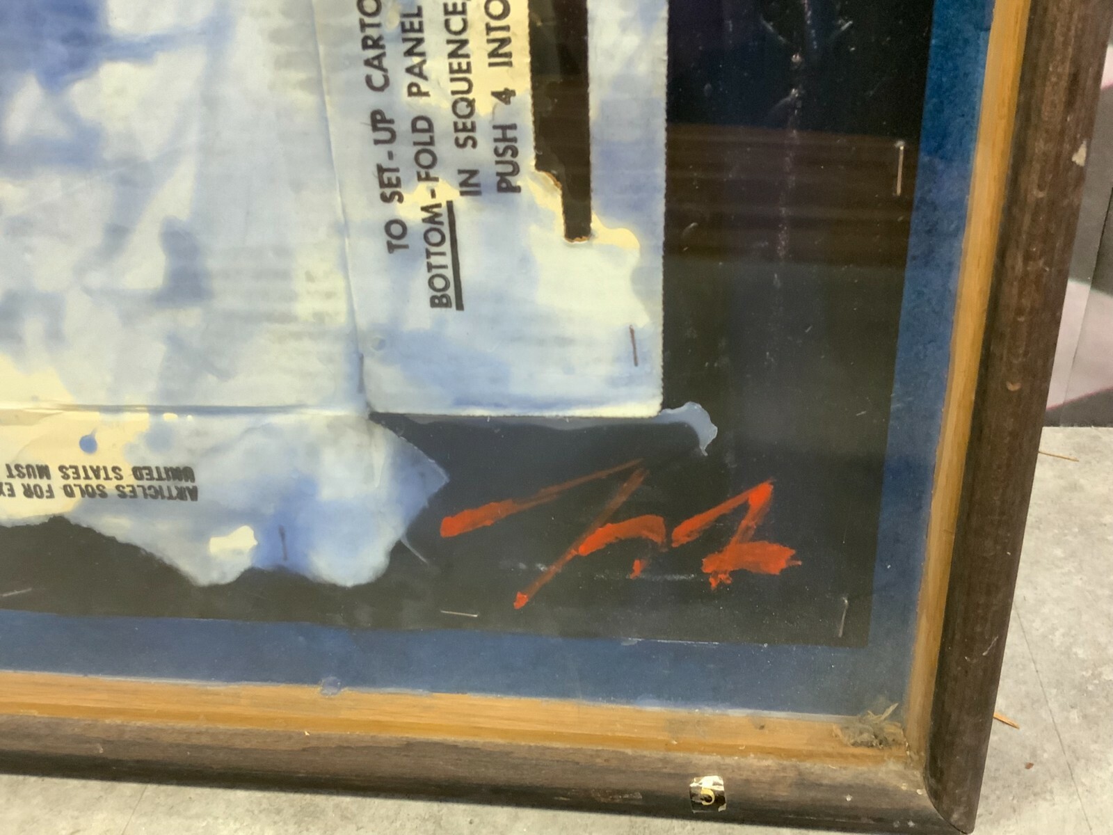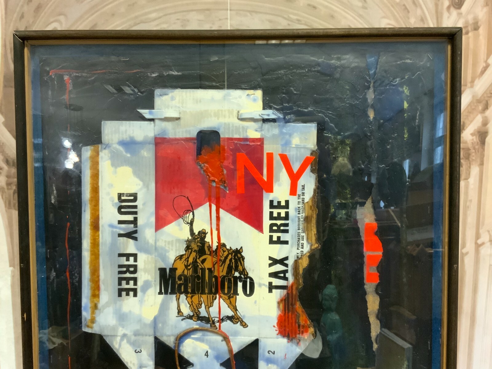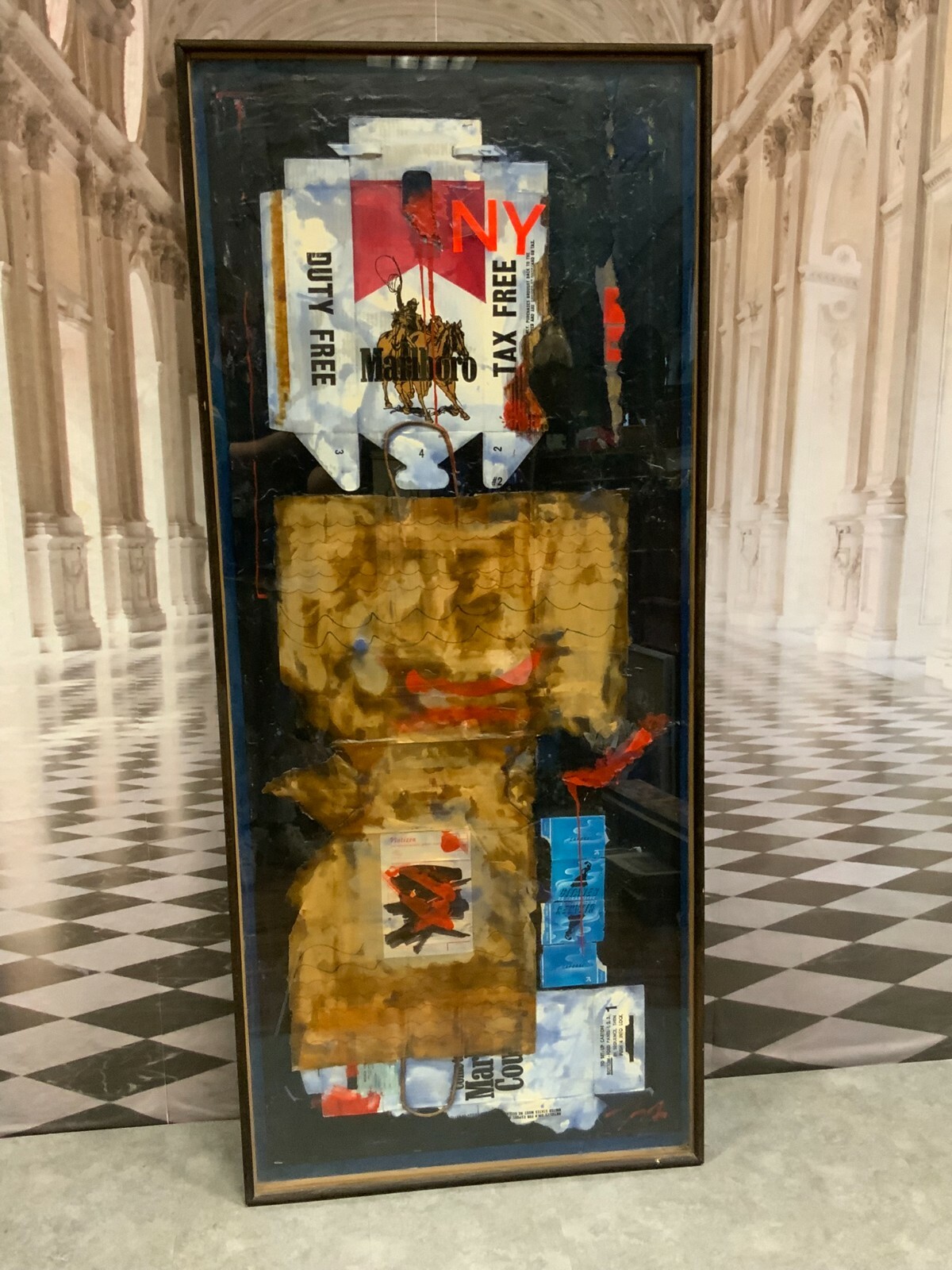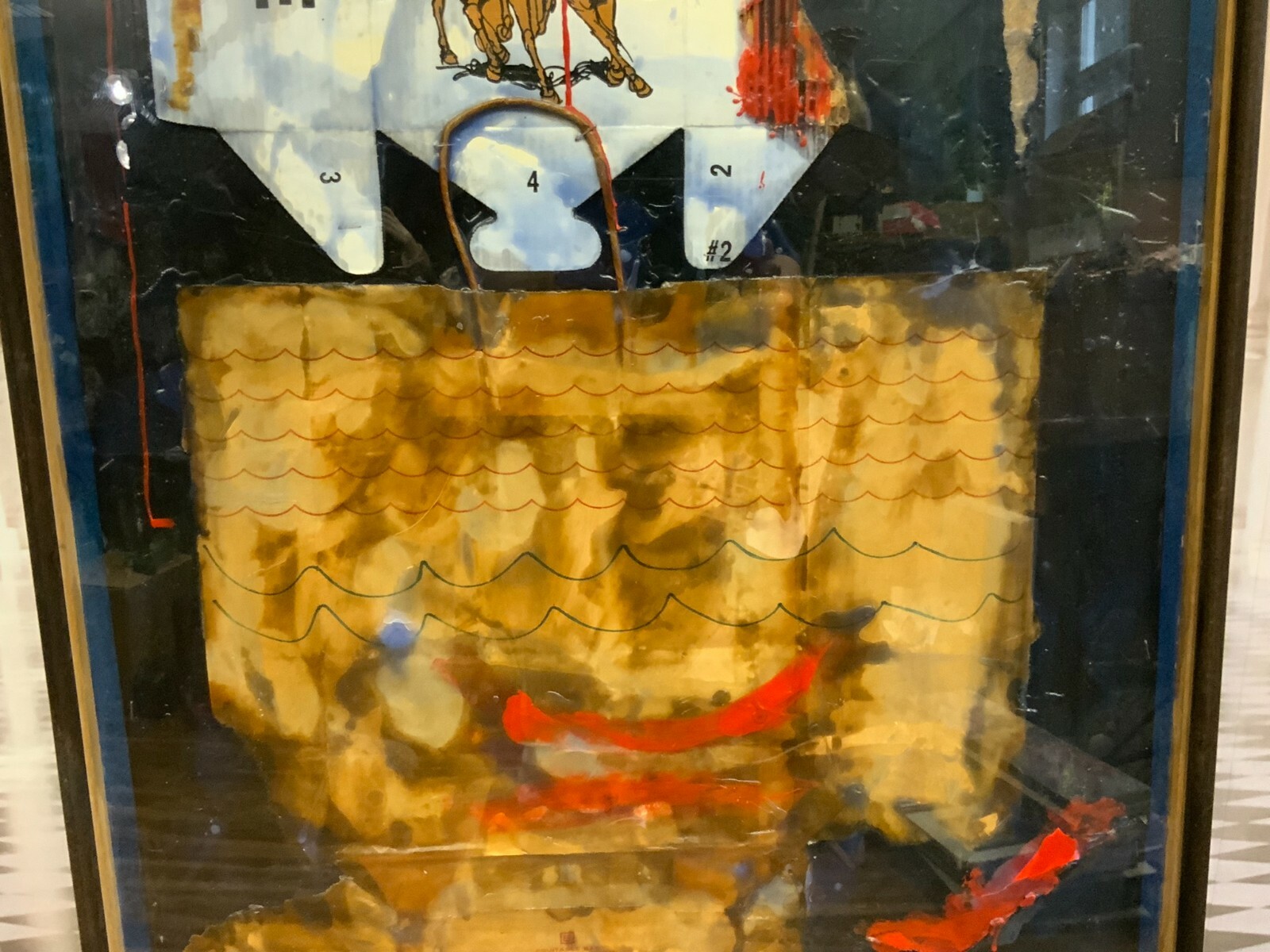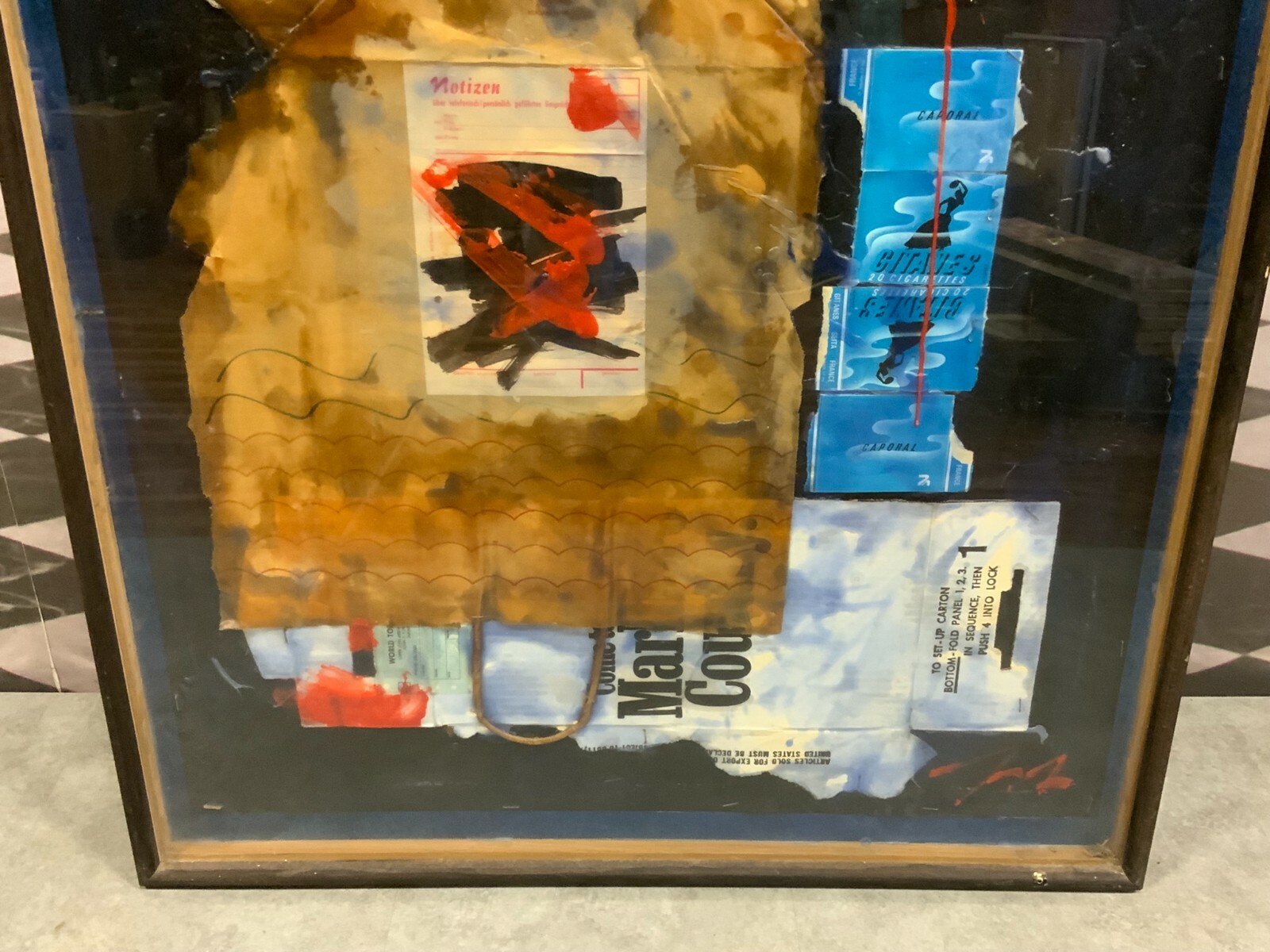 Artikelstandort: 83727 Schliersee – Sehr imposante Collage / Acryl Gemälde von Georg Sternbacher (1933-1995), signiert und rückseitig mit Aufkleber der Ausstellung im Kunstsalon 1978 in München. Abmessungen BTH gesamt 77x6x179cm. Der Rahmen zum Teil berieben, teils mit Klebespuren von Klebeband.