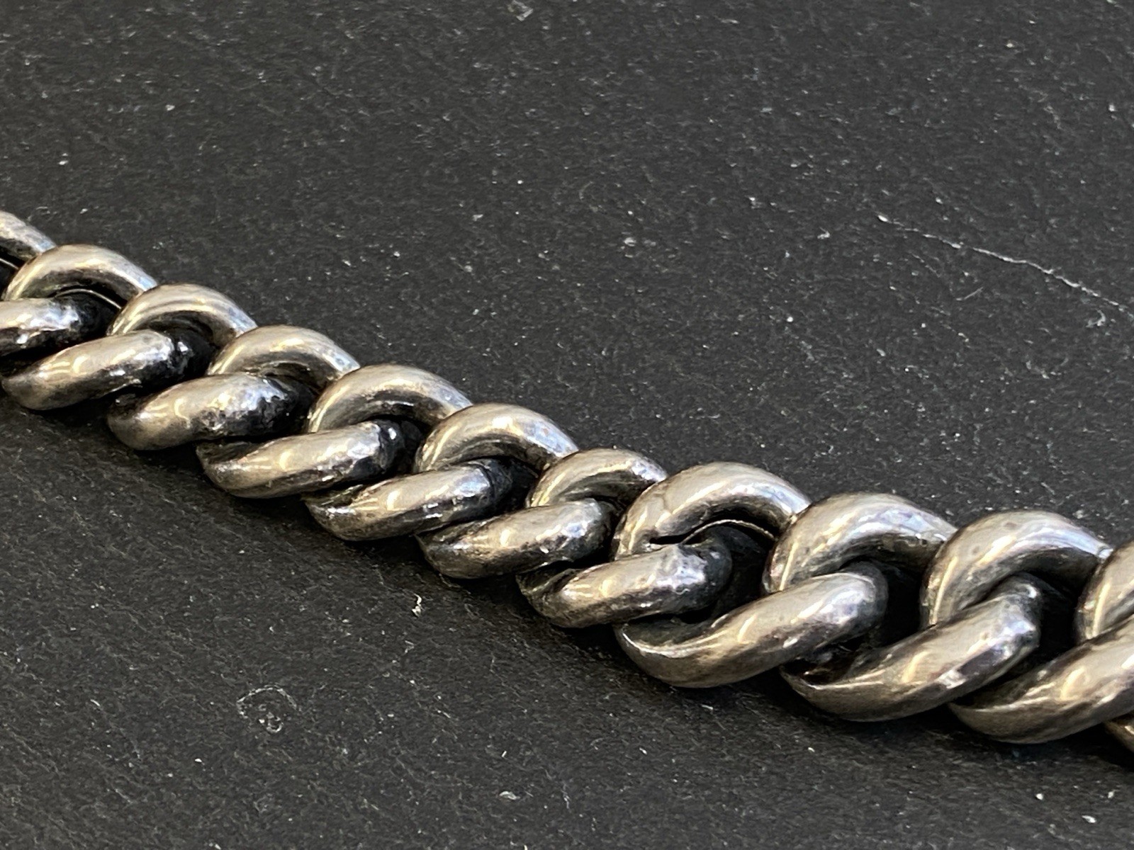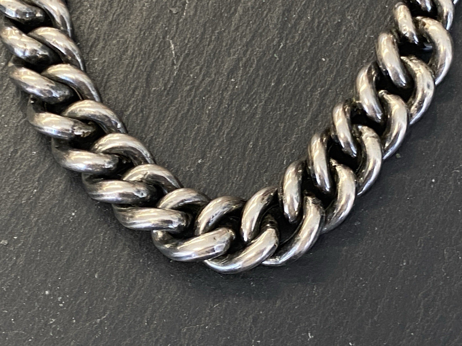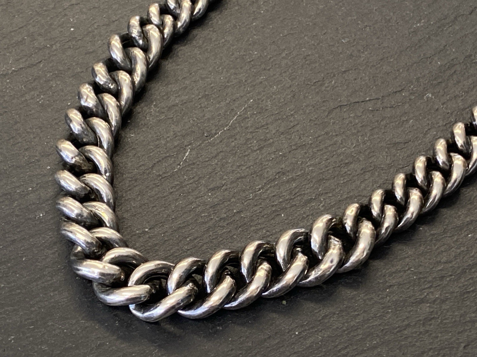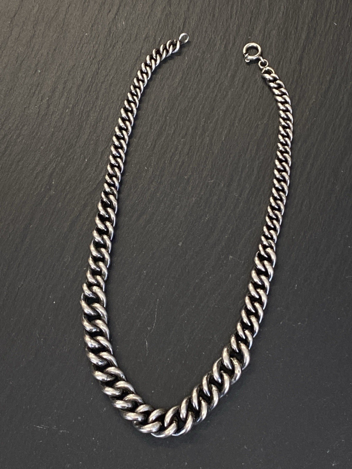 Gliederkette aus 925 Sterling Silber, gestempelt, mit nach vorne größer werdenden Gliedern. Die Glieder sind intakt, der Verschluss schließt. Sehr schöner Zustand, Gesamtlänge 46cm, B/H des größten Glieds 1,3/0,6cm, Gesamtgewicht ca. 44,00g.