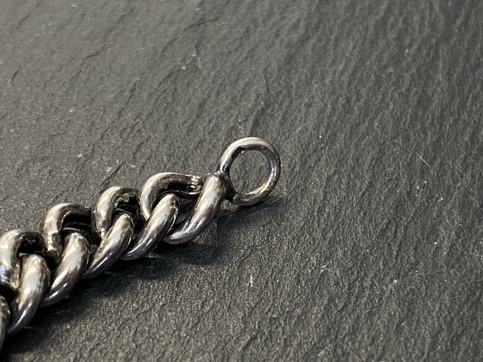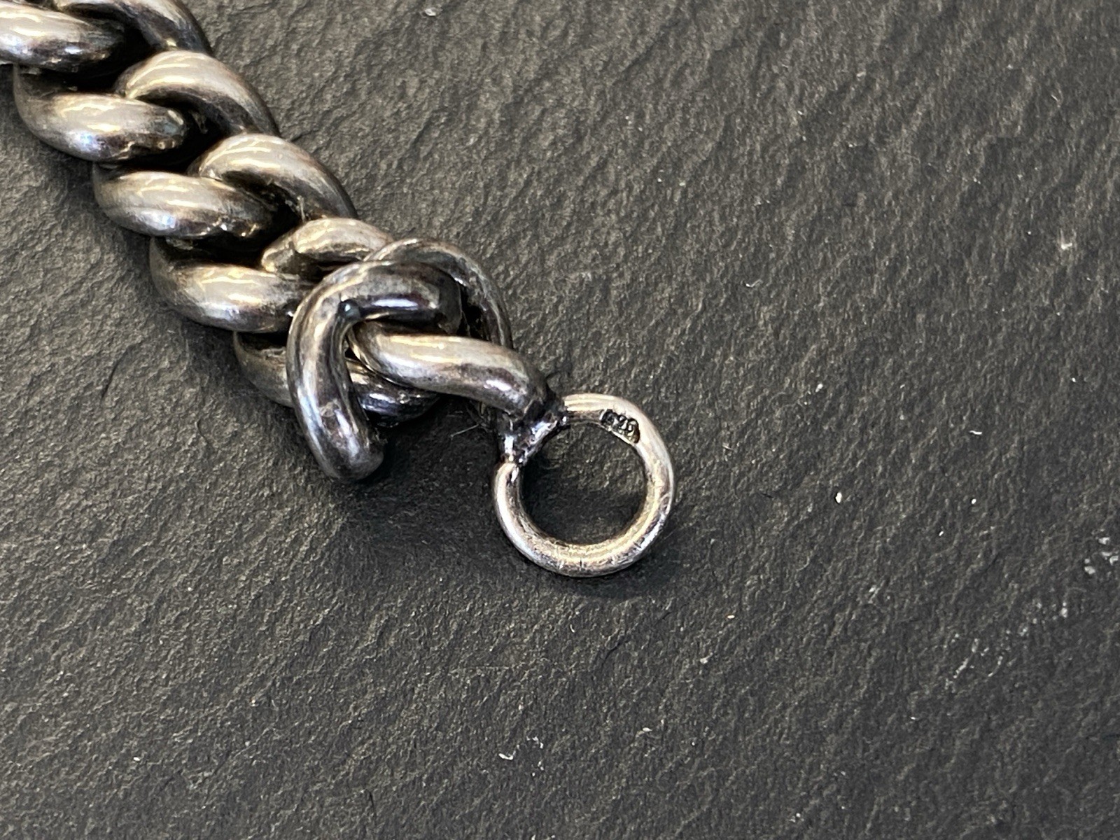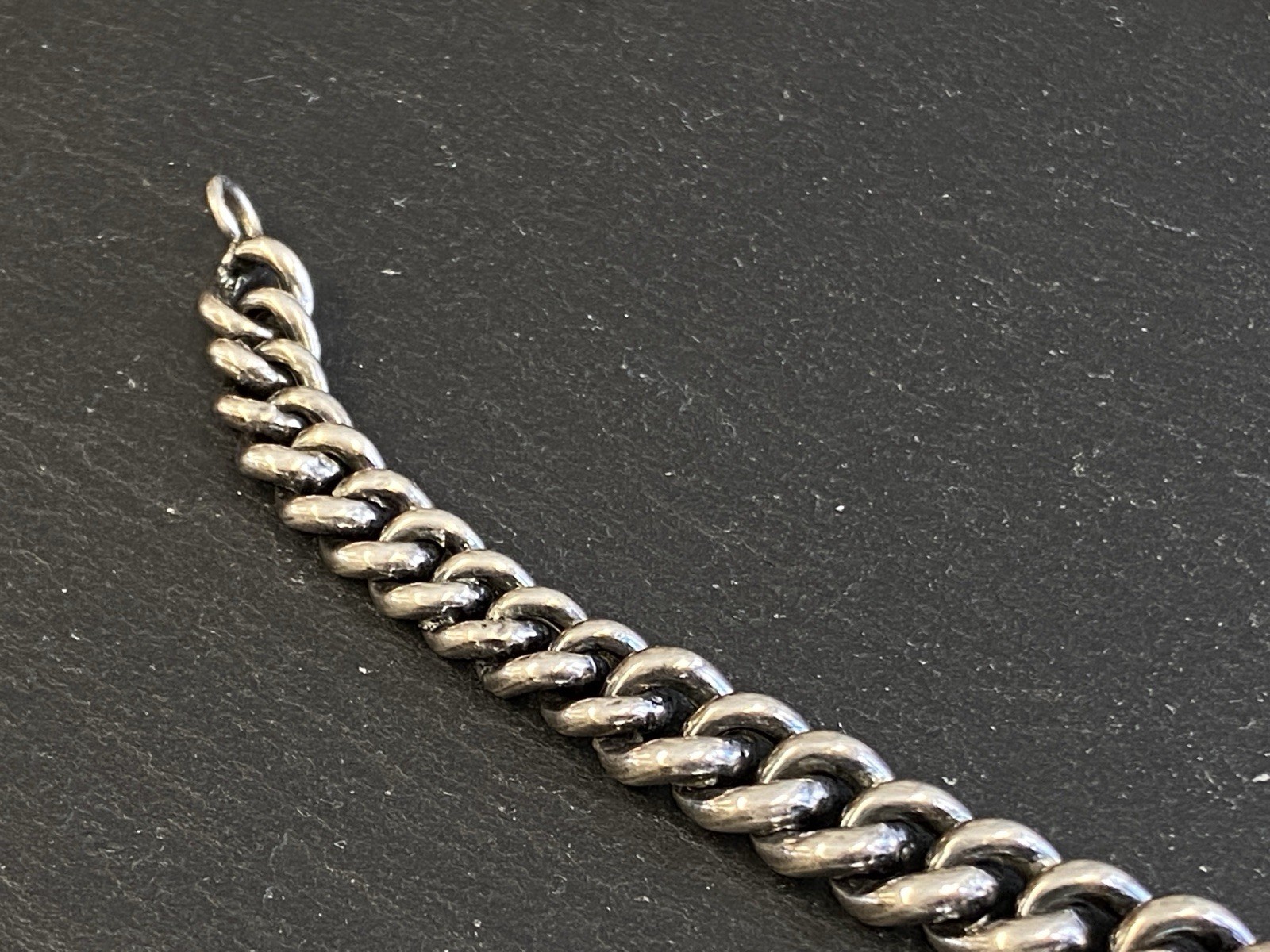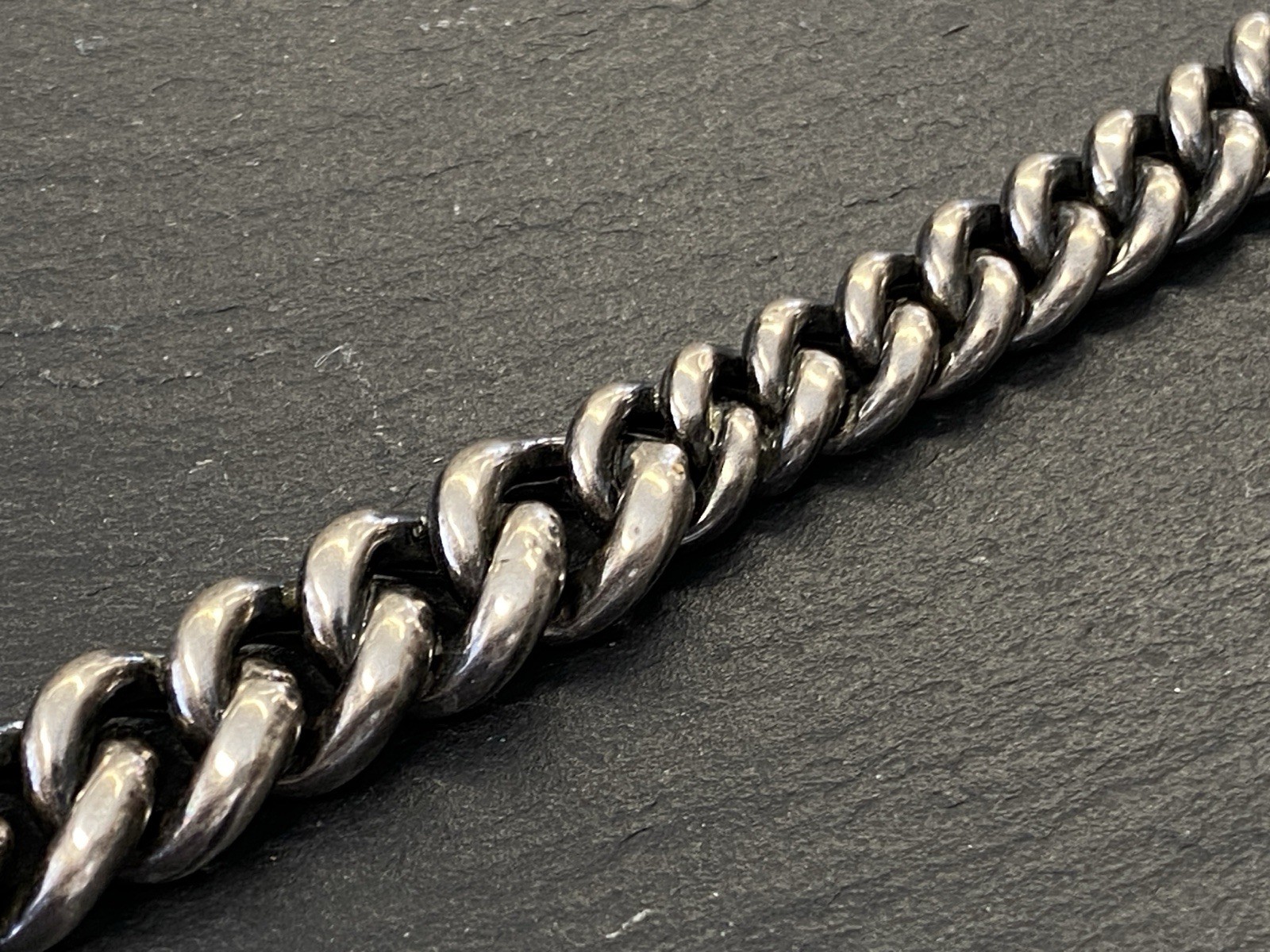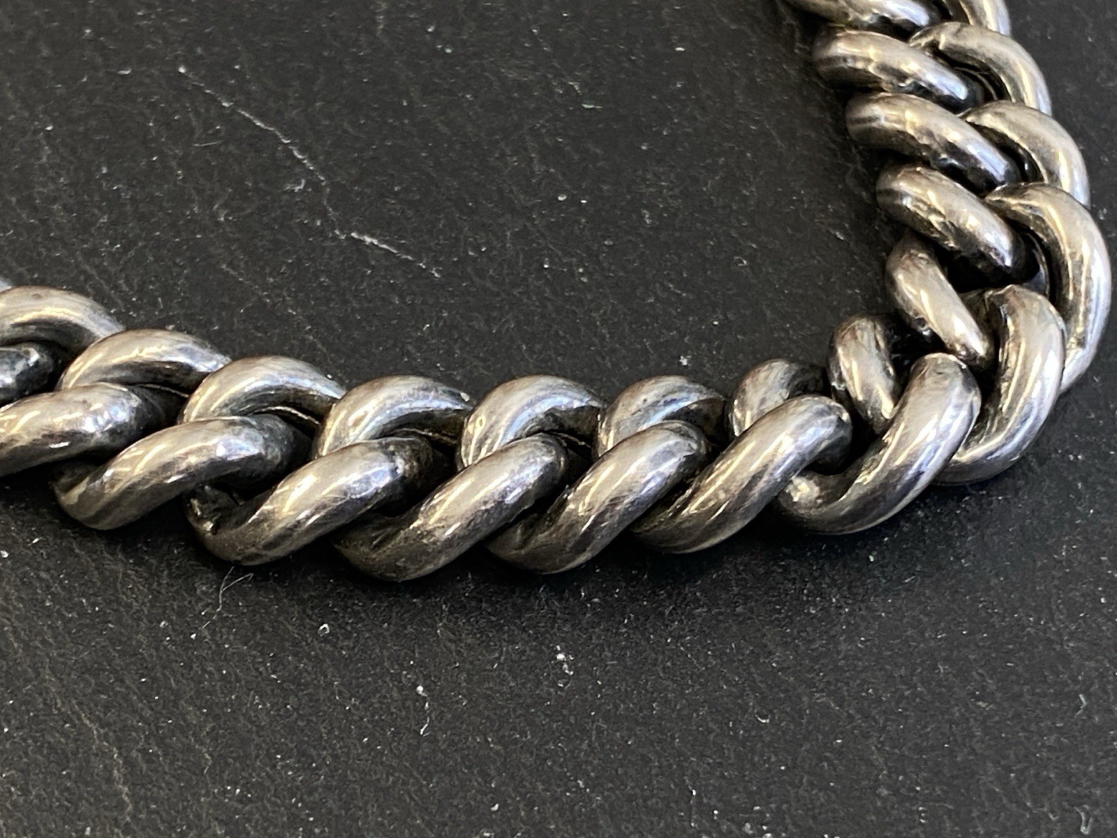 Gliederkette aus 925 Sterling Silber, gestempelt, mit nach vorne größer werdenden Gliedern. Die Glieder sind intakt, der Verschluss schließt. Sehr schöner Zustand, Gesamtlänge 46cm, B/H des größten Glieds 1,3/0,6cm, Gesamtgewicht ca. 44,00g.