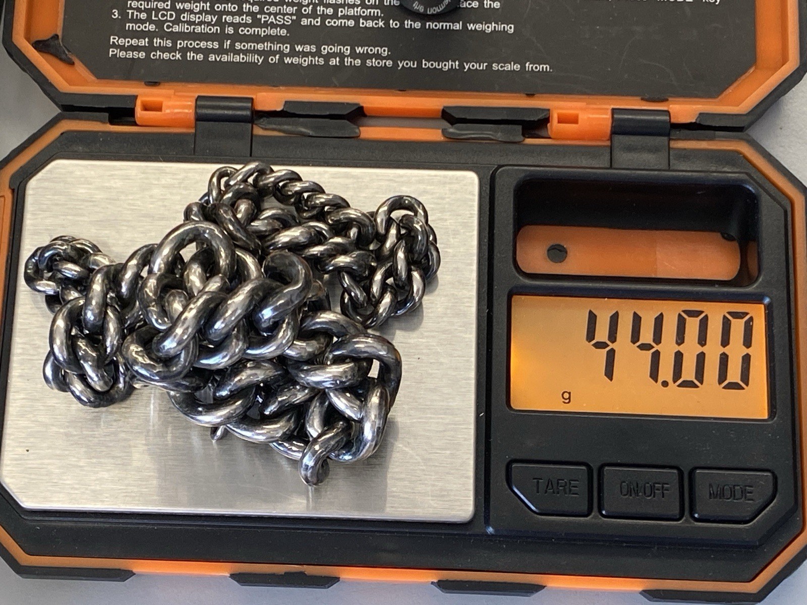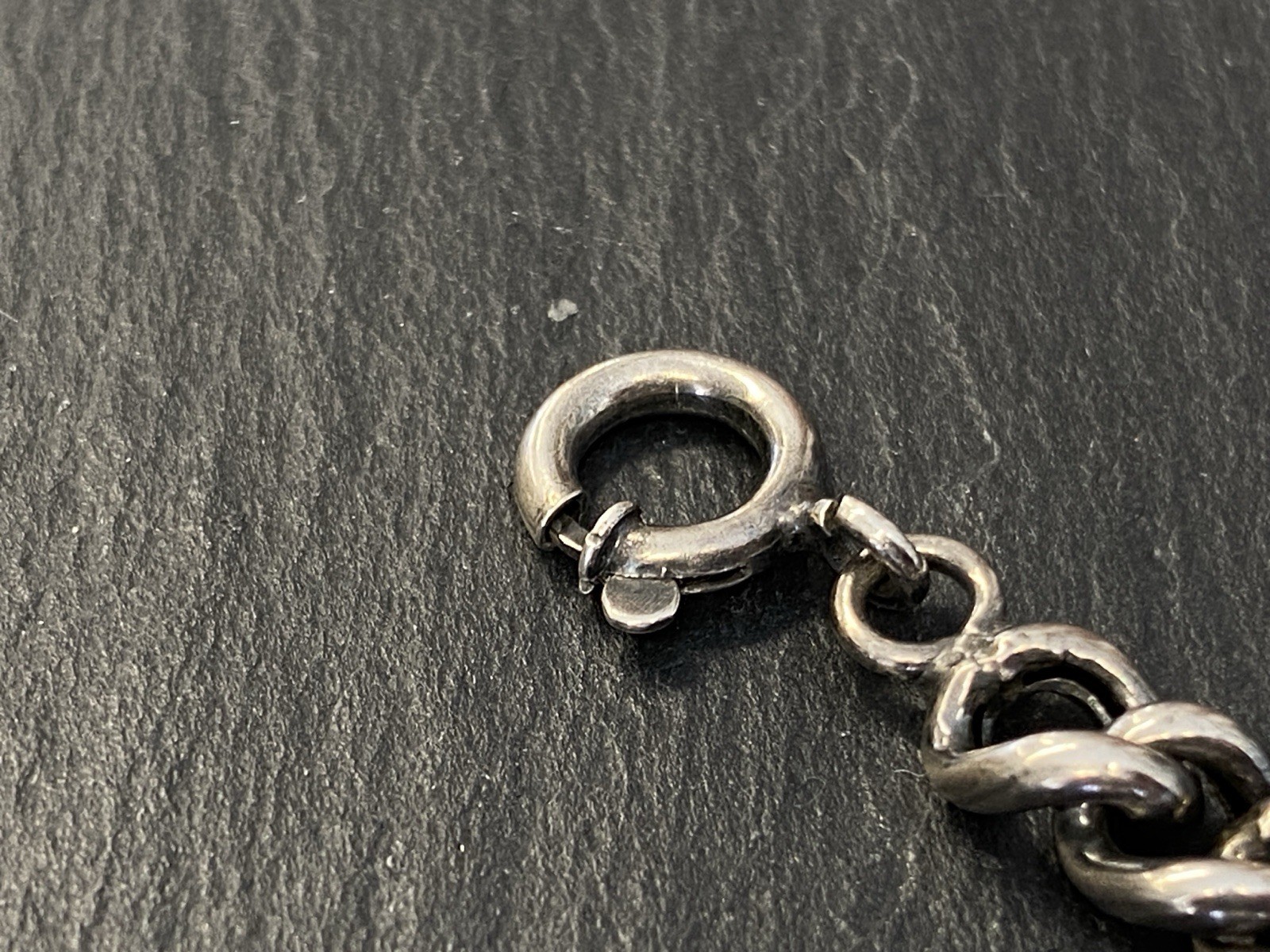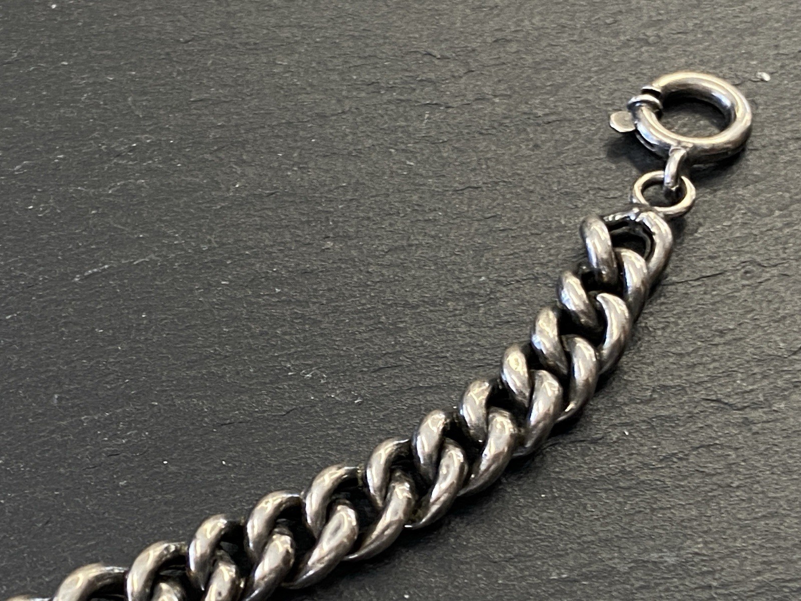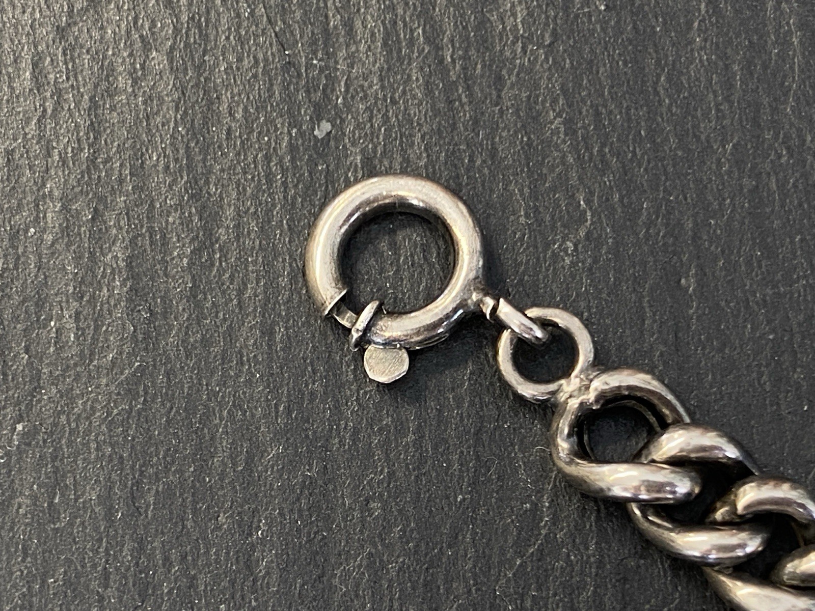 Gliederkette aus 925 Sterling Silber, gestempelt, mit nach vorne größer werdenden Gliedern. Die Glieder sind intakt, der Verschluss schließt. Sehr schöner Zustand, Gesamtlänge 46cm, B/H des größten Glieds 1,3/0,6cm, Gesamtgewicht ca. 44,00g.
