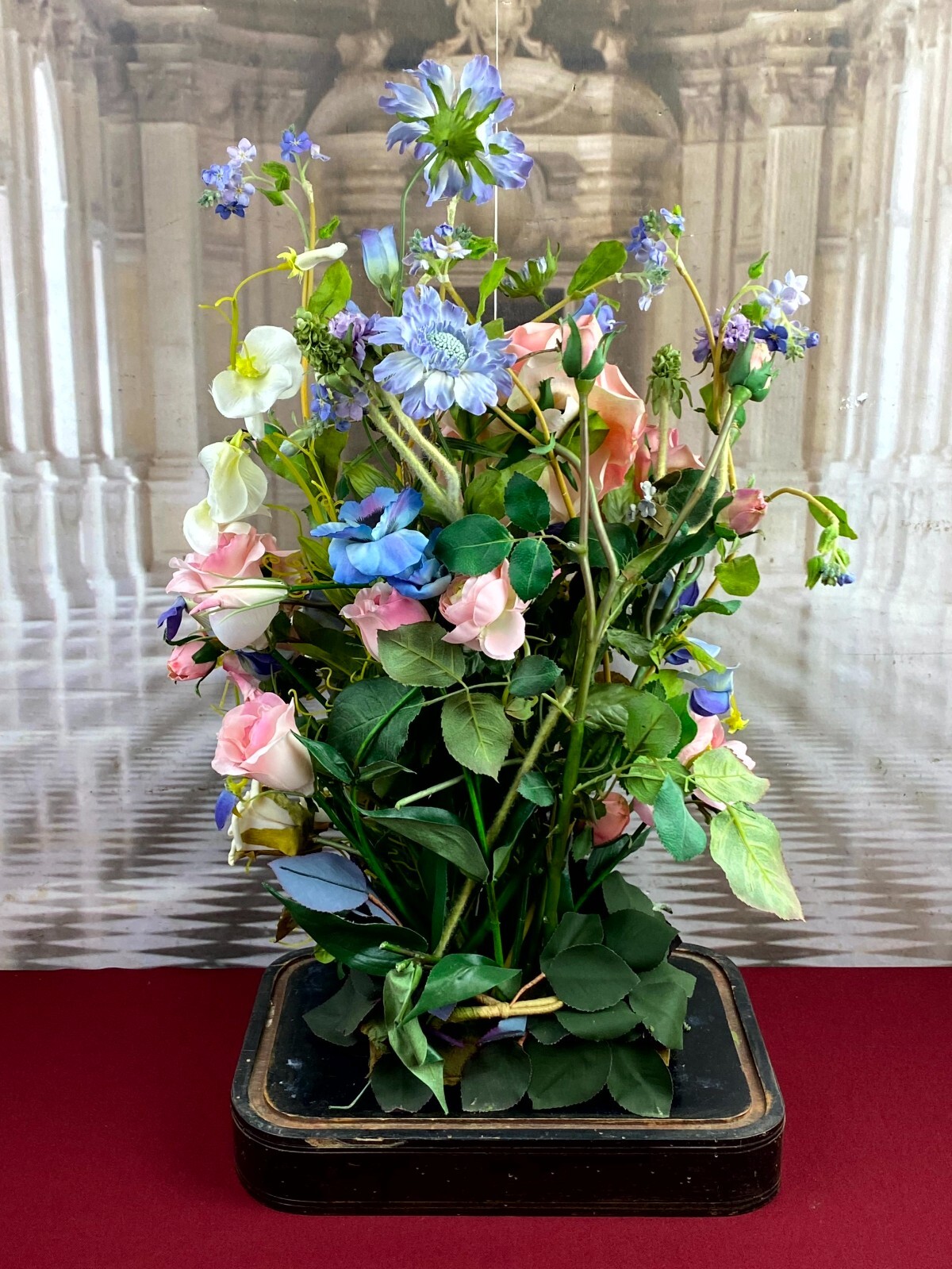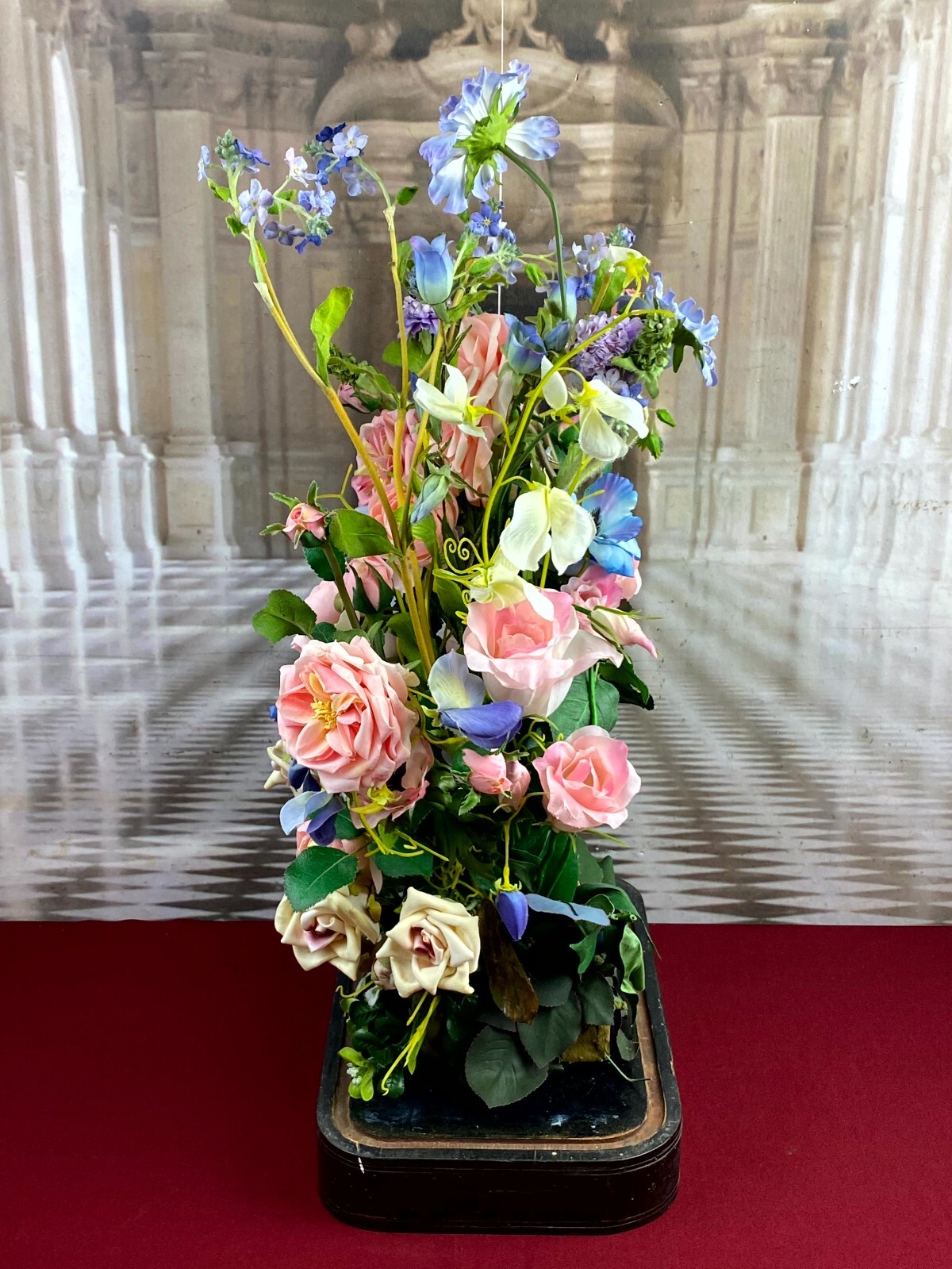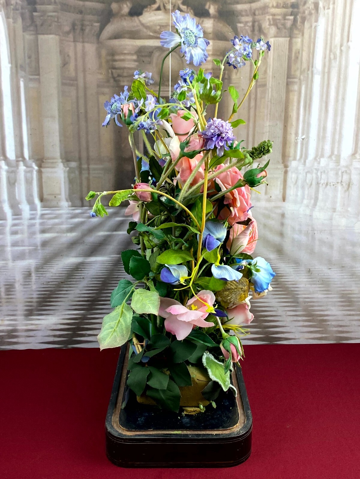 Sehr großes Blumengesteck aus künstlichen Blumen, sehr schöner Gesamtzustand. Am Sockel alter, inaktiver Wurmfraß und Abrieb, das untere Ende der Glaskuppel mit Papier überklebt, dieses ist vergilbt. Am Glas Sprung, der Schaumstoff hat sich an den Klebestellen zum Podest gelöst. Abmessungen BTH: 30x20x60cm. Die Blumen sind zum Teil ergänzt oder nicht aus der selben Zeit, einige Teile lose beiliegend. Sofern Metallteile vorhanden, können diese leicht verbogen sein.