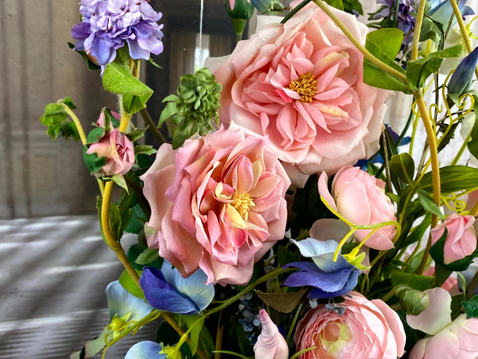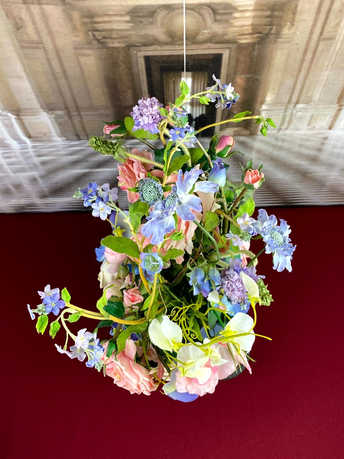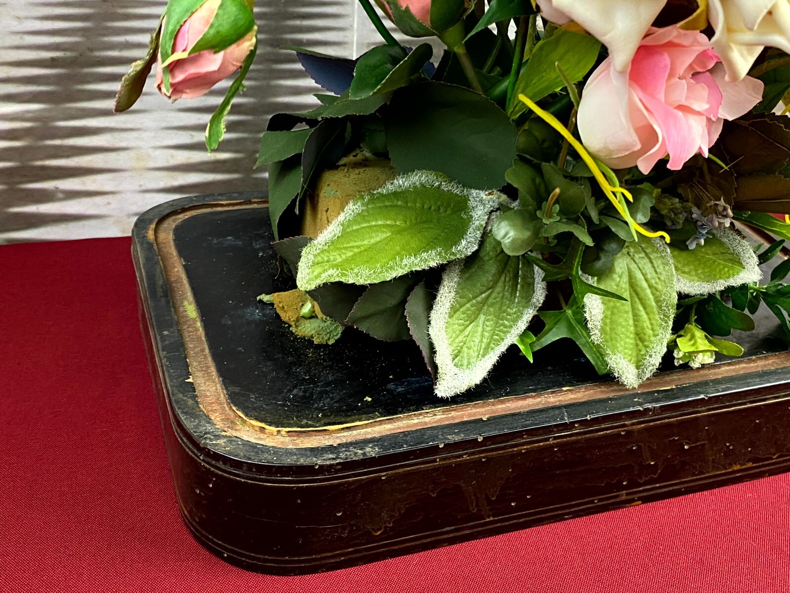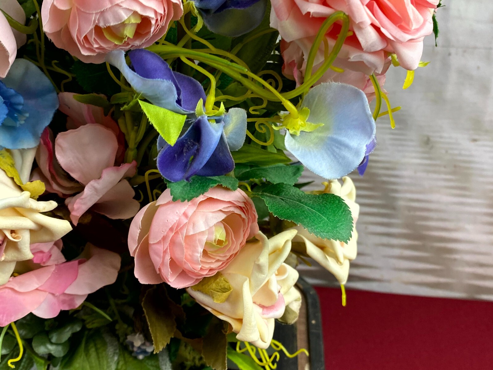 Sehr großes Blumengesteck aus künstlichen Blumen, sehr schöner Gesamtzustand. Am Sockel alter, inaktiver Wurmfraß und Abrieb, das untere Ende der Glaskuppel mit Papier überklebt, dieses ist vergilbt. Am Glas Sprung, der Schaumstoff hat sich an den Klebestellen zum Podest gelöst. Abmessungen BTH: 30x20x60cm. Die Blumen sind zum Teil ergänzt oder nicht aus der selben Zeit, einige Teile lose beiliegend. Sofern Metallteile vorhanden, können diese leicht verbogen sein.