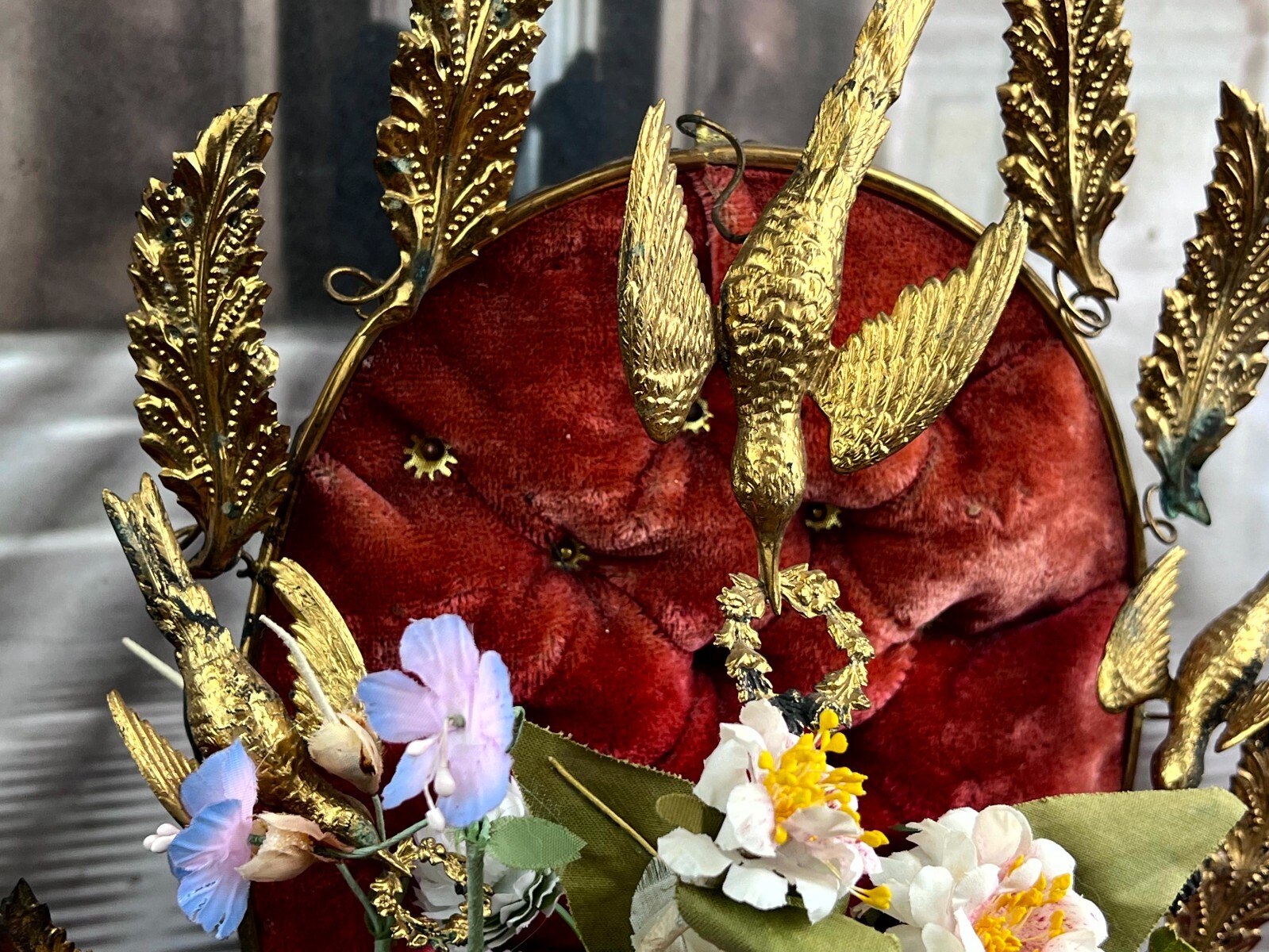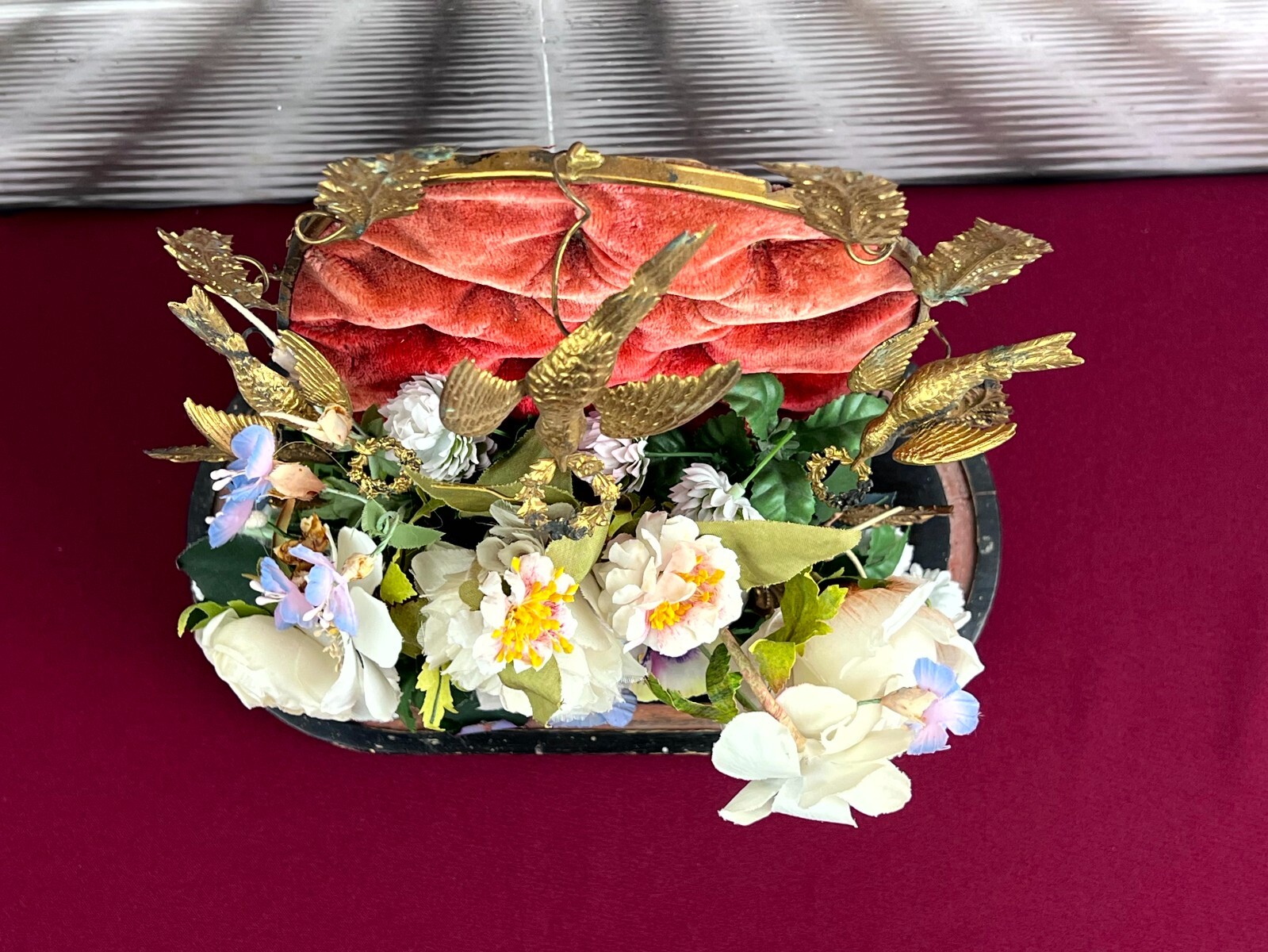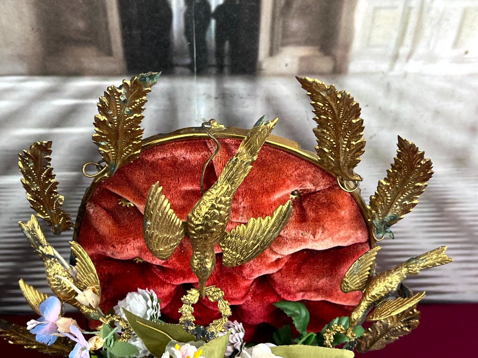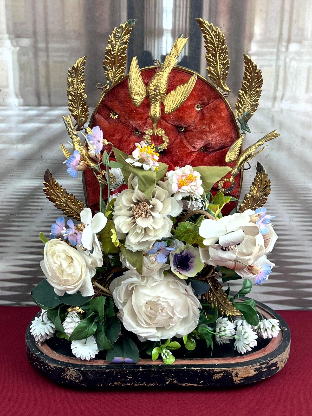 Antikes Gesteck, Kunstblumen gesteckt in einen Schwamm. Die goldenen Vögel sind aus Metall, hier diverse Oxidationsflecken. Das rote Samt ist ebenfalls brüchig, wie der Schwamm. Am Holzpodest berieben. Abmessungen BTH: 29x16x41cm. Die Blumen sind zum Teil ergänzt oder nicht aus der selben Zeit, einige Teile lose beiliegend. Sofern Metallteile vorhanden, können diese leicht verbogen sein.