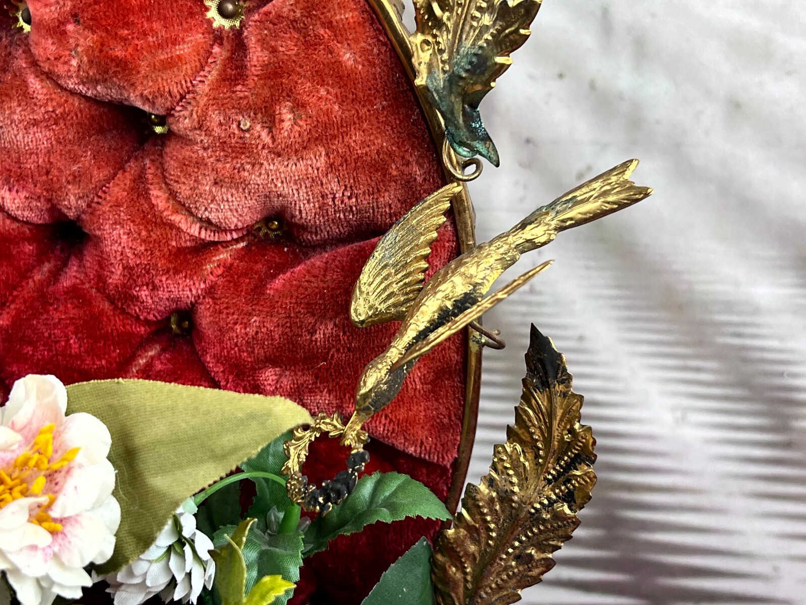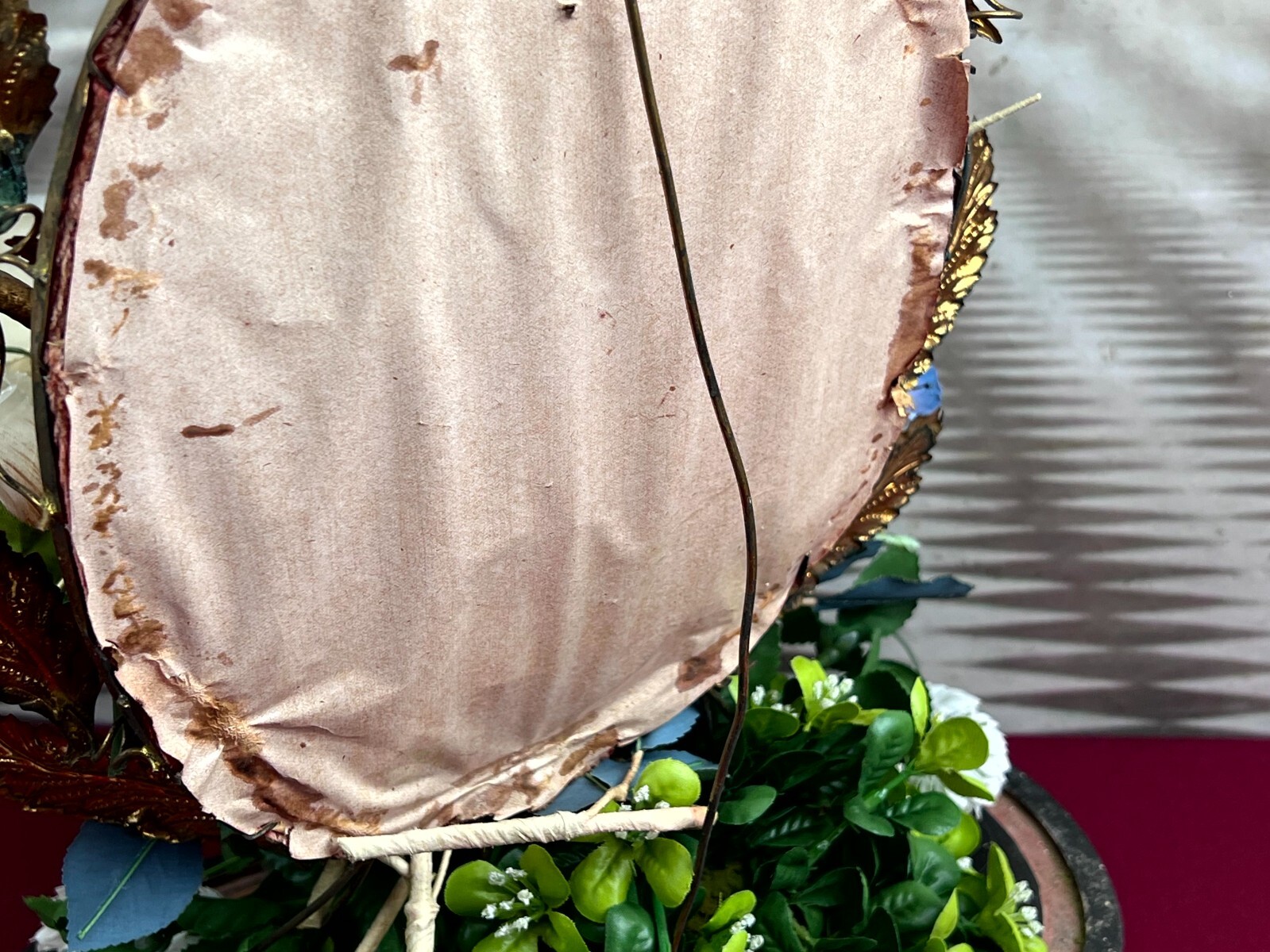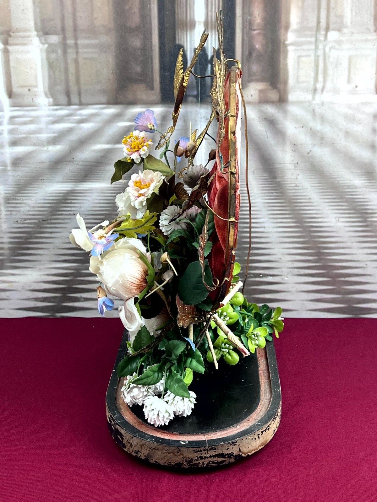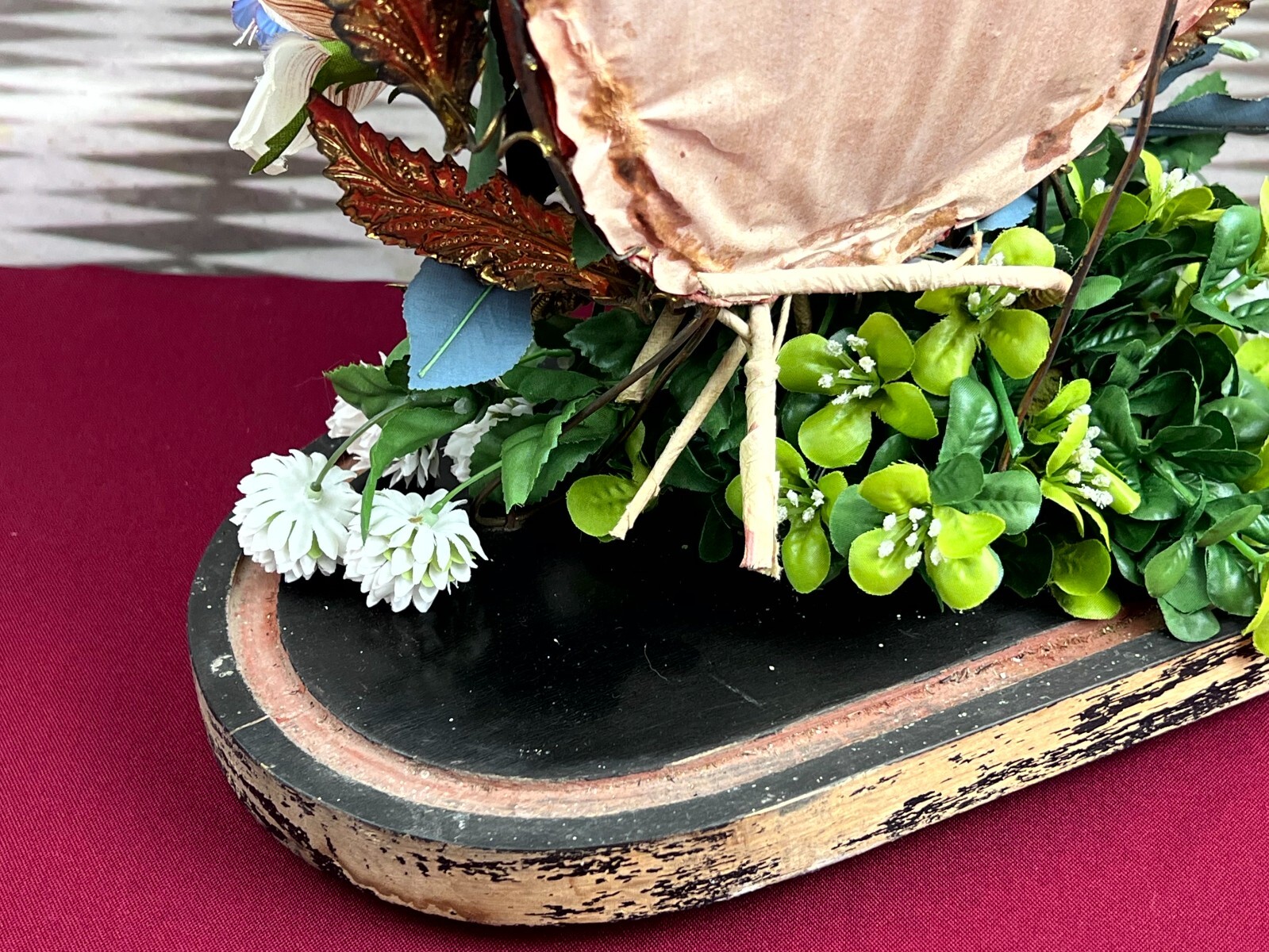 Antikes Gesteck, Kunstblumen gesteckt in einen Schwamm. Die goldenen Vögel sind aus Metall, hier diverse Oxidationsflecken. Das rote Samt ist ebenfalls brüchig, wie der Schwamm. Am Holzpodest berieben. Abmessungen BTH: 29x16x41cm. Die Blumen sind zum Teil ergänzt oder nicht aus der selben Zeit, einige Teile lose beiliegend. Sofern Metallteile vorhanden, können diese leicht verbogen sein.