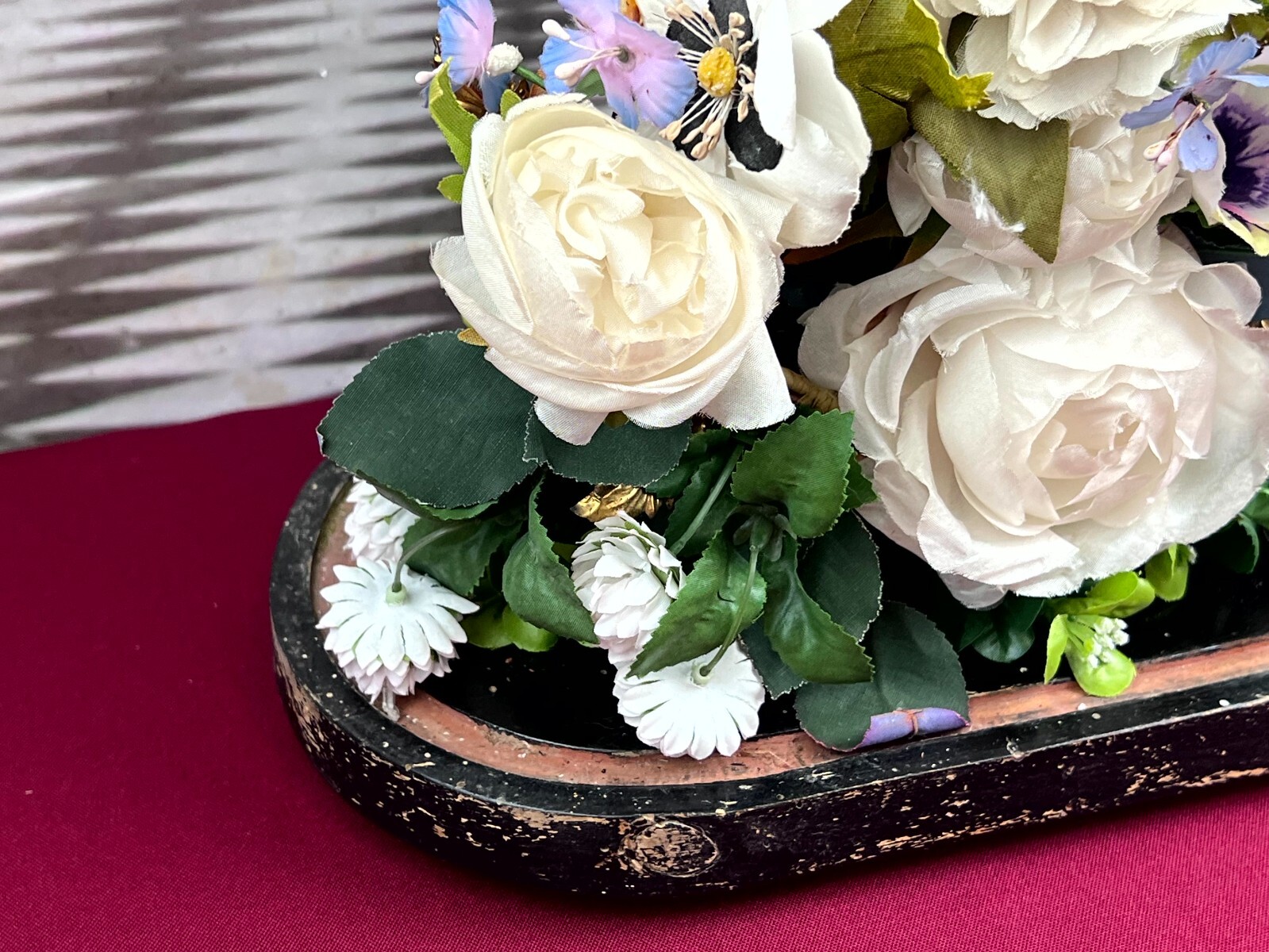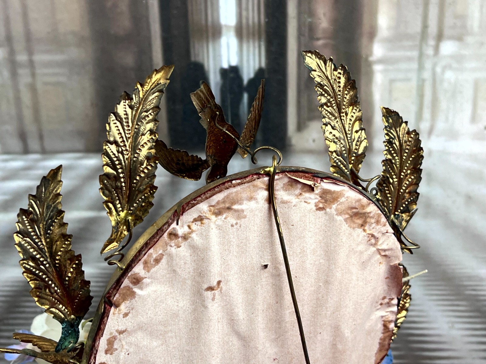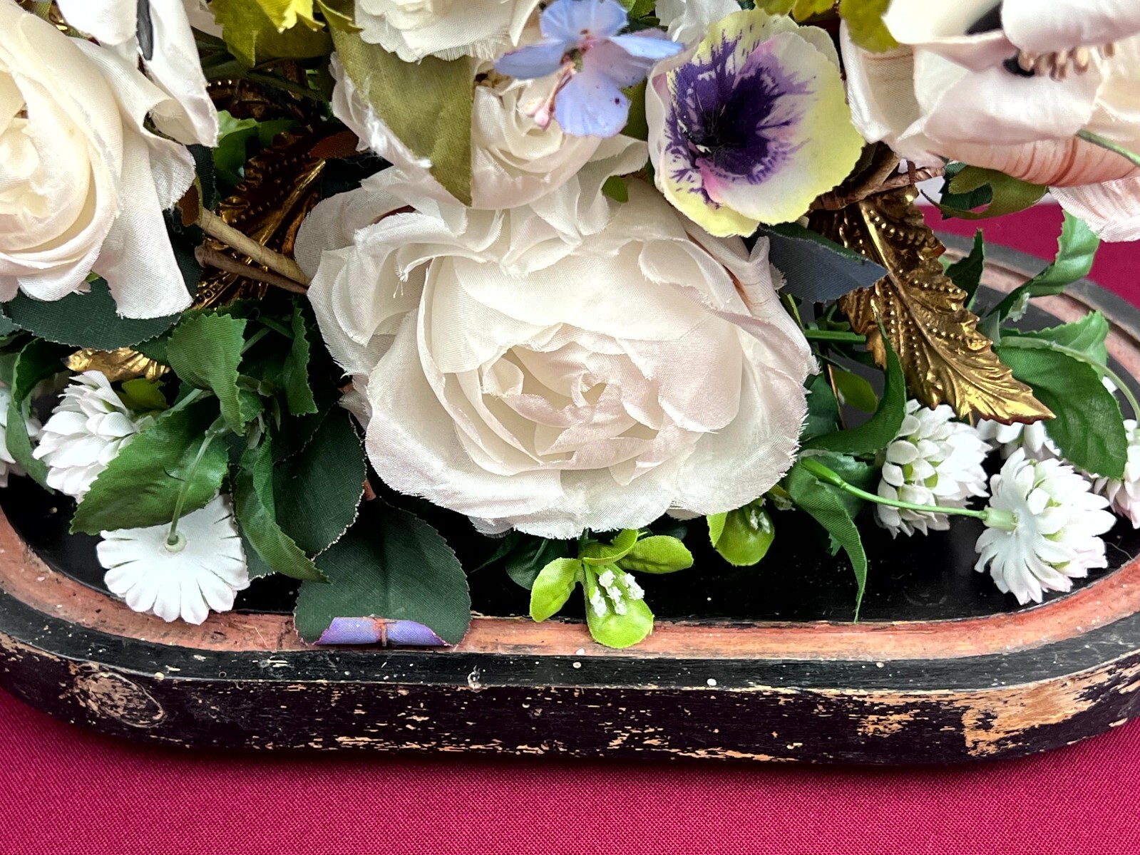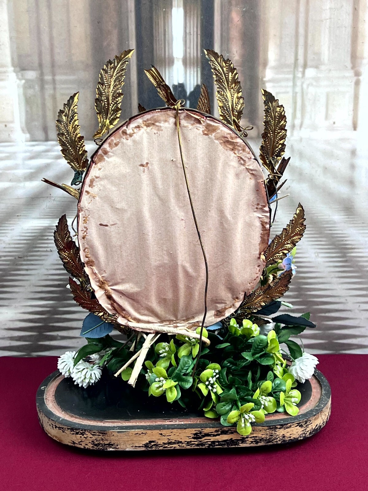 Antikes Gesteck, Kunstblumen gesteckt in einen Schwamm. Die goldenen Vögel sind aus Metall, hier diverse Oxidationsflecken. Das rote Samt ist ebenfalls brüchig, wie der Schwamm. Am Holzpodest berieben. Abmessungen BTH: 29x16x41cm. Die Blumen sind zum Teil ergänzt oder nicht aus der selben Zeit, einige Teile lose beiliegend. Sofern Metallteile vorhanden, können diese leicht verbogen sein.
