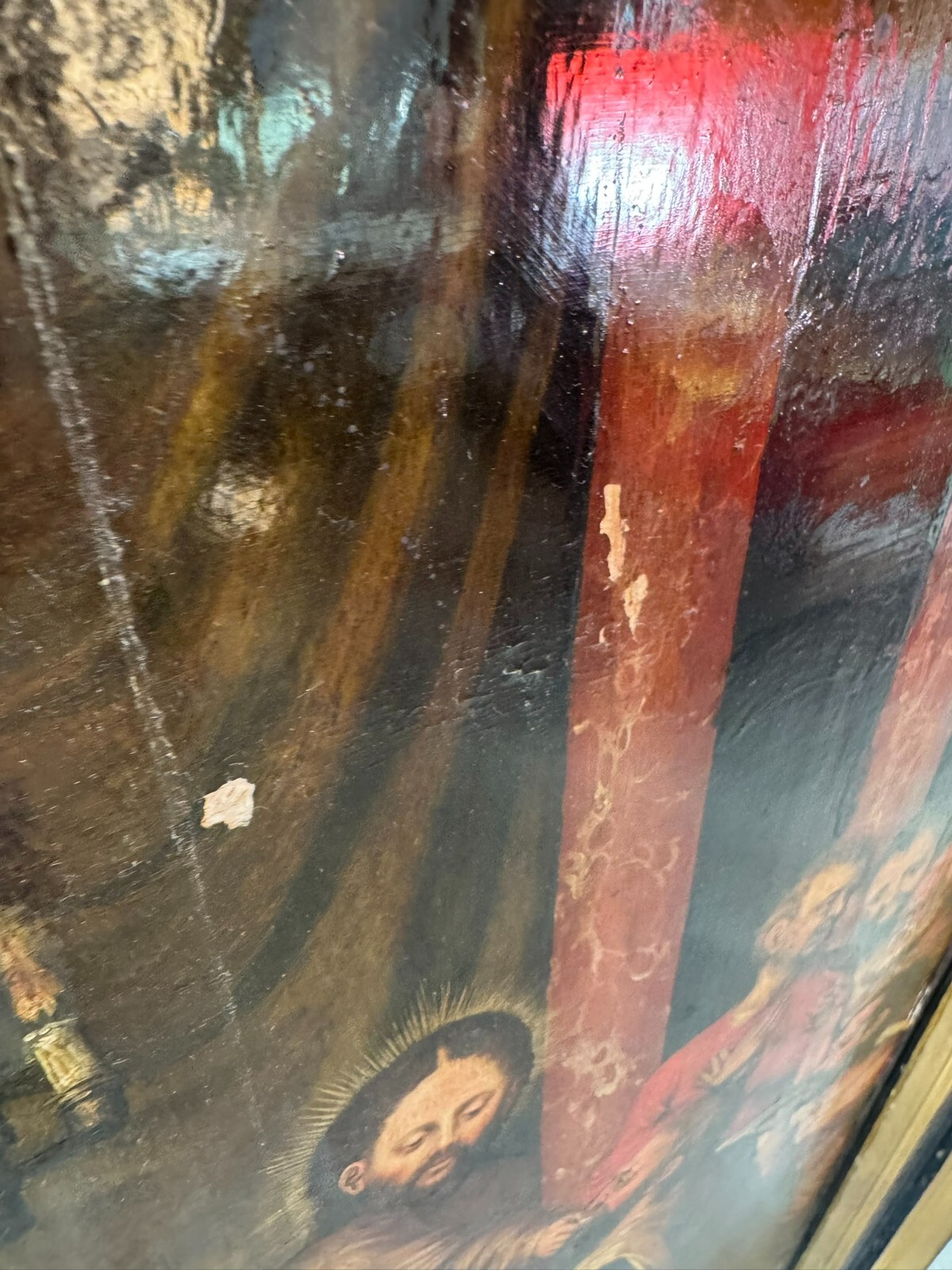 Gotische Altartafel Öl auf Holz, aus dem 16-ten Jhdt., unsigniert. Der Rahmen ist um 1700 angefertigt worden und hat eine umlaufende niederländische Innschrift. Das Gemälde und der Rahmen sind altrestauriert, teils befestigte Dehnungsrisse in der Platte, kleinere Übermalungen und aktuell kleinere Farbabplatzer (siehe Fotos). Rahmen zum Teil berieben und übermalt. Gesamtabmessungen 104x73cm.
