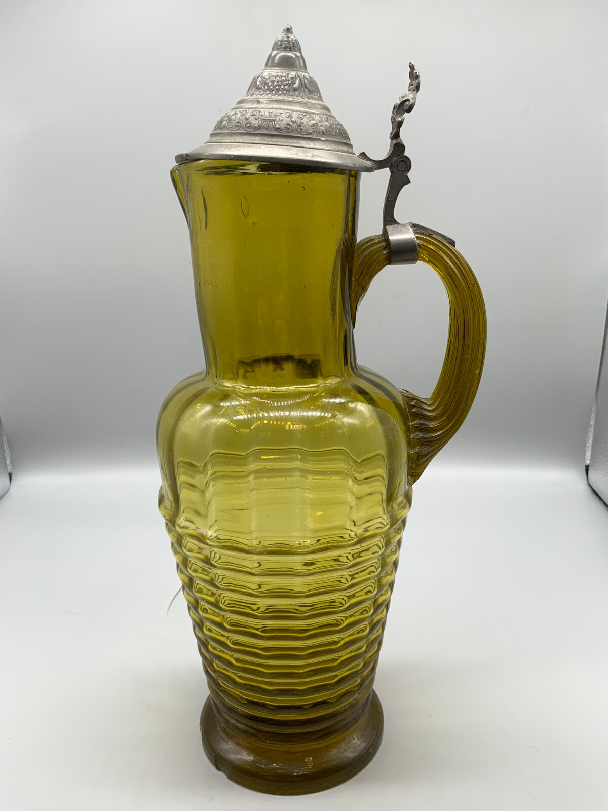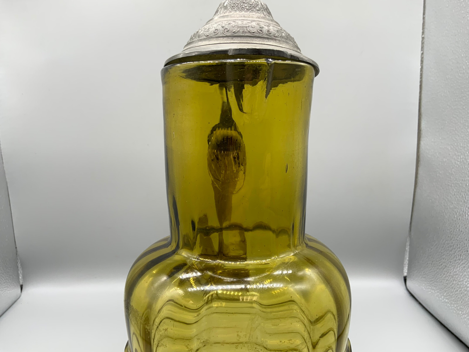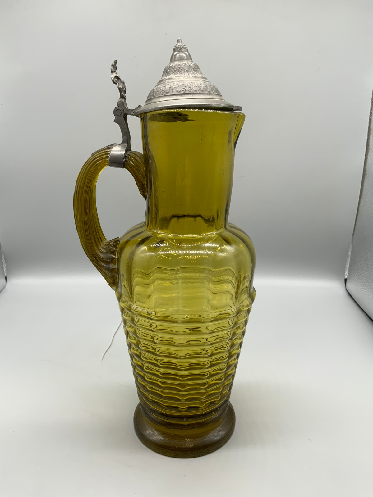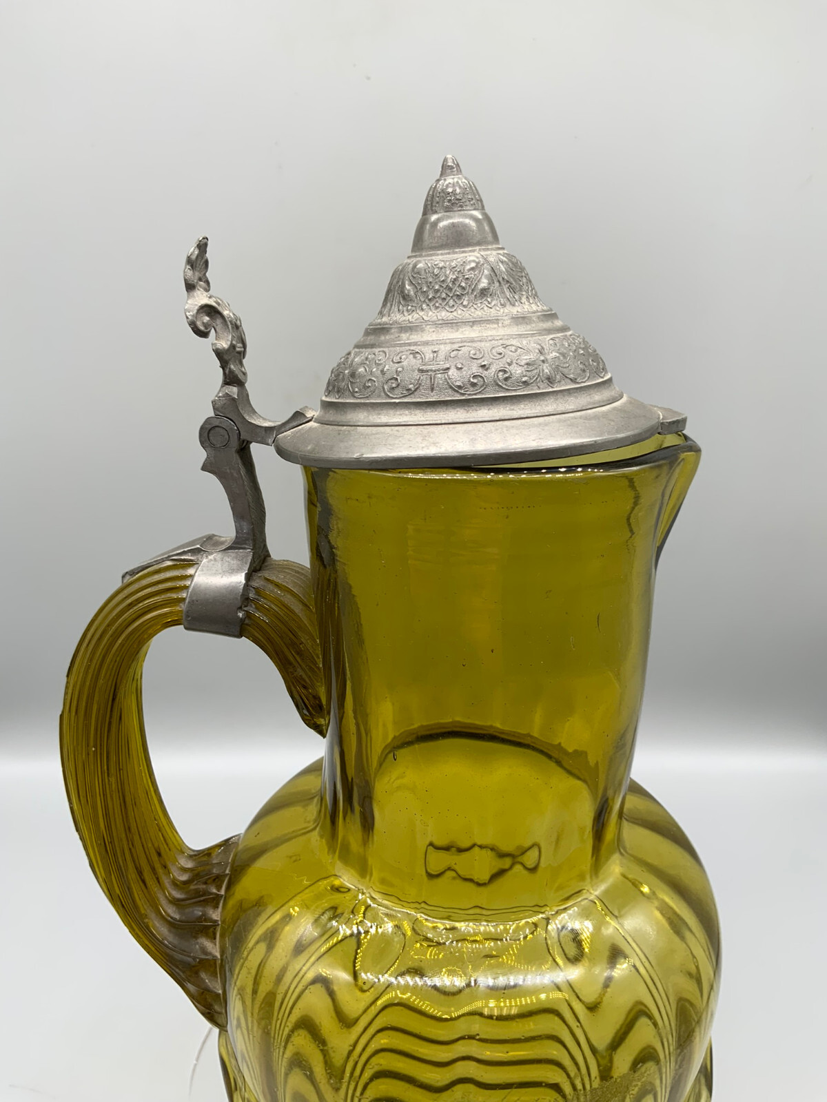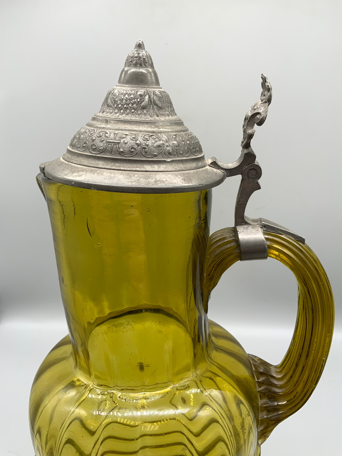 Große antike Kanne aus mundgeblasenem Glas mit Zinndeckel. Am Bodenring Chips an der Seitenwand Abrieb. Höhe/Durchmesser 36/13cm.