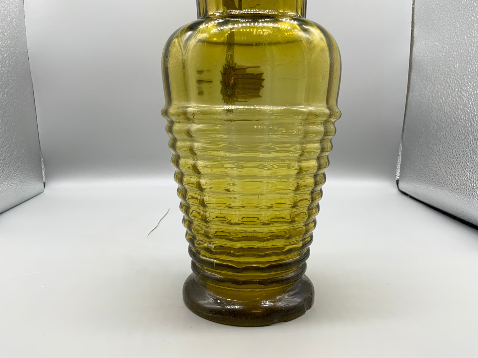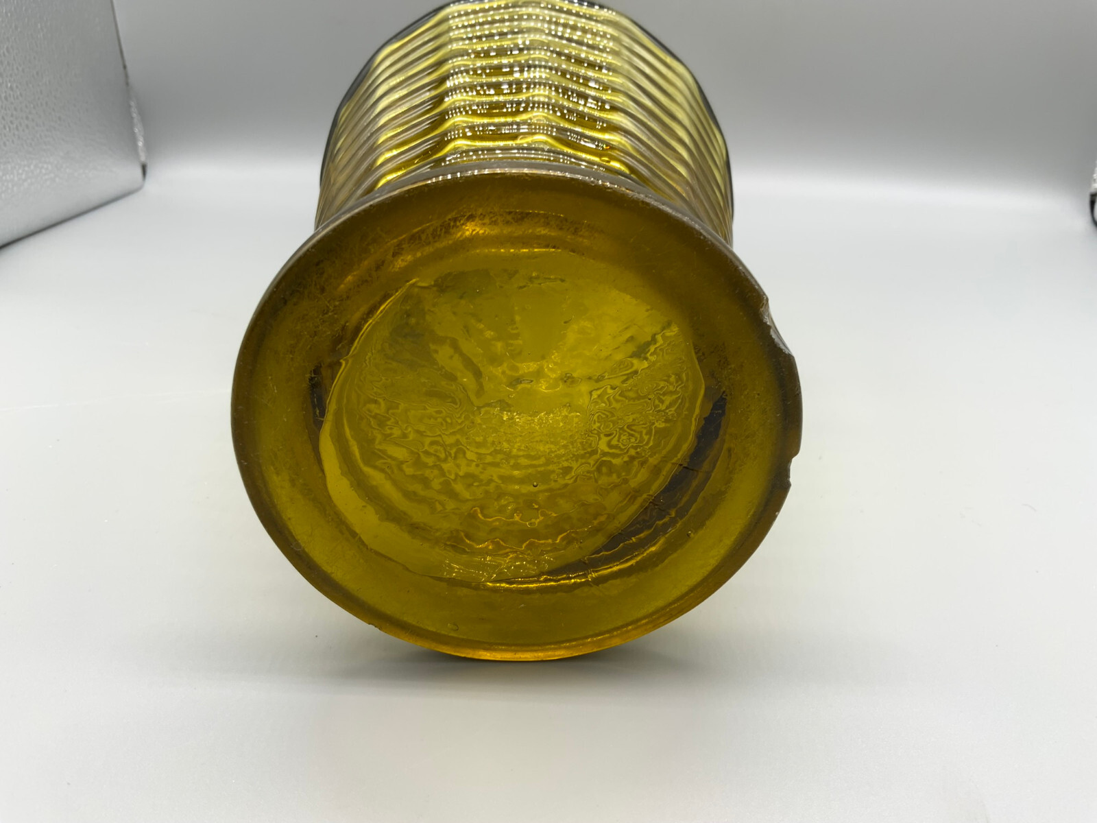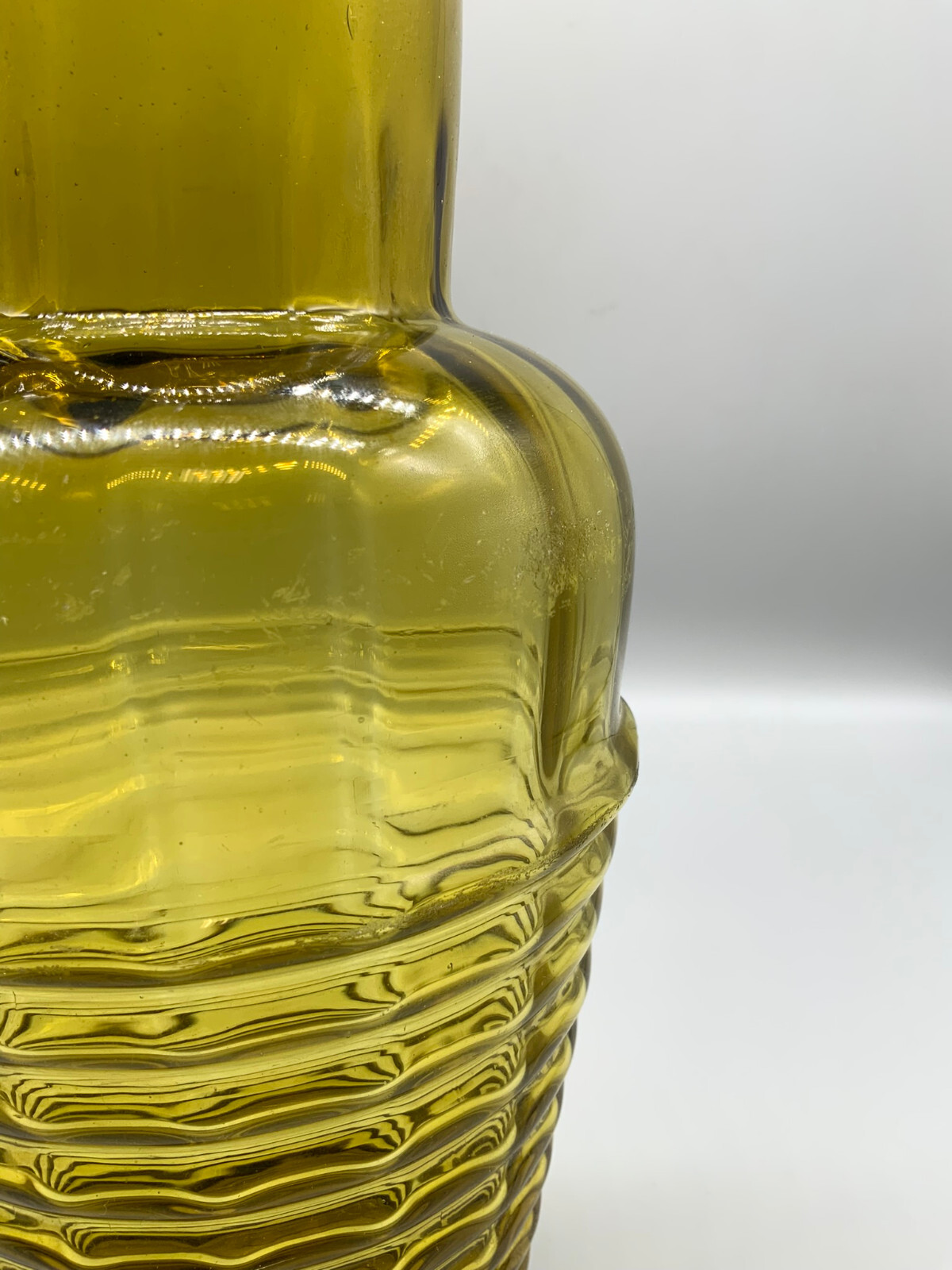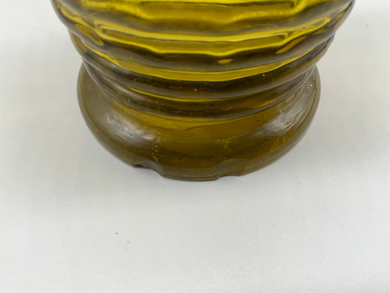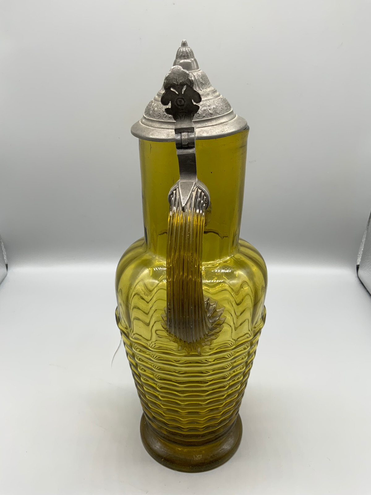 Große antike Kanne aus mundgeblasenem Glas mit Zinndeckel. Am Bodenring Chips an der Seitenwand Abrieb. Höhe/Durchmesser 36/13cm.