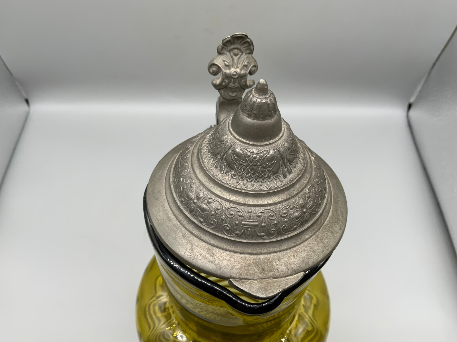 GROSSE ANTIKE KANNE AUS GLASS MIT ZINN DECKEL 36cm HOCH