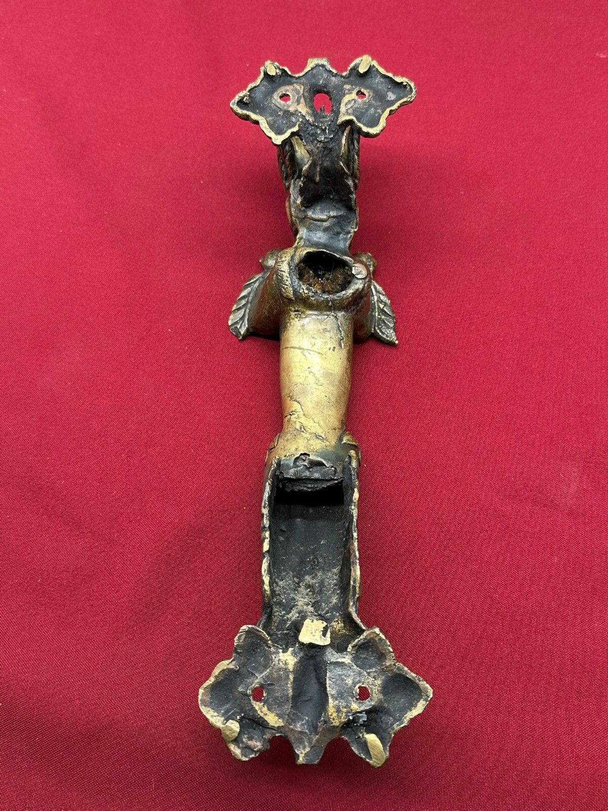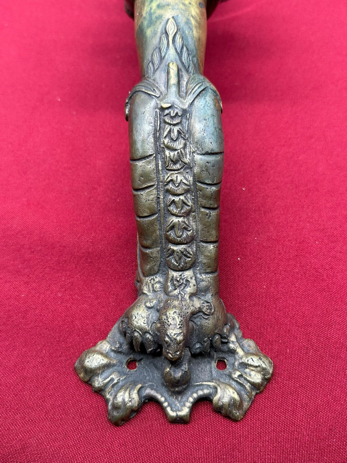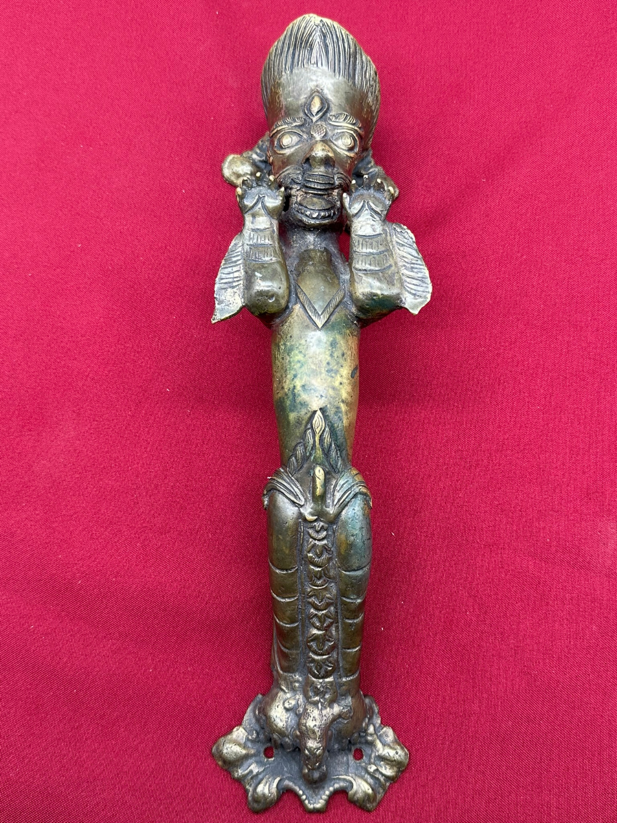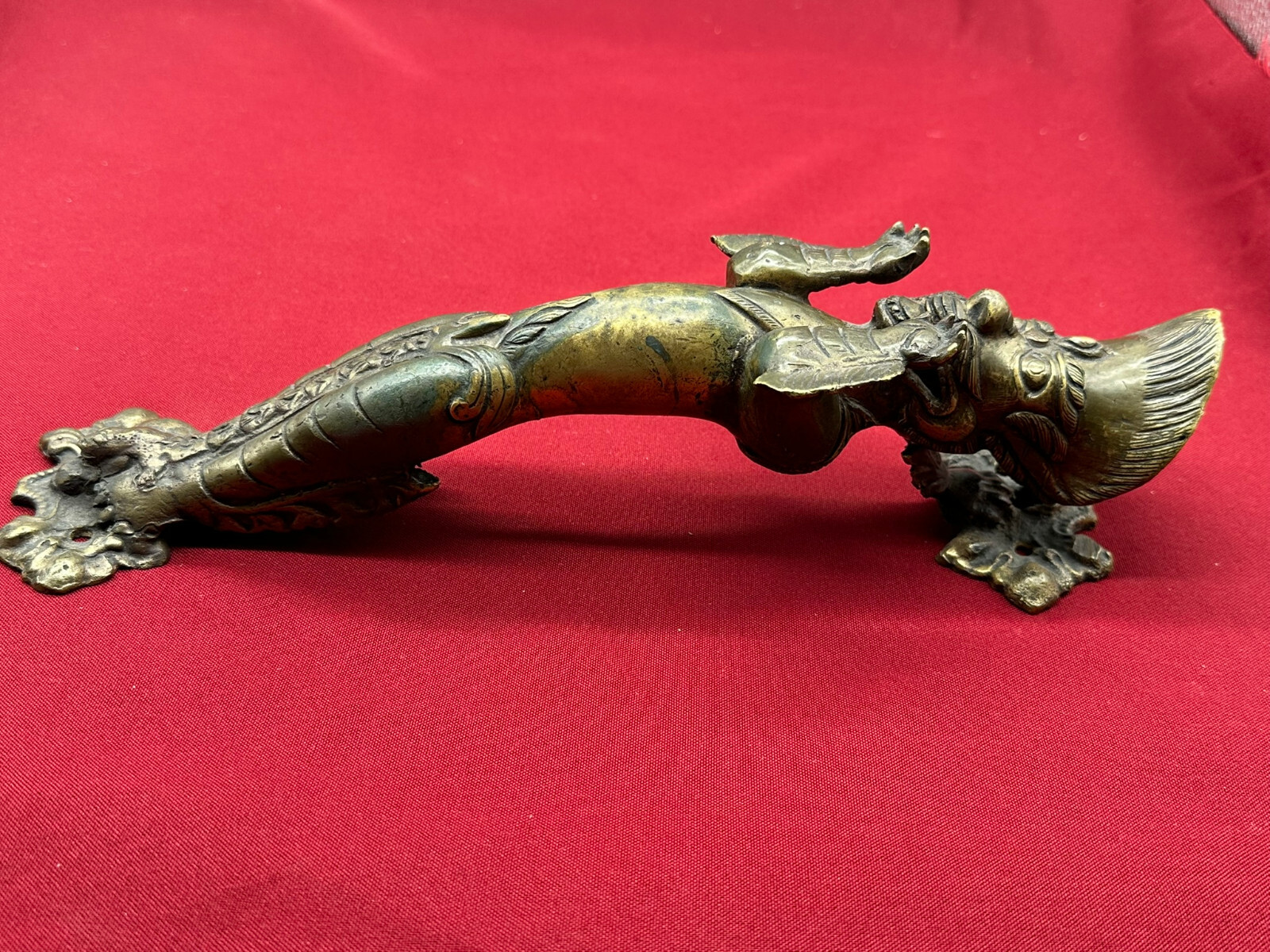 Sehr schöner großer Türgriff aus massivem Gelbguss, China, 20-tes Jhd. Oberfläche zum Teil oxydiert, der Guss ist teils grob ausgeführt. Abmessungen BTH gesamt 8/8/31cm, Abstand zwischen den Schrauben 3,7cm und senkrecht 25,5cm.