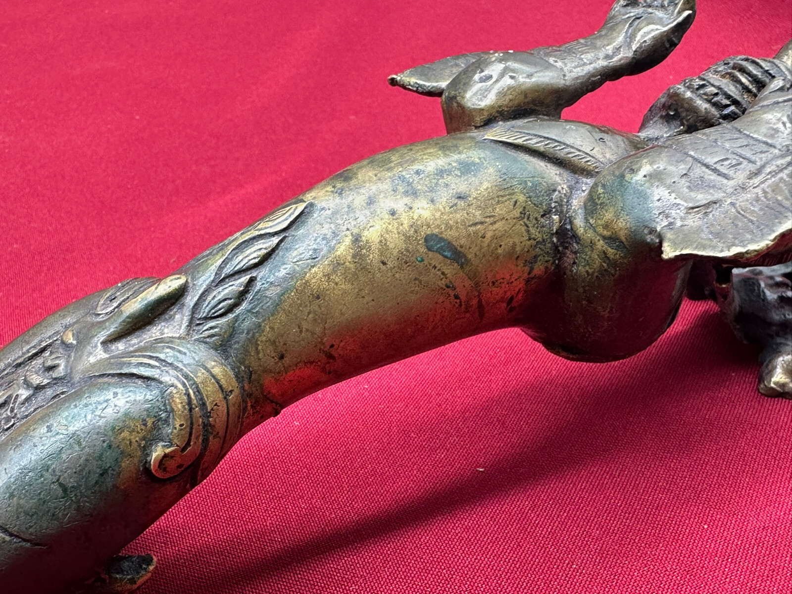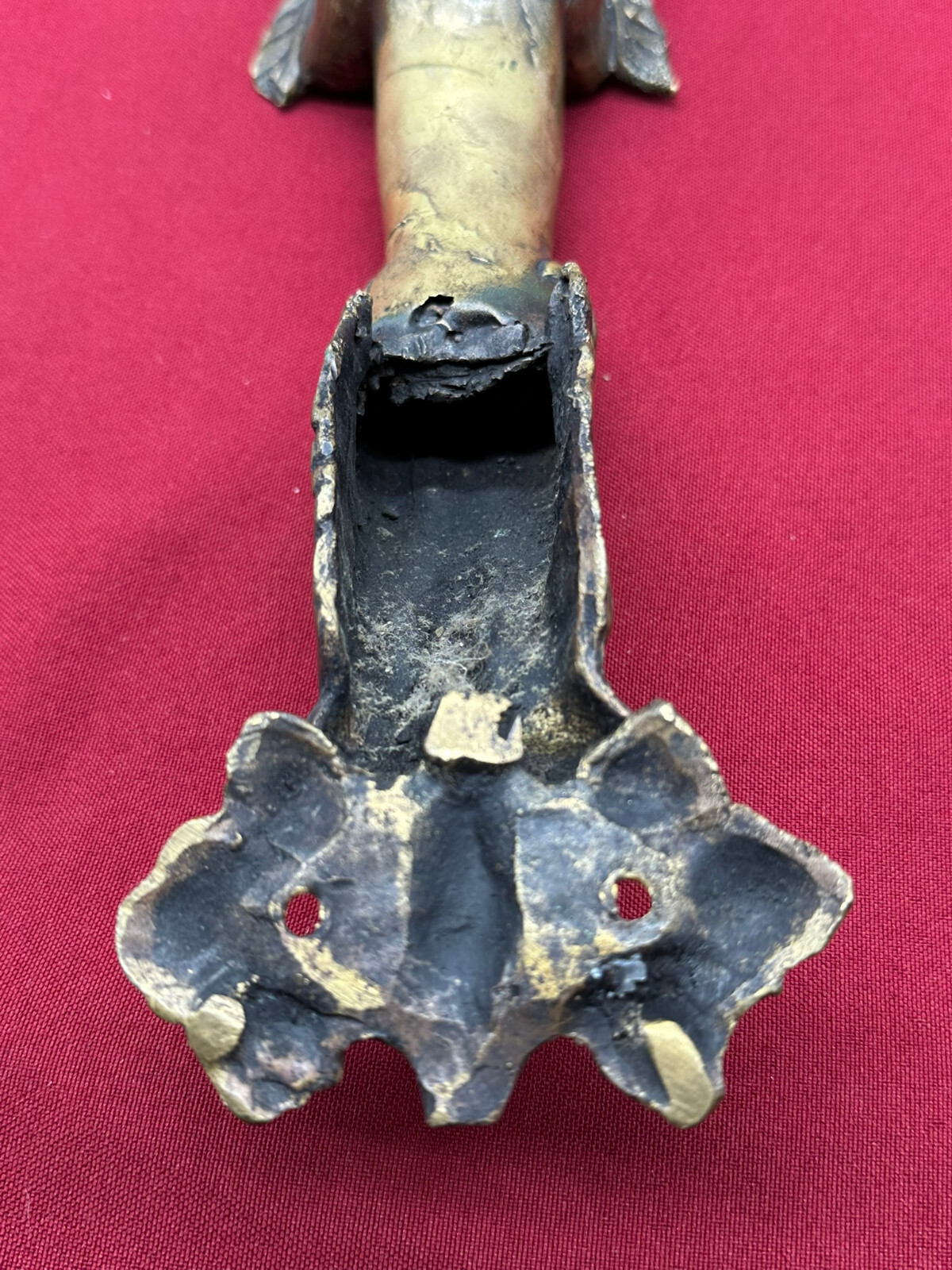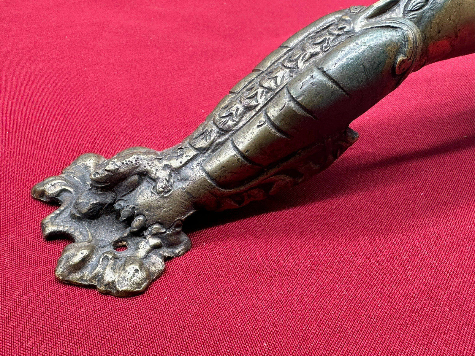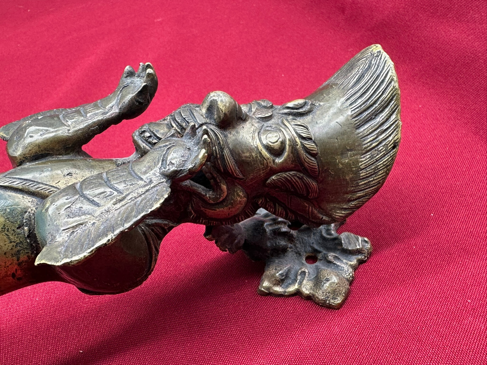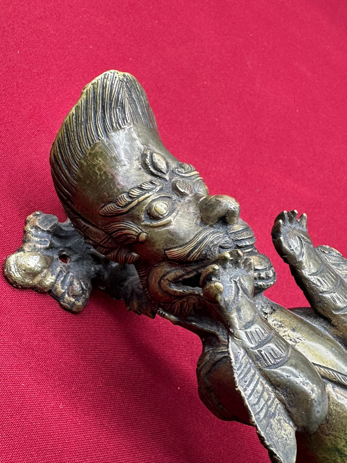 Sehr schöner großer Türgriff aus massivem Gelbguss, China, 20-tes Jhd. Oberfläche zum Teil oxydiert, der Guss ist teils grob ausgeführt. Abmessungen BTH gesamt 8/8/31cm, Abstand zwischen den Schrauben 3,7cm und senkrecht 25,5cm.