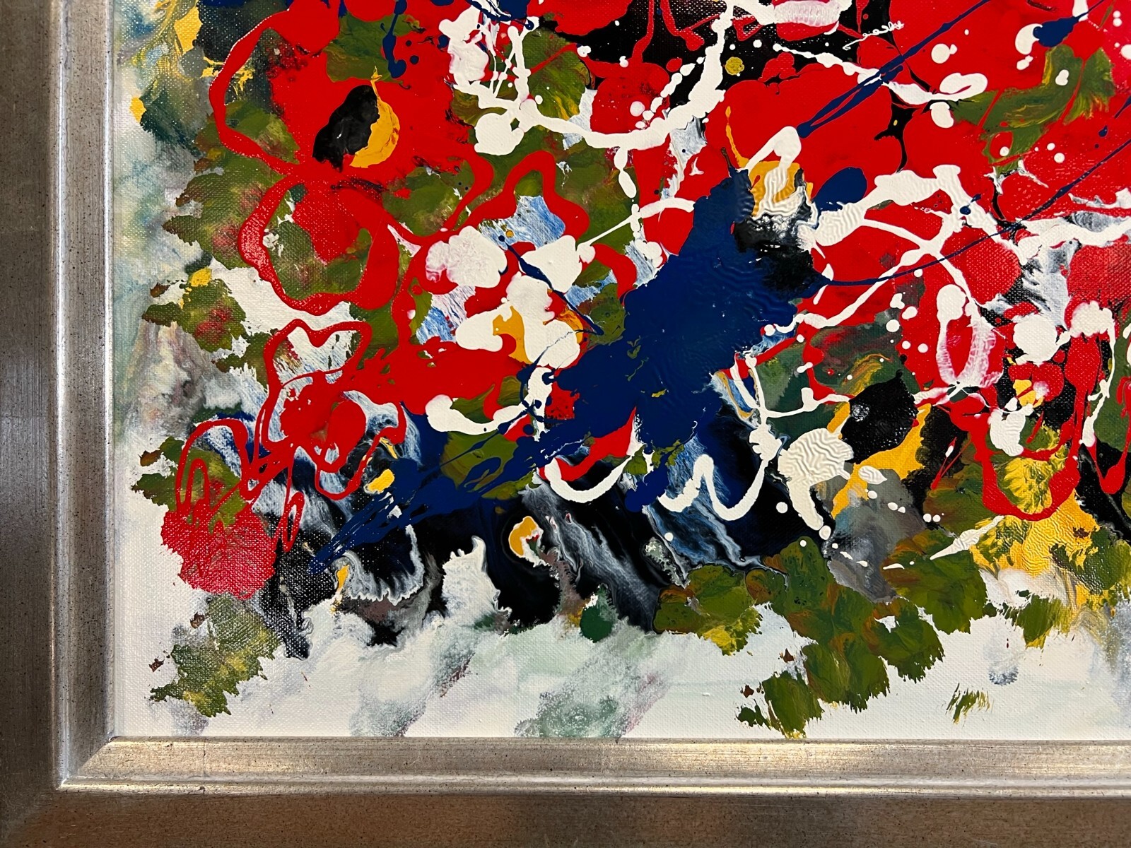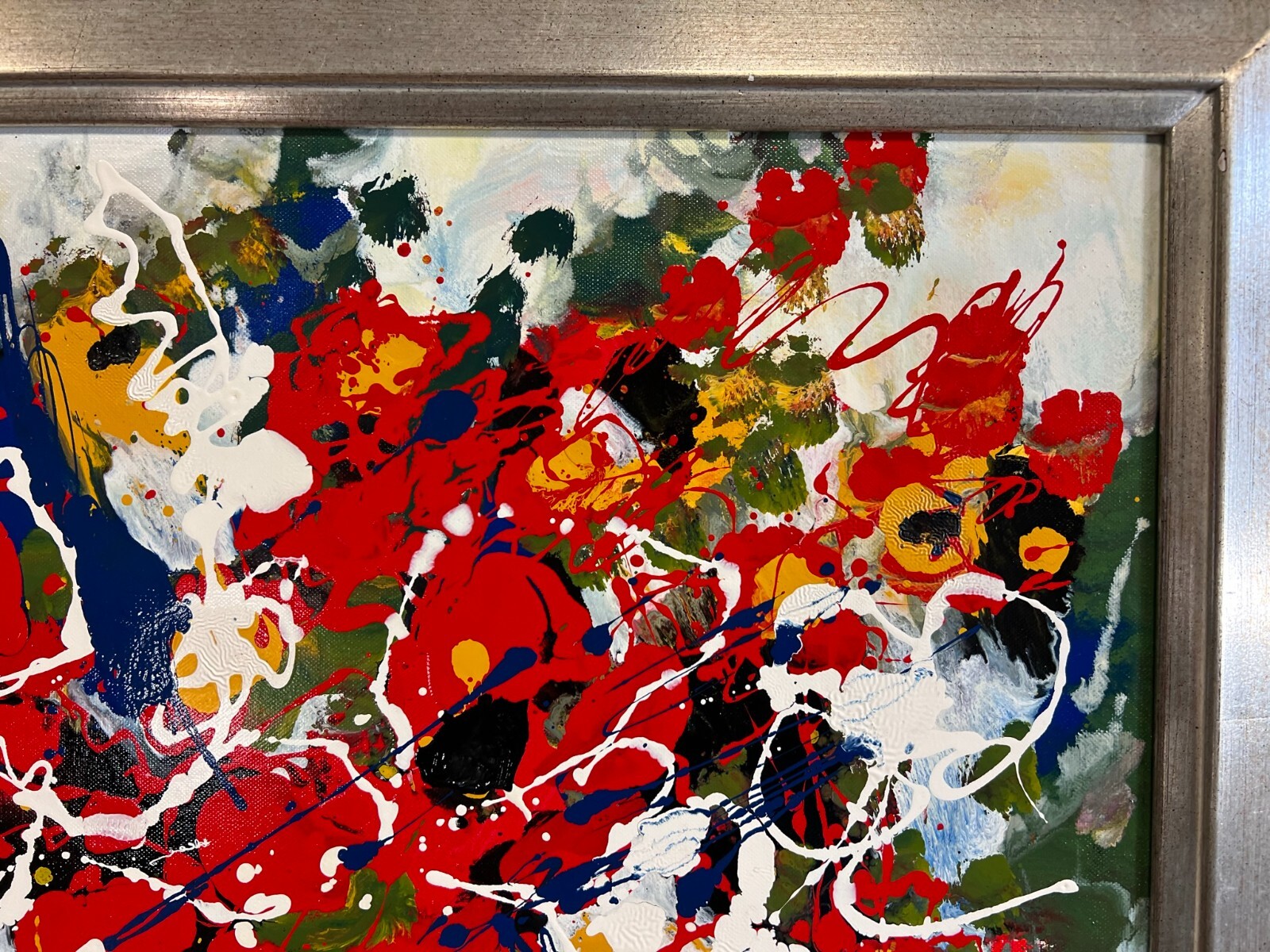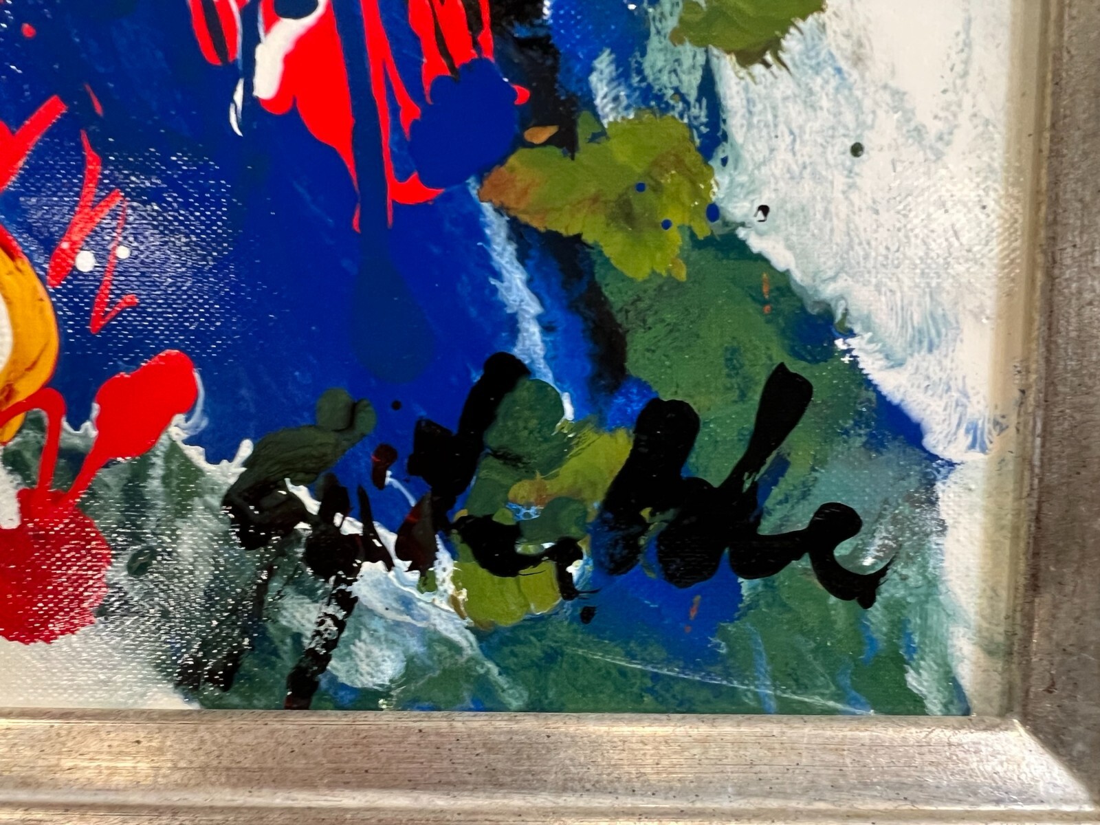 Sehr schönes abstraktes Acrylgemälde auf Leinwand, unten rechts signiert. Sehr guter Zustand, am Rahmen kleinste Abplatzer. Abmessungen 60x50cm, mit Rahmen 69x59cm.