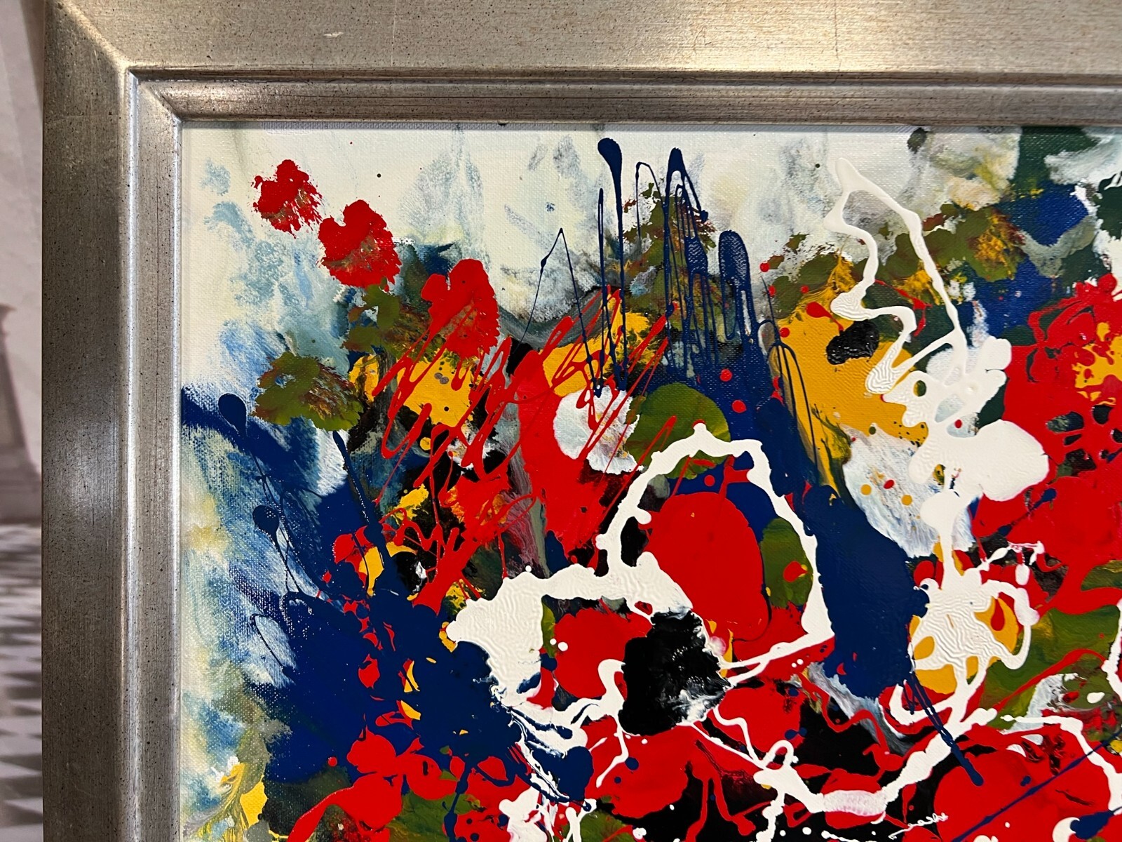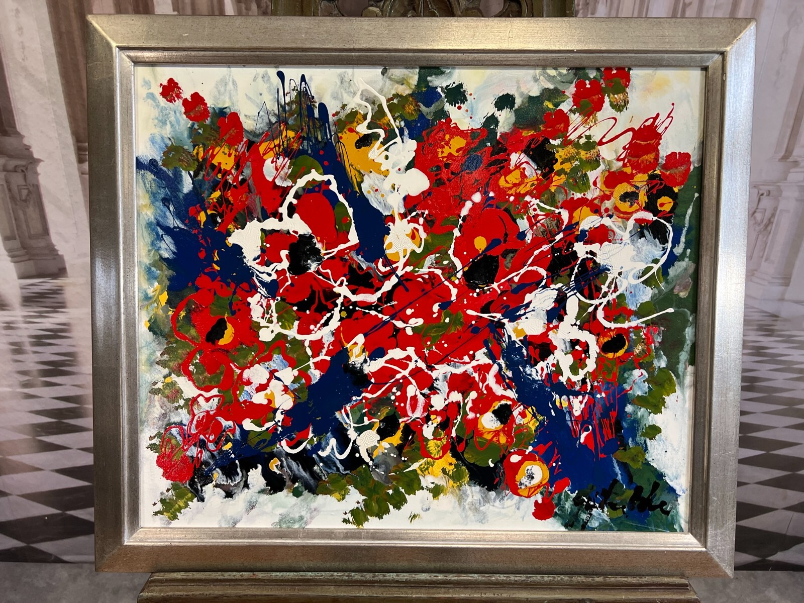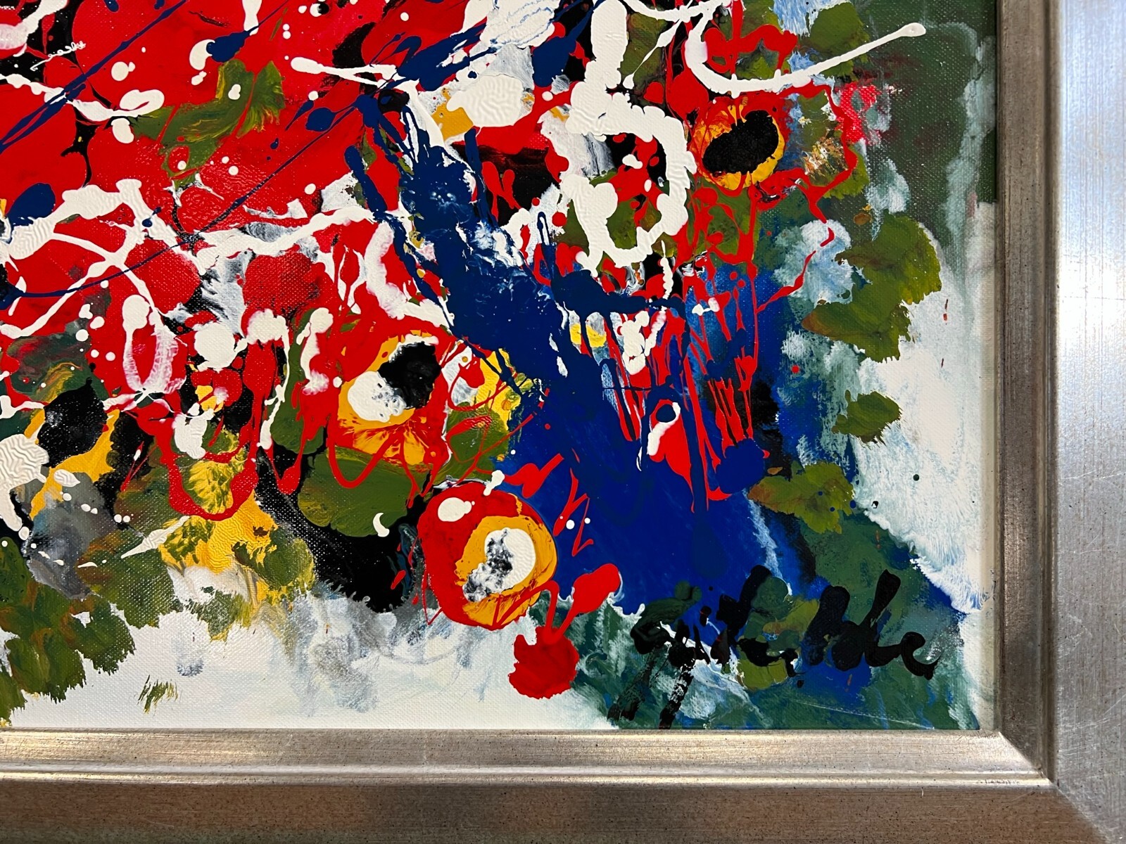 Sehr schönes abstraktes Acrylgemälde auf Leinwand, unten rechts signiert. Sehr guter Zustand, am Rahmen kleinste Abplatzer. Abmessungen 60x50cm, mit Rahmen 69x59cm.
