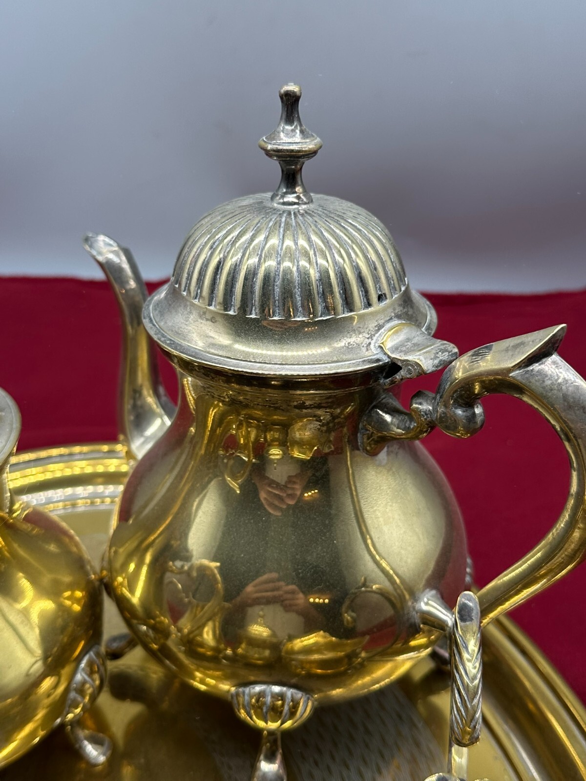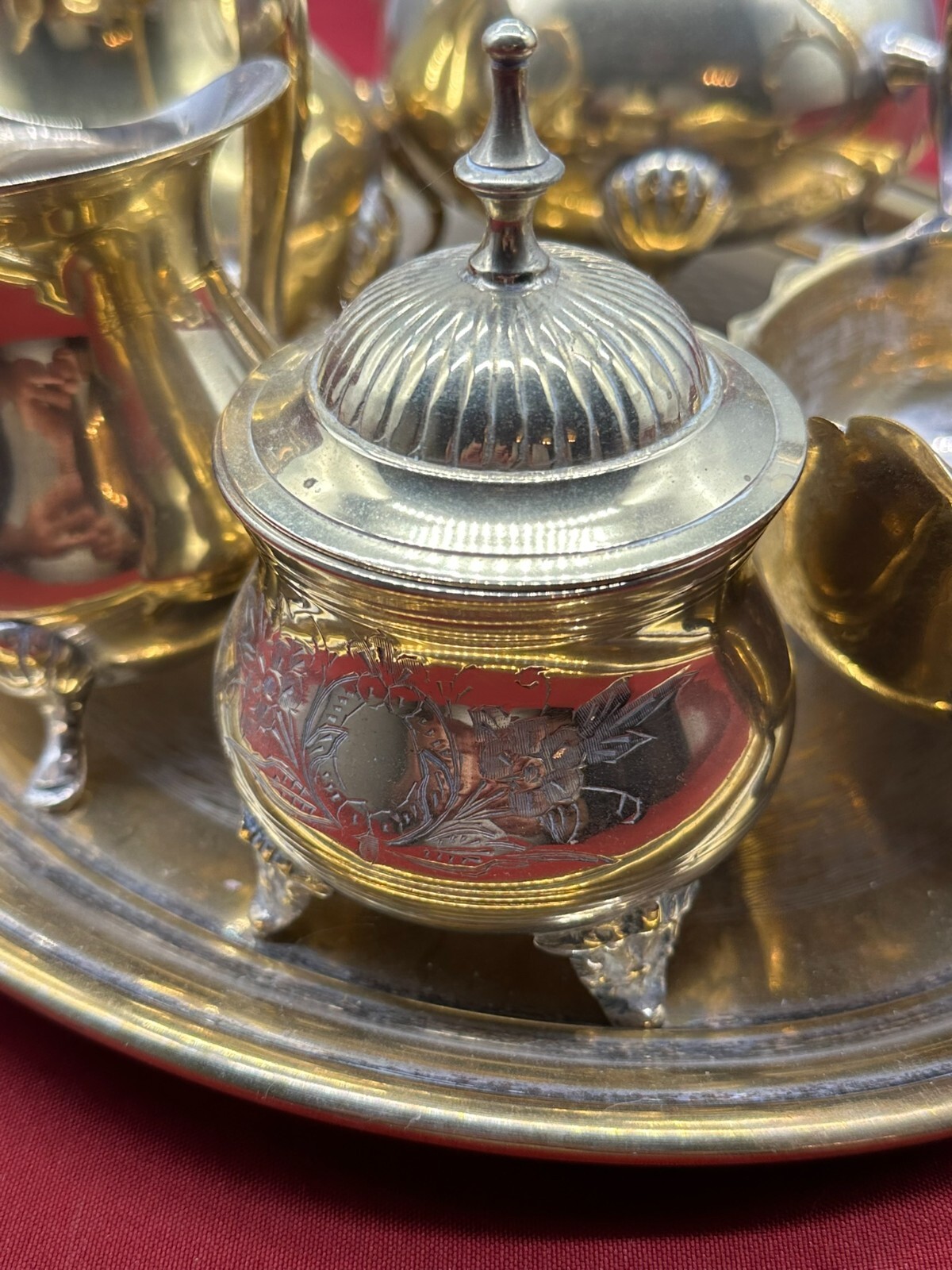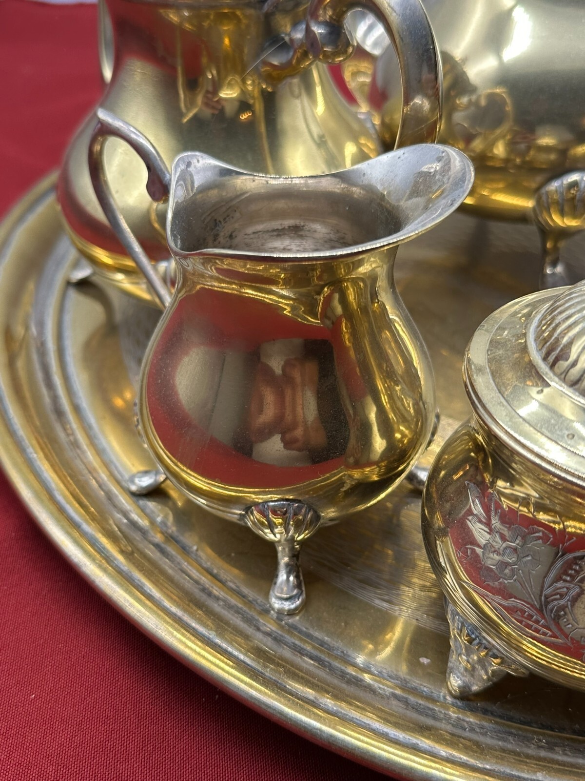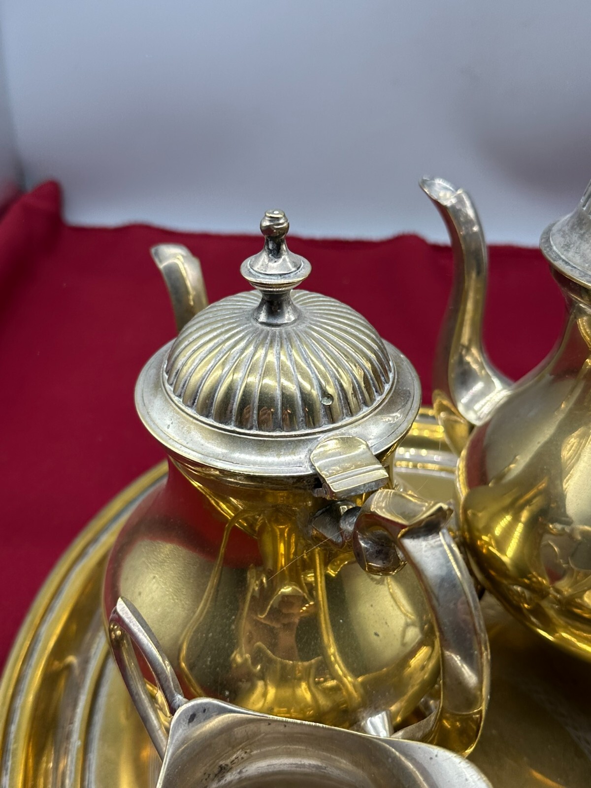 Grosses Kaffeeset aus Metall, versilbert und vergoldet. Die Beschichtung insgesamt berieben. Oberfläche mit Kratzern und kleineren Dellen. Tablett 42x33cm, Höhe/Durchmesser große Kanne 22/13cm, kleine Kanne 18/11cm, Milchkännchen 10,5/8cm, Zuckerdose 12/9xm, Sahnegießer BTH 20/10/10cm.