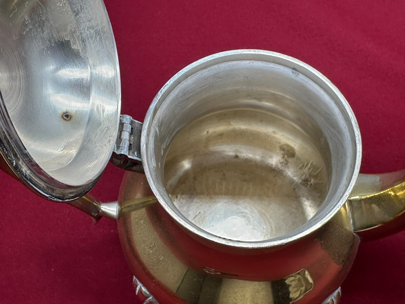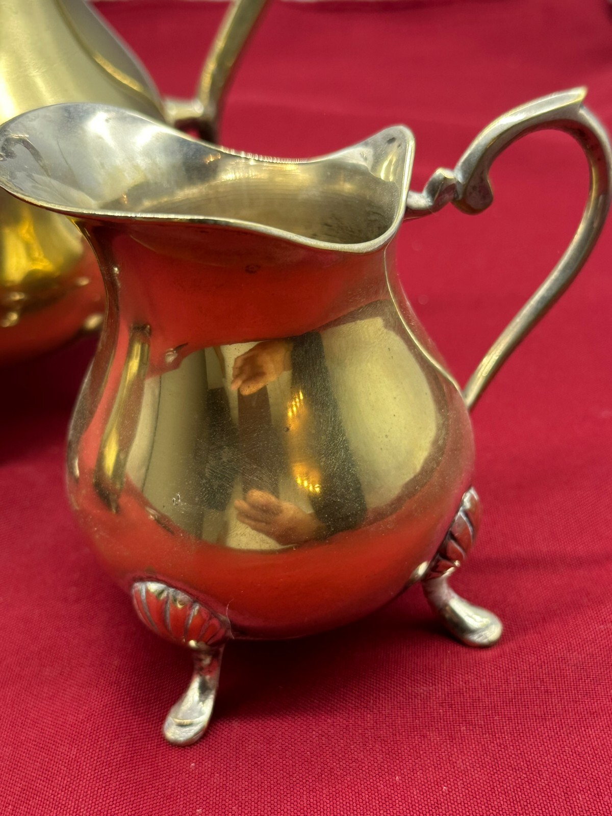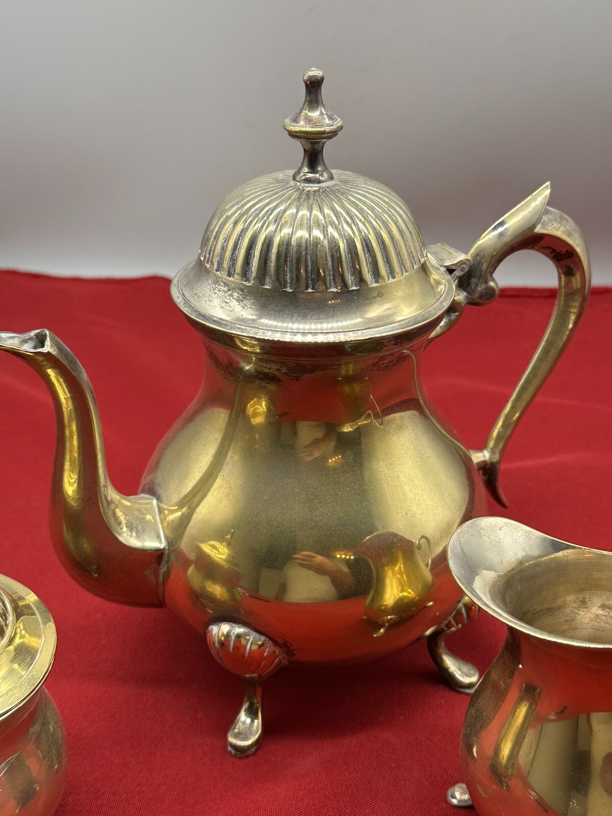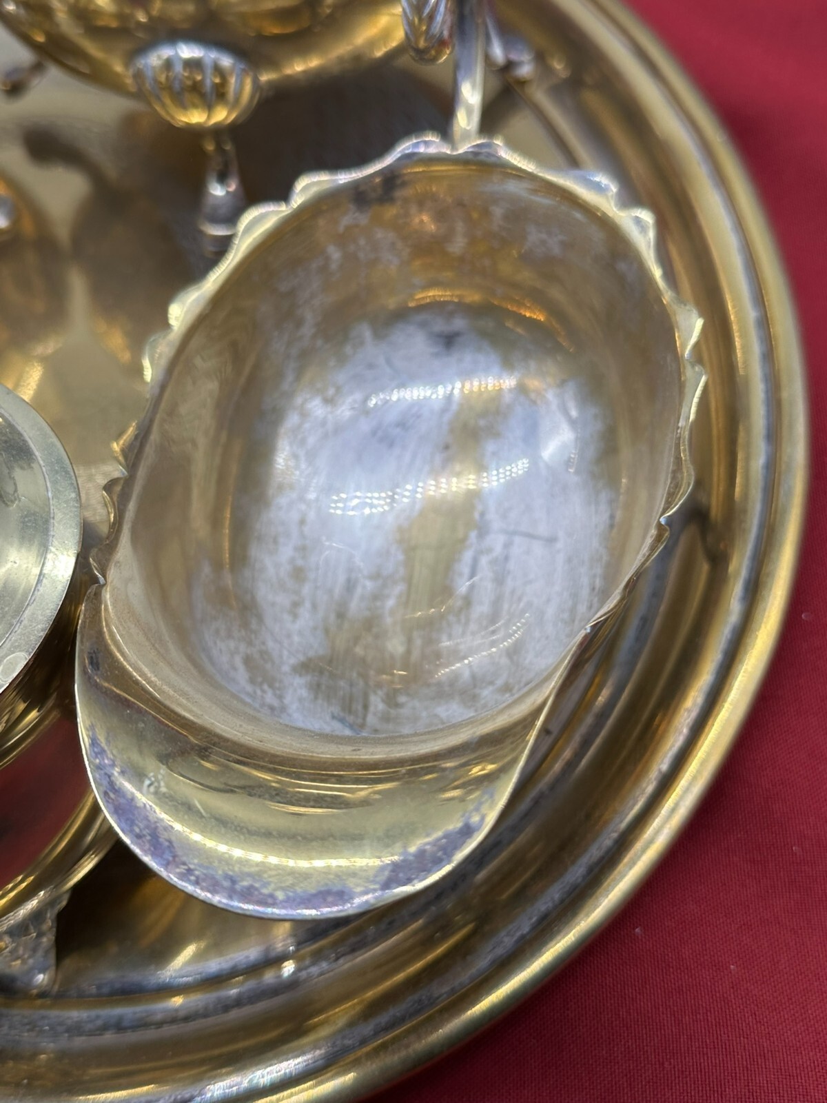 Grosses Kaffeeset aus Metall, versilbert und vergoldet. Die Beschichtung insgesamt berieben. Oberfläche mit Kratzern und kleineren Dellen. Tablett 42x33cm, Höhe/Durchmesser große Kanne 22/13cm, kleine Kanne 18/11cm, Milchkännchen 10,5/8cm, Zuckerdose 12/9xm, Sahnegießer BTH 20/10/10cm.