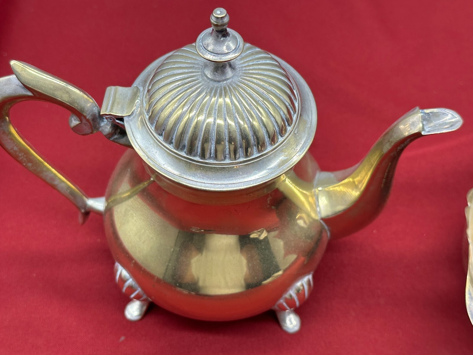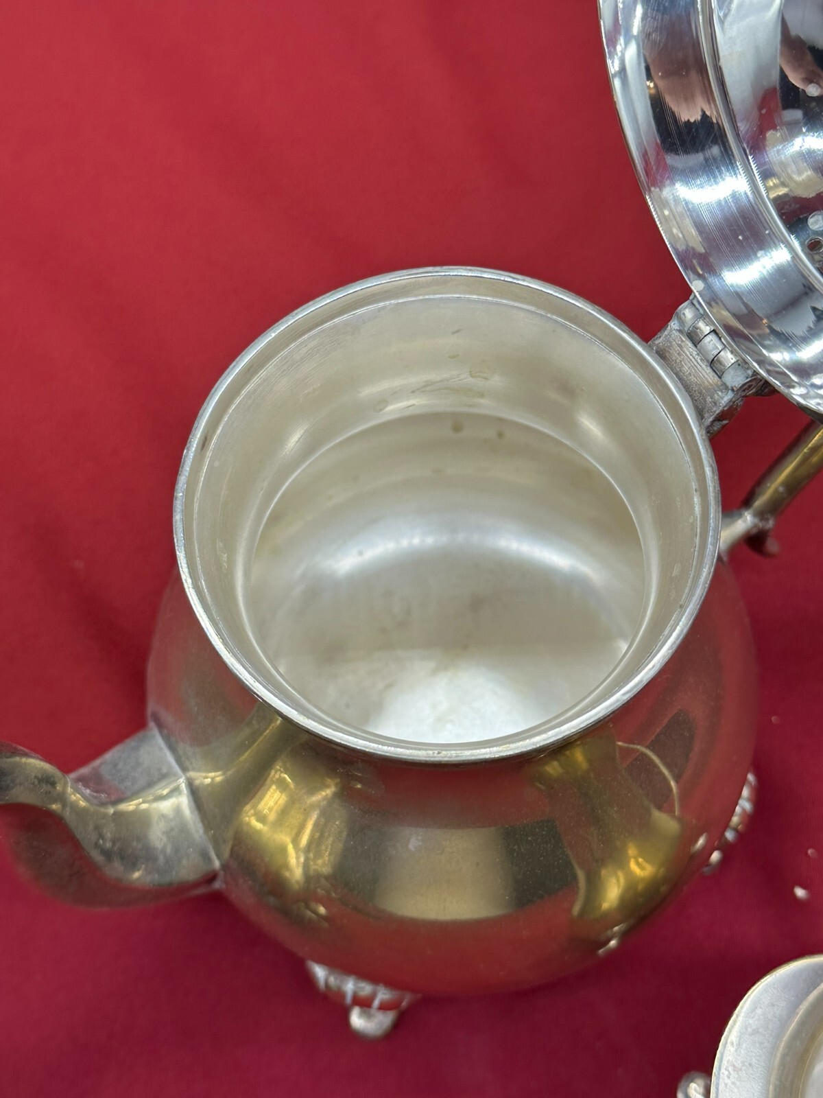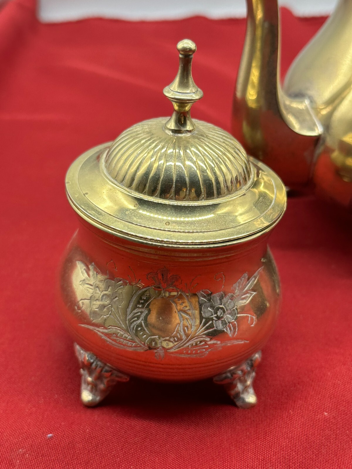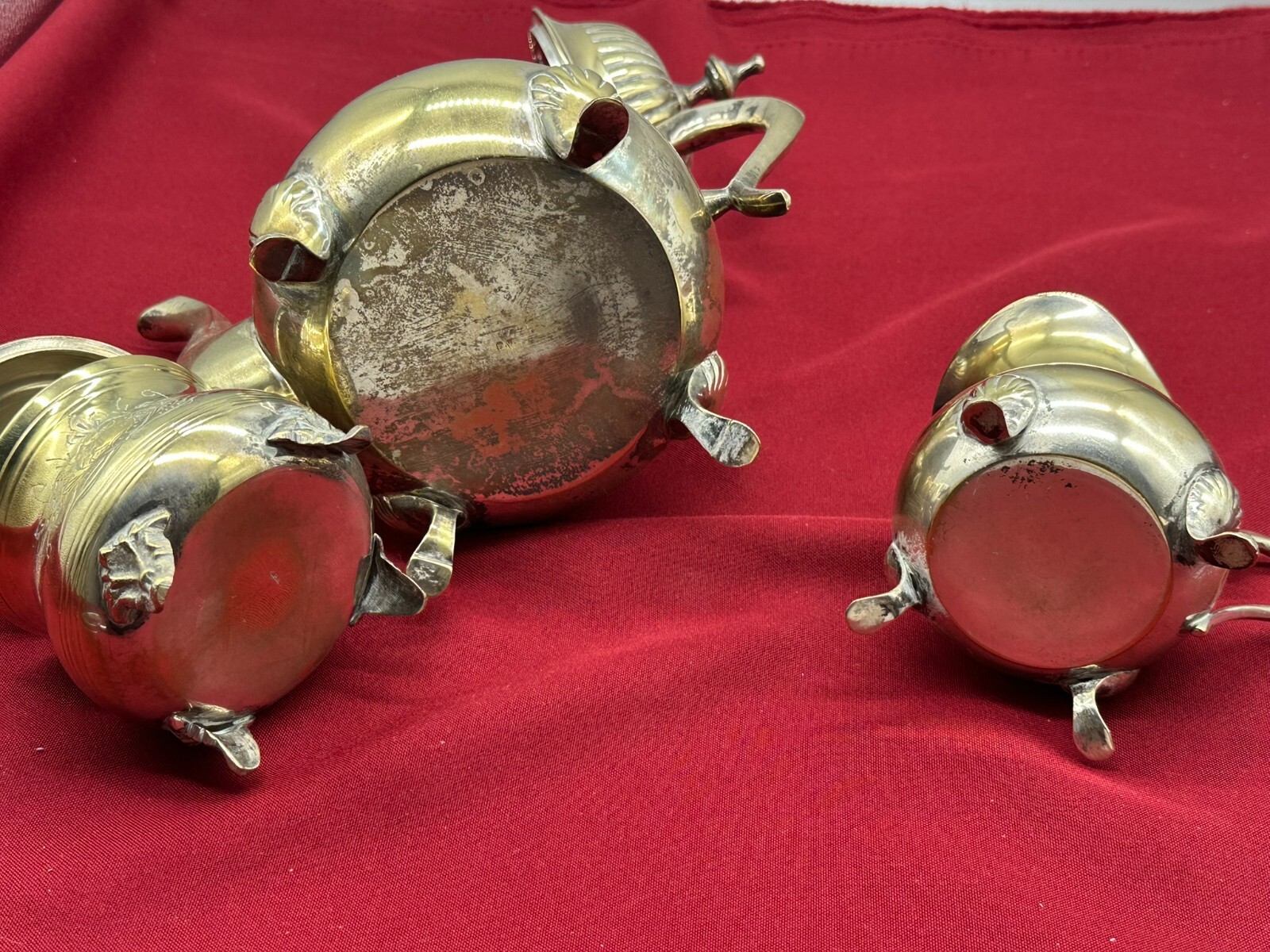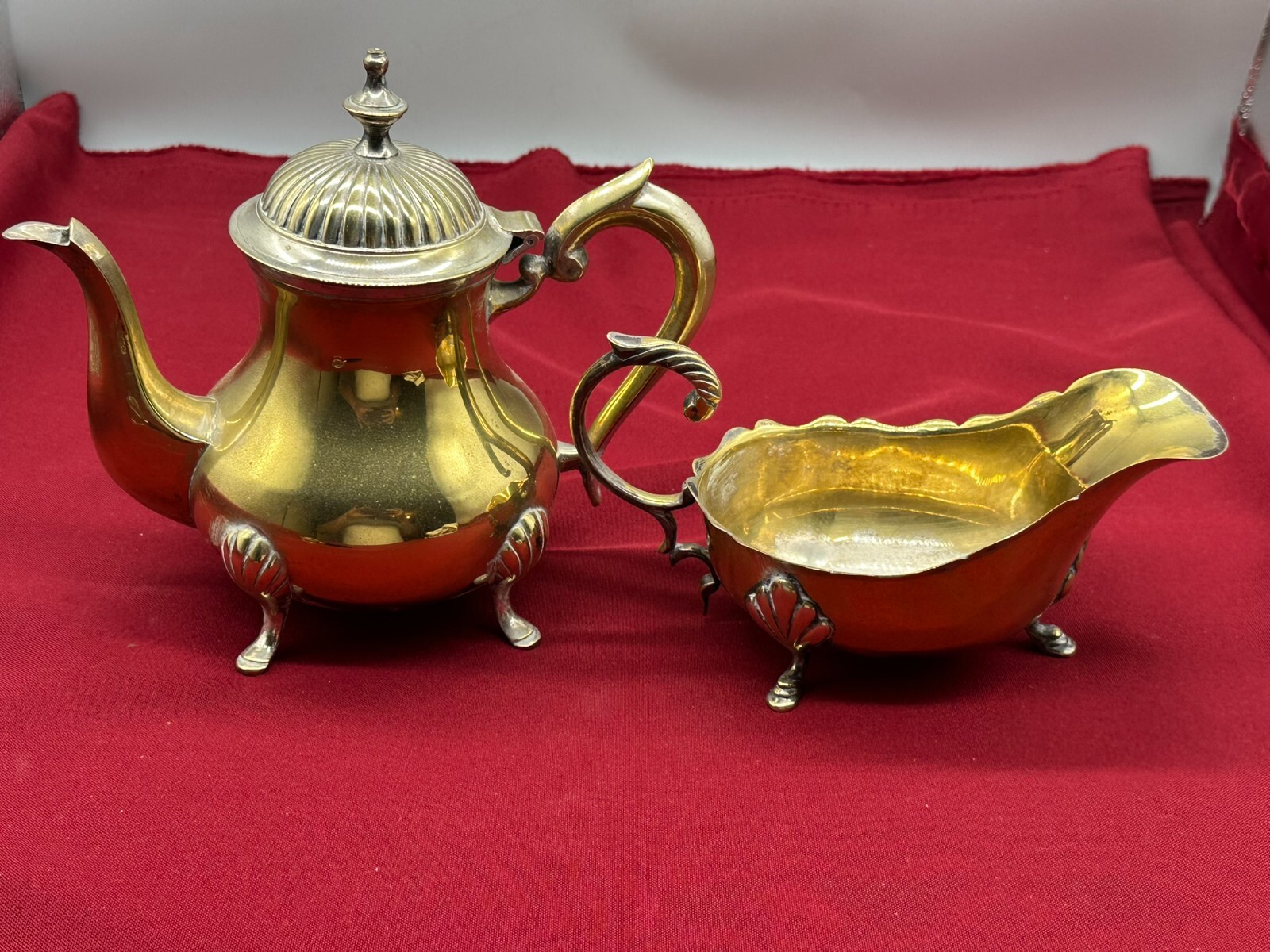 Grosses Kaffeeset aus Metall, versilbert und vergoldet. Die Beschichtung insgesamt berieben. Oberfläche mit Kratzern und kleineren Dellen. Tablett 42x33cm, Höhe/Durchmesser große Kanne 22/13cm, kleine Kanne 18/11cm, Milchkännchen 10,5/8cm, Zuckerdose 12/9xm, Sahnegießer BTH 20/10/10cm.