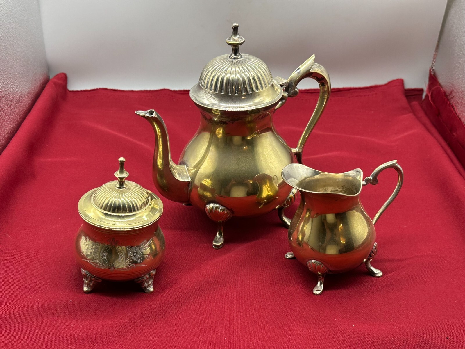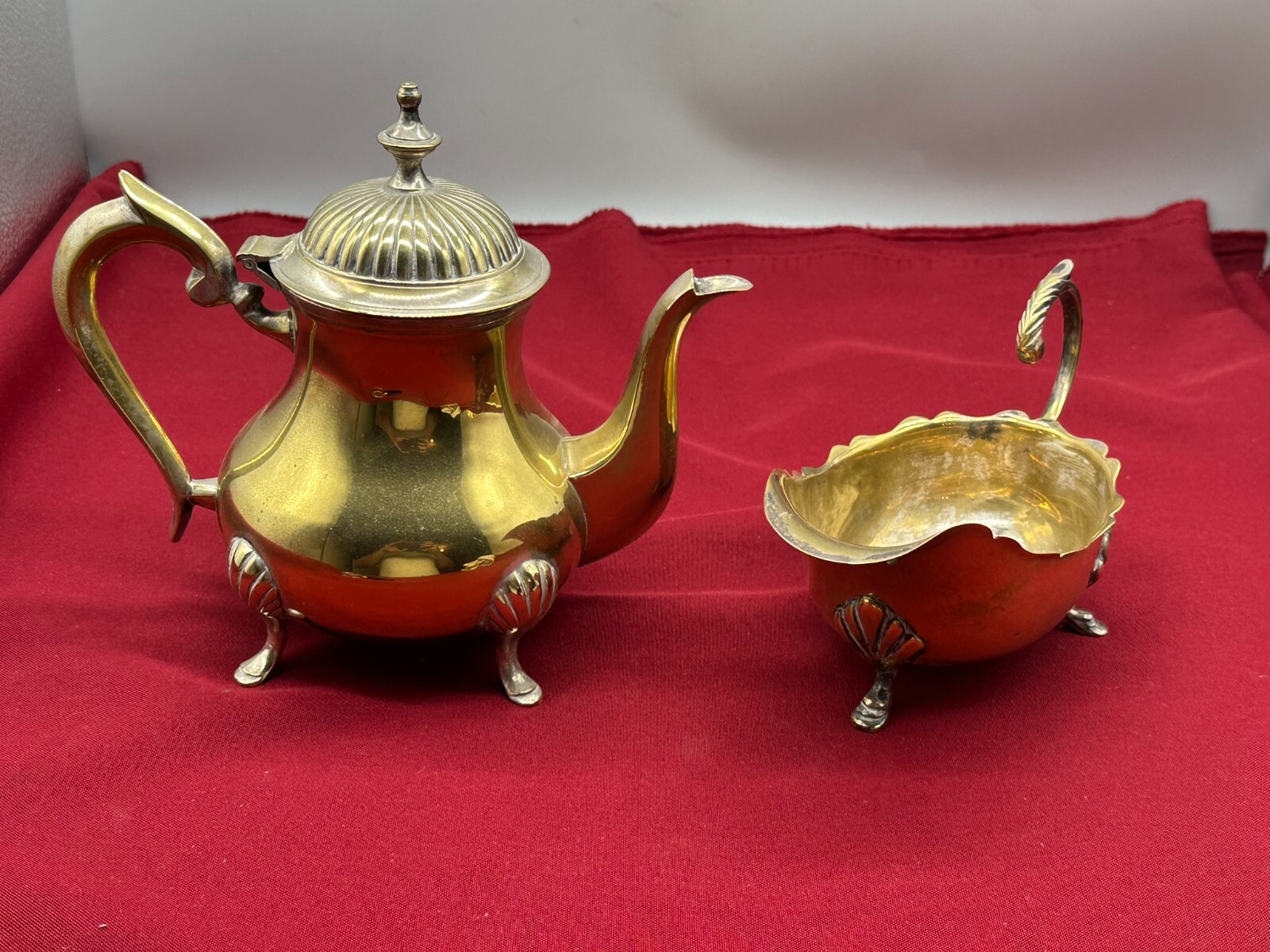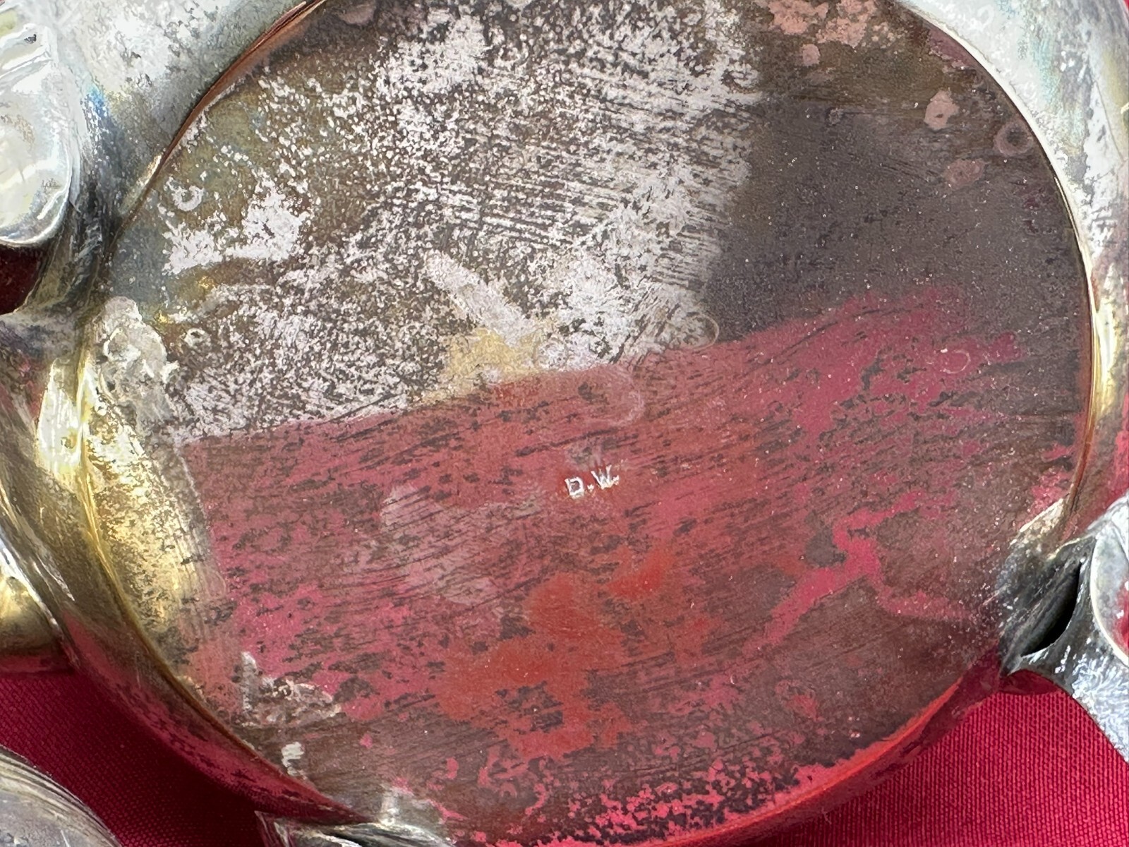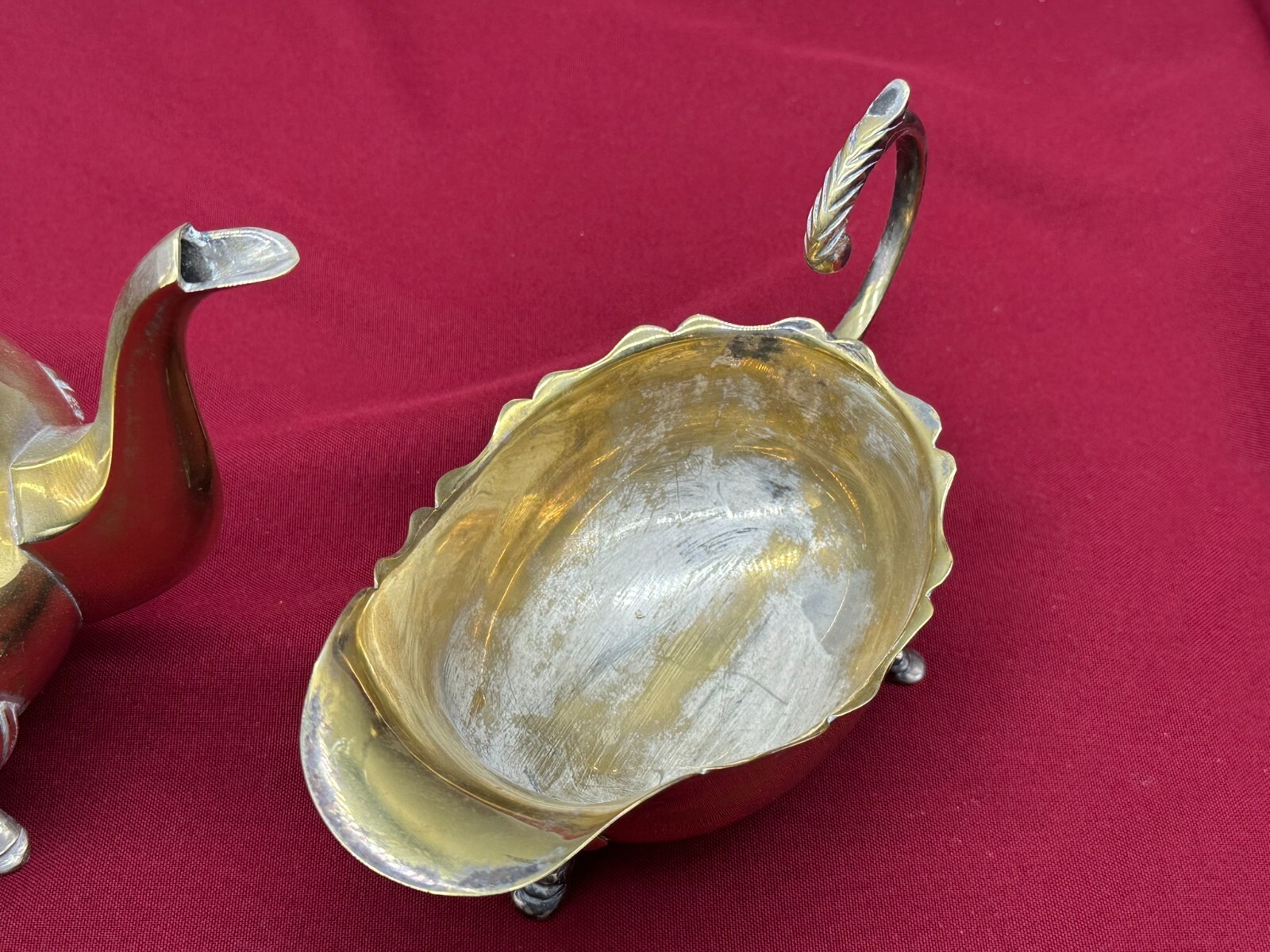 Grosses Kaffeeset aus Metall, versilbert und vergoldet. Die Beschichtung insgesamt berieben. Oberfläche mit Kratzern und kleineren Dellen. Tablett 42x33cm, Höhe/Durchmesser große Kanne 22/13cm, kleine Kanne 18/11cm, Milchkännchen 10,5/8cm, Zuckerdose 12/9xm, Sahnegießer BTH 20/10/10cm.