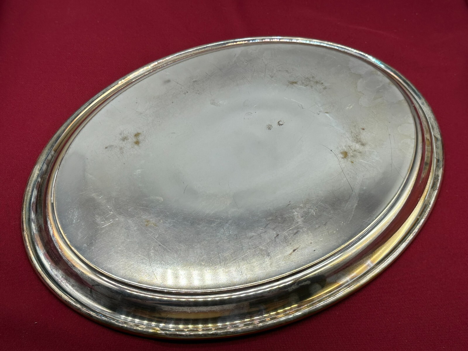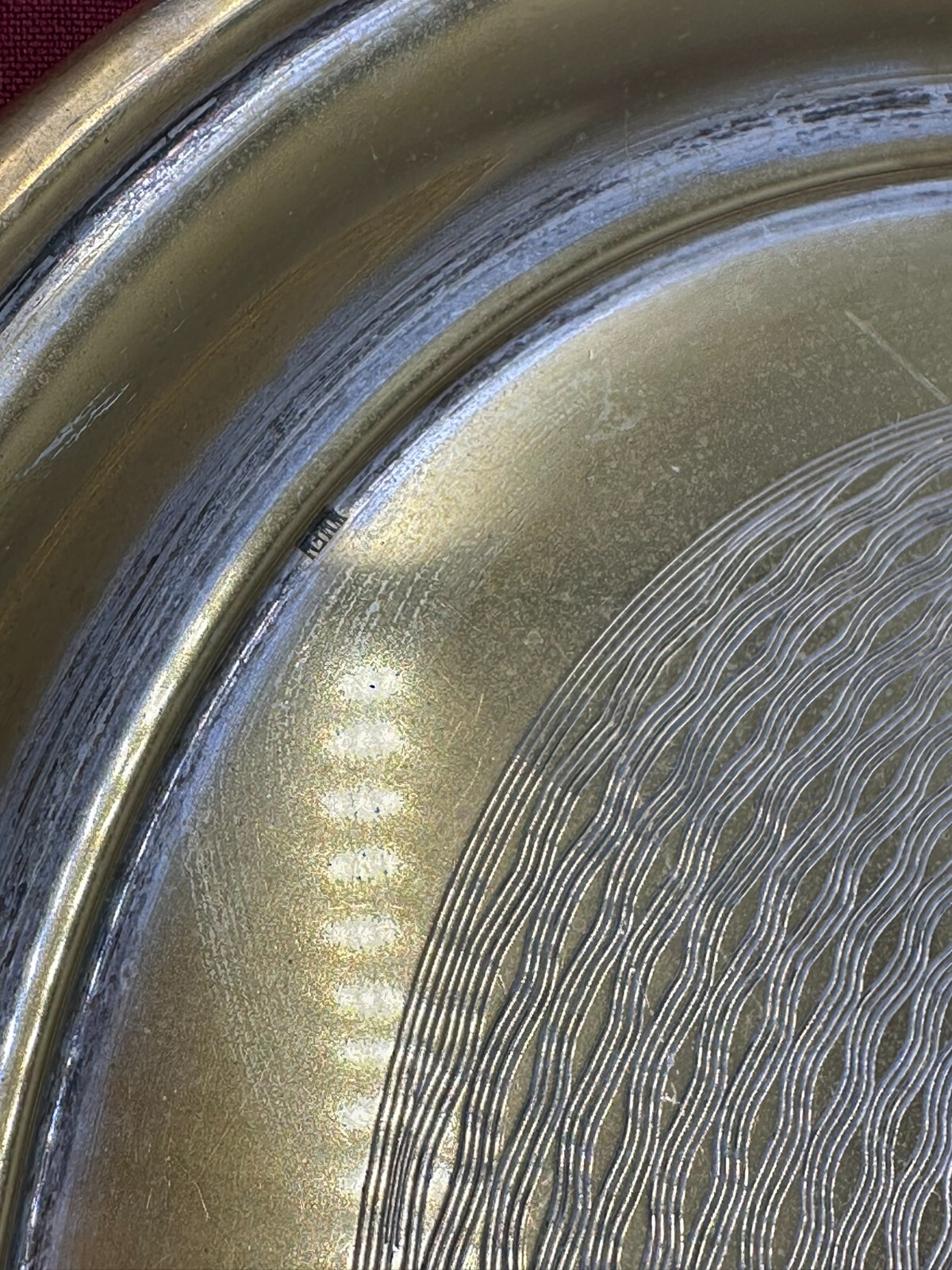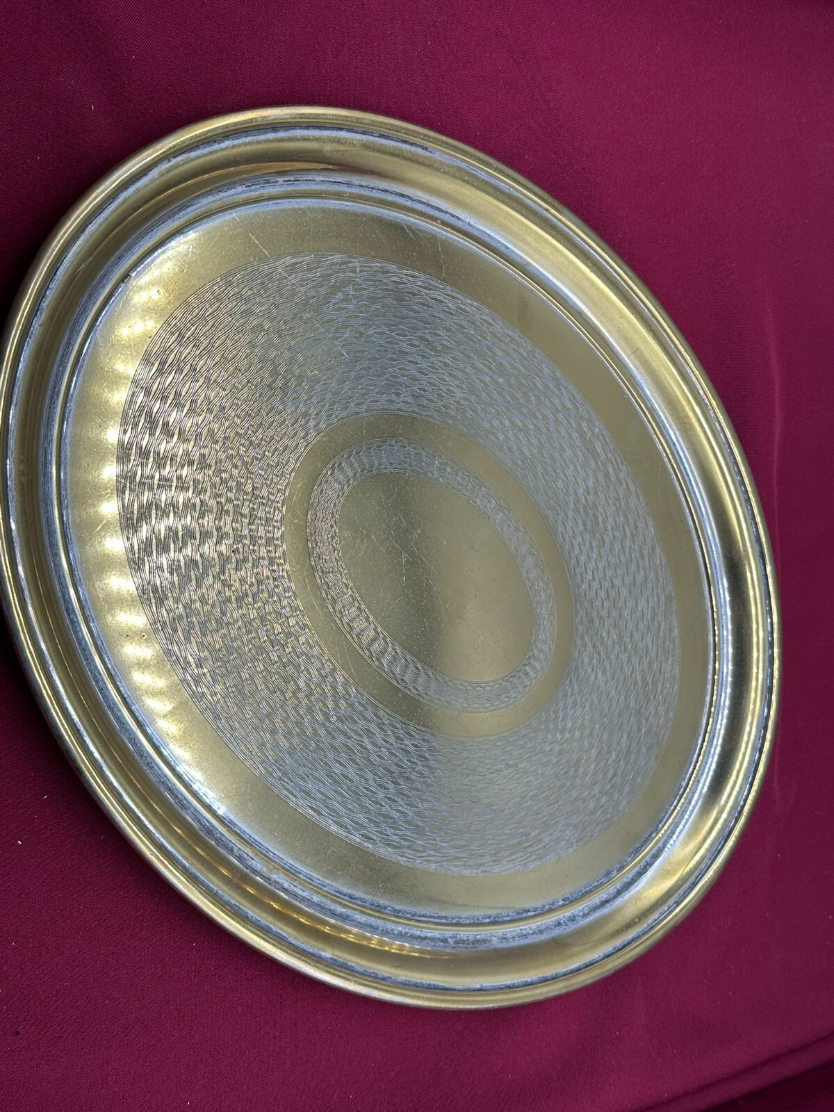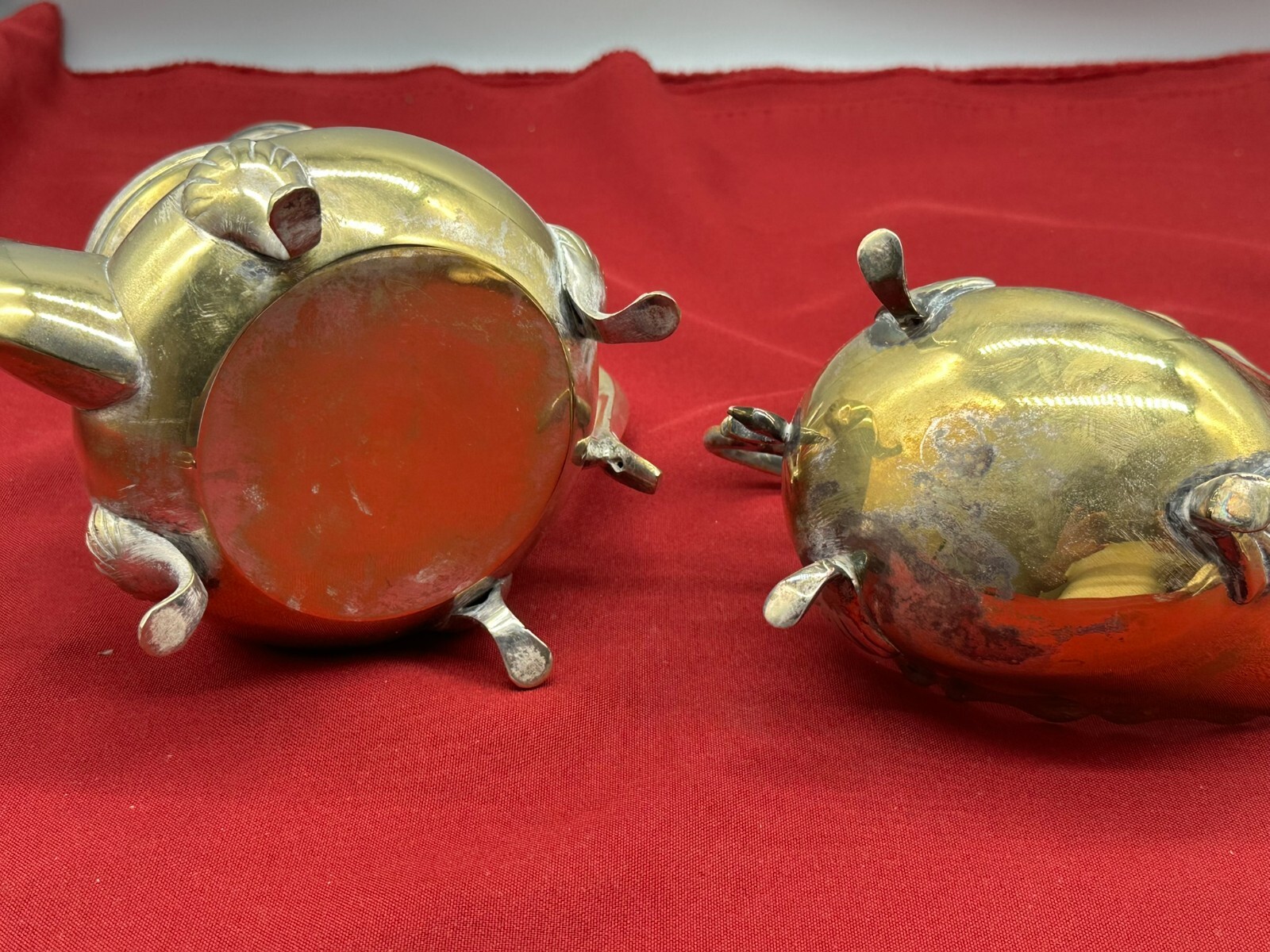 Grosses Kaffeeset aus Metall, versilbert und vergoldet. Die Beschichtung insgesamt berieben. Oberfläche mit Kratzern und kleineren Dellen. Tablett 42x33cm, Höhe/Durchmesser große Kanne 22/13cm, kleine Kanne 18/11cm, Milchkännchen 10,5/8cm, Zuckerdose 12/9xm, Sahnegießer BTH 20/10/10cm.