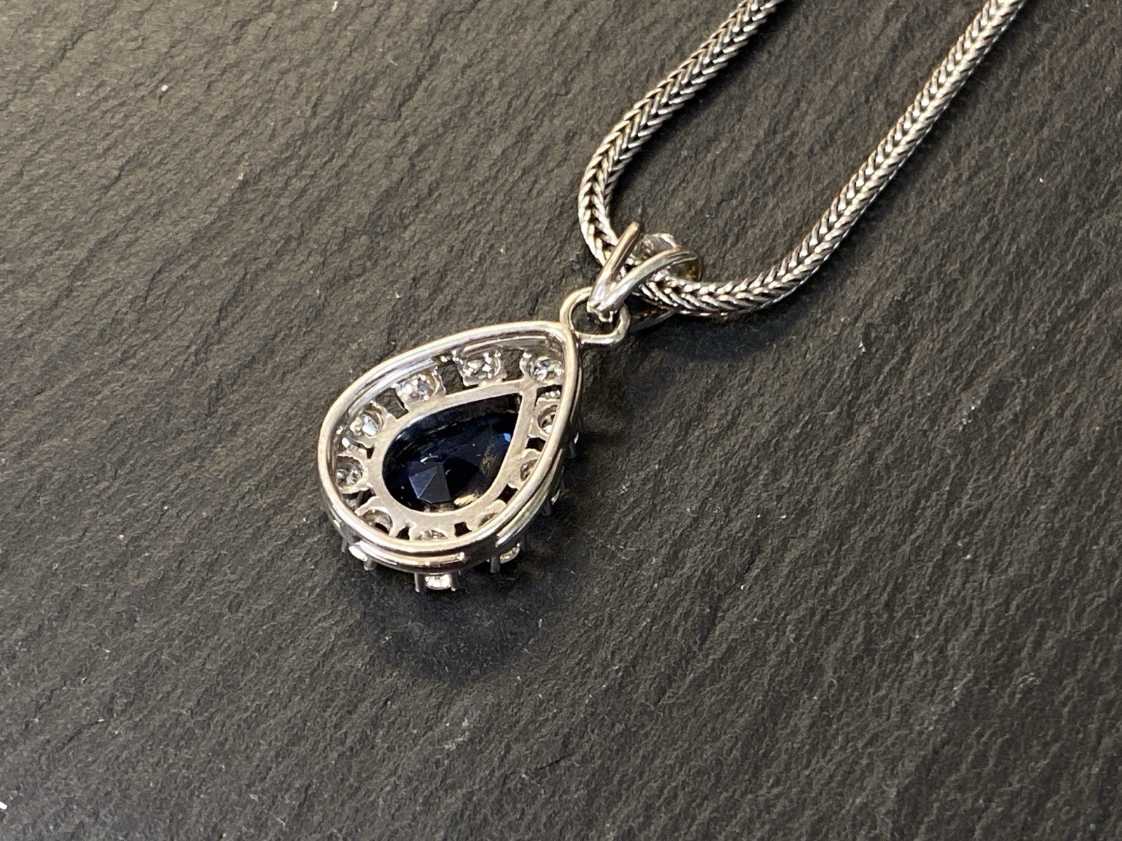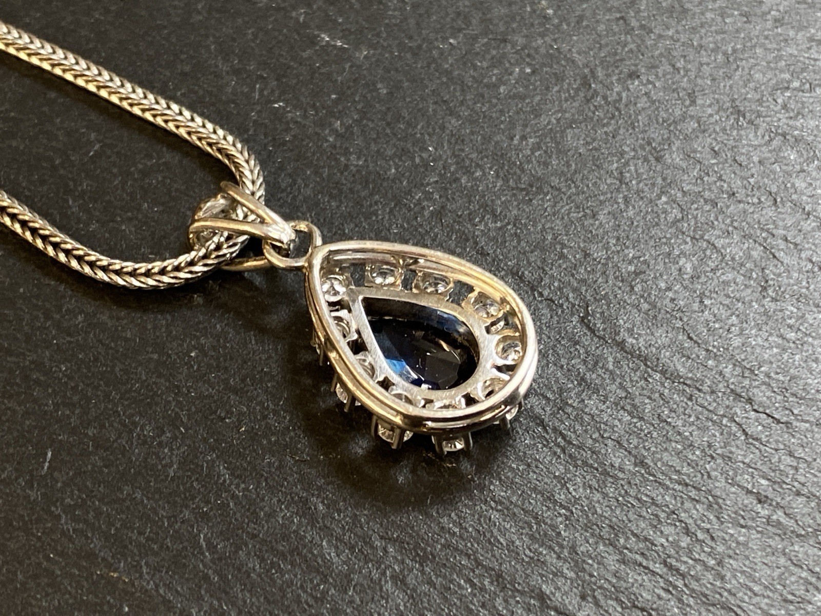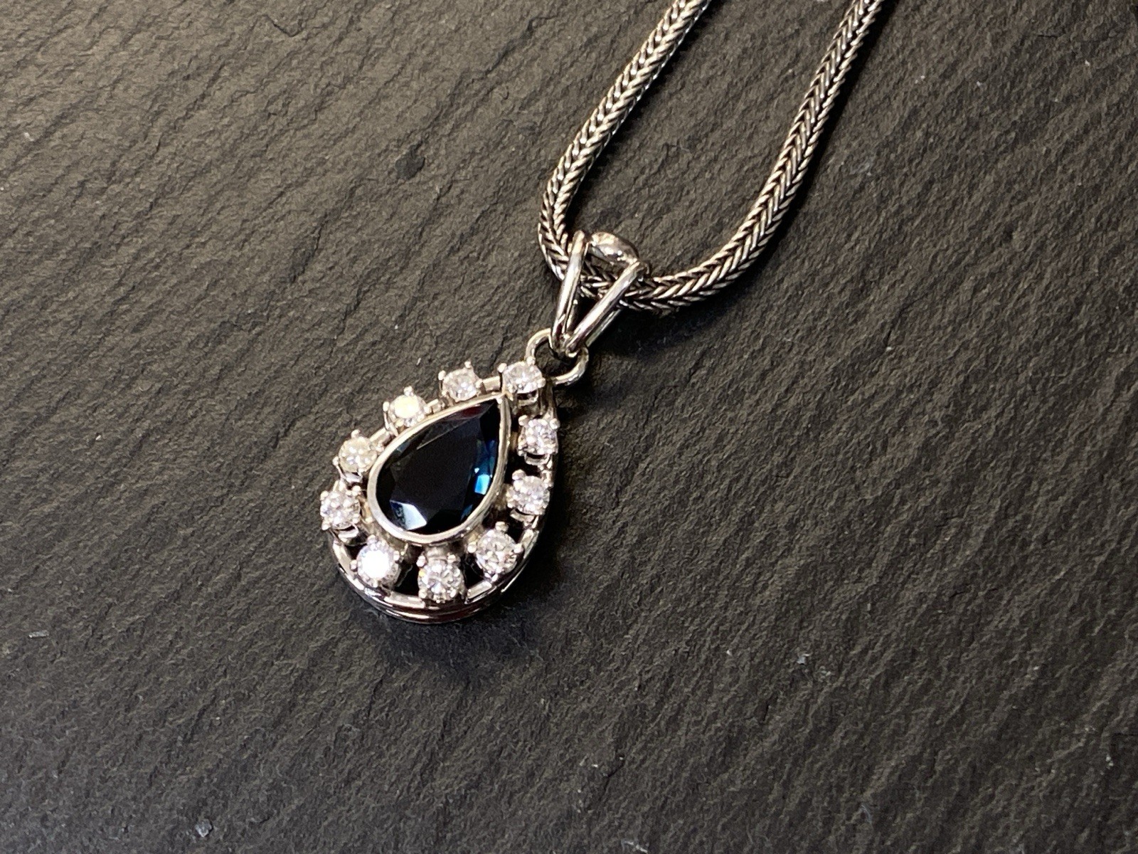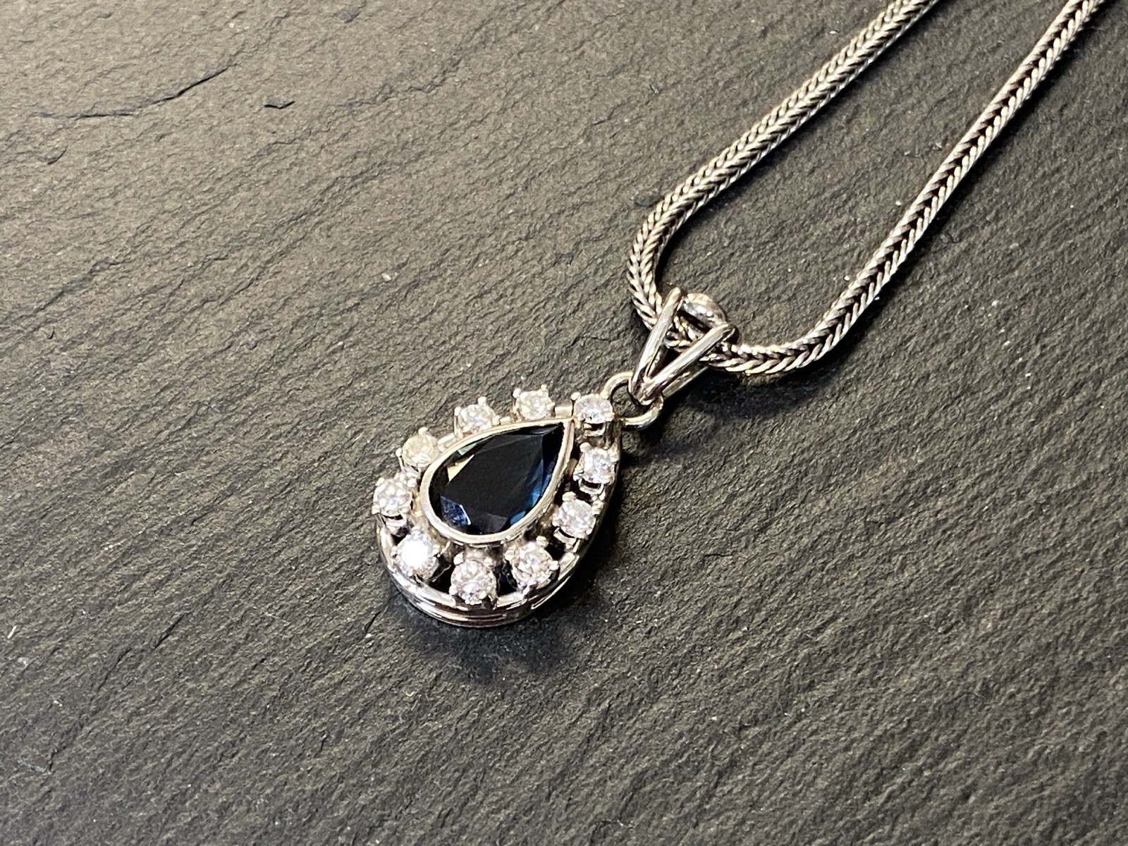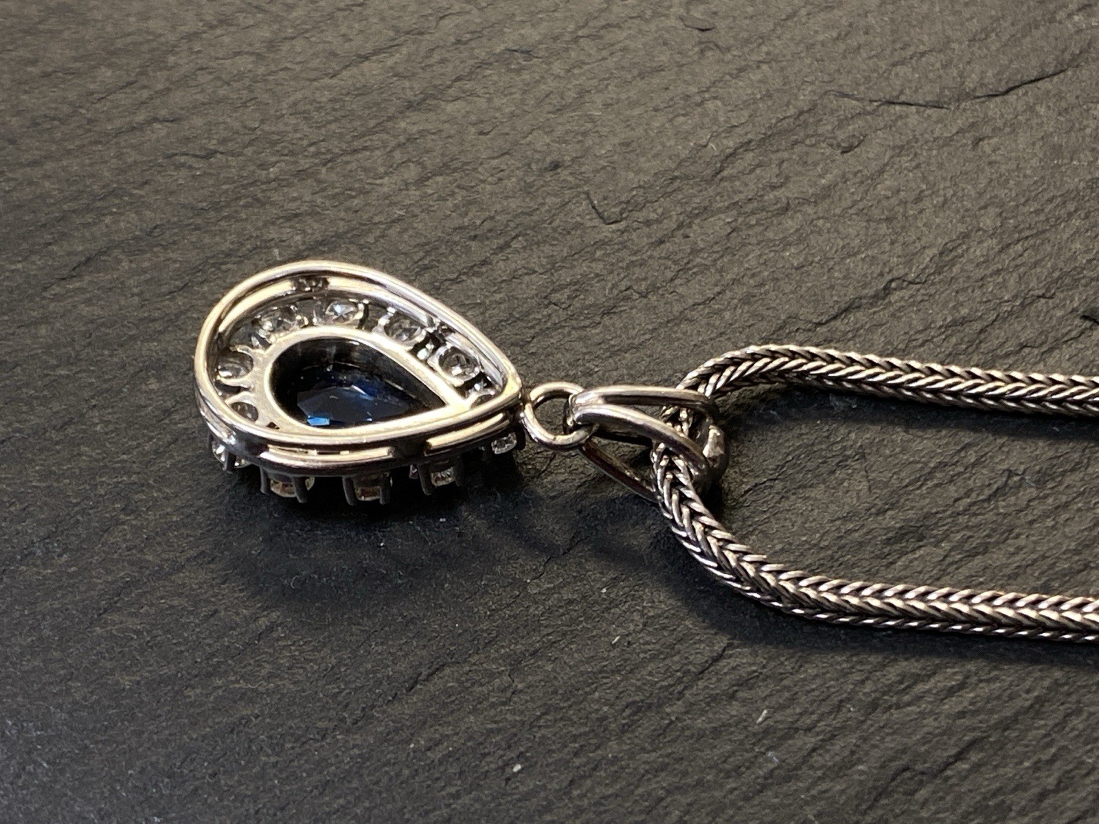 Lange Halskette mit tropfenförmigen Anhänger aus 14K Weissgold, am Verschluss der Kette mit 585 gestempelt, rhodiniert. Der Anhänger wird geziert von einem wunderschönen dunkelblauen Saphir in Tropfenform von ca. 1,47ct., soweit in der Fassung messbar. Umrandet wird dieser von 10 Diamant Brillanten von zus. ca. 0,46ct. in SI1-2/G, soweit in der Fassung messbar. Die Oberfläche insgesamt weist Gebrauchsspuren auf, der Anhänger und die Kette sind aber in sehr schönem Zustand. BTH des Anhängers 1,25/0,58/2,7cm, Gesamtlänge der Kette 53cm, Breite der Kette 0,2cm, Gesamtgewicht ca. 12g. Die Begutachtung der Stücke wird vorgenommen von einem Fachmitglied der deutschen gemmologischen Gesellschaft E.V. Ein Schmuckpass wird mitgeliefert.