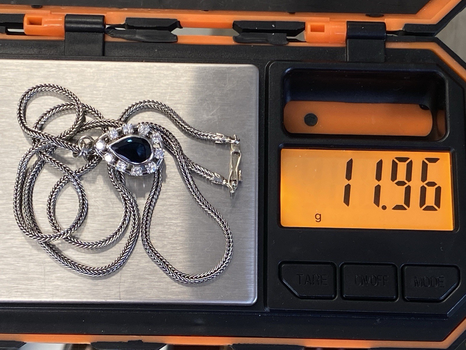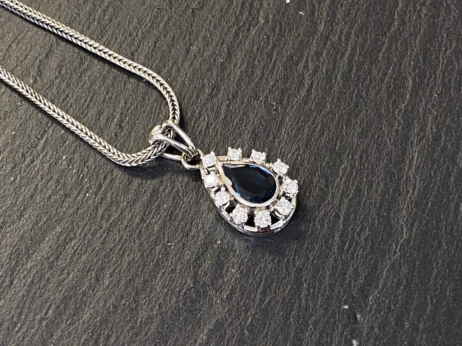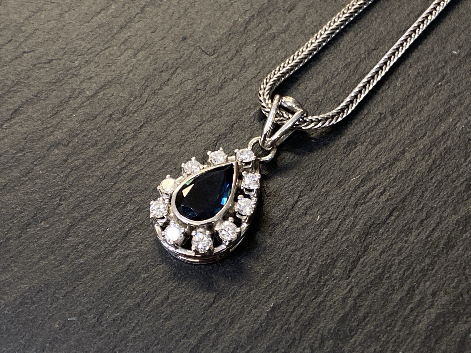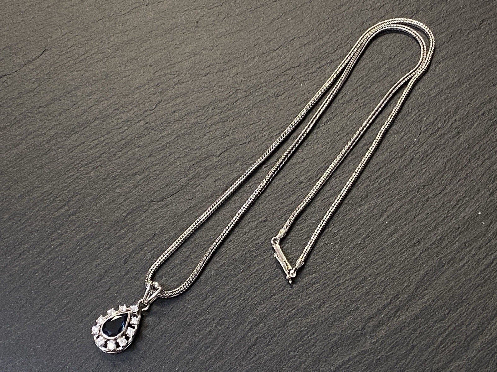 Lange Halskette mit tropfenförmigen Anhänger aus 14K Weissgold, am Verschluss der Kette mit 585 gestempelt, rhodiniert. Der Anhänger wird geziert von einem wunderschönen dunkelblauen Saphir in Tropfenform von ca. 1,47ct., soweit in der Fassung messbar. Umrandet wird dieser von 10 Diamant Brillanten von zus. ca. 0,46ct. in SI1-2/G, soweit in der Fassung messbar. Die Oberfläche insgesamt weist Gebrauchsspuren auf, der Anhänger und die Kette sind aber in sehr schönem Zustand. BTH des Anhängers 1,25/0,58/2,7cm, Gesamtlänge der Kette 53cm, Breite der Kette 0,2cm, Gesamtgewicht ca. 12g. Die Begutachtung der Stücke wird vorgenommen von einem Fachmitglied der deutschen gemmologischen Gesellschaft E.V. Ein Schmuckpass wird mitgeliefert.