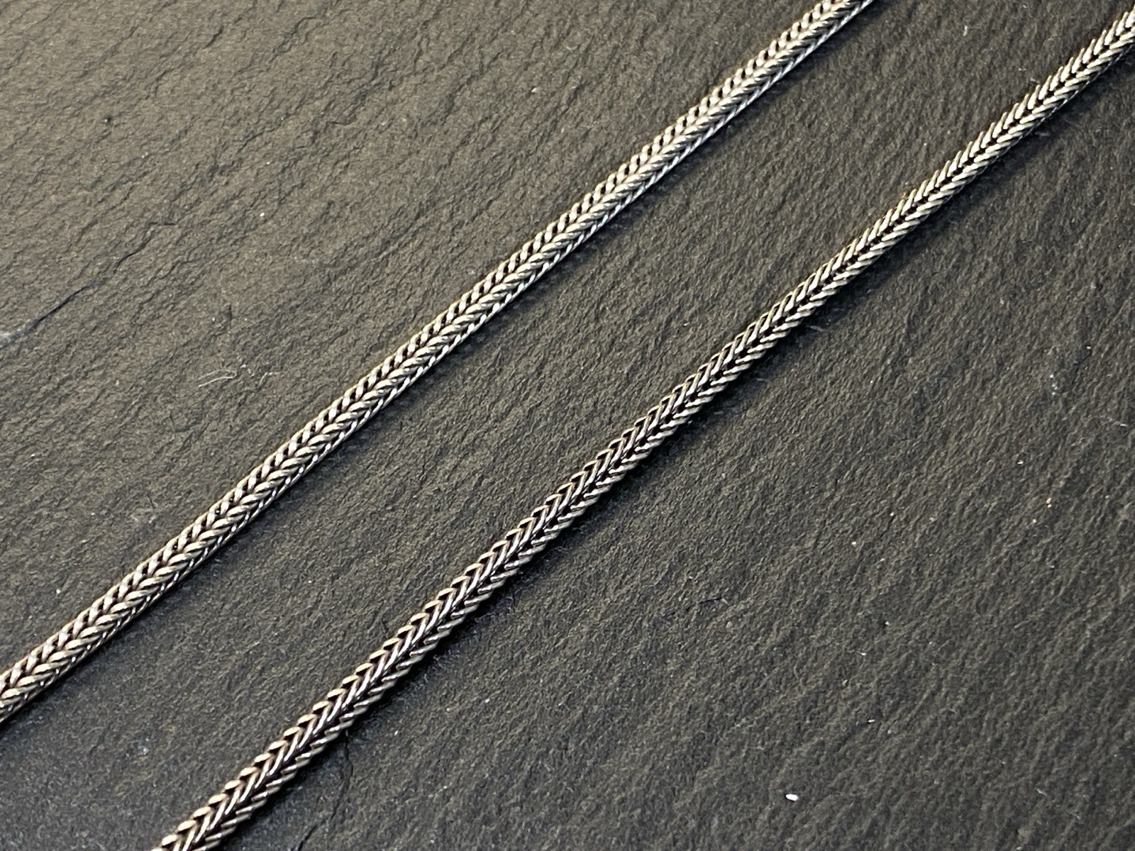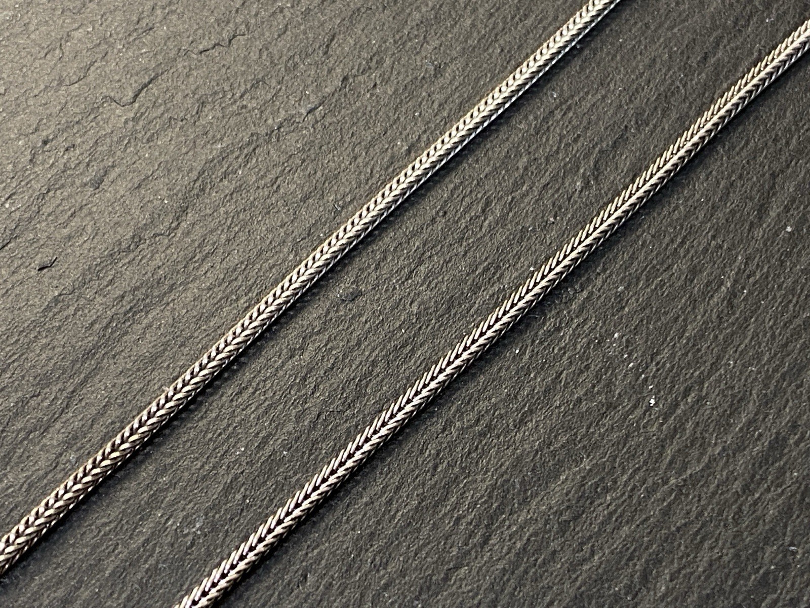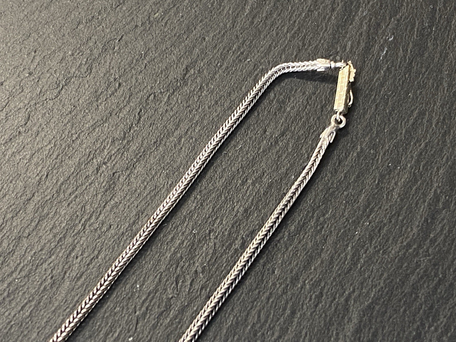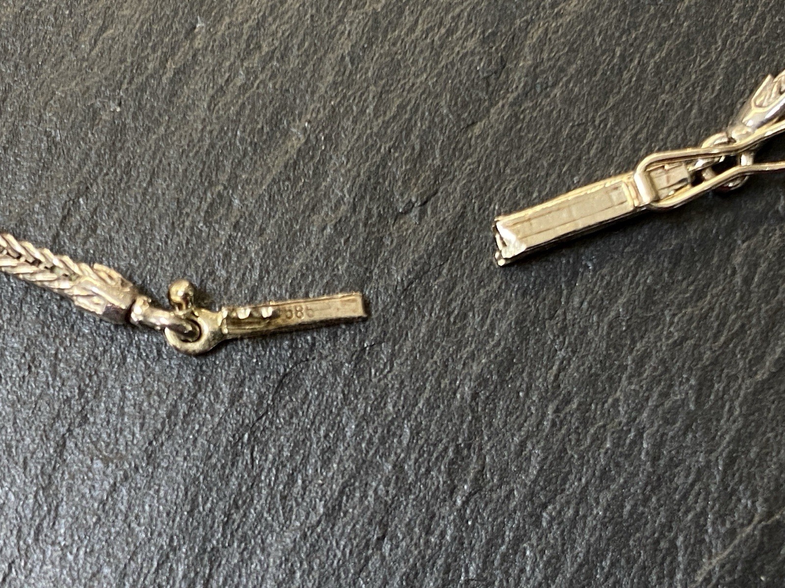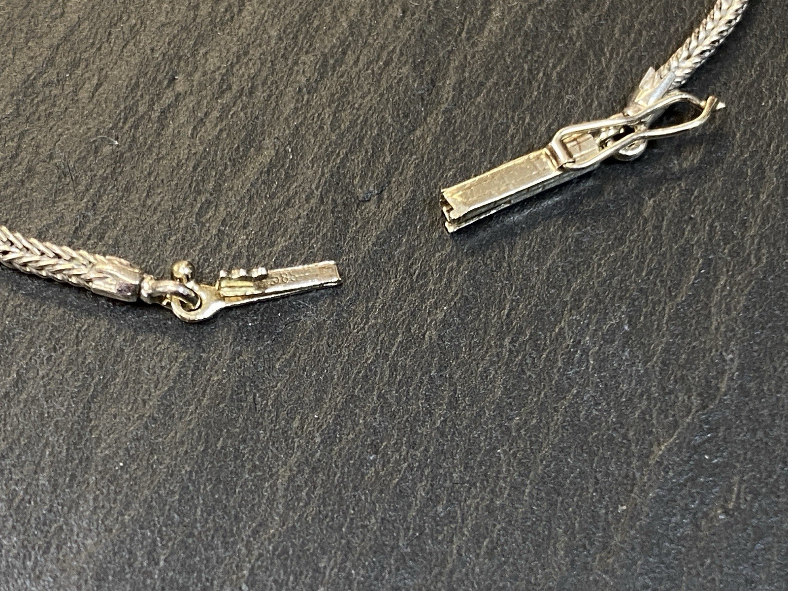 Lange Halskette mit tropfenförmigen Anhänger aus 14K Weissgold, am Verschluss der Kette mit 585 gestempelt, rhodiniert. Der Anhänger wird geziert von einem wunderschönen dunkelblauen Saphir in Tropfenform von ca. 1,47ct., soweit in der Fassung messbar. Umrandet wird dieser von 10 Diamant Brillanten von zus. ca. 0,46ct. in SI1-2/G, soweit in der Fassung messbar. Die Oberfläche insgesamt weist Gebrauchsspuren auf, der Anhänger und die Kette sind aber in sehr schönem Zustand. BTH des Anhängers 1,25/0,58/2,7cm, Gesamtlänge der Kette 53cm, Breite der Kette 0,2cm, Gesamtgewicht ca. 12g. Die Begutachtung der Stücke wird vorgenommen von einem Fachmitglied der deutschen gemmologischen Gesellschaft E.V. Ein Schmuckpass wird mitgeliefert.