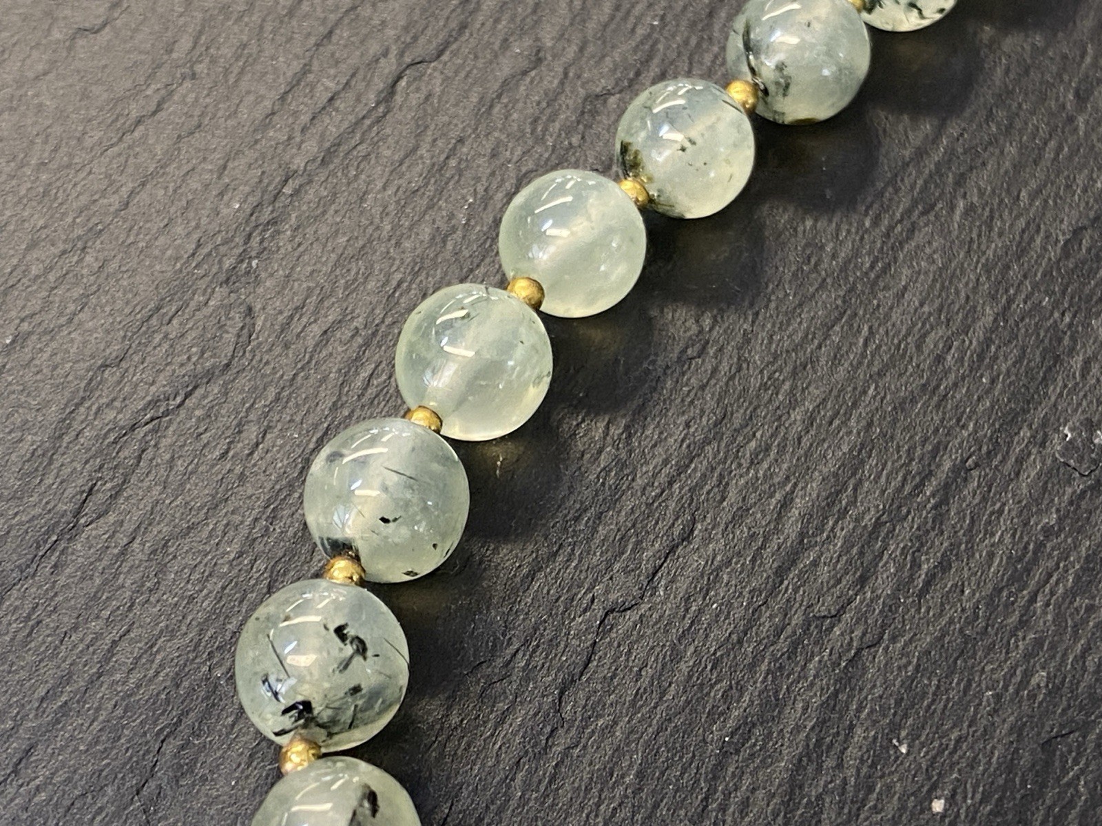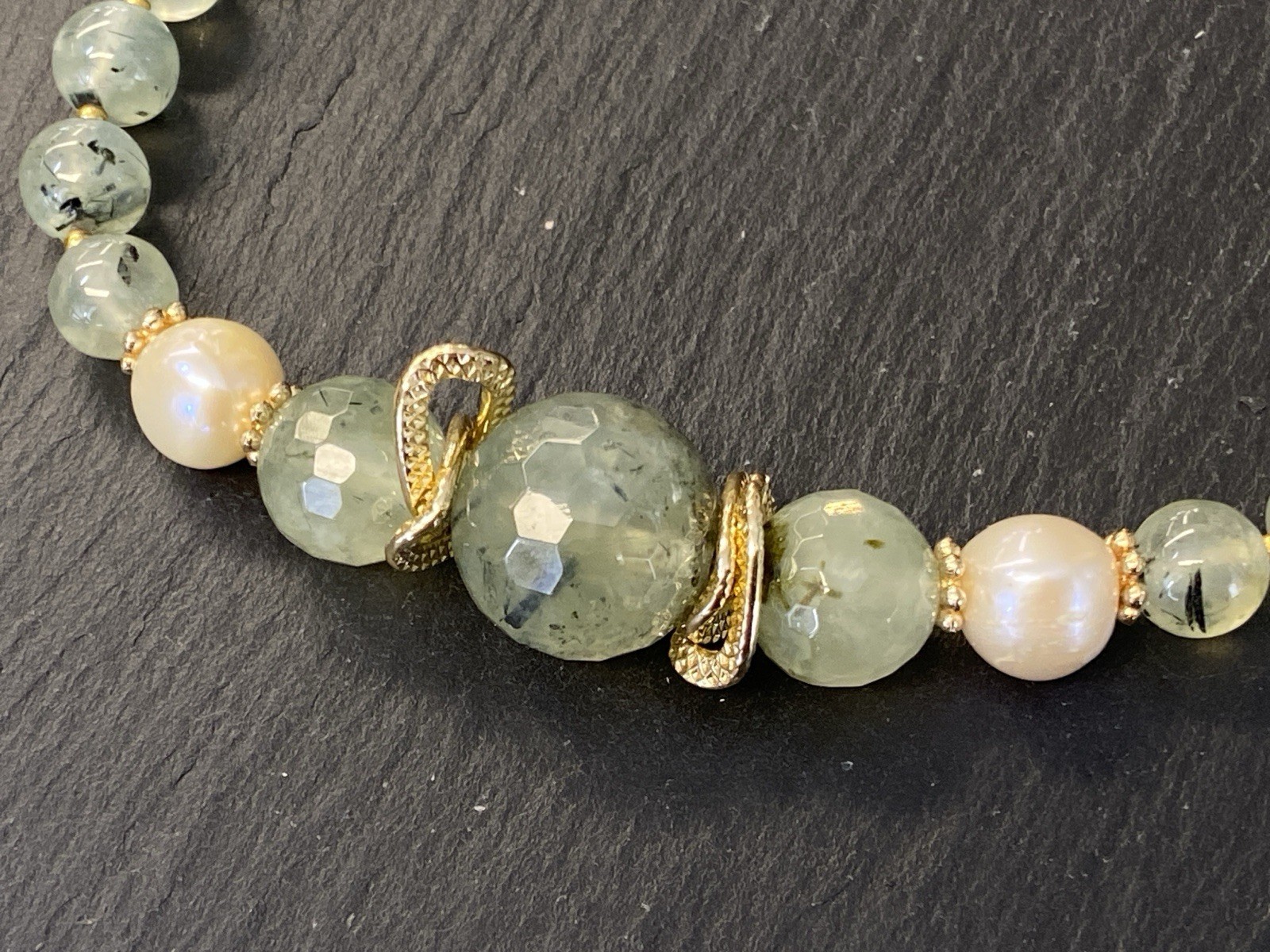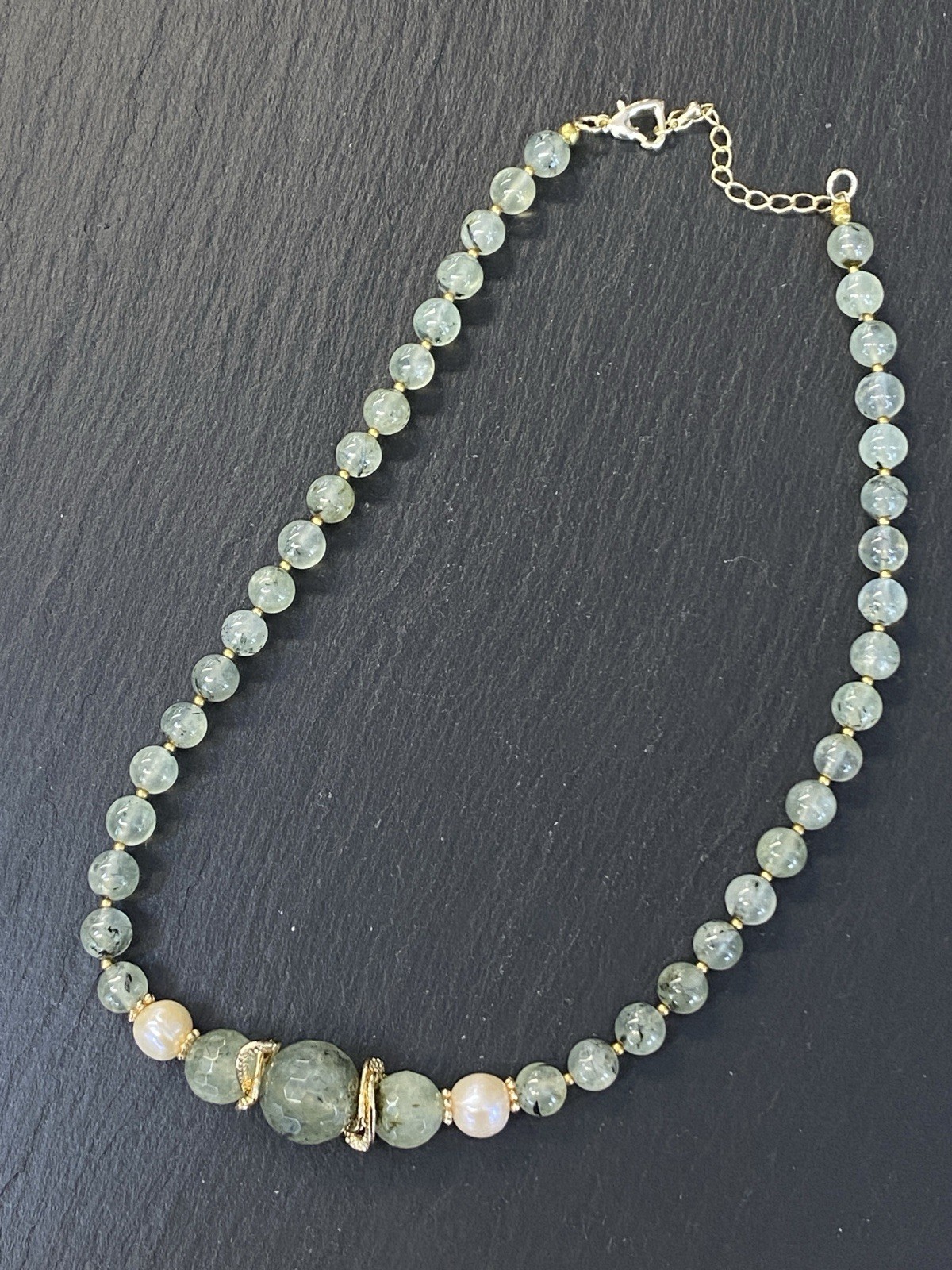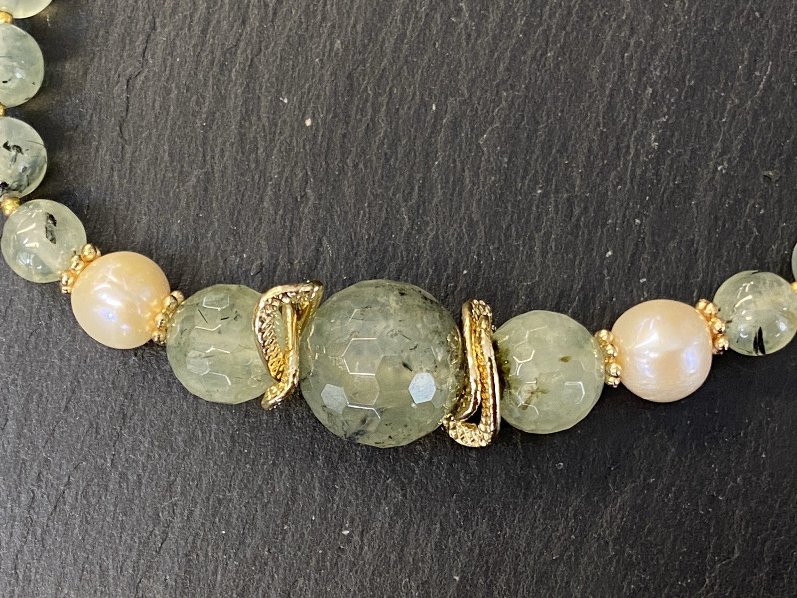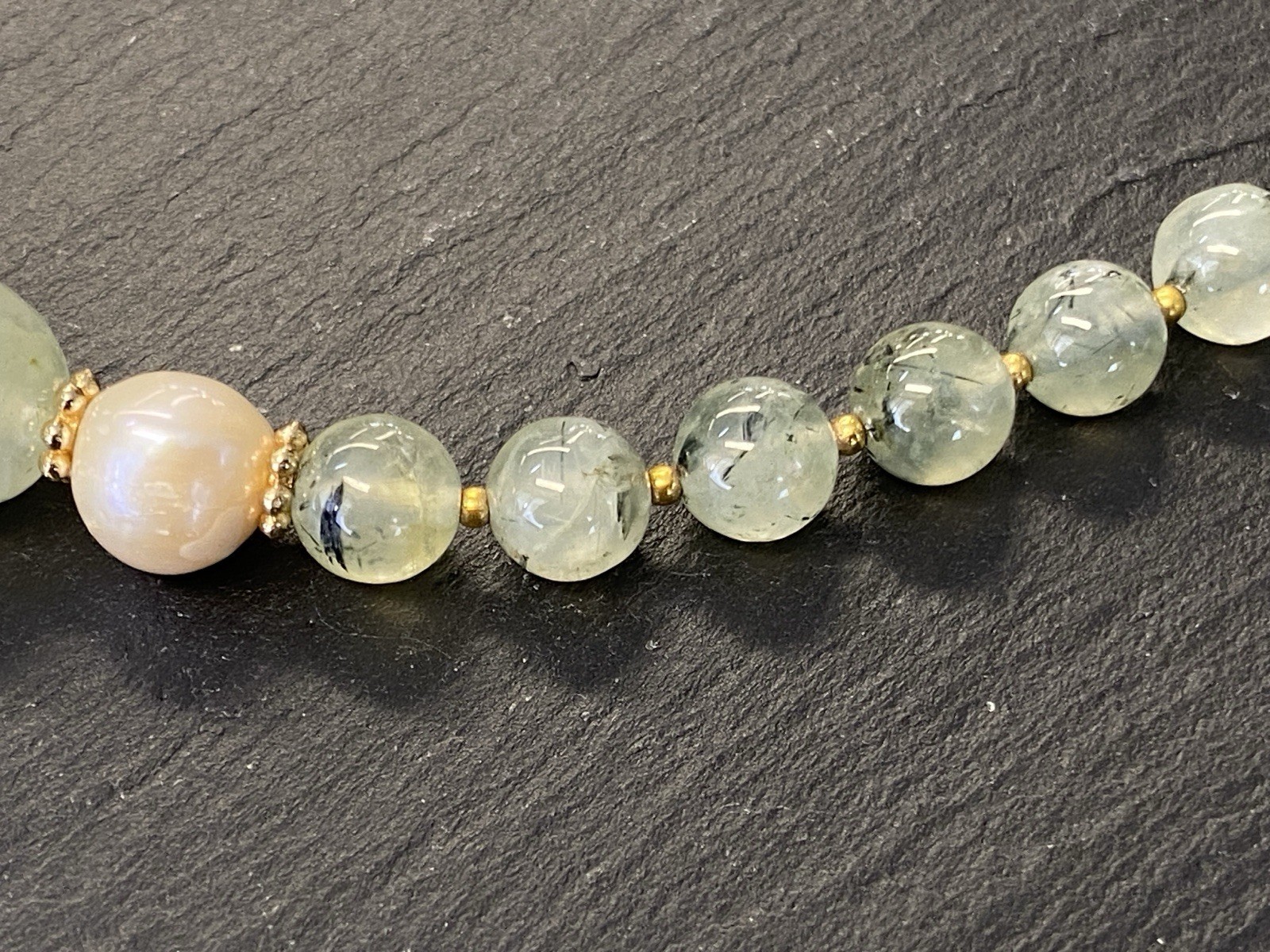 Dekorative Halskette mit verschiedengroßen Perlen aus Chrysopras, sowie zwei künstl. Perlen. Die mittlere und größte Kugel ist facettiert geschliffen, alle anderen Perlen sind glatt. Durchmesser Perlen insg. von 0,8-1,6cm. Der Verschluss ist herzförmig und intakt, die Perlen sind nicht gebrochen. Die Dekoelemente und der Verschluss sind aus vergoldetem Metall. Gesamtlänge ca. 51cm, Gesamtgewicht ca. 49,43g.