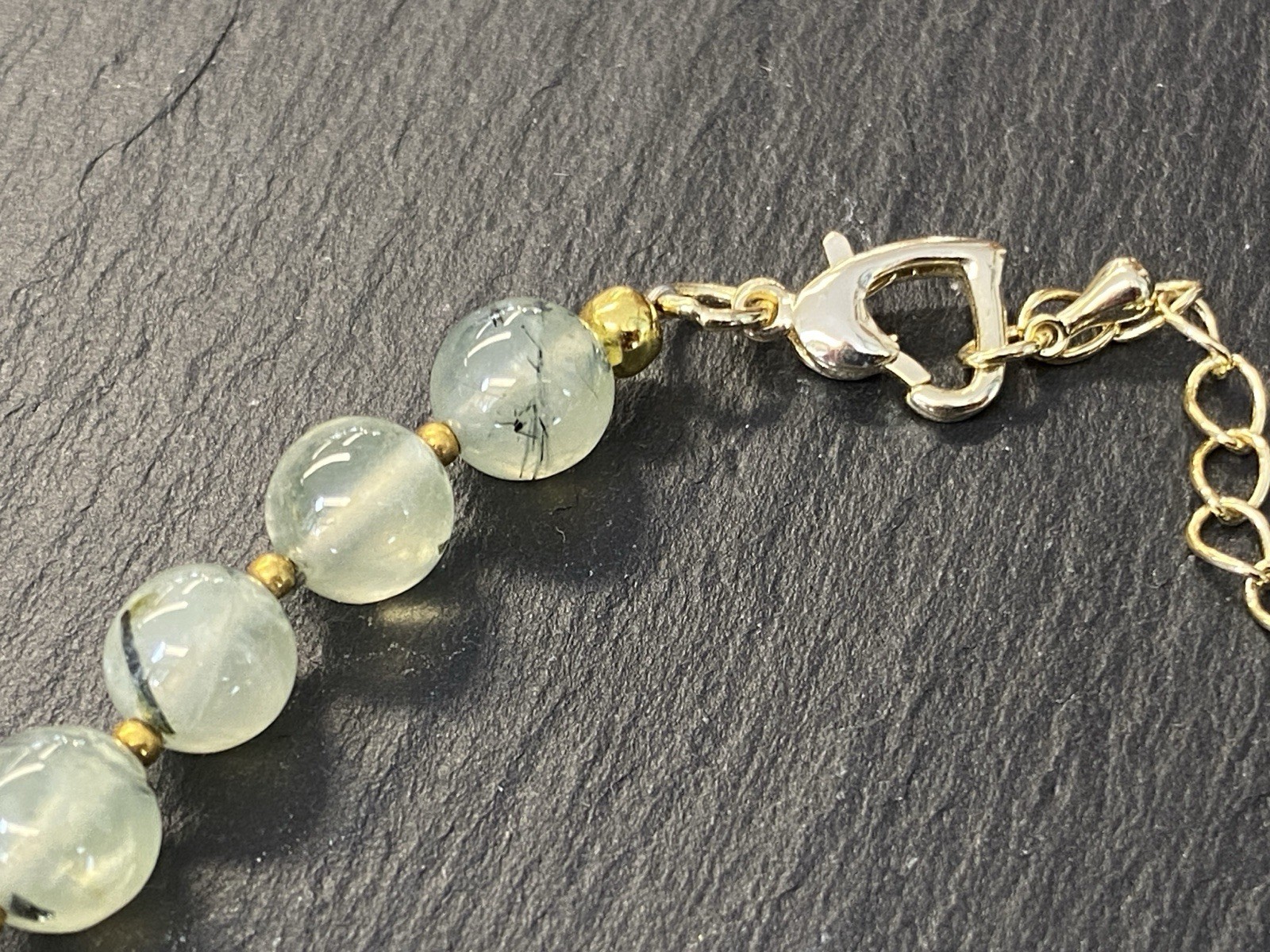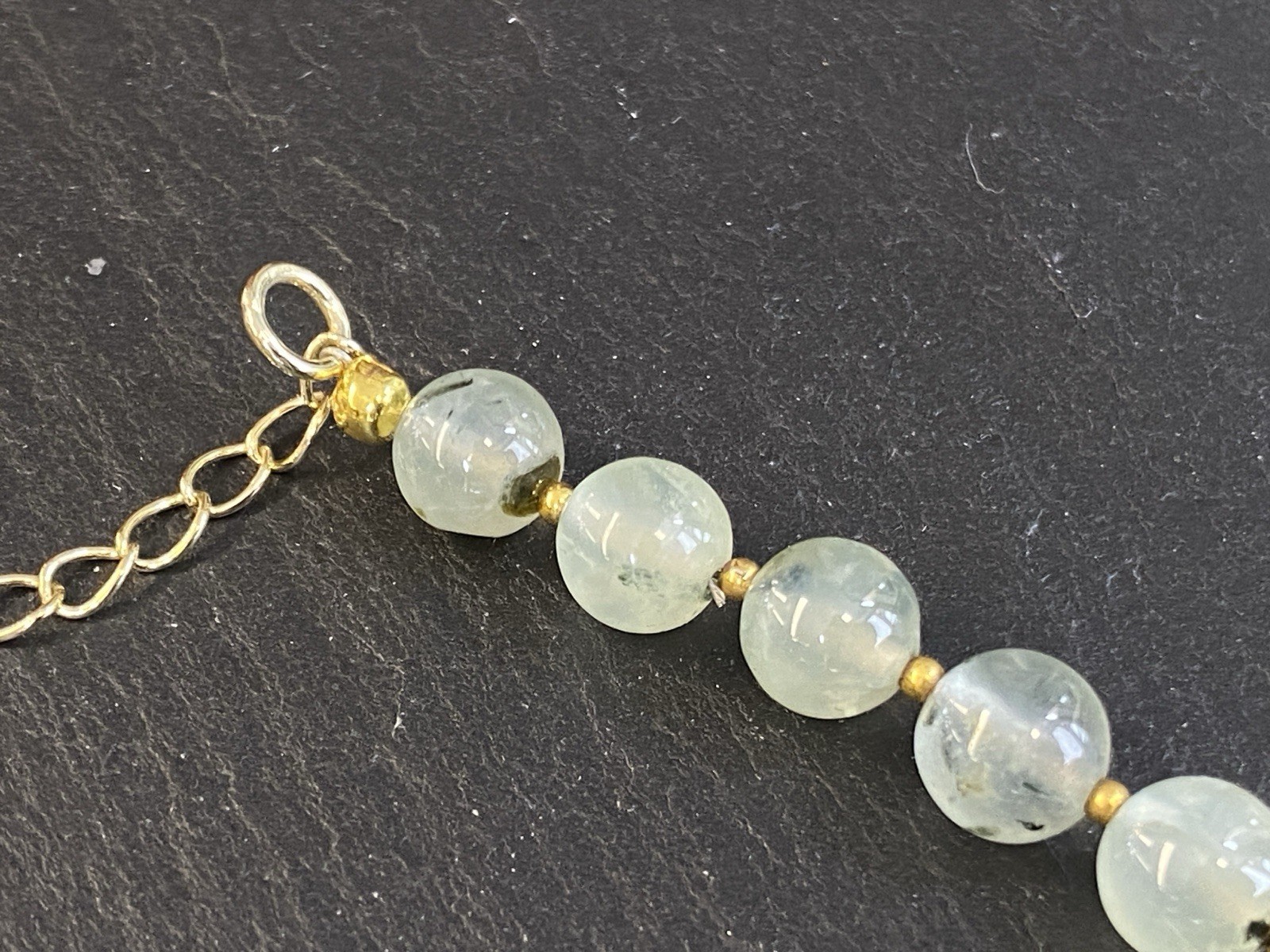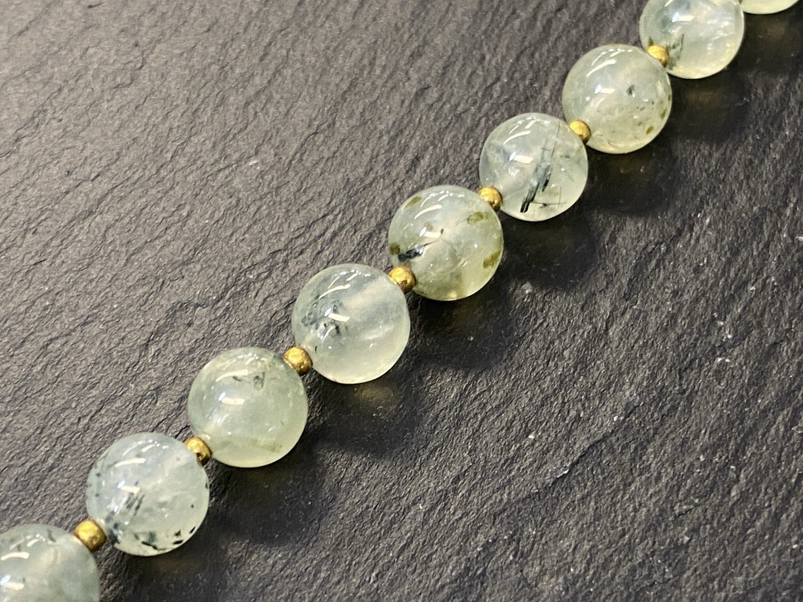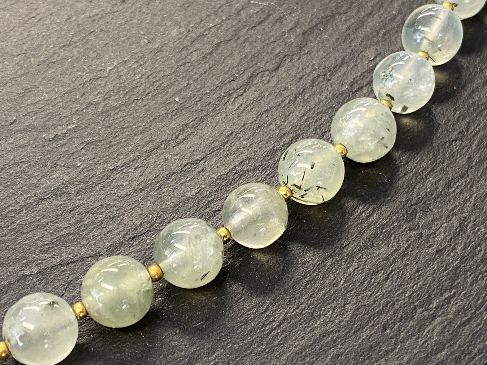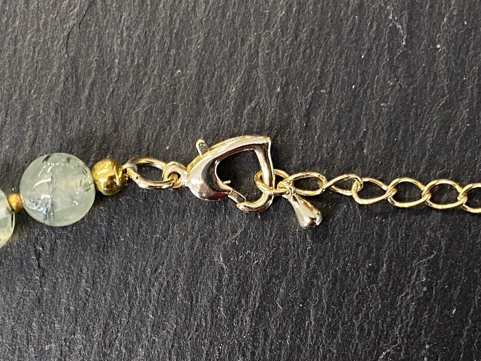 Dekorative Halskette mit verschiedengroßen Perlen aus Chrysopras, sowie zwei künstl. Perlen. Die mittlere und größte Kugel ist facettiert geschliffen, alle anderen Perlen sind glatt. Durchmesser Perlen insg. von 0,8-1,6cm. Der Verschluss ist herzförmig und intakt, die Perlen sind nicht gebrochen. Die Dekoelemente und der Verschluss sind aus vergoldetem Metall. Gesamtlänge ca. 51cm, Gesamtgewicht ca. 49,43g.