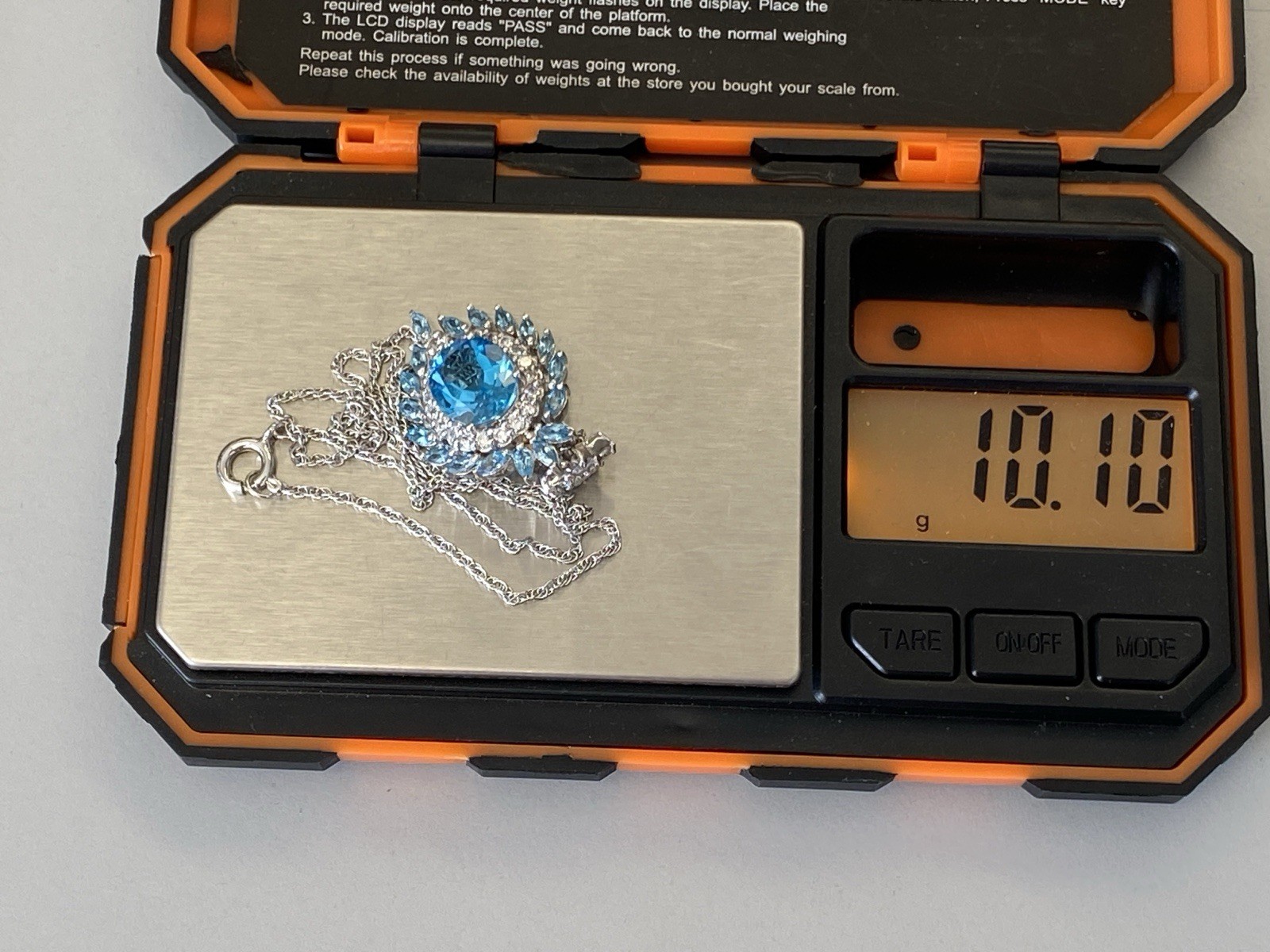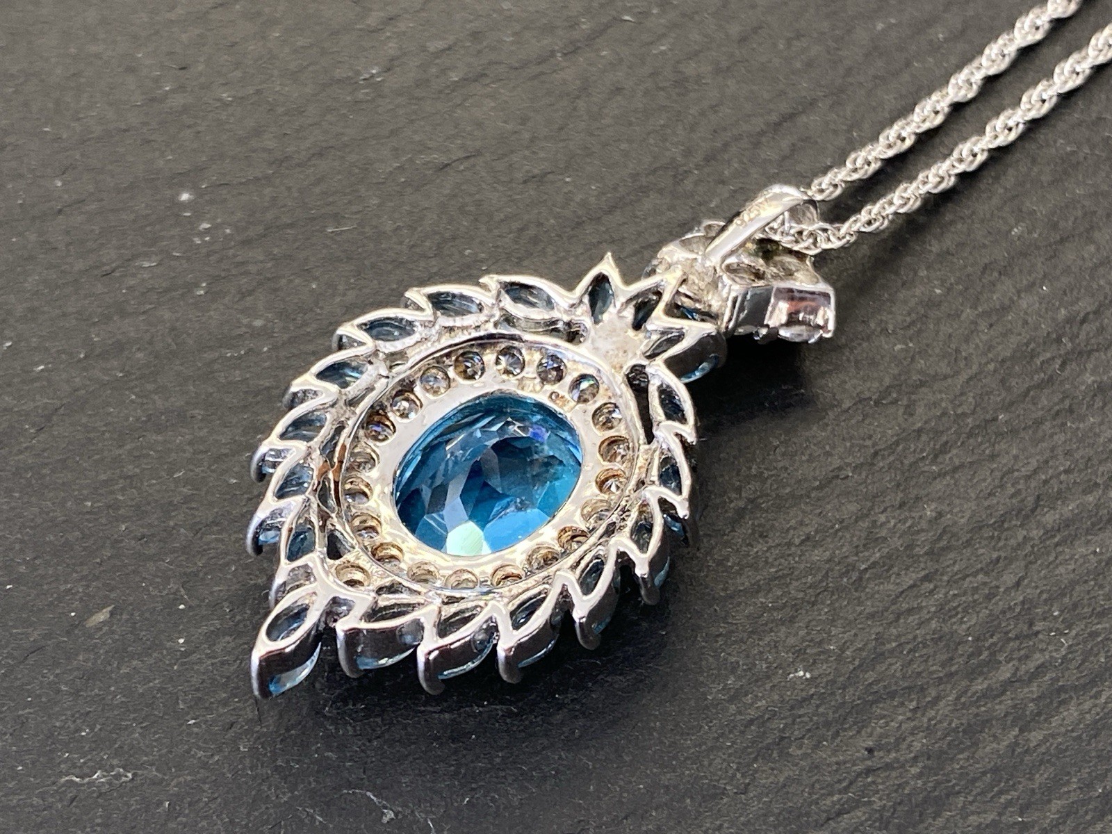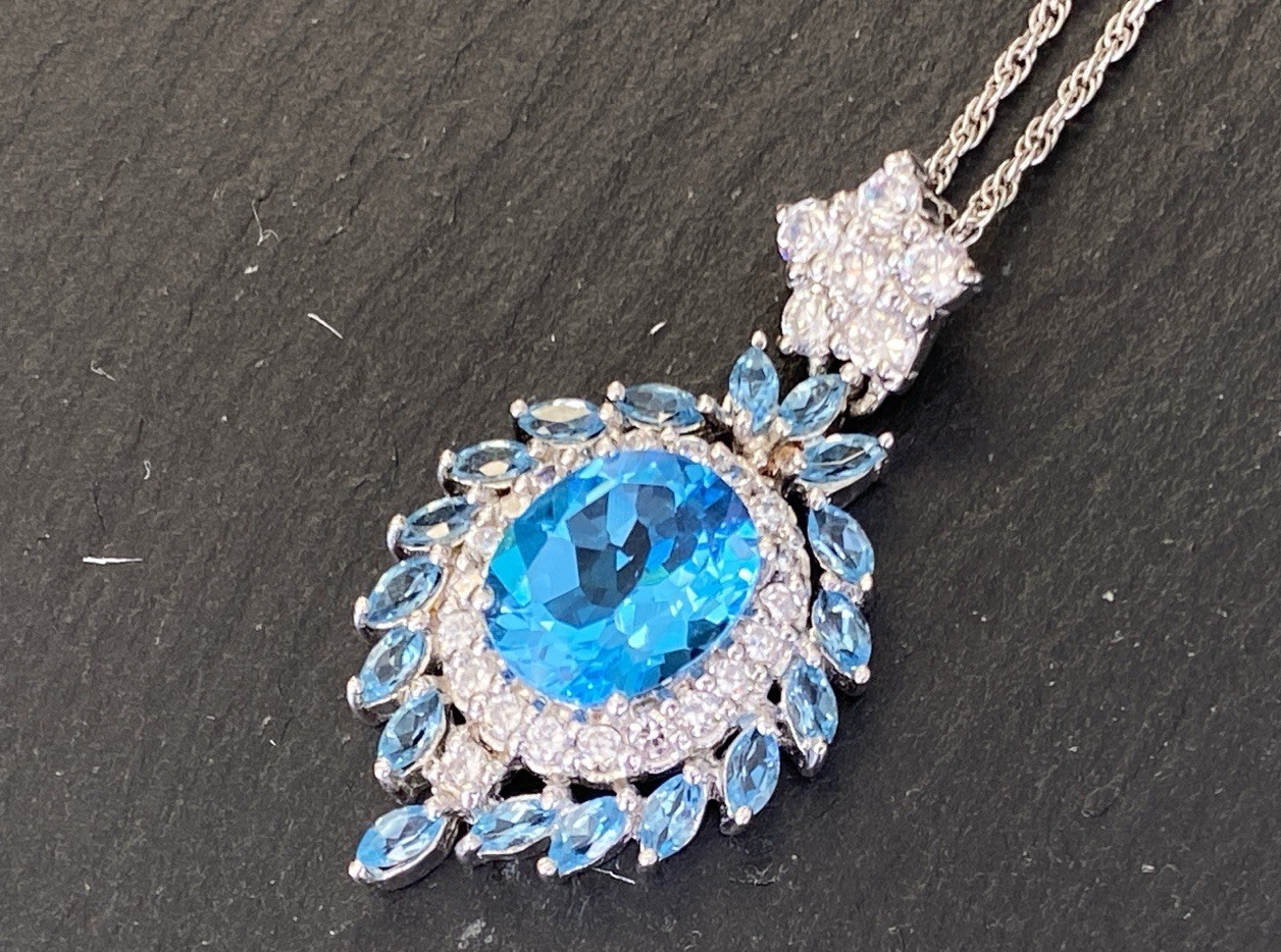 Halskette aus 925 Sterling Silber, gestempelt, mit imposantem Anhänger, gestempelt mit „925 IV“ und 925. Besetzt ist der Anhänger mit einem imposanten blauen Topas von ca. 5,76ct., soweit in der Fassung messbar. Begleitet wird dieser außergewöhnliche Stein von farblosen Bergkristall Brillanten und einigen weiteren blauen Topasen in Navetteschliff von zus. ca. 1,04ct., soweit in der Fassung messbar. Der Hauptstein ist besonders im Kantenbereich leicht bestoßen. Die Oberfläche ist minimalst berieben, der Verschluss der Kette schließt. BTH Anhänger 2,2/0,7/4,1cm, Länge der Halskette 50,5cm, Gesamtgewicht ca. 10,10g.