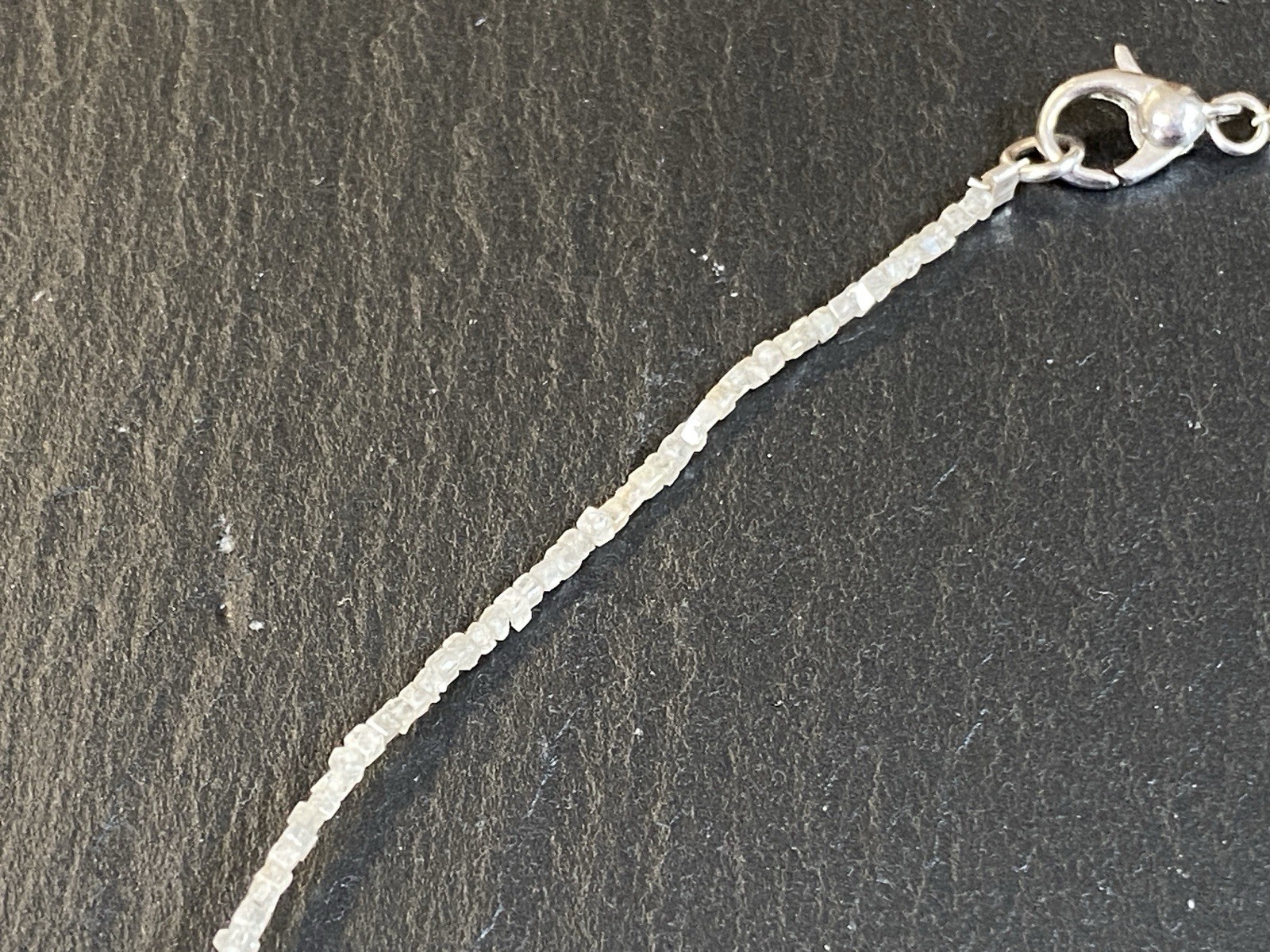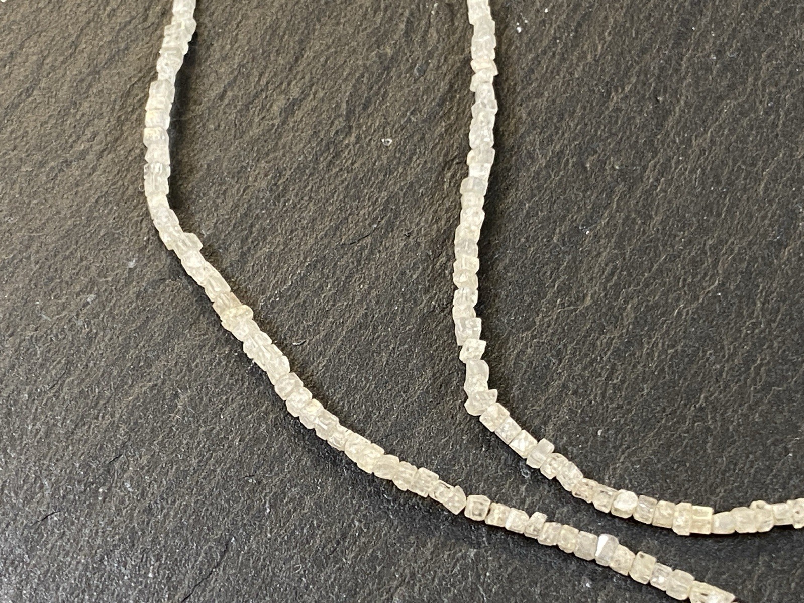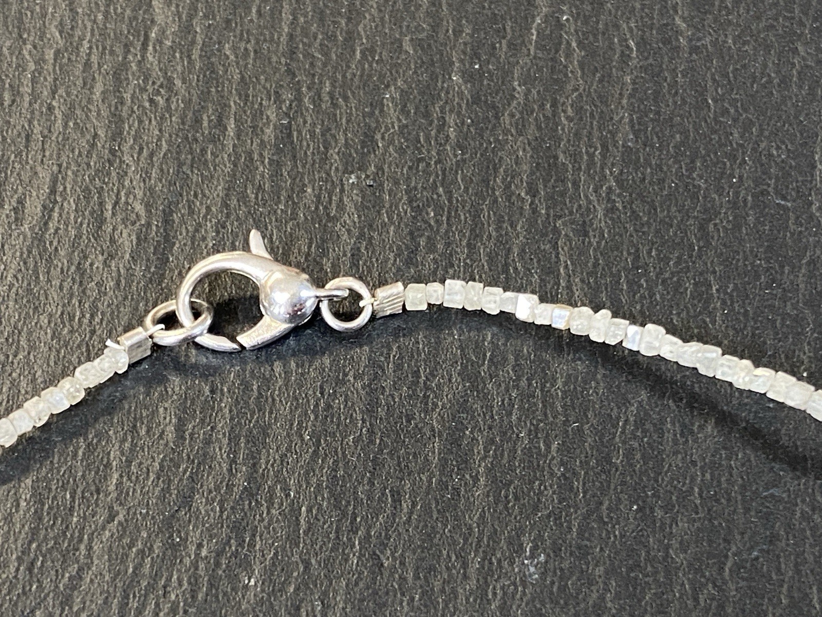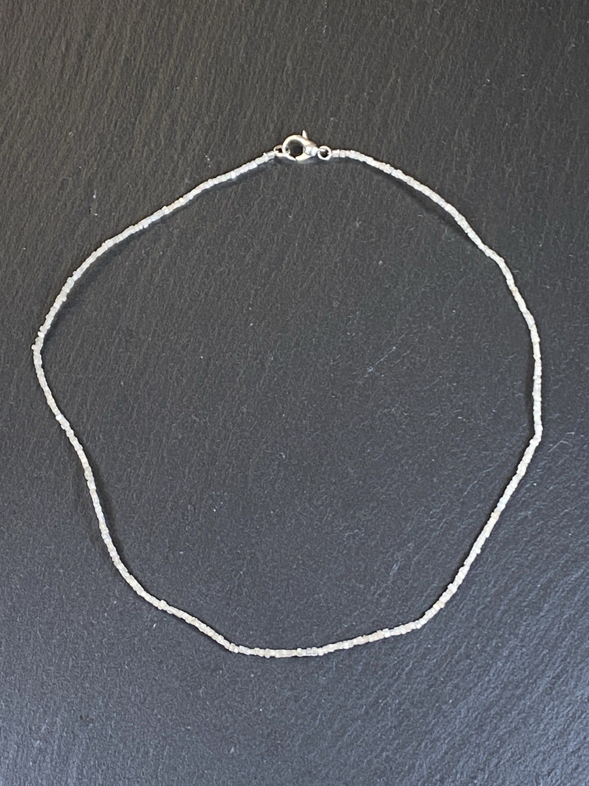 Halskette aus rohen Diamantkristallen, der Verschluss ist mit S925 gestempelt. Sehr schöner Zustand. Gesamtlänge ca. 42,5cm, Breite 0,15-0,2cm, Gesamtgewicht ca. 3,18g. Die Begutachtung der Stücke wird vorgenommen von einem Fachmitglied der deutschen gemmologischen Gesellschaft E.V. Ein Schmuckpass wird mitgeliefert.
