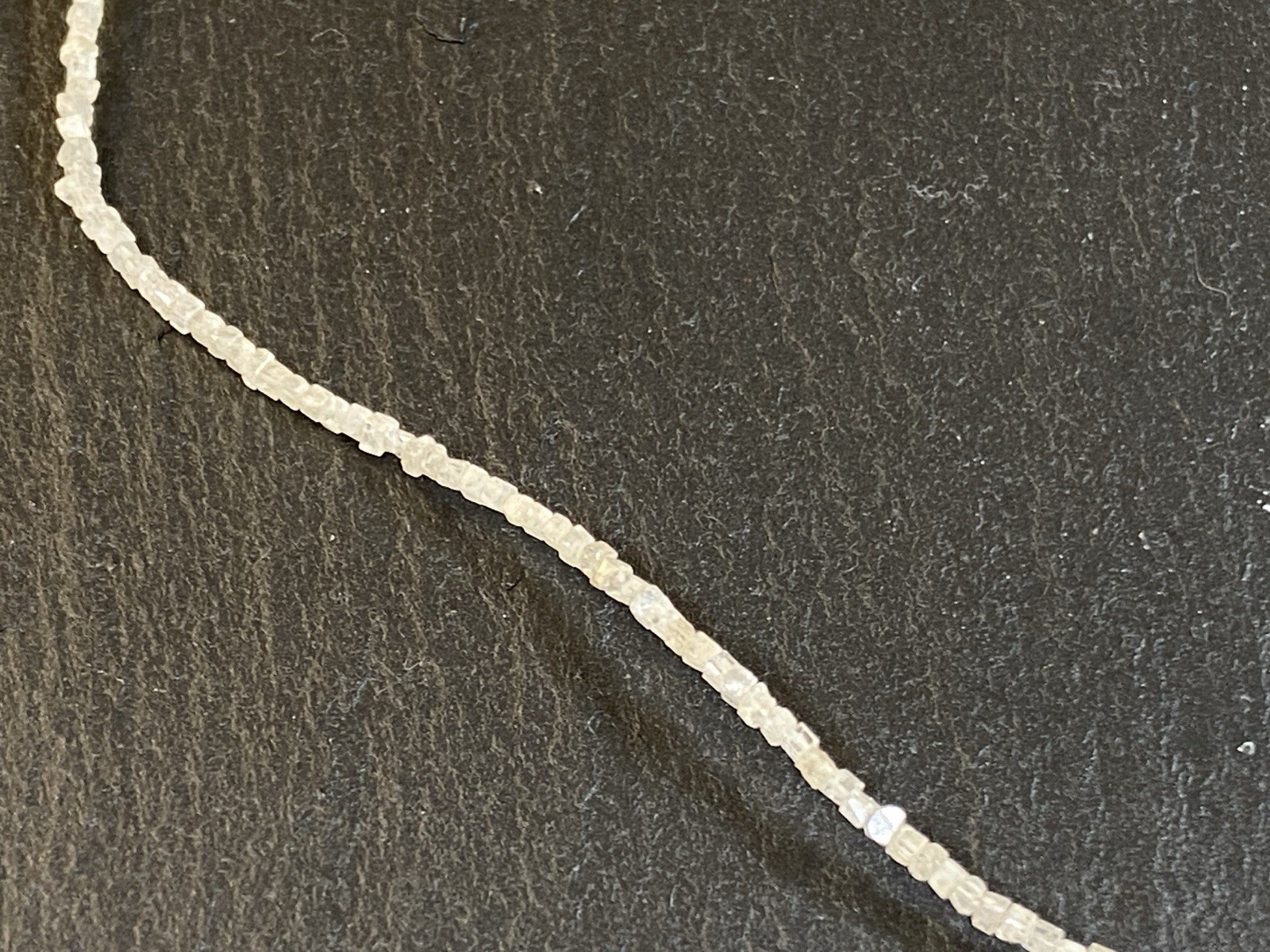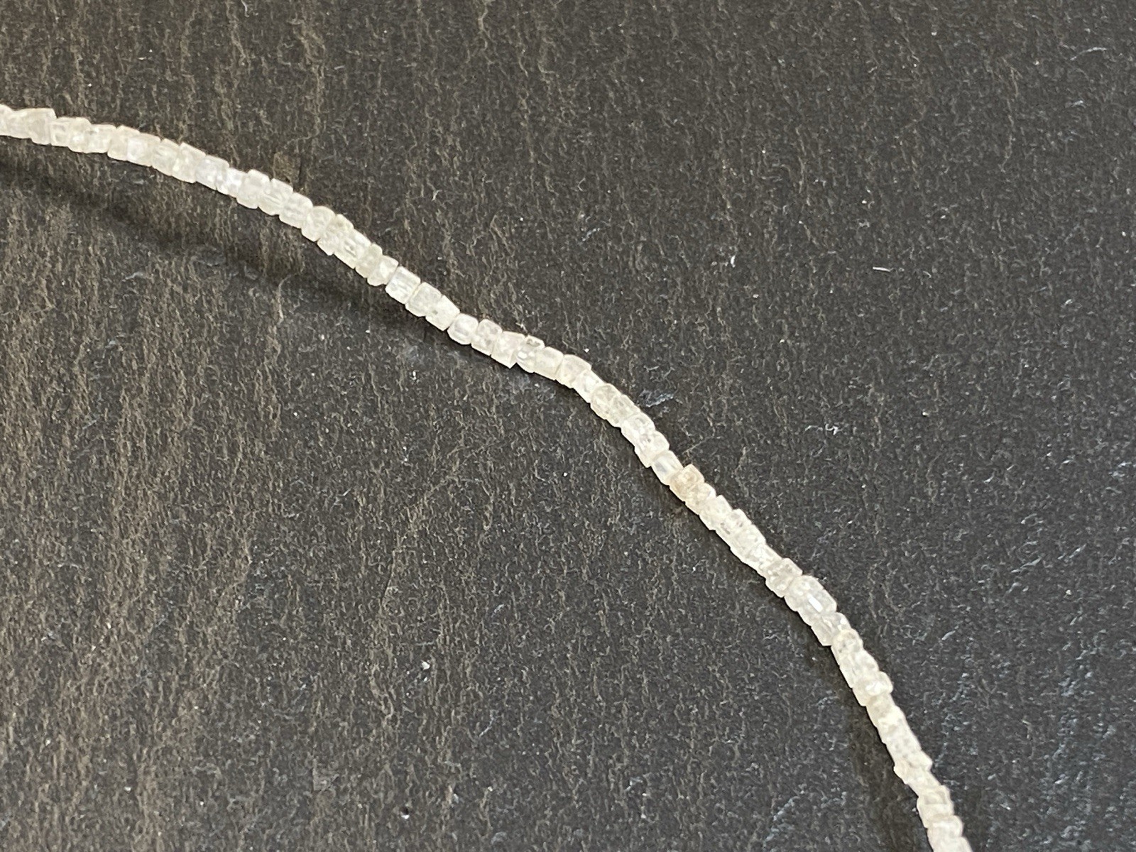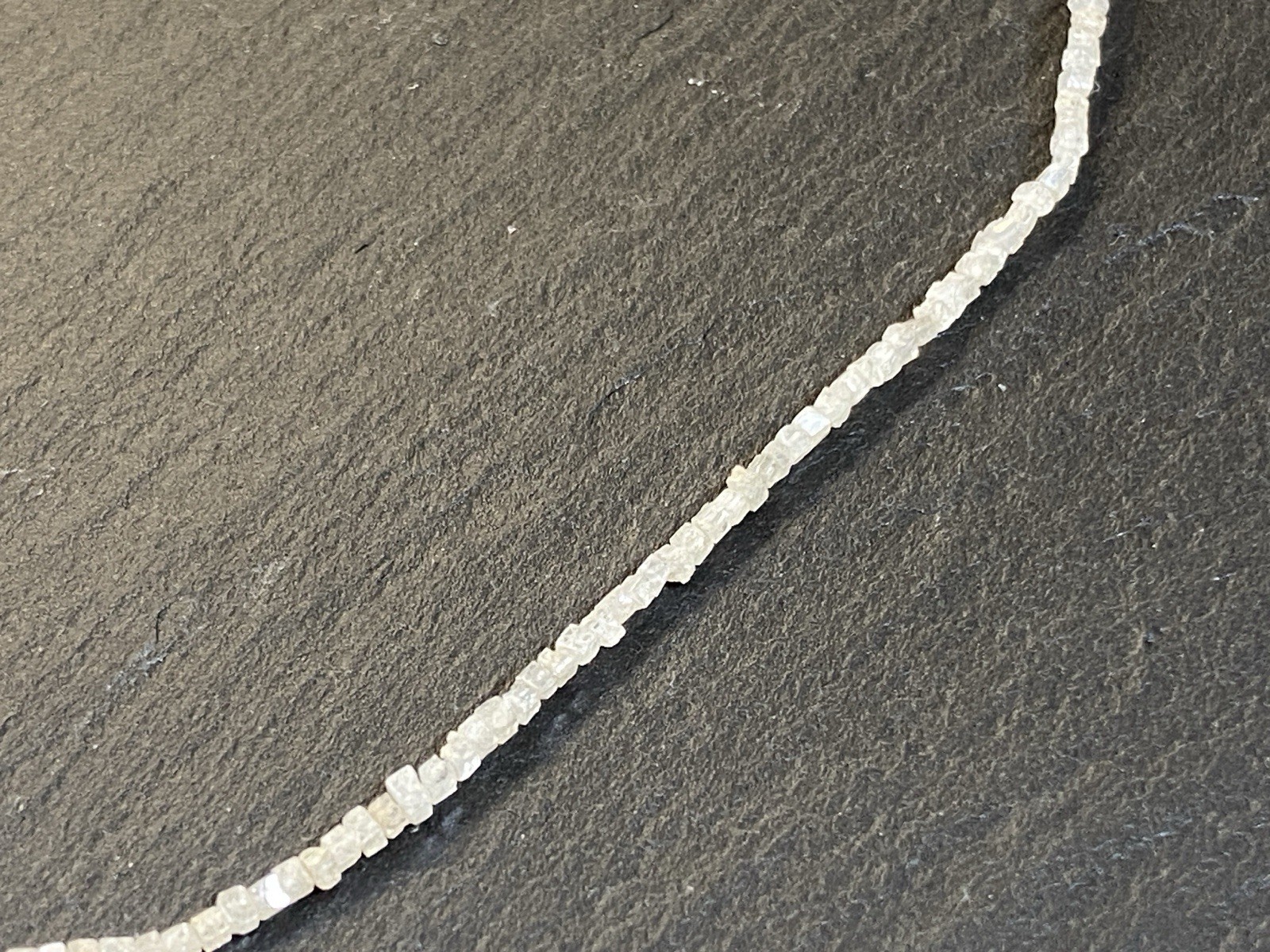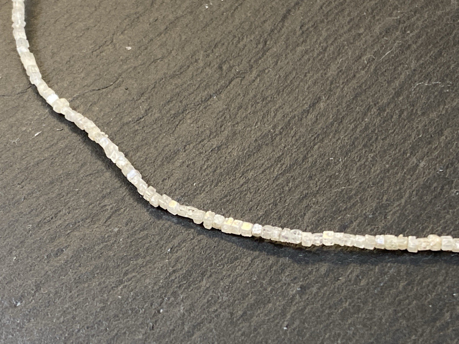Halskette aus rohen Diamantkristallen, der Verschluss ist mit S925 gestempelt. Sehr schöner Zustand. Gesamtlänge ca. 42,5cm, Breite 0,15-0,2cm, Gesamtgewicht ca. 3,18g. Die Begutachtung der Stücke wird vorgenommen von einem Fachmitglied der deutschen gemmologischen Gesellschaft E.V. Ein Schmuckpass wird mitgeliefert.