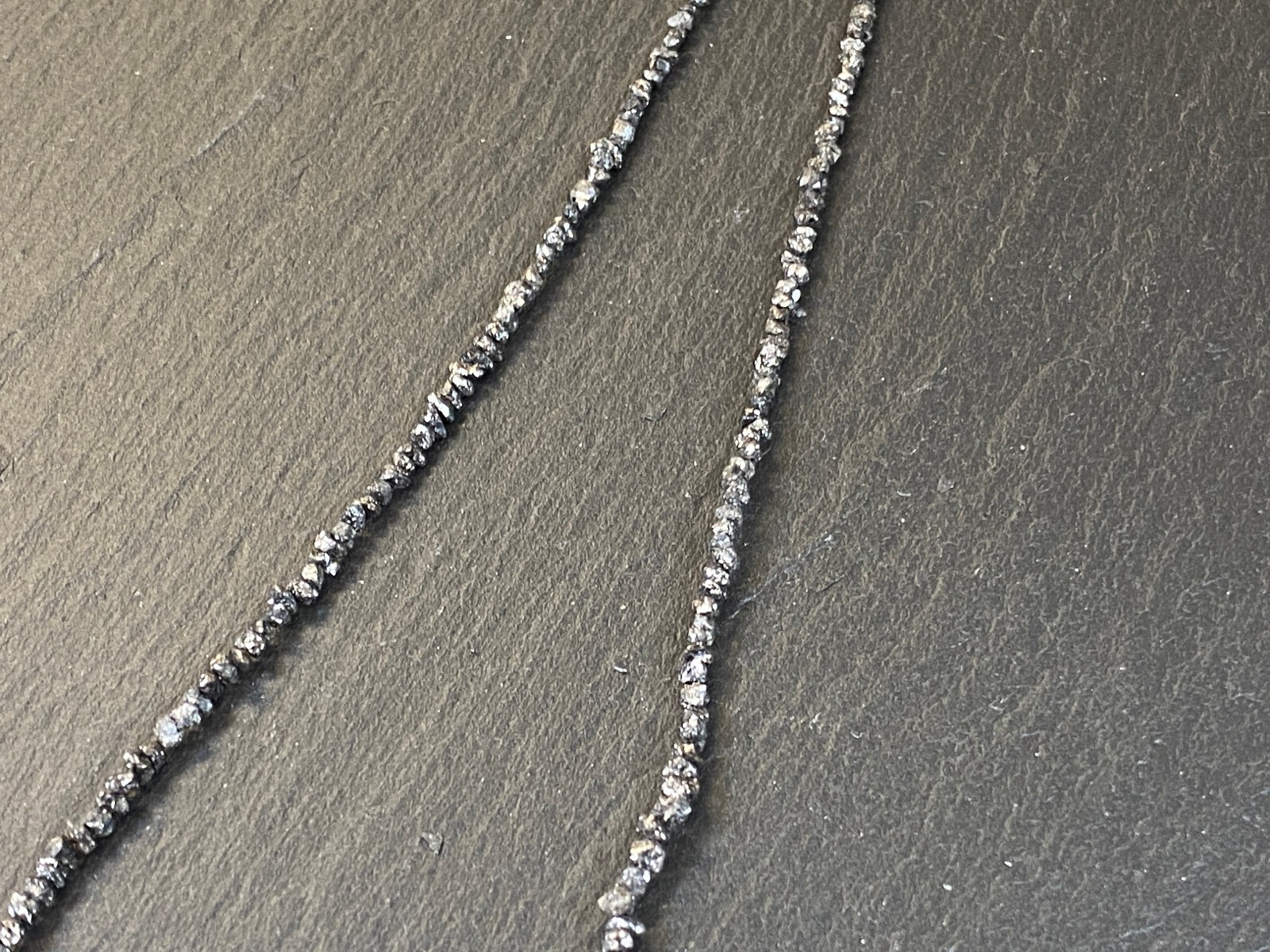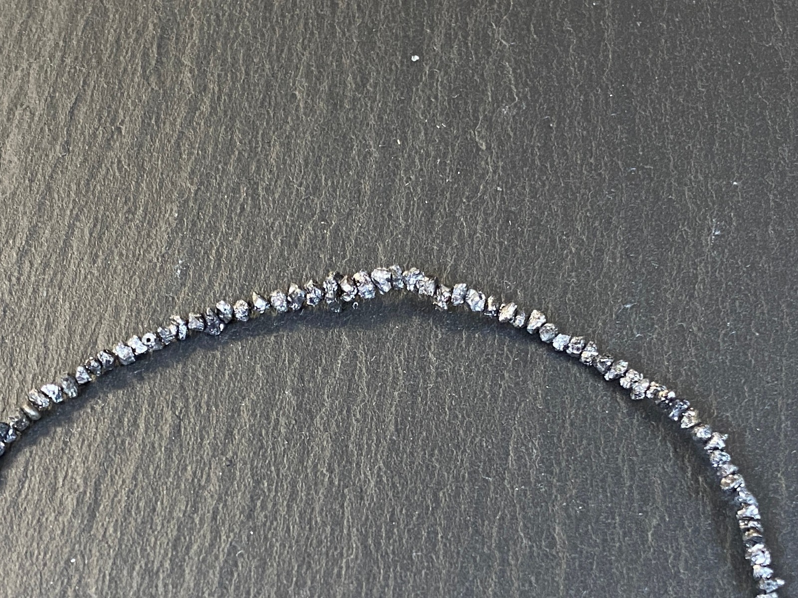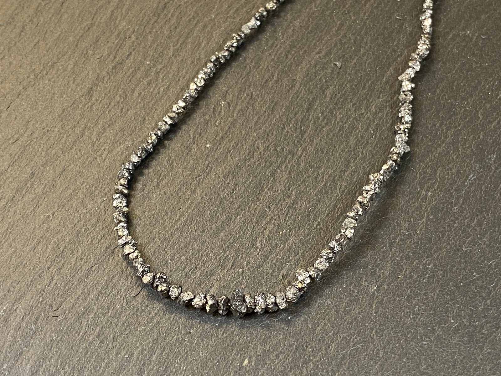 Halskette aus rohen Diamantkristallen, der Verschluss ist mit 585 gestempelt. Sehr schöner Zustand. Gesamtlänge ca. 47cm, Breite 0,25-0,3cm, Gesamtgewicht ca. 4,67g. Die Begutachtung der Stücke wird vorgenommen von einem Fachmitglied der deutschen gemmologischen Gesellschaft E.V