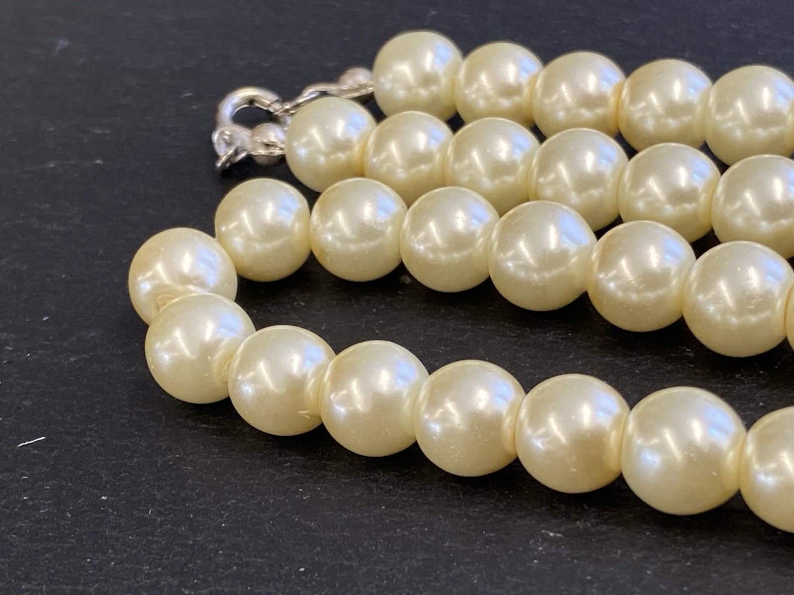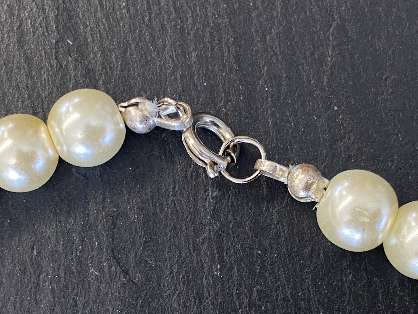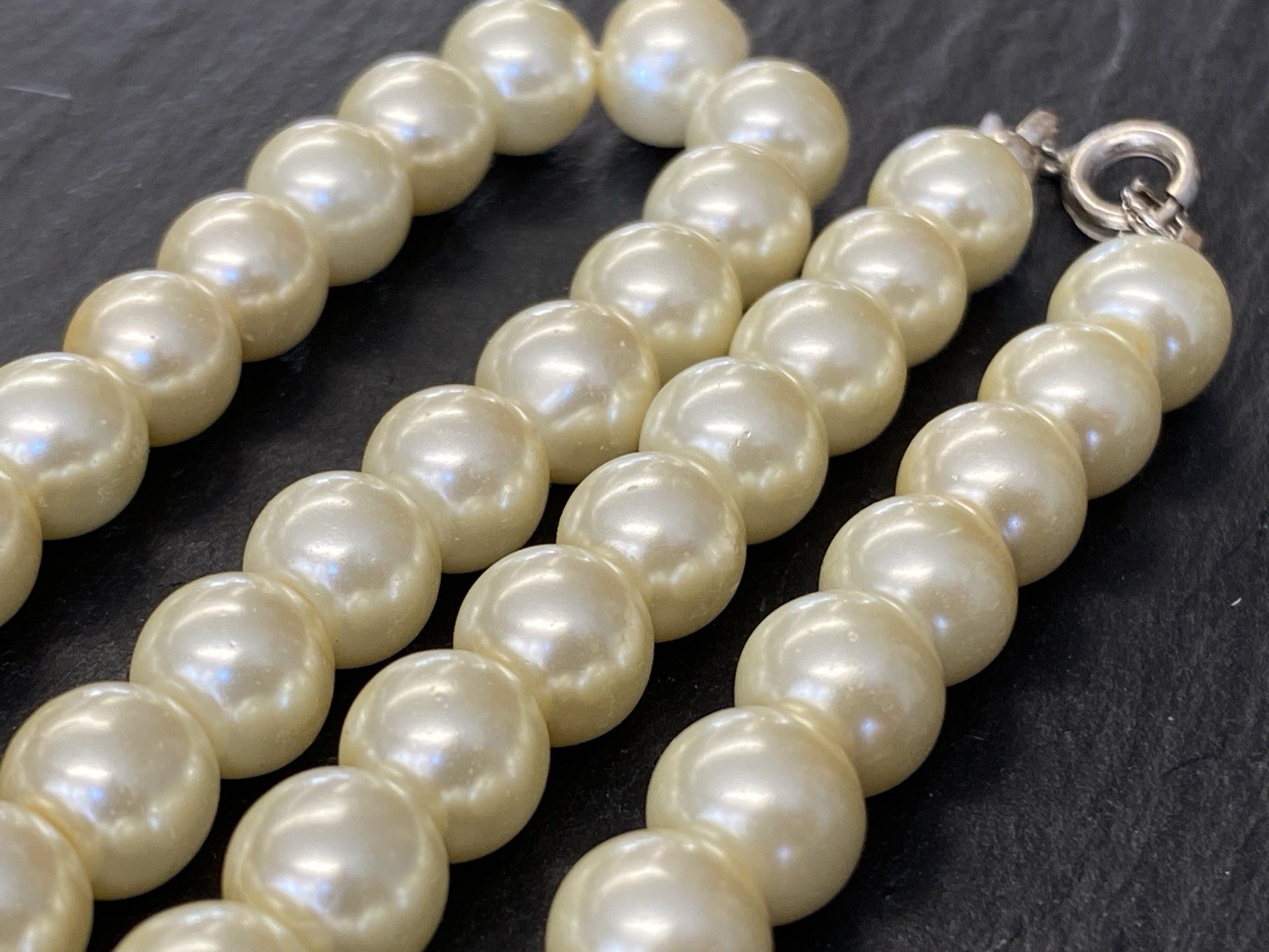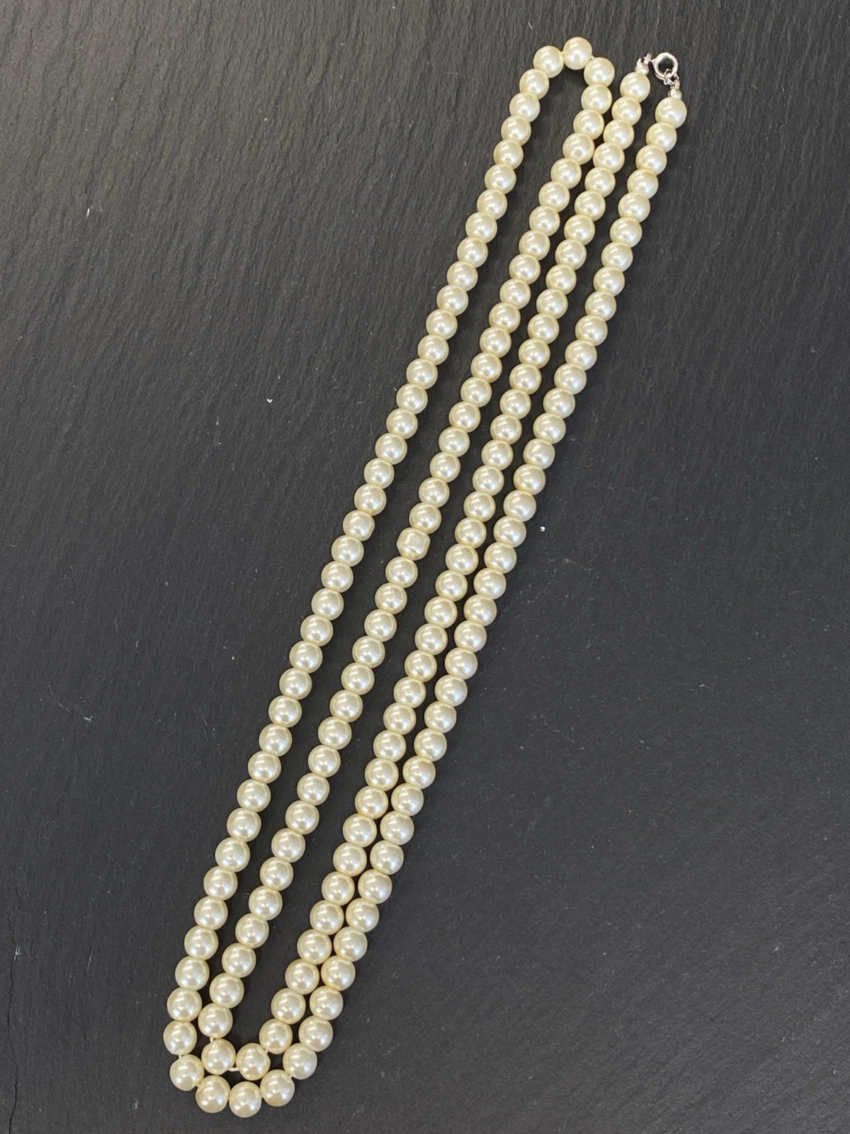Extra lange Halskette mit Kunstperlen, Verschluss wahrs. aus Metall. Durchmesser je Perle 0,8cm, an den Bohrlöchern starker Abrieb. An den Oberflächen Kratzer und Abplatzer möglich. Gesamtlänge 116cm, Gewicht ca. 102,7g.