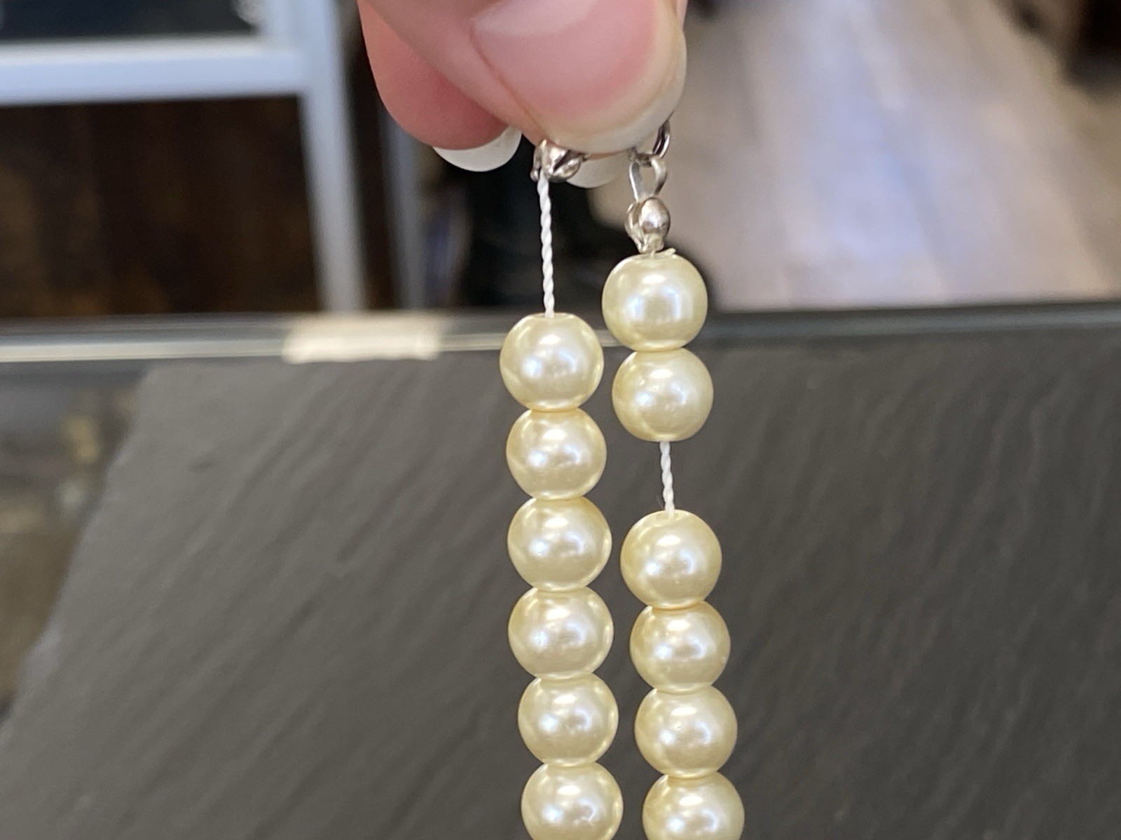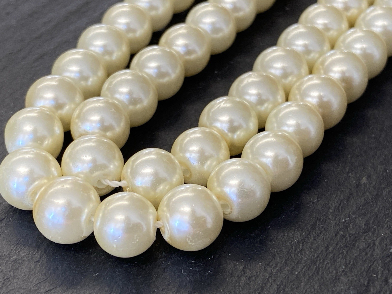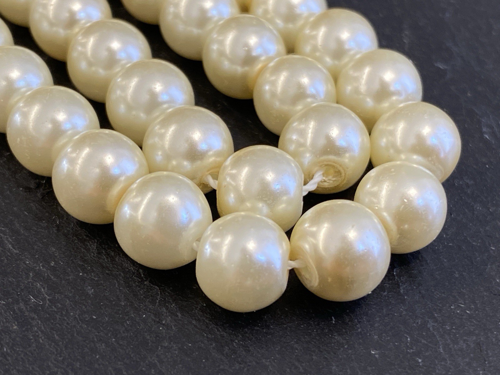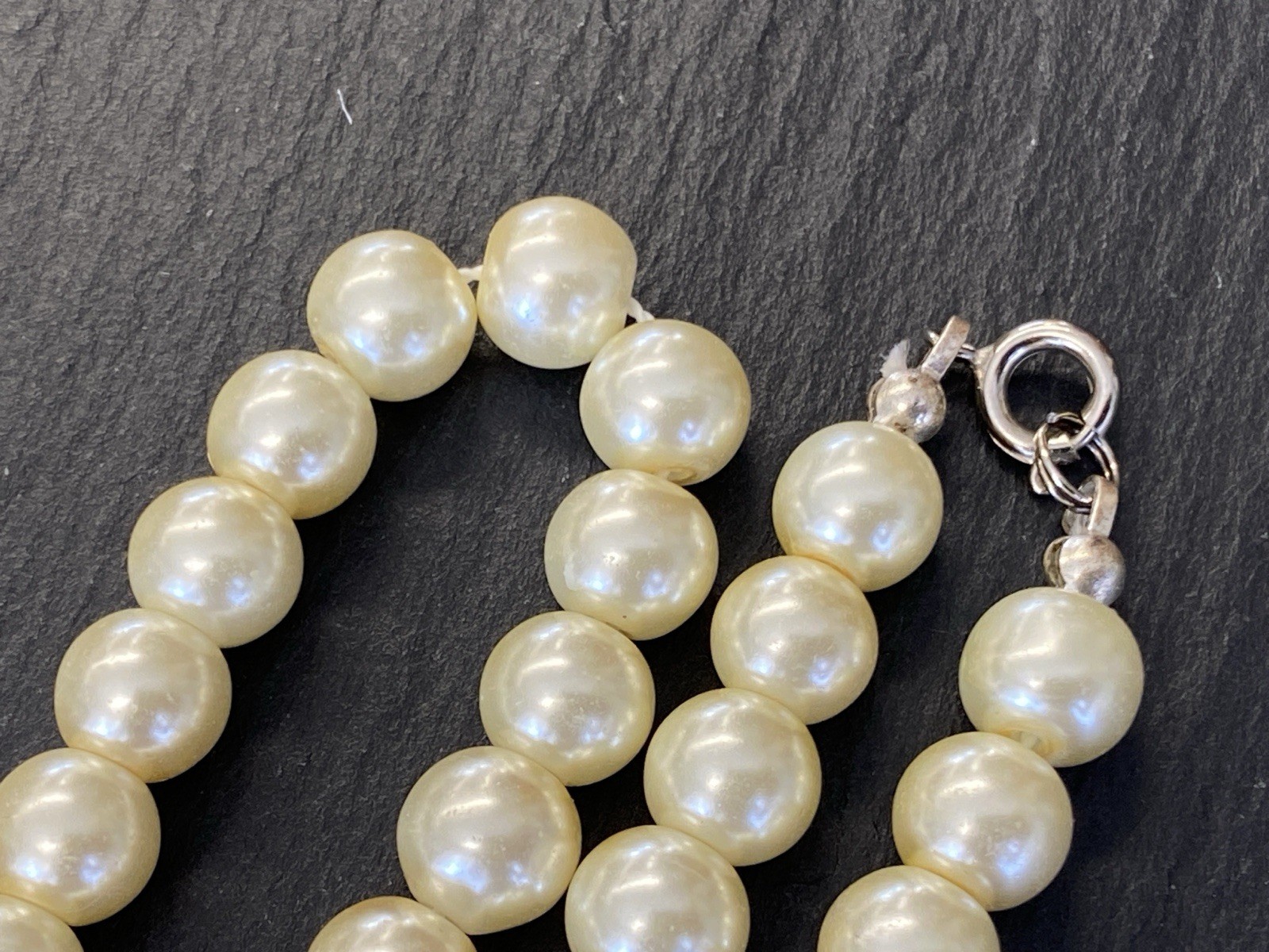 Extra lange Halskette mit Kunstperlen, Verschluss wahrs. aus Metall. Durchmesser je Perle 0,8cm, an den Bohrlöchern starker Abrieb. An den Oberflächen Kratzer und Abplatzer möglich. Gesamtlänge 116cm, Gewicht ca. 102,7g.
