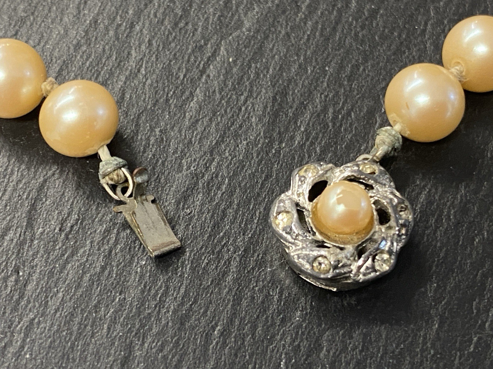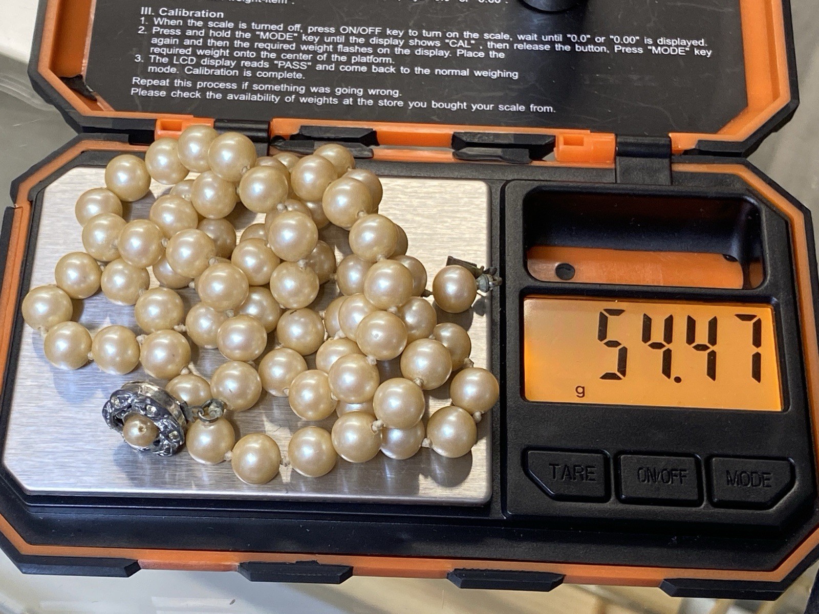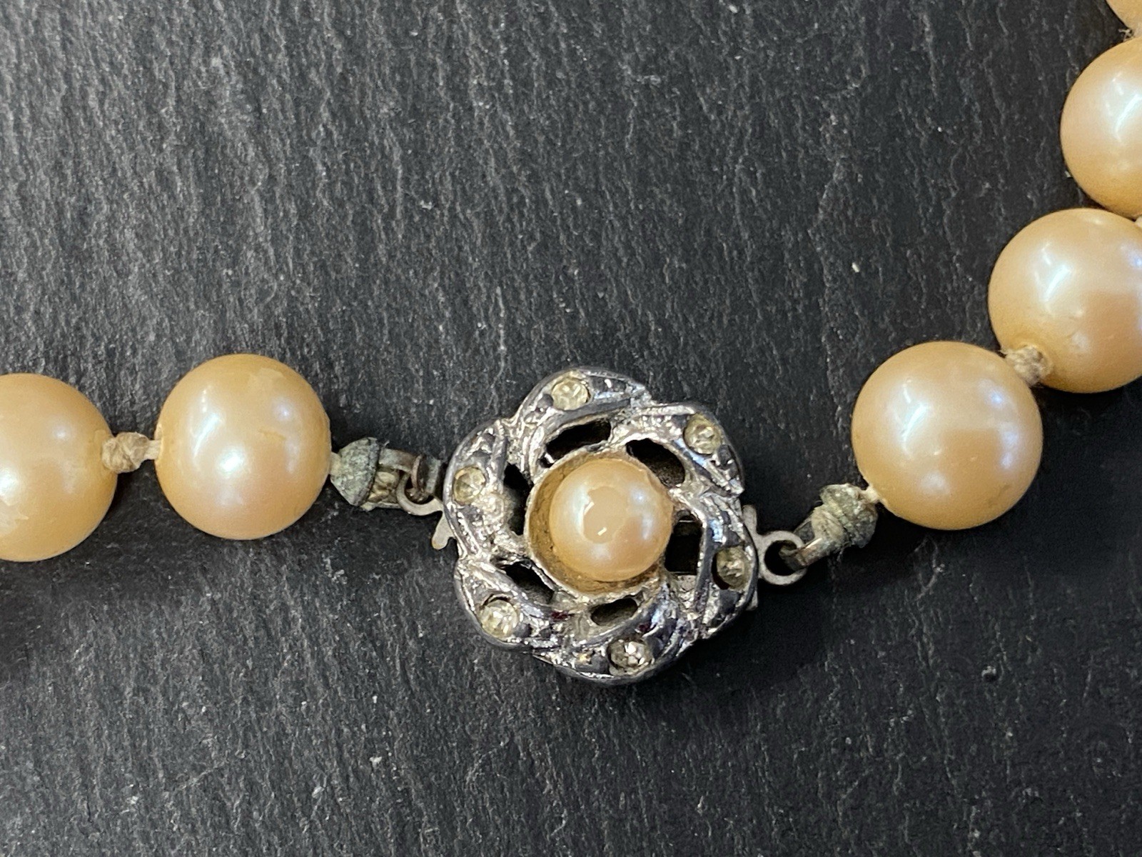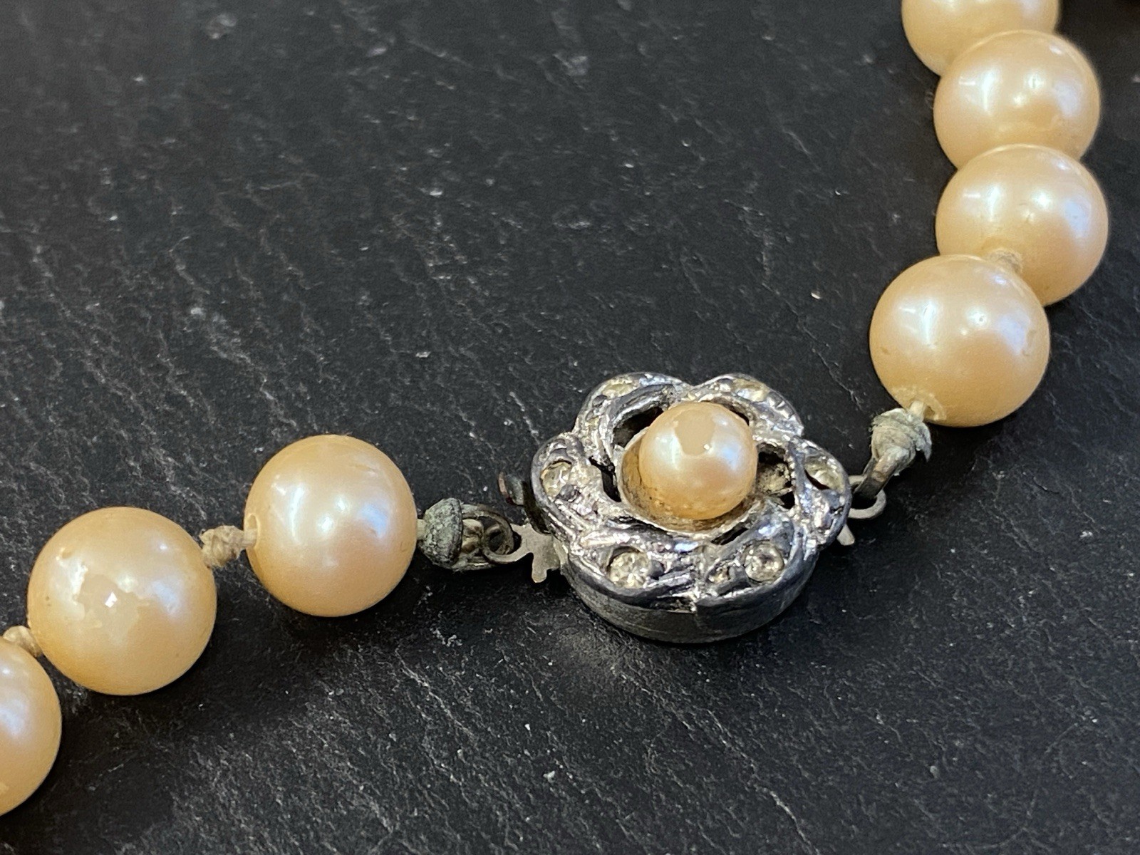 Perlenkette aus Zuchtperlen von je 0,8cm. Der Verschluss ist aus Metall und mit einer kleinen Perle von 0,5cm, die von Glas Steinen umgeben ist, versehen. Durchmesser/Höhe der Schließe 1,3/0,8cm, Länge der Kette 65cm, Gewicht ca. 54,47g.