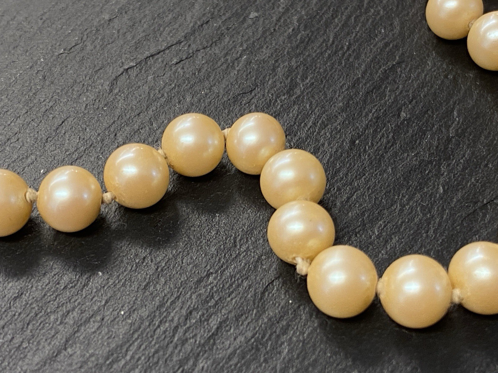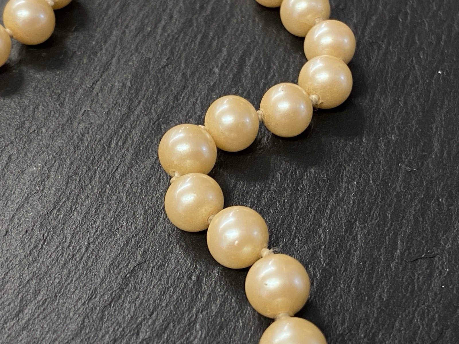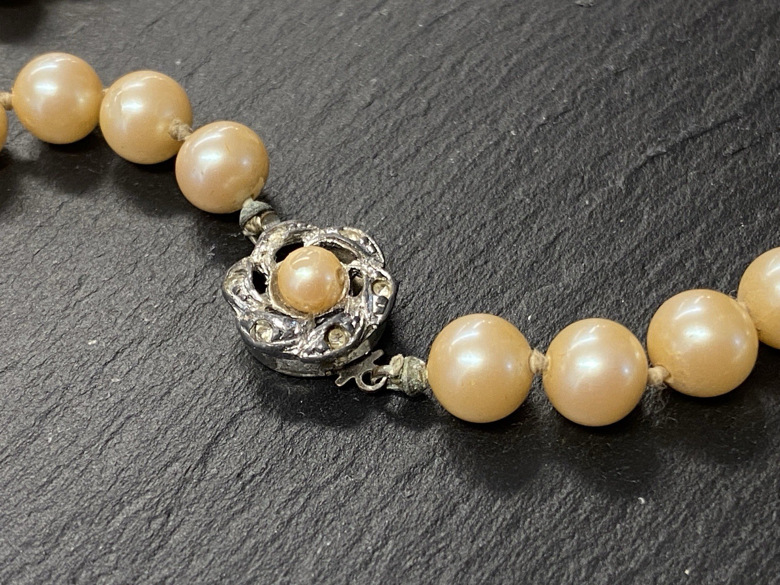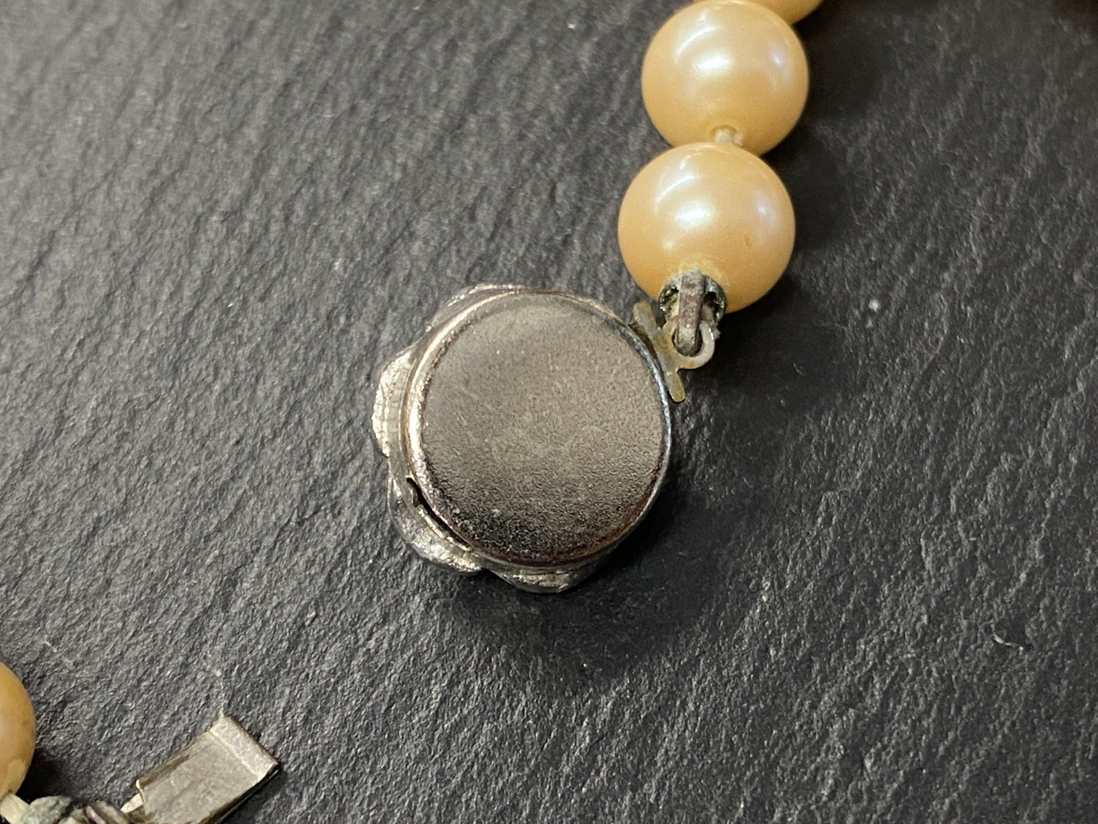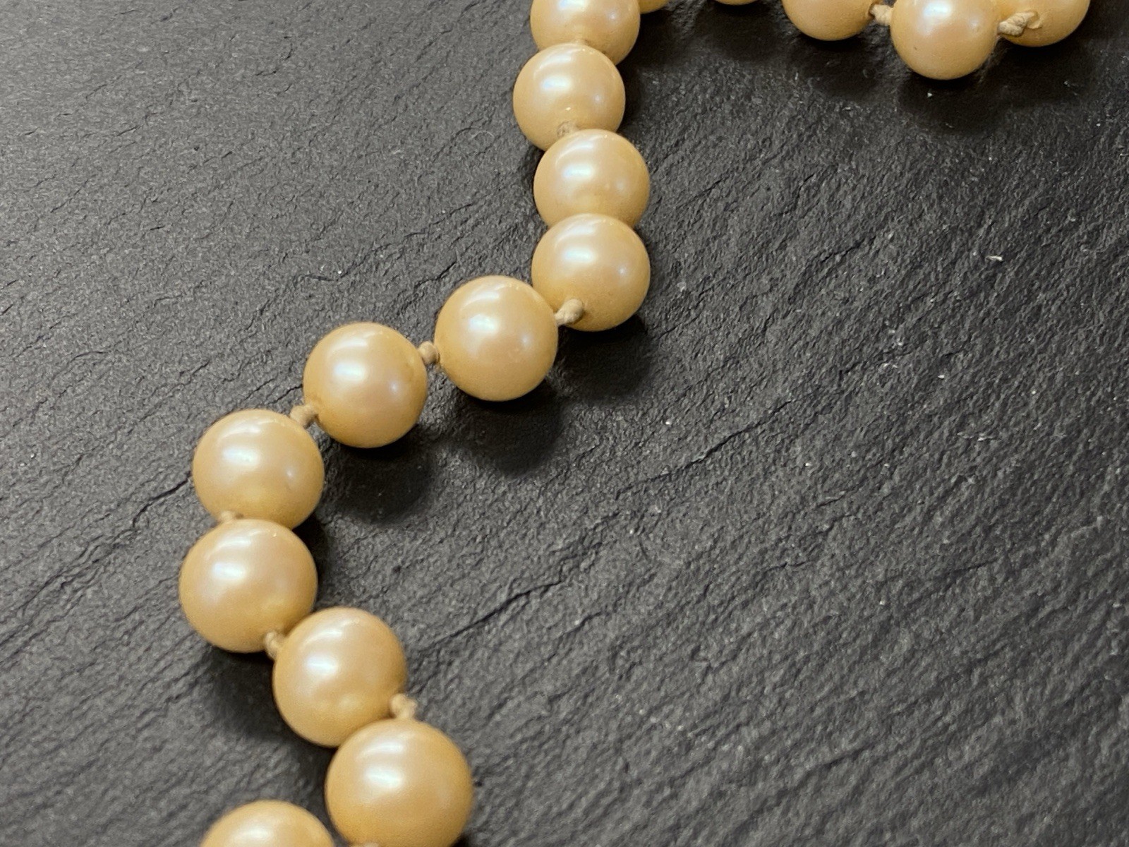 Perlenkette aus Zuchtperlen von je 0,8cm. Der Verschluss ist aus Metall und mit einer kleinen Perle von 0,5cm, die von Glas Steinen umgeben ist, versehen. Durchmesser/Höhe der Schließe 1,3/0,8cm, Länge der Kette 65cm, Gewicht ca. 54,47g.