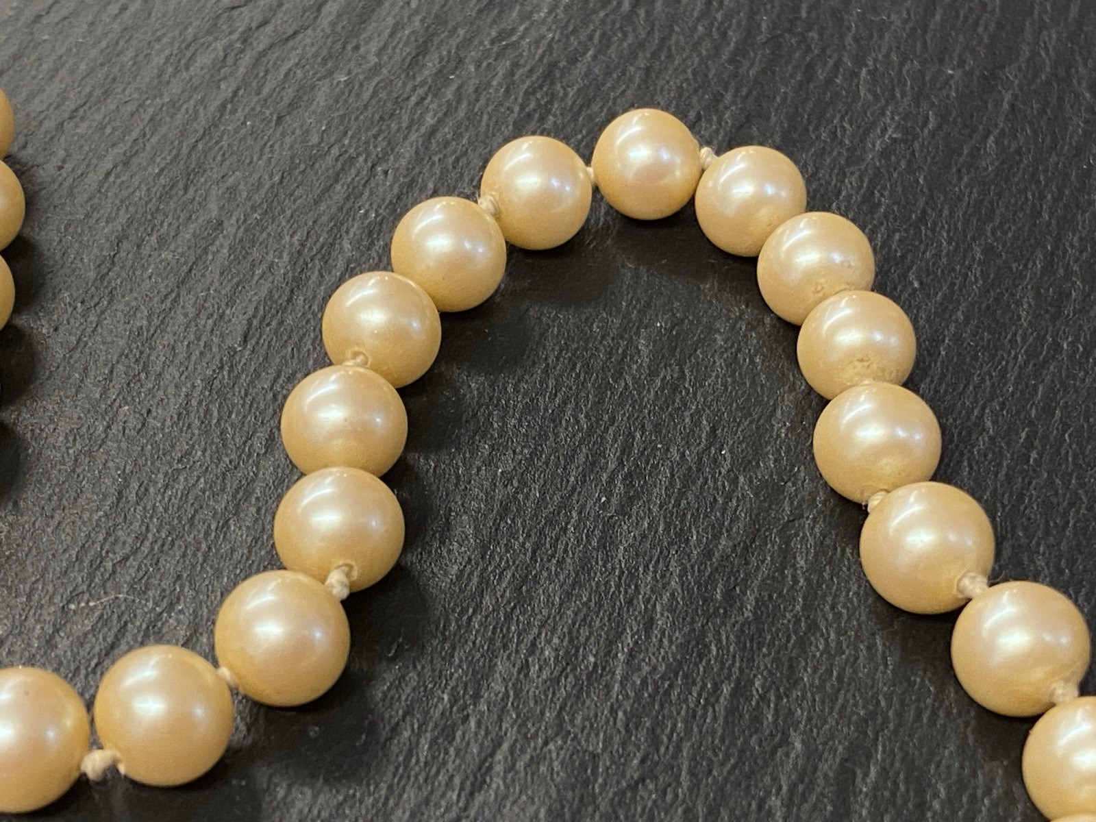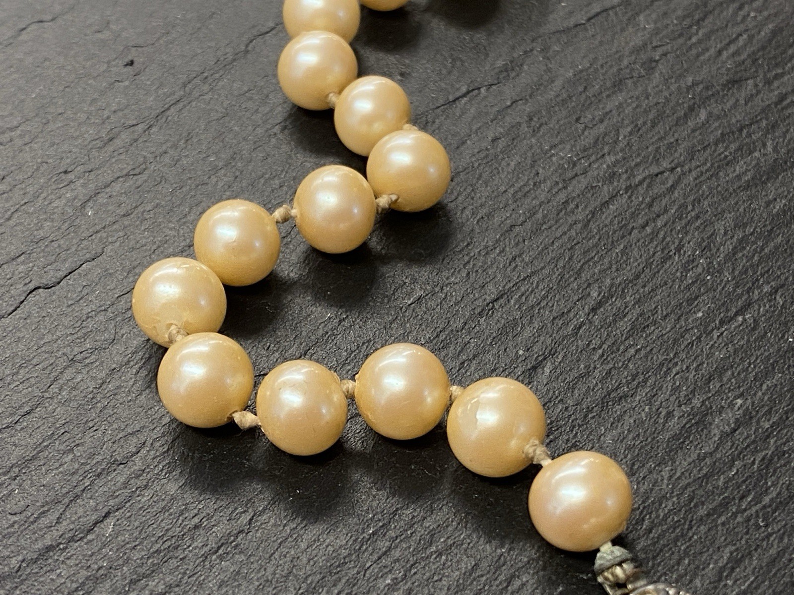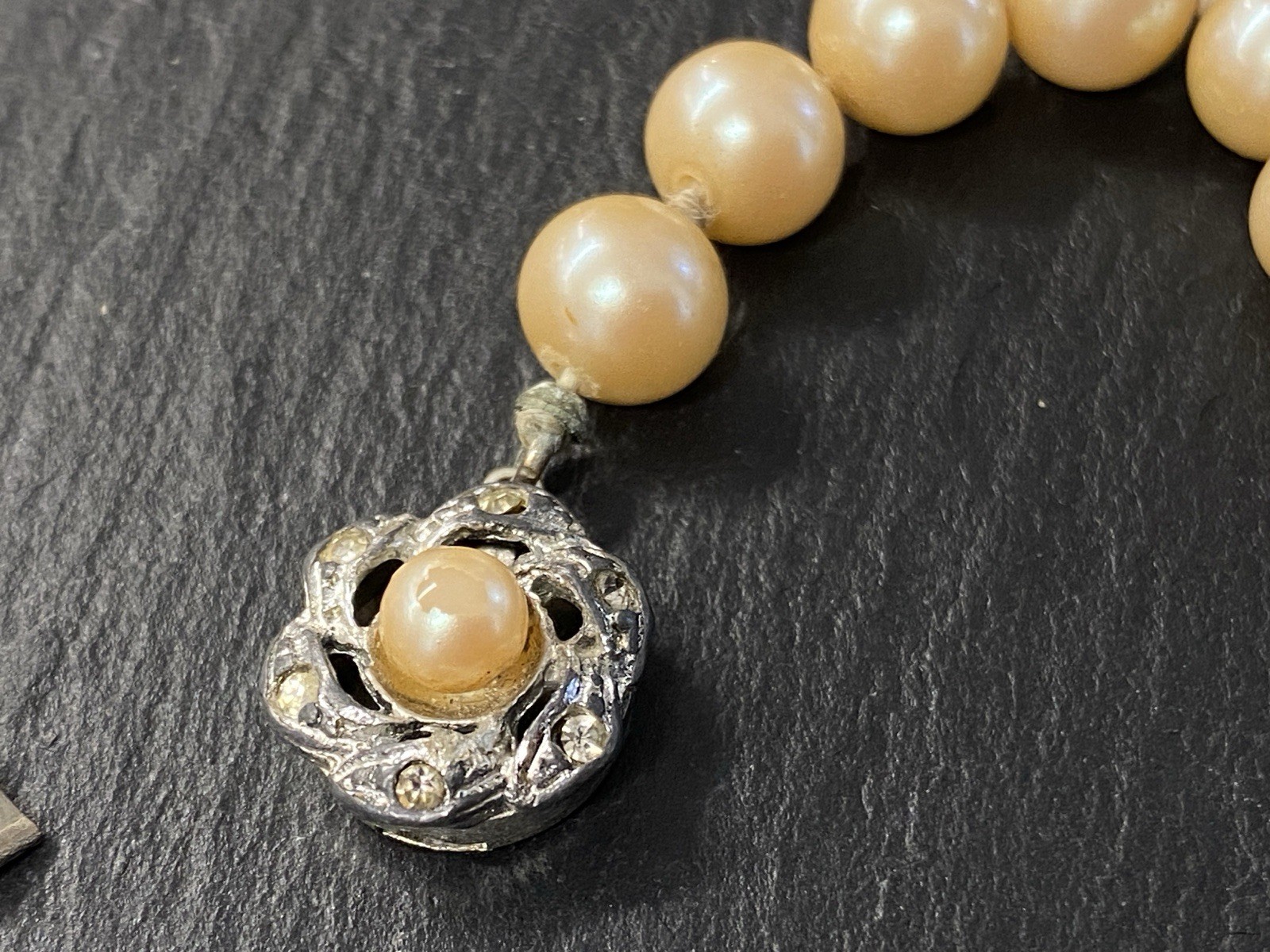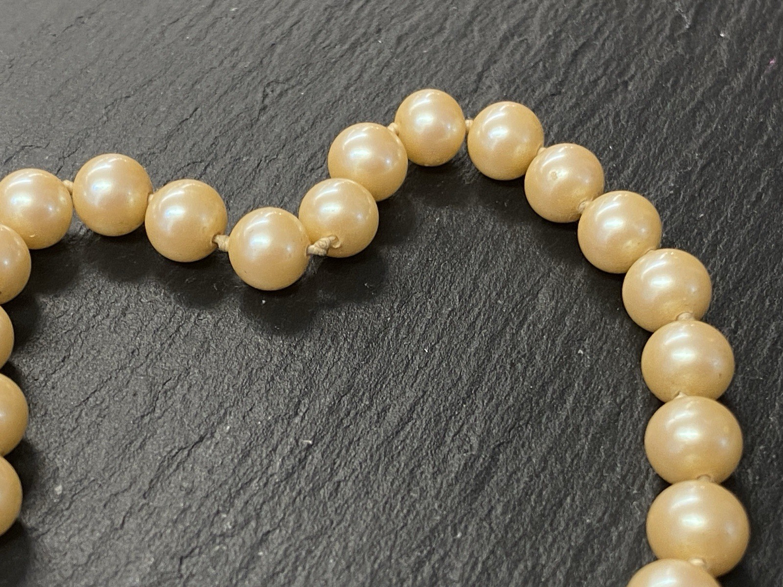 Perlenkette aus Zuchtperlen von je 0,8cm. Der Verschluss ist aus Metall und mit einer kleinen Perle von 0,5cm, die von Glas Steinen umgeben ist, versehen. Durchmesser/Höhe der Schließe 1,3/0,8cm, Länge der Kette 65cm, Gewicht ca. 54,47g.