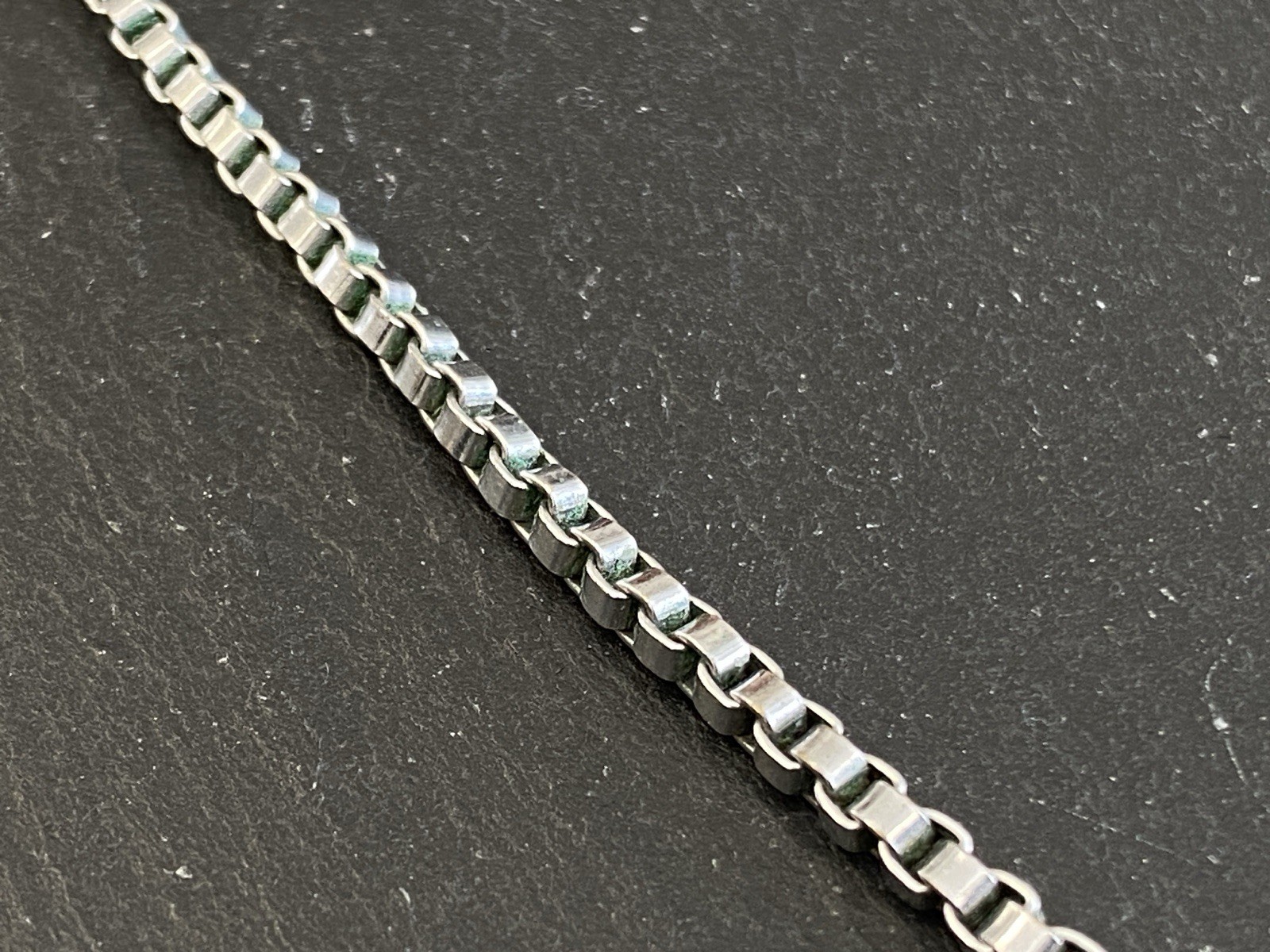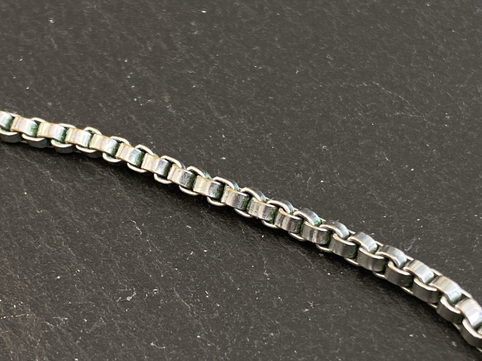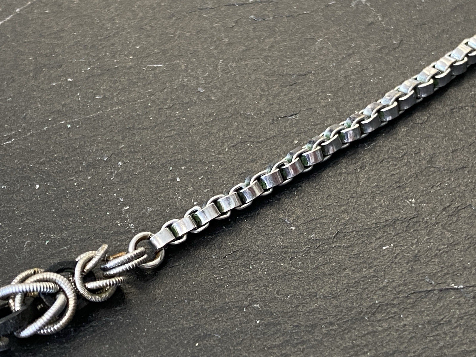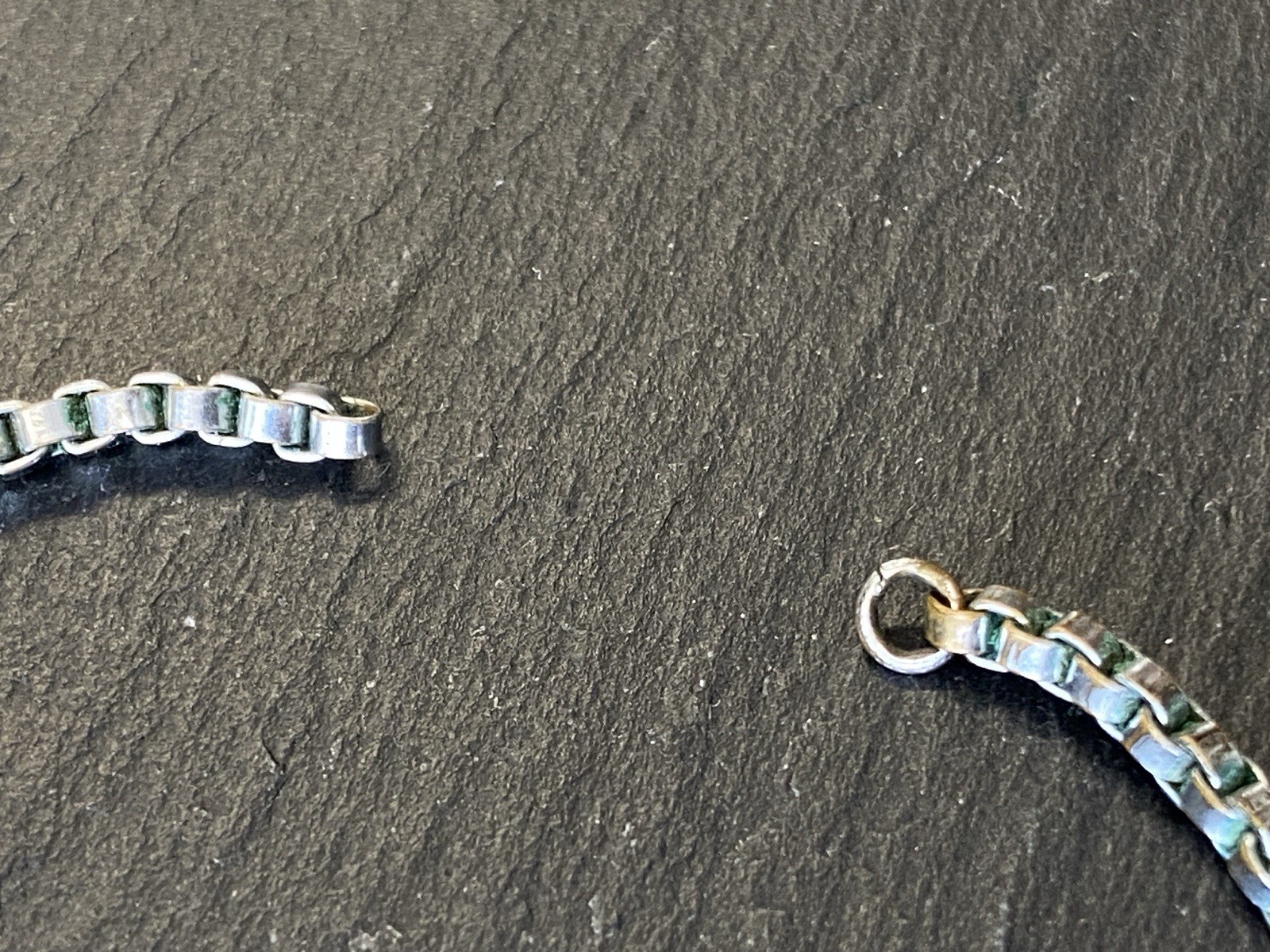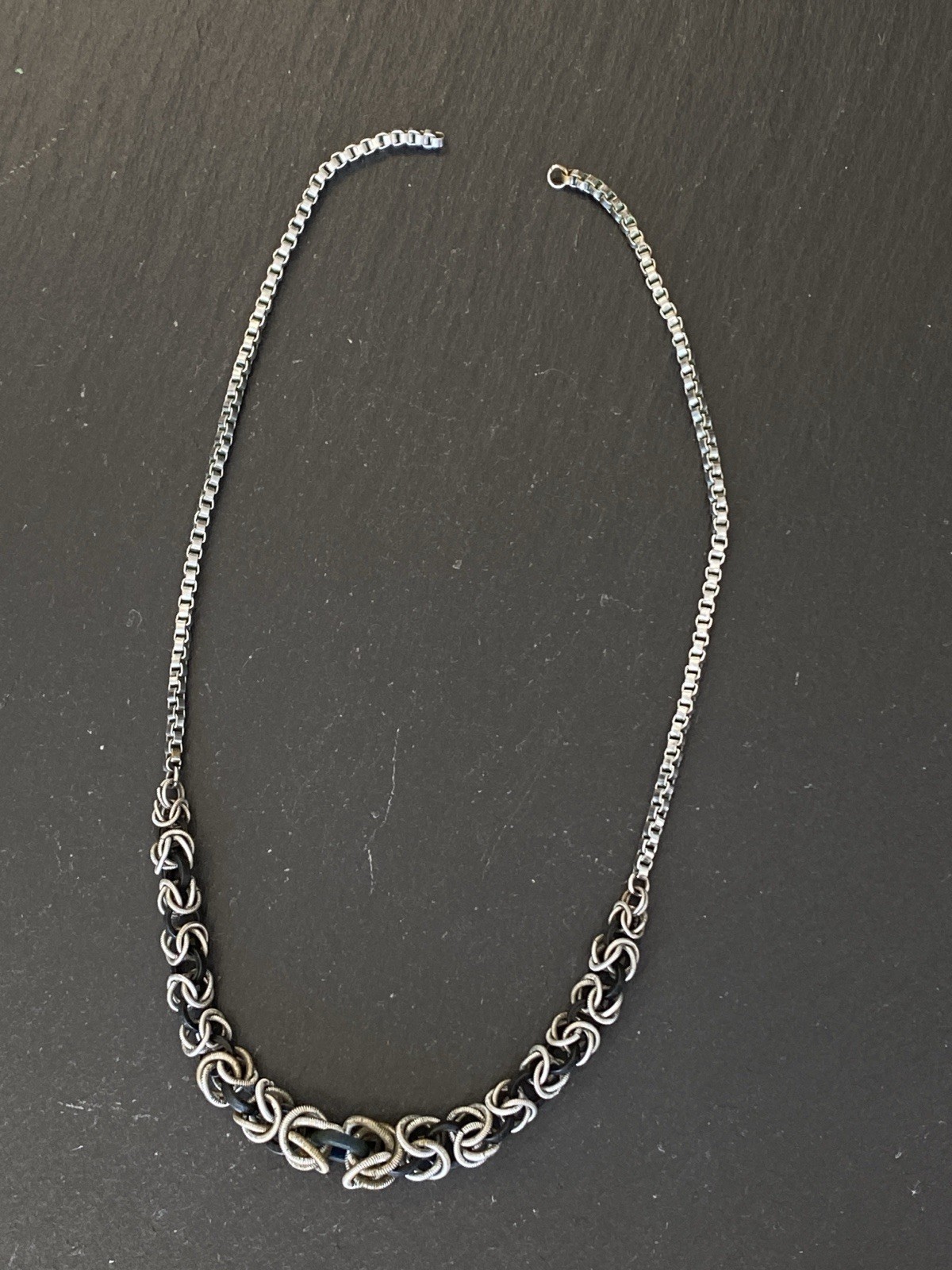 Dekorative Halskette aus wahrs. Silber, der Verschluss fehlt, dieser muss also nachträglich ersetzt werden. Die Kette ist in Erbsengliedern gearbeitet, das Mittelteil in verflochtenem Dekor. Die Oberfläche ist insgesamt angelaufen, starke Oxydation zwischen den Gliedern. Die Kette wurde im einfachen Ultraschallbad gereinigt, sie benötigt jedoch eine hartnäckigere Reinigung. Gesamtlänge 43cm, B/H der Erbsenglieder 0,26/0,26cm, B/H des Mittelteils0,7/0,7cm, Gesamtgewicht ca. 18,94g.