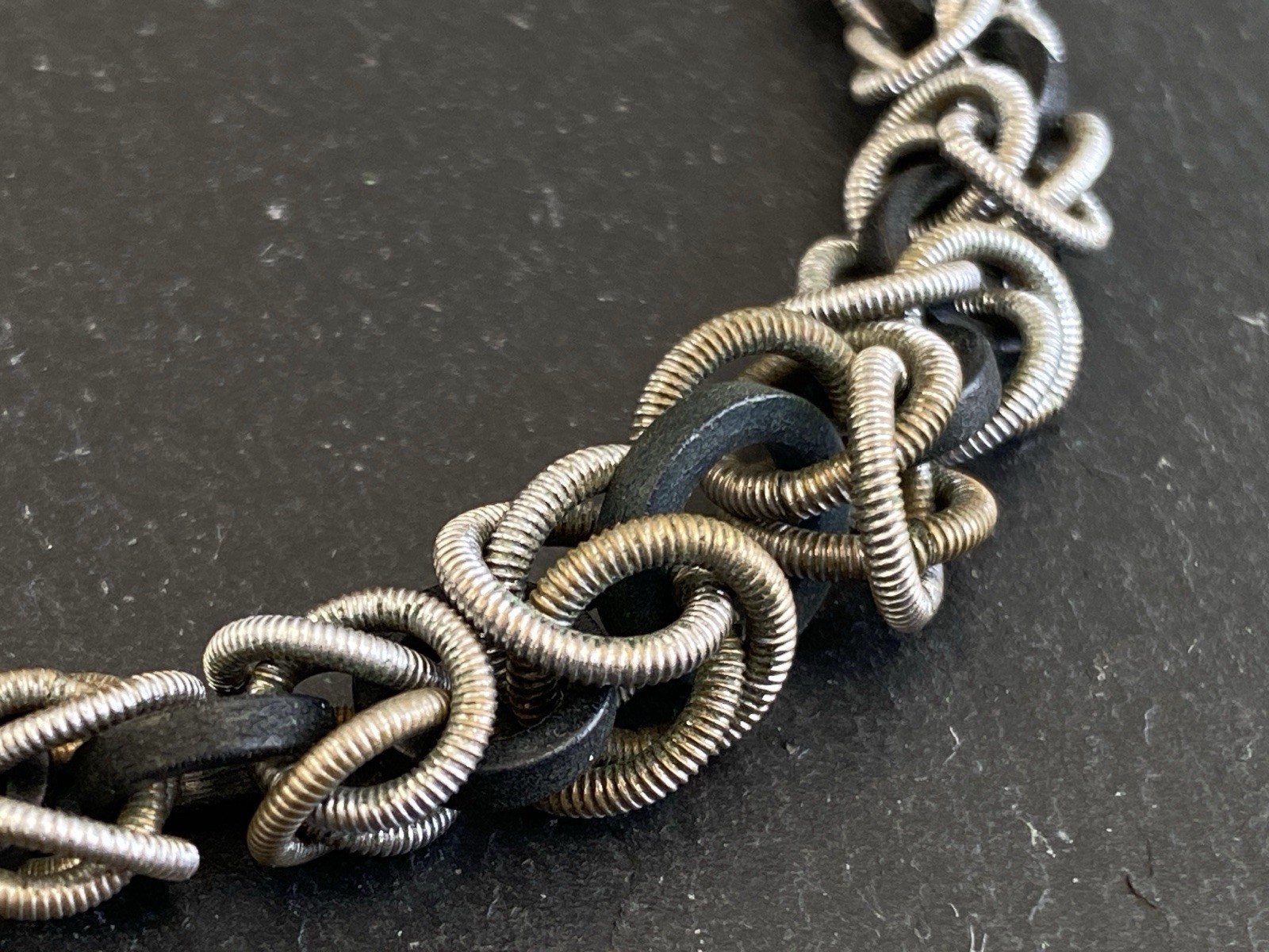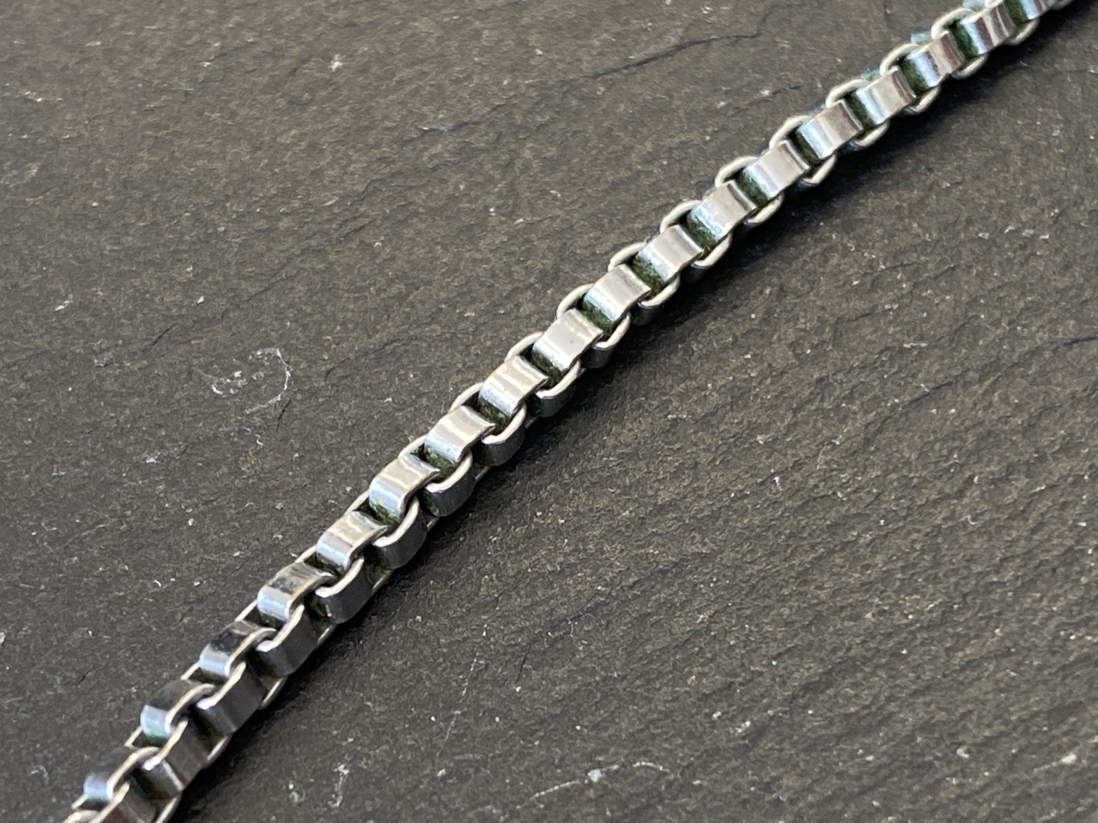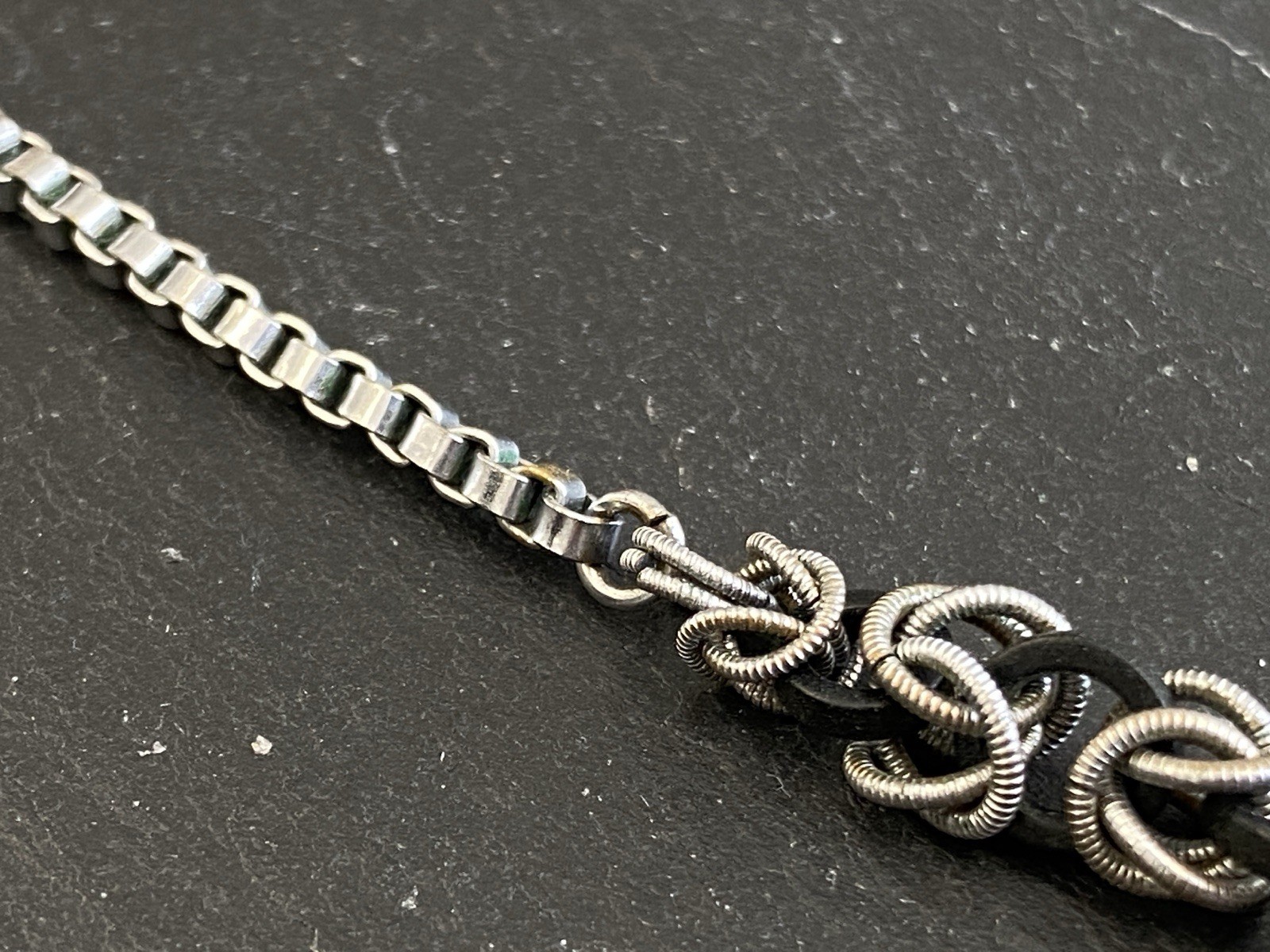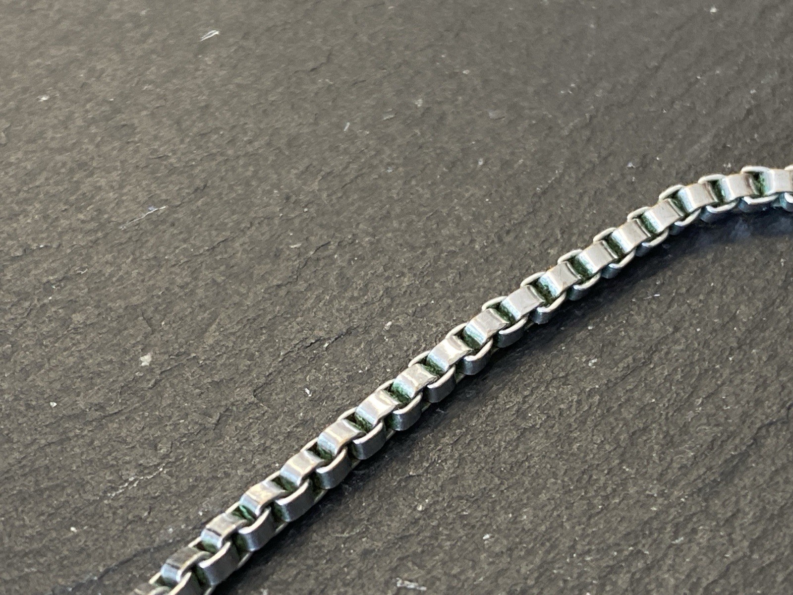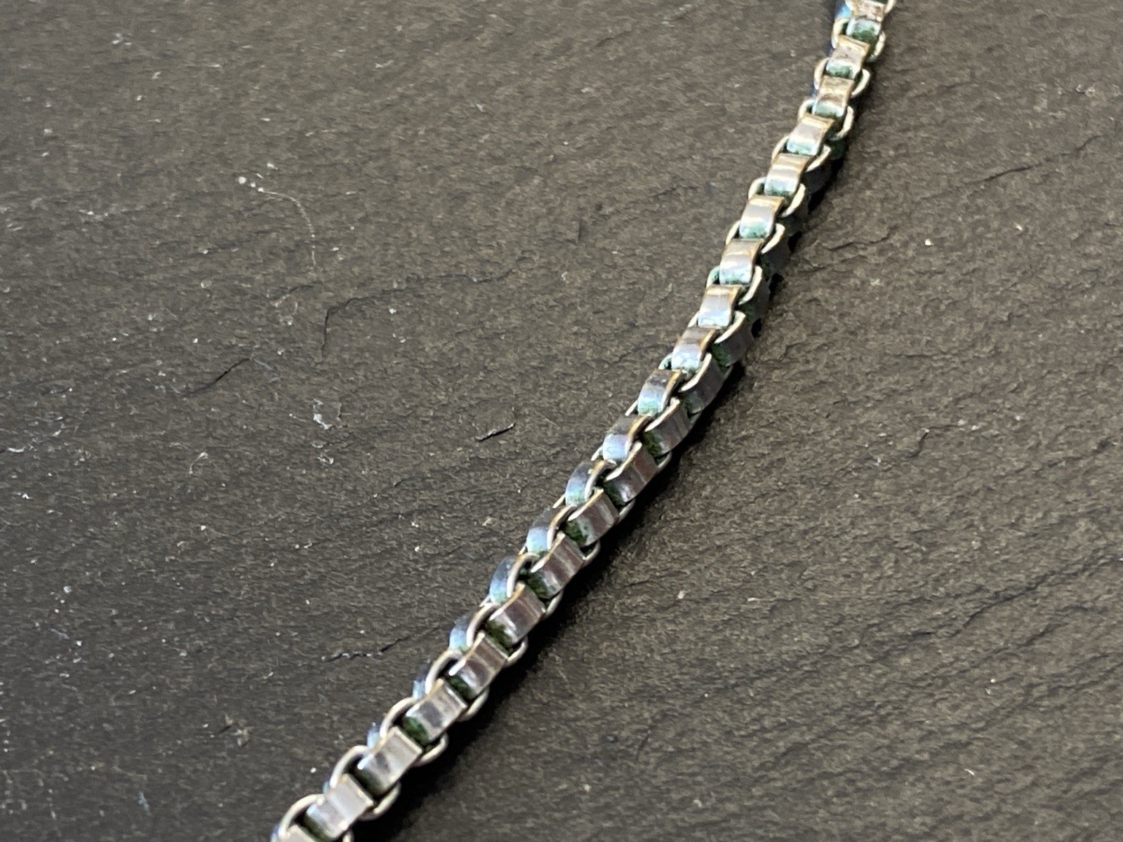 Dekorative Halskette aus wahrs. Silber, der Verschluss fehlt, dieser muss also nachträglich ersetzt werden. Die Kette ist in Erbsengliedern gearbeitet, das Mittelteil in verflochtenem Dekor. Die Oberfläche ist insgesamt angelaufen, starke Oxydation zwischen den Gliedern. Die Kette wurde im einfachen Ultraschallbad gereinigt, sie benötigt jedoch eine hartnäckigere Reinigung. Gesamtlänge 43cm, B/H der Erbsenglieder 0,26/0,26cm, B/H des Mittelteils0,7/0,7cm, Gesamtgewicht ca. 18,94g.