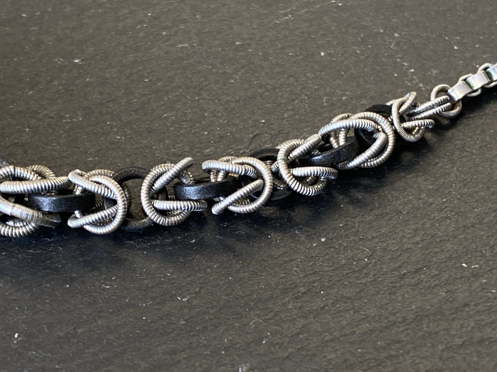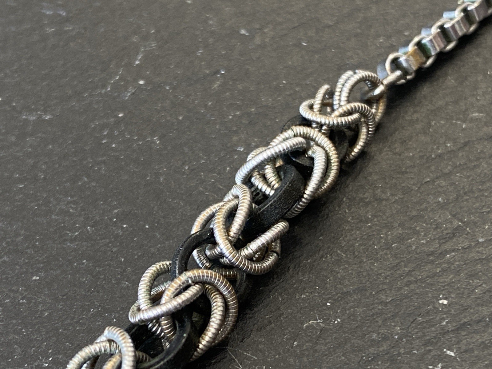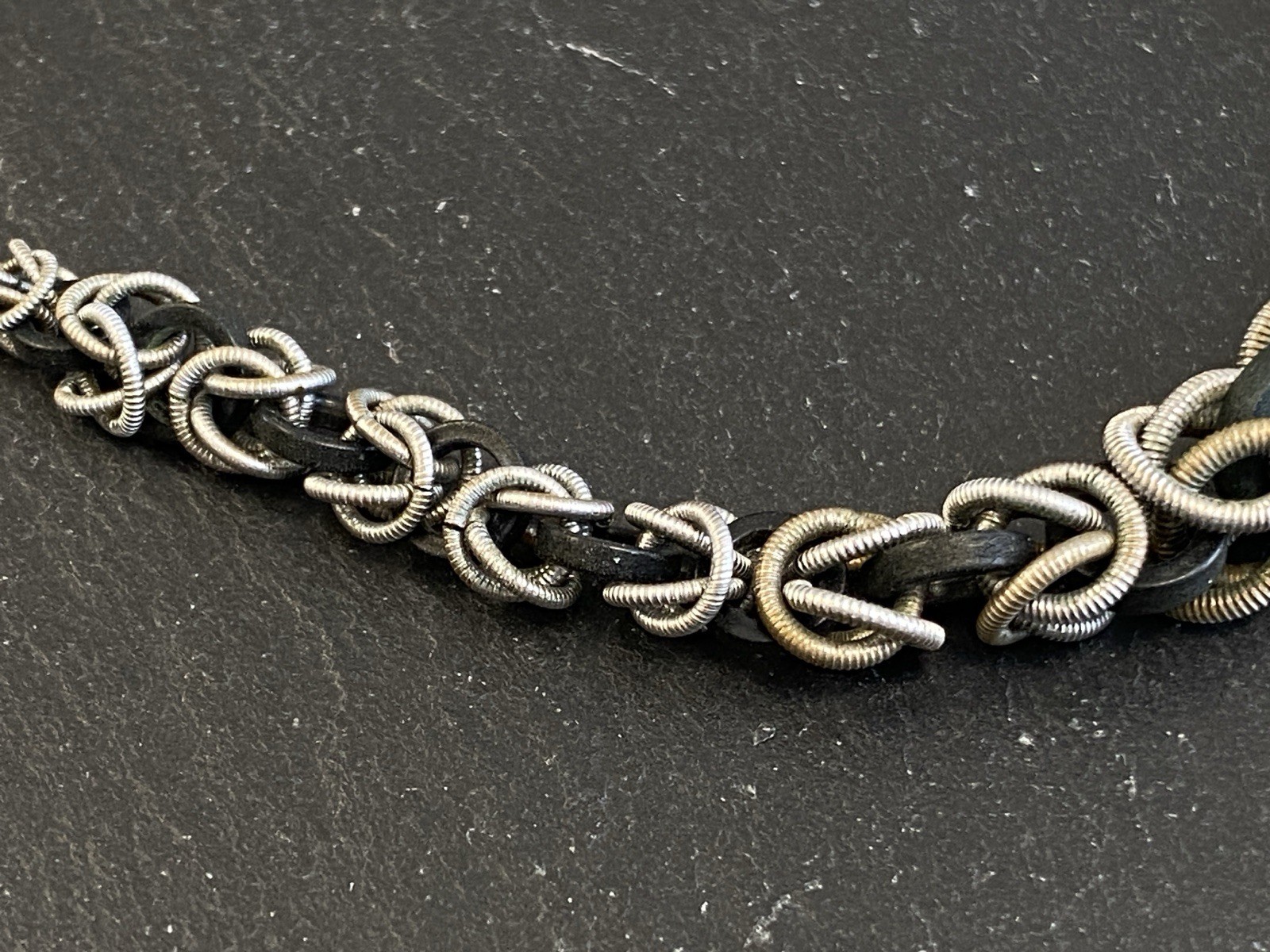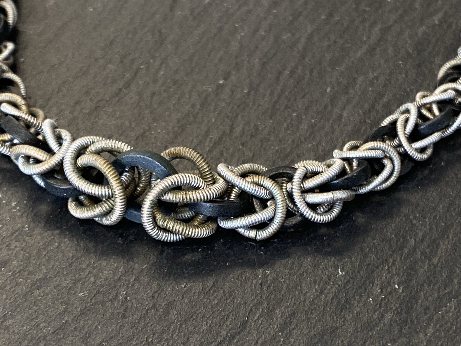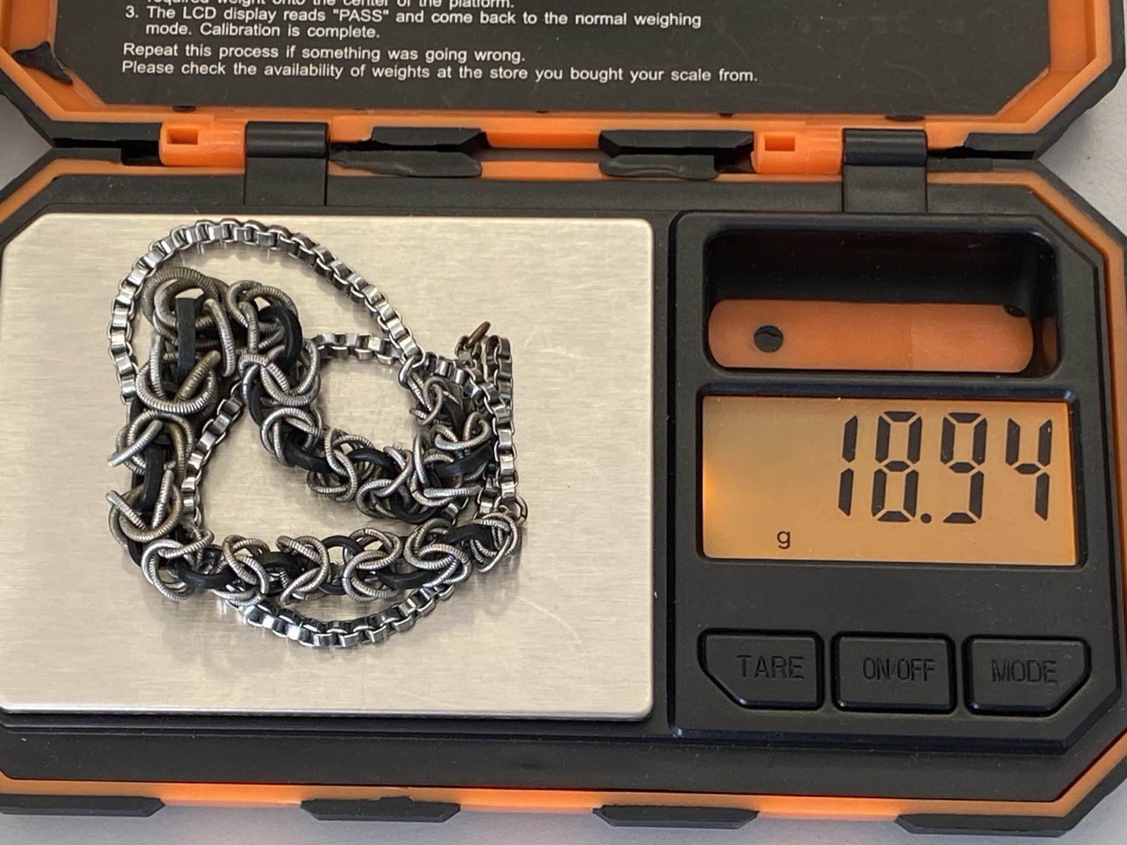 Dekorative Halskette aus wahrs. Silber, der Verschluss fehlt, dieser muss also nachträglich ersetzt werden. Die Kette ist in Erbsengliedern gearbeitet, das Mittelteil in verflochtenem Dekor. Die Oberfläche ist insgesamt angelaufen, starke Oxydation zwischen den Gliedern. Die Kette wurde im einfachen Ultraschallbad gereinigt, sie benötigt jedoch eine hartnäckigere Reinigung. Gesamtlänge 43cm, B/H der Erbsenglieder 0,26/0,26cm, B/H des Mittelteils0,7/0,7cm, Gesamtgewicht ca. 18,94g.