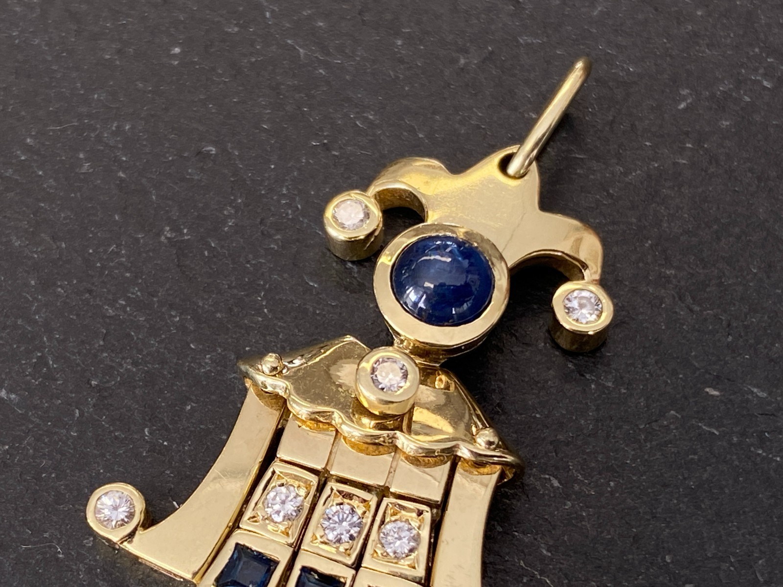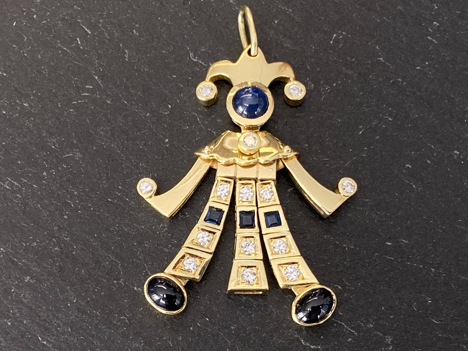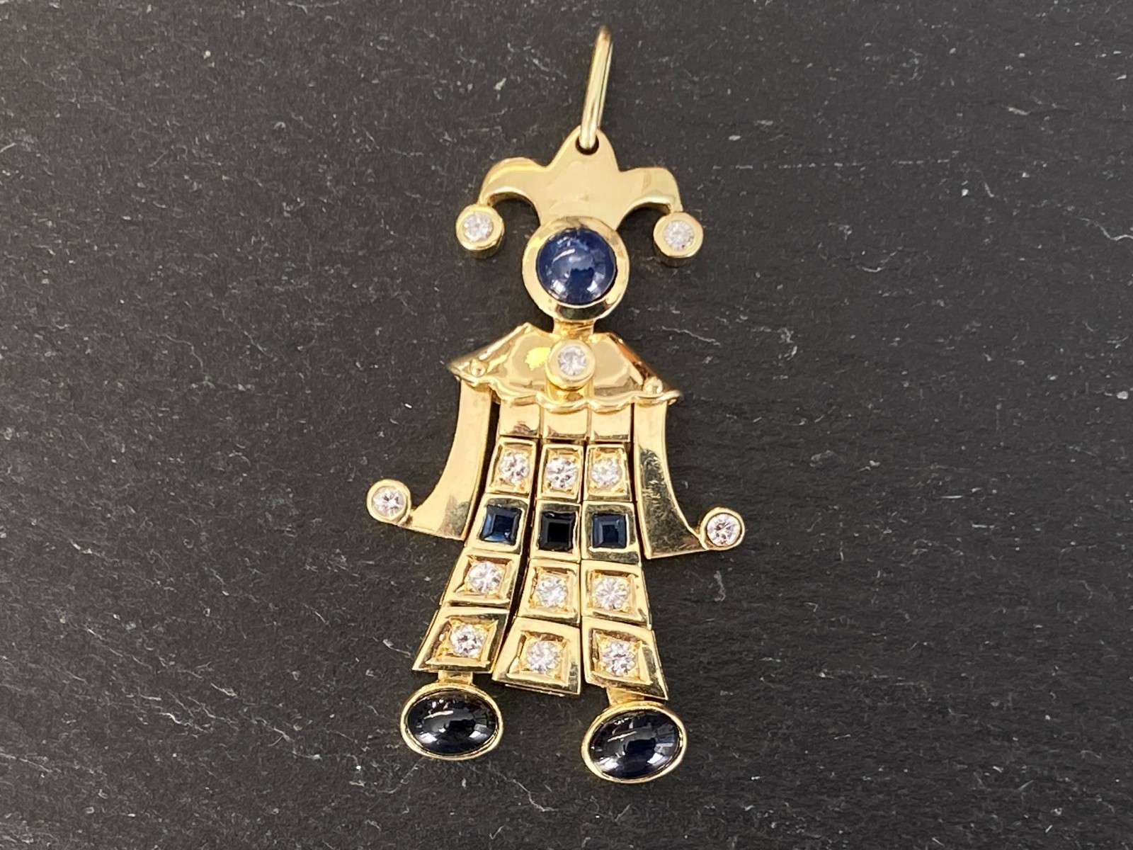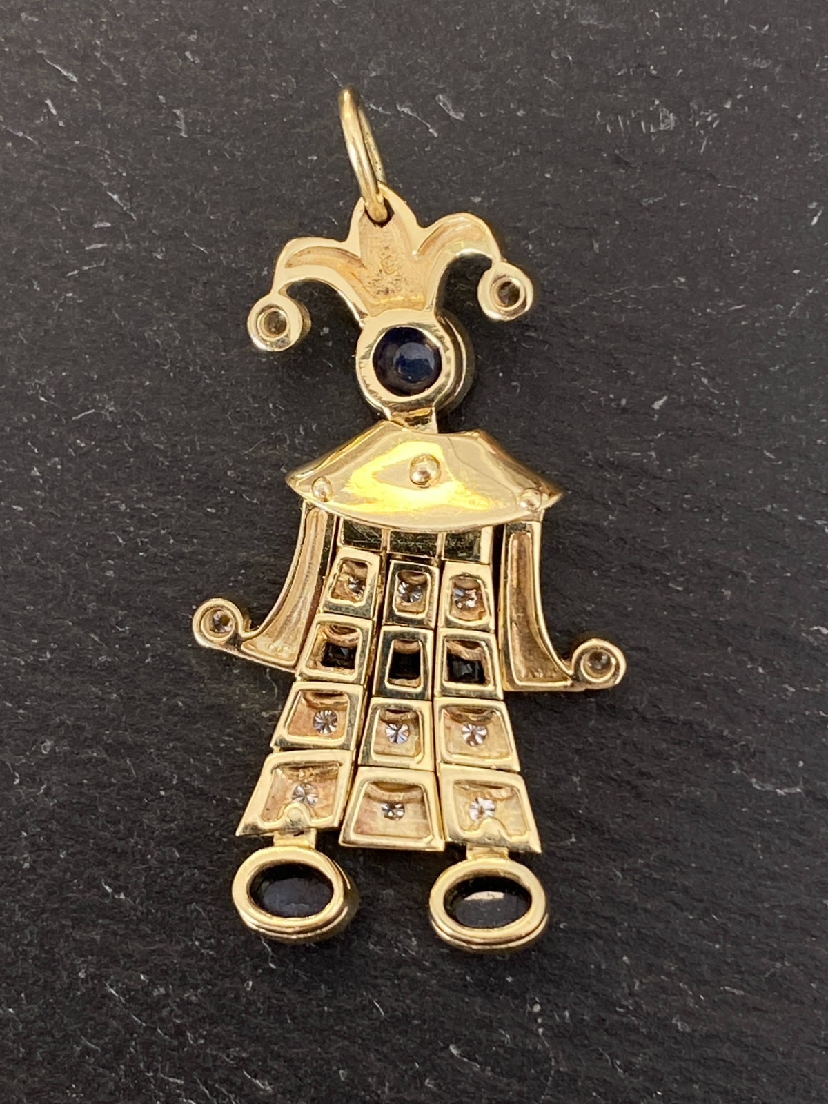 Harlekin Anhänger aus 14 Karat Gelbgold, punziert, mit Diamanten von zus. ca. 0,37ct. in SI1/G und Saphiren von zus. ca. 1,39ct.. Alle Angaben soweit in den Fassungen messbar. Der runde Saphir Cabochon hat seitlich einen kleinen Abplatzer, insgesamt sieht man durch eine Lupe an allen Steinen minimalen Abrieb und vereinzelt kleinere Abplatzer. Das Metall ist ebenfalls minimal berieben, insgesamt ein recht schöner Zustand. Die einzelnen Teile des Harlekin sind alle für sich beweglich, was dem Anhänger etwas Leben verleiht. BTH ca. 2,3/0,3/4,1cm, Gesamtgewicht ca. 10,12g. Die Begutachtung der Stücke wird vorgenommen von einem Fachmitglied der deutschen gemmologischen Gesellschaft E.V. Ein Schmuckpass wird mitgeliefert.