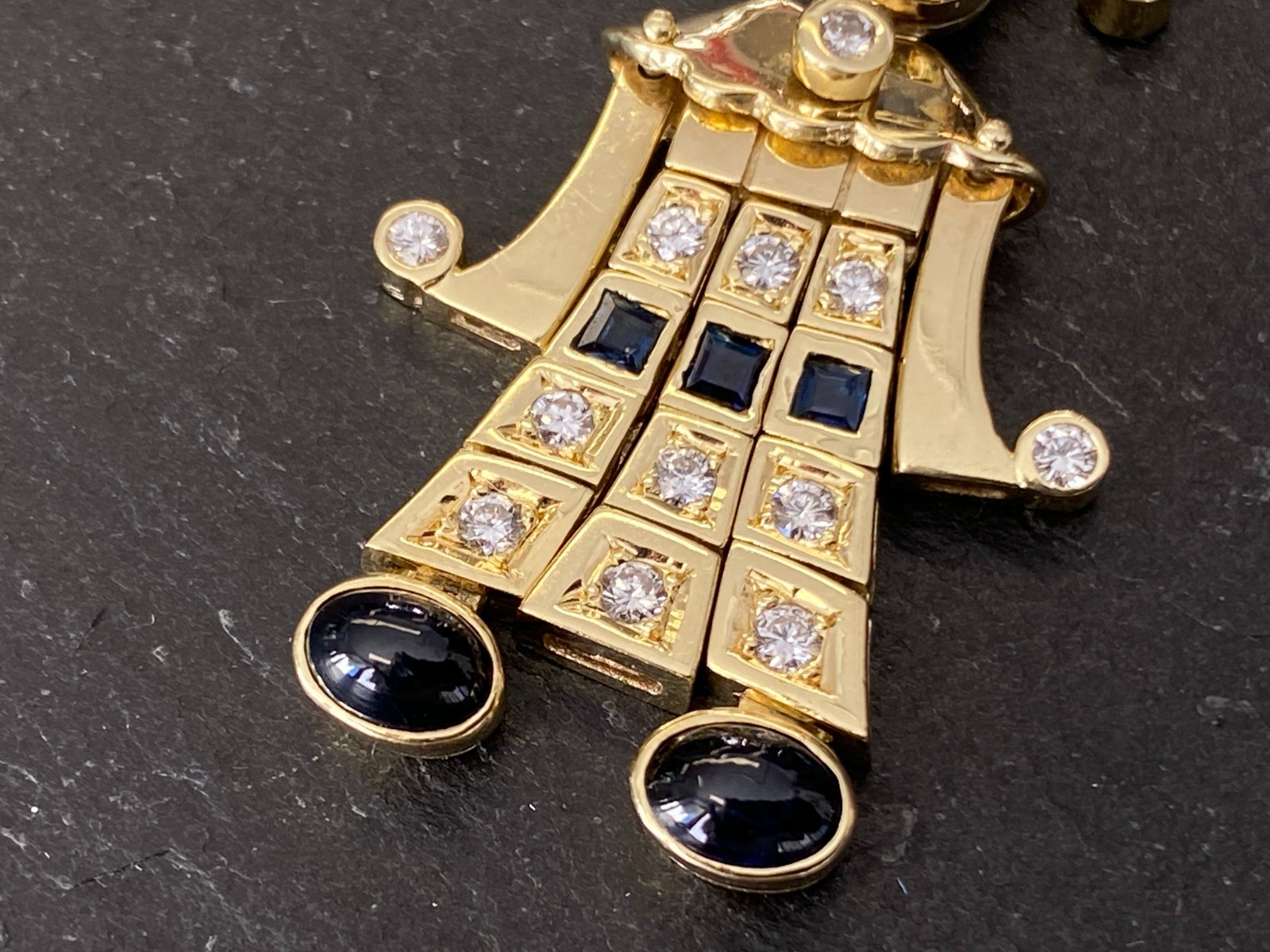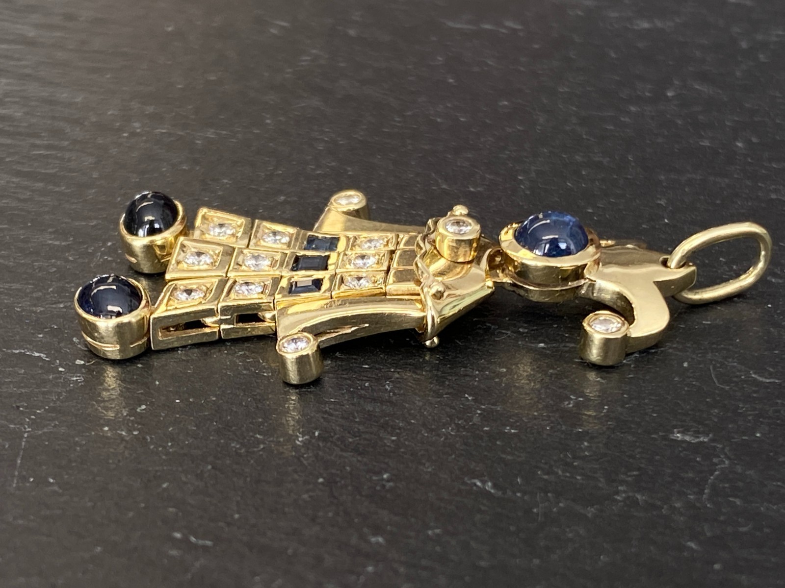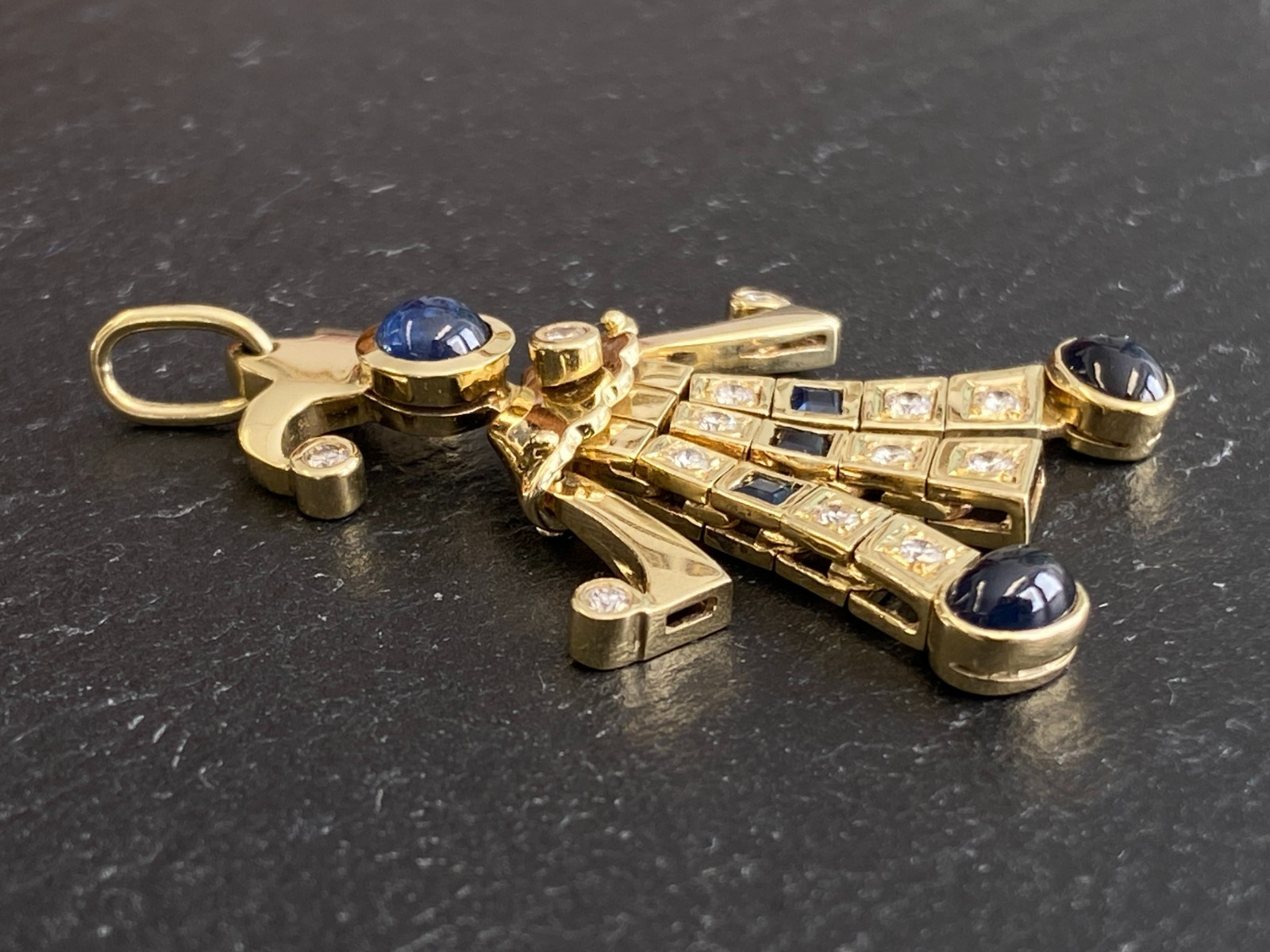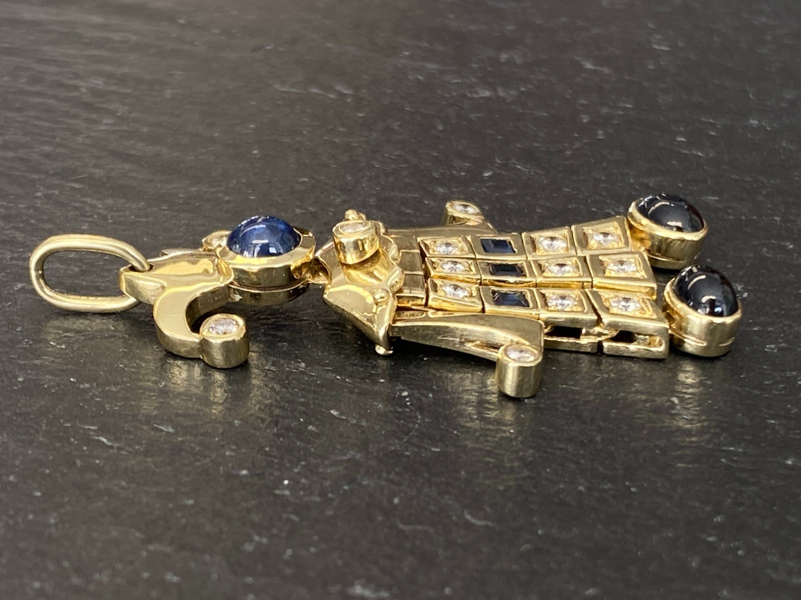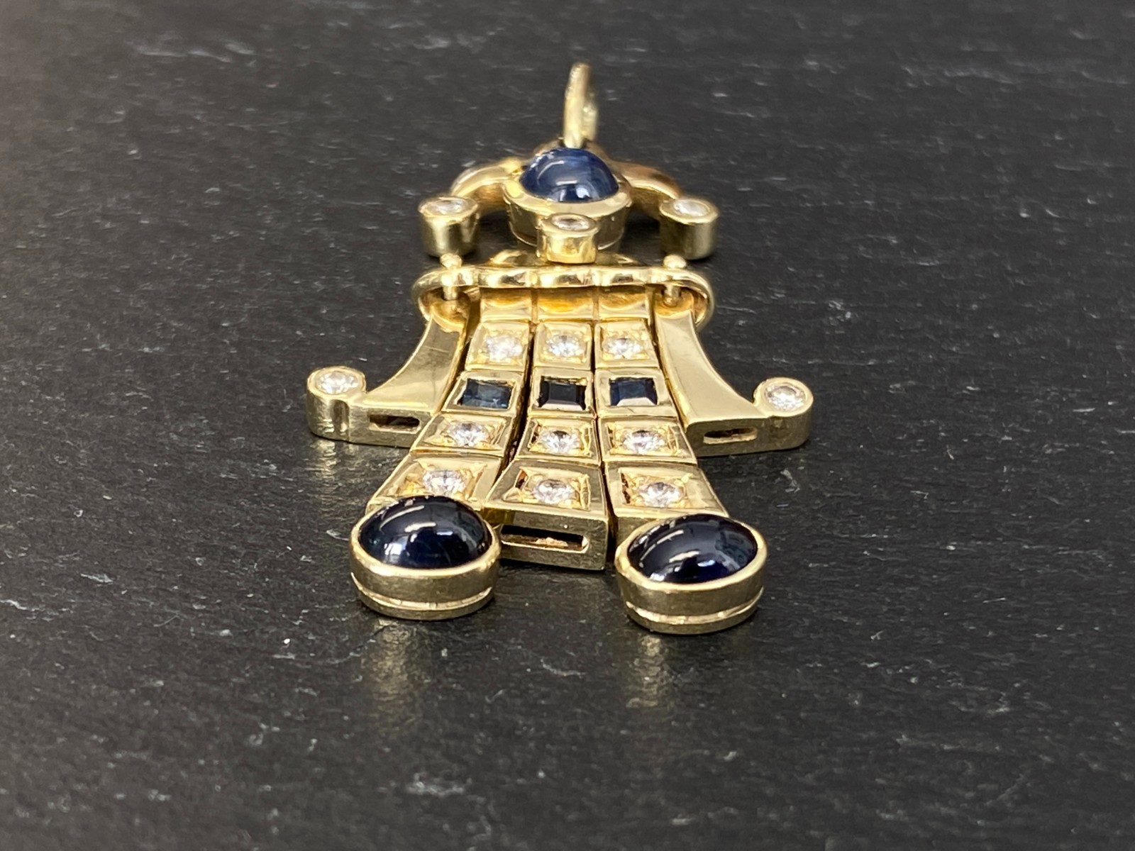 Harlekin Anhänger aus 14 Karat Gelbgold, punziert, mit Diamanten von zus. ca. 0,37ct. in SI1/G und Saphiren von zus. ca. 1,39ct.. Alle Angaben soweit in den Fassungen messbar. Der runde Saphir Cabochon hat seitlich einen kleinen Abplatzer, insgesamt sieht man durch eine Lupe an allen Steinen minimalen Abrieb und vereinzelt kleinere Abplatzer. Das Metall ist ebenfalls minimal berieben, insgesamt ein recht schöner Zustand. Die einzelnen Teile des Harlekin sind alle für sich beweglich, was dem Anhänger etwas Leben verleiht. BTH ca. 2,3/0,3/4,1cm, Gesamtgewicht ca. 10,12g. Die Begutachtung der Stücke wird vorgenommen von einem Fachmitglied der deutschen gemmologischen Gesellschaft E.V. Ein Schmuckpass wird mitgeliefert.