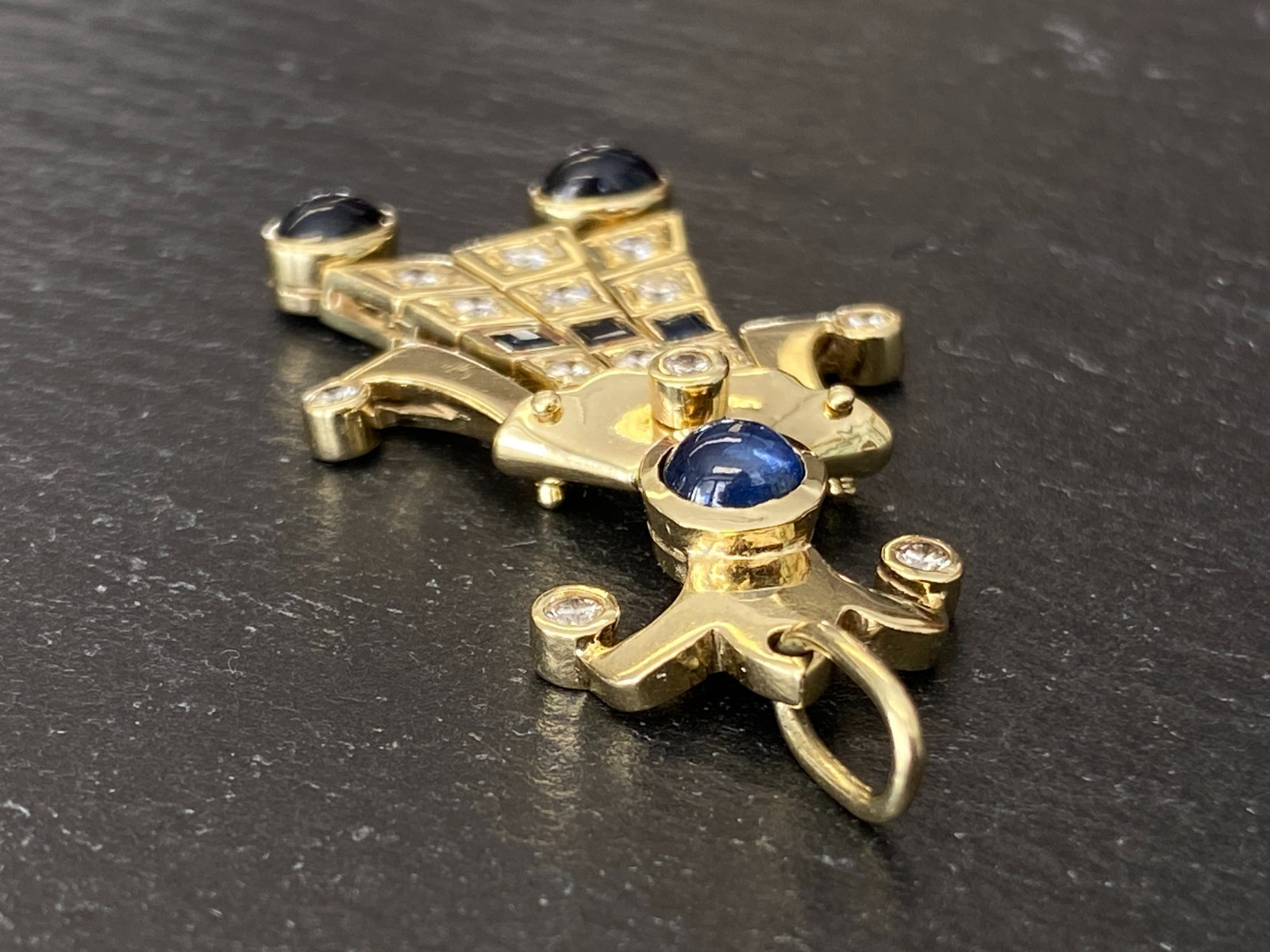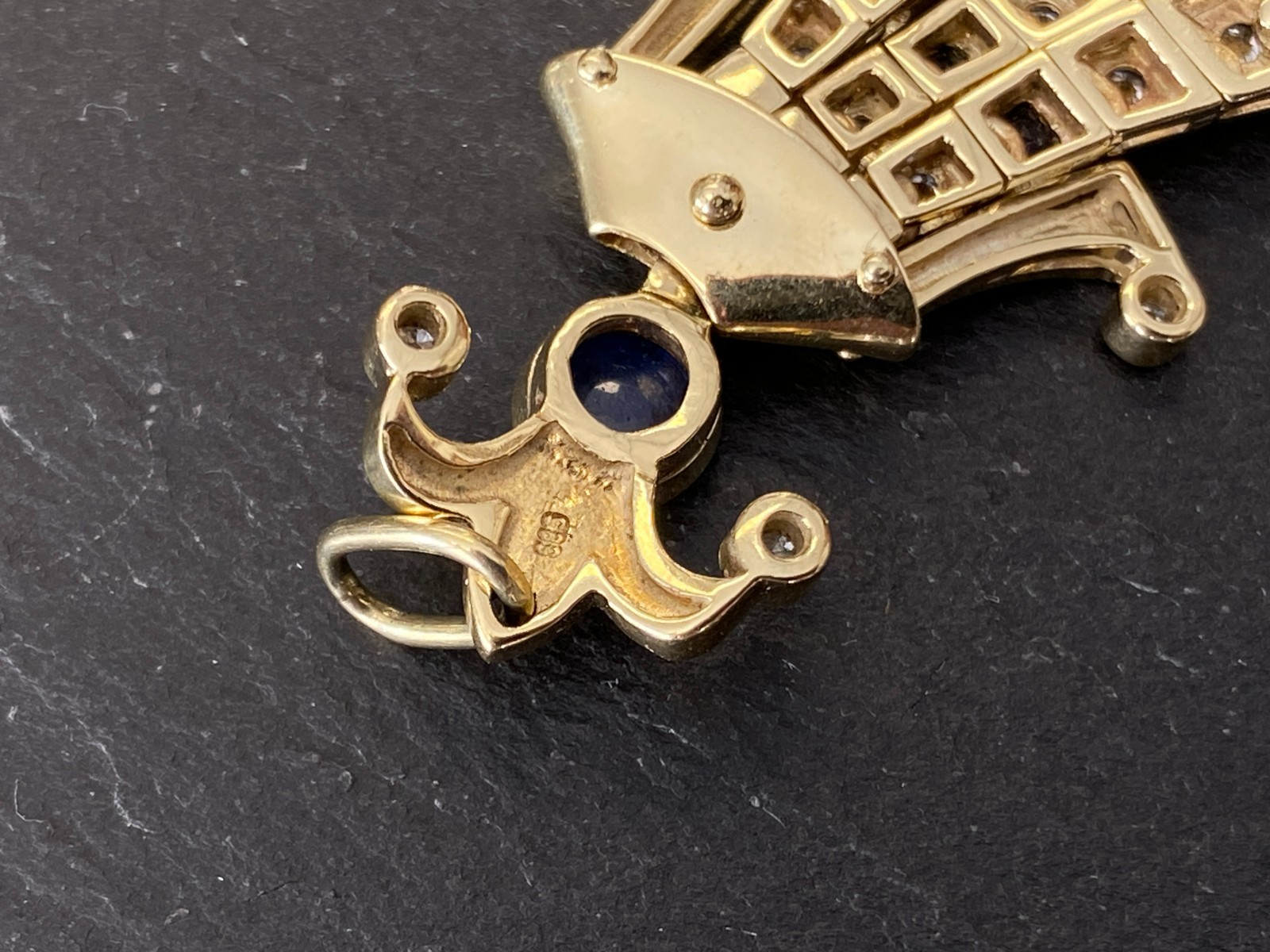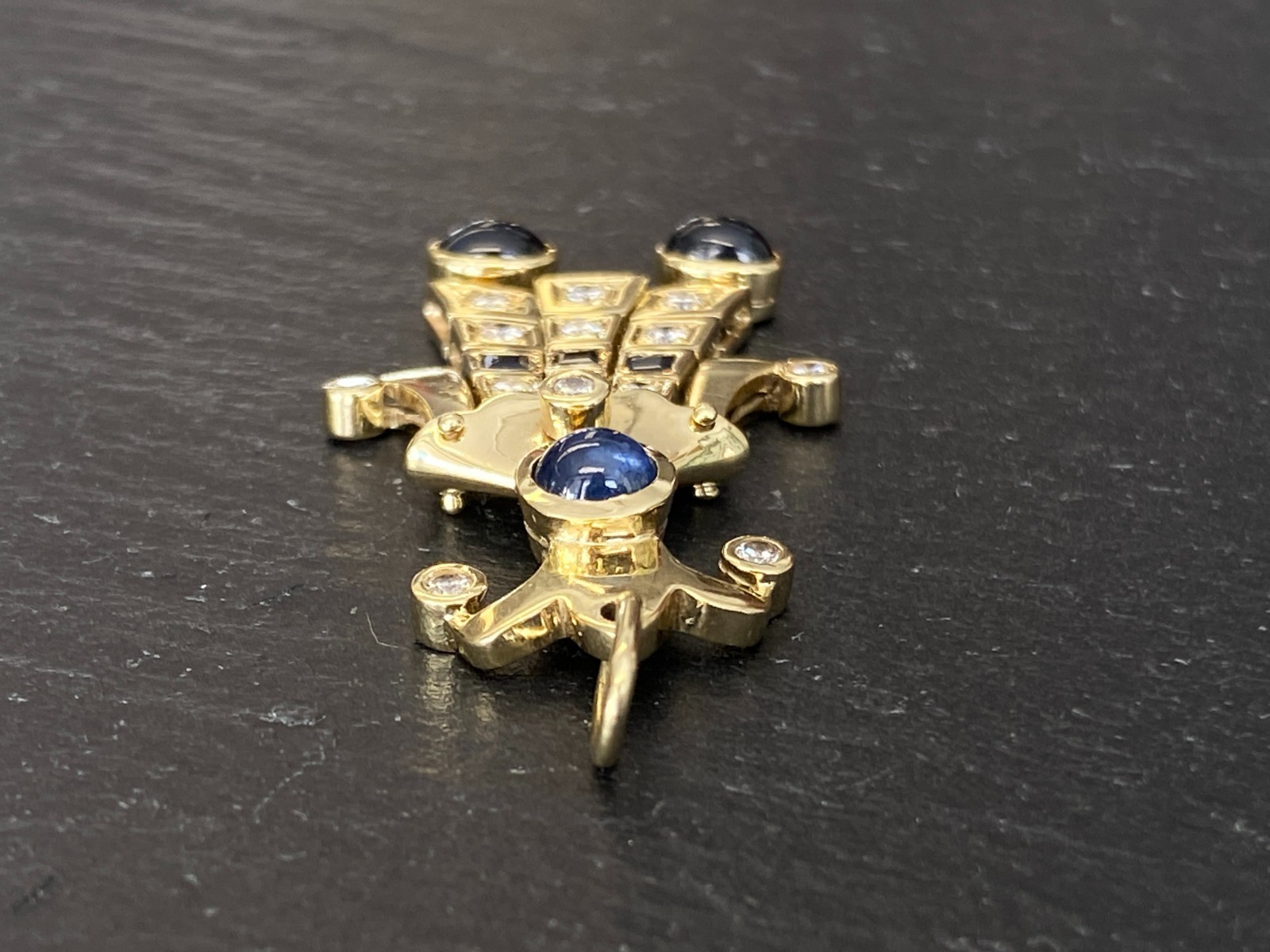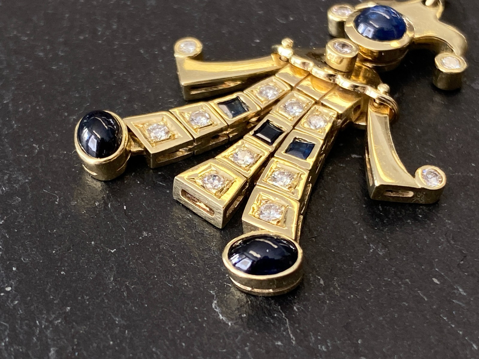 Harlekin Anhänger aus 14 Karat Gelbgold, punziert, mit Diamanten von zus. ca. 0,37ct. in SI1/G und Saphiren von zus. ca. 1,39ct.. Alle Angaben soweit in den Fassungen messbar. Der runde Saphir Cabochon hat seitlich einen kleinen Abplatzer, insgesamt sieht man durch eine Lupe an allen Steinen minimalen Abrieb und vereinzelt kleinere Abplatzer. Das Metall ist ebenfalls minimal berieben, insgesamt ein recht schöner Zustand. Die einzelnen Teile des Harlekin sind alle für sich beweglich, was dem Anhänger etwas Leben verleiht. BTH ca. 2,3/0,3/4,1cm, Gesamtgewicht ca. 10,12g. Die Begutachtung der Stücke wird vorgenommen von einem Fachmitglied der deutschen gemmologischen Gesellschaft E.V. Ein Schmuckpass wird mitgeliefert.